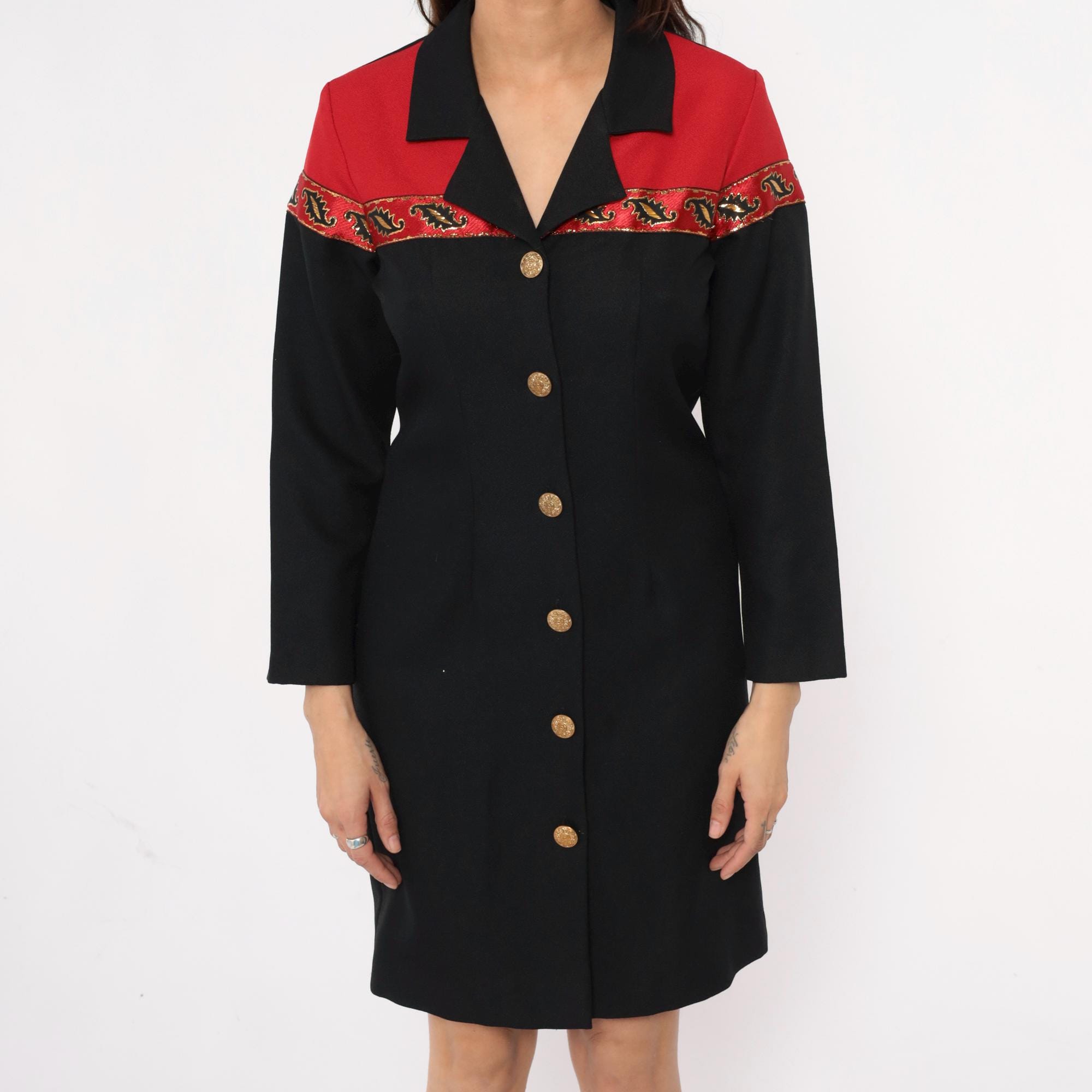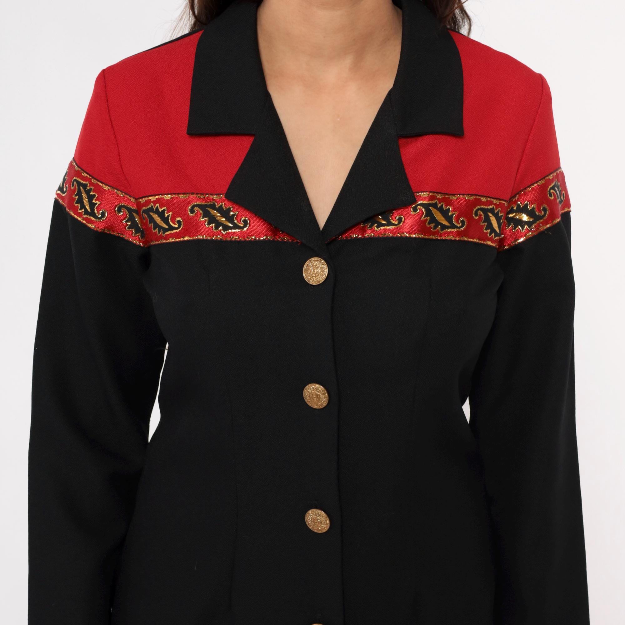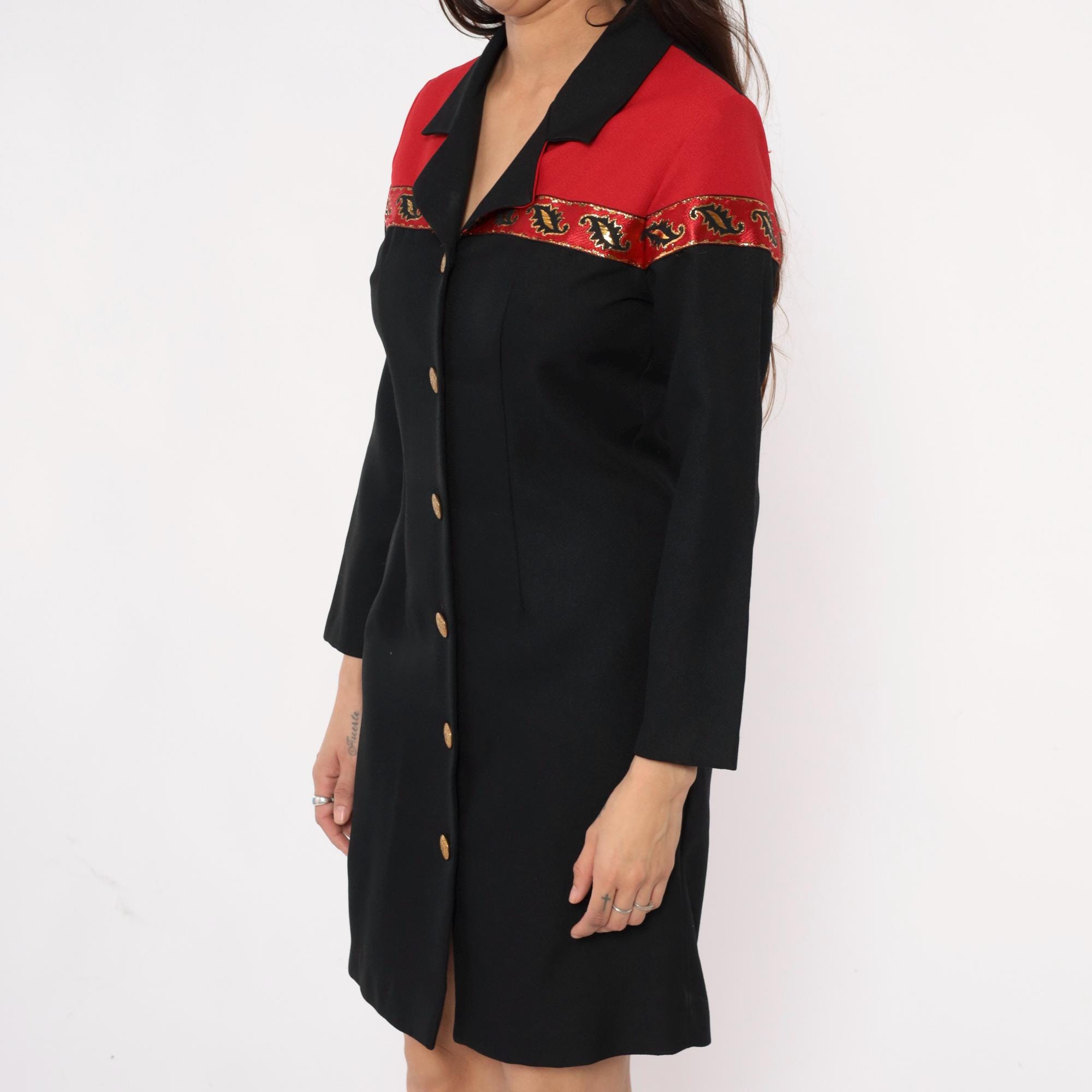 90s black dress from Willow Ridge with red shoulder yoke and embellished trim in gold, red, and black between the color blocks. Gold metallic buttons down the front, black notched collar, long sleeves.