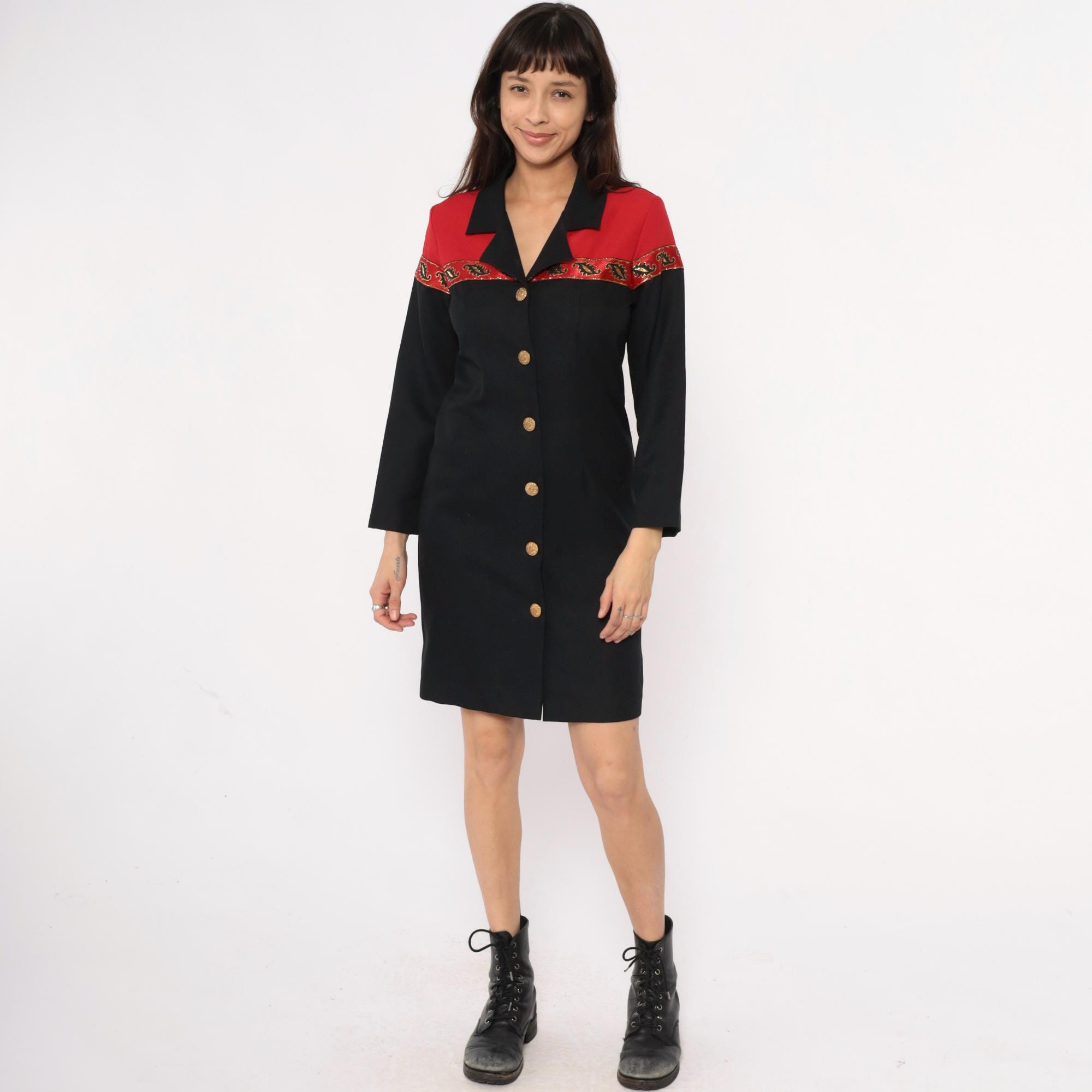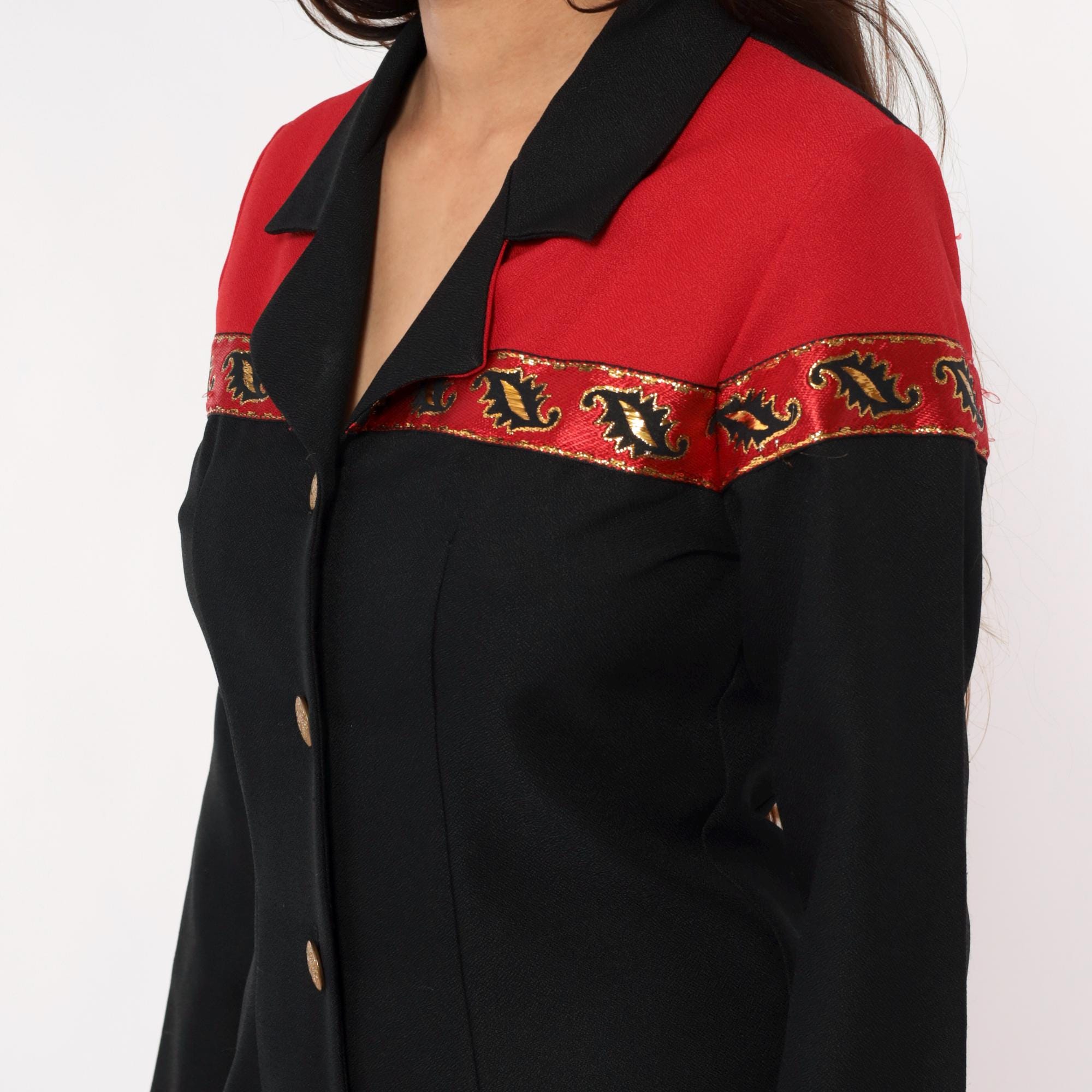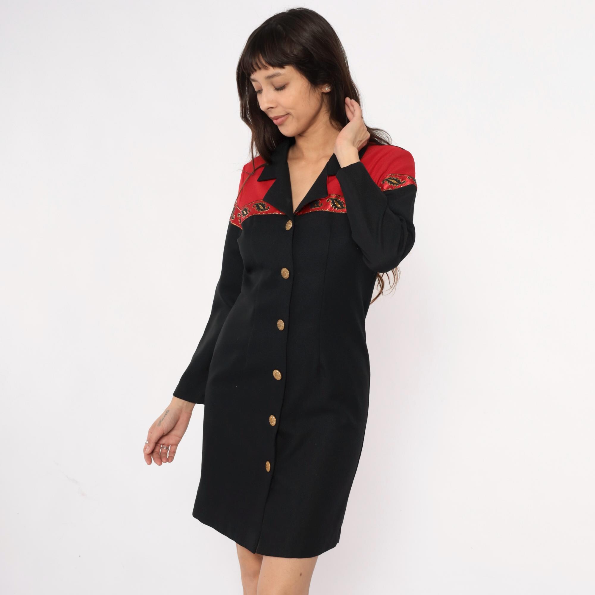 90s black dress from Willow Ridge with red shoulder yoke and embellished trim in gold, red, and black between the color blocks. Gold metallic buttons down the front, black notched collar, long sleeves.