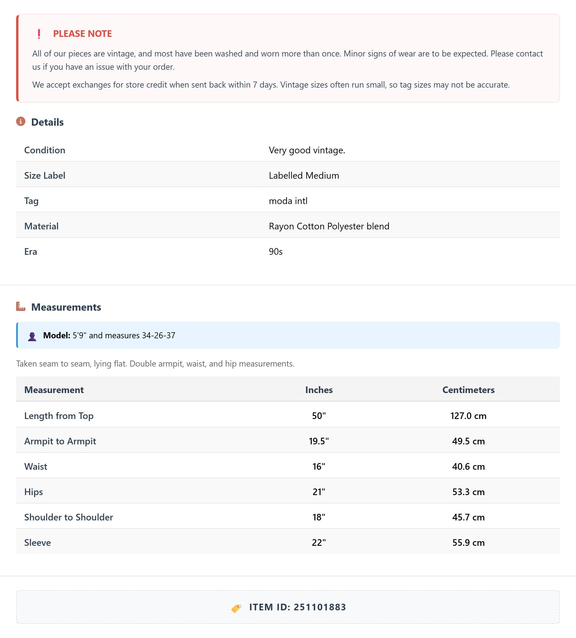 All of our pieces are vintage, and most have been washed and worn more than once. Minor signs of wear are to be expected. Please contact us if you have an issue with your order. We accept exchanges for store credit when sent back within 7 days.