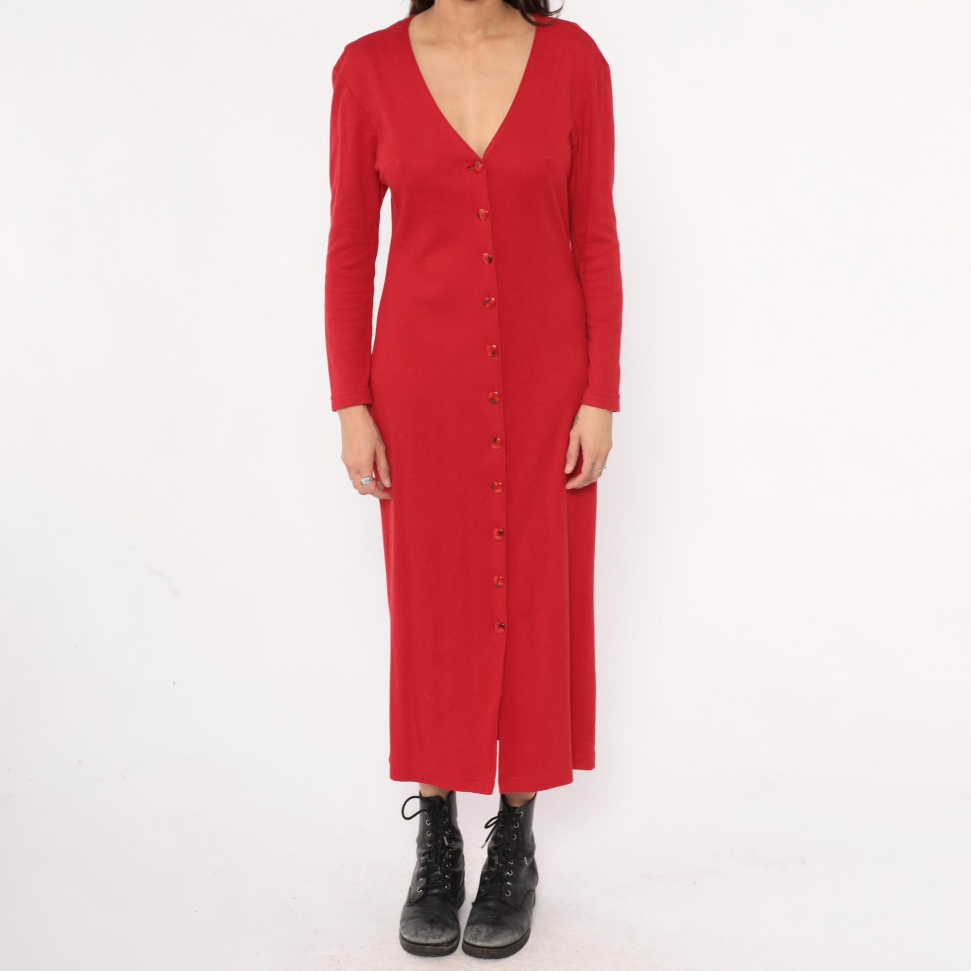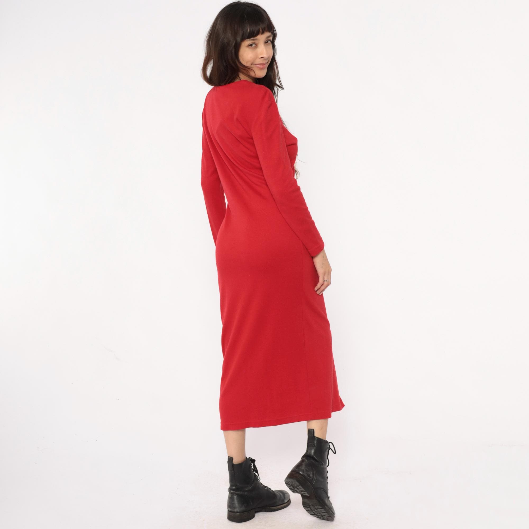 90s black dress from Willow Ridge with red shoulder yoke and embellished trim in gold, red, and black between the color blocks. Gold metallic buttons down the front, black notched collar, long sleeves.
