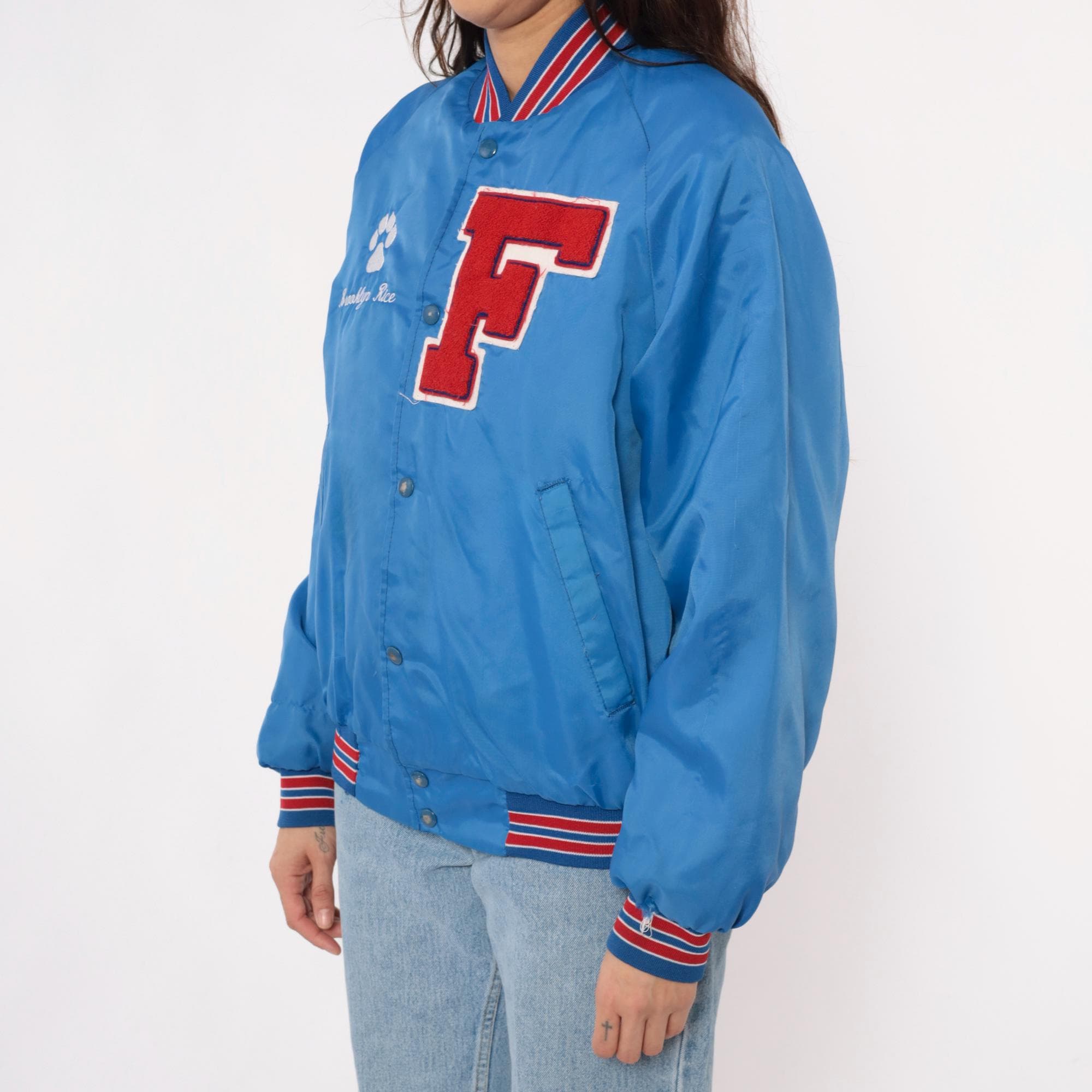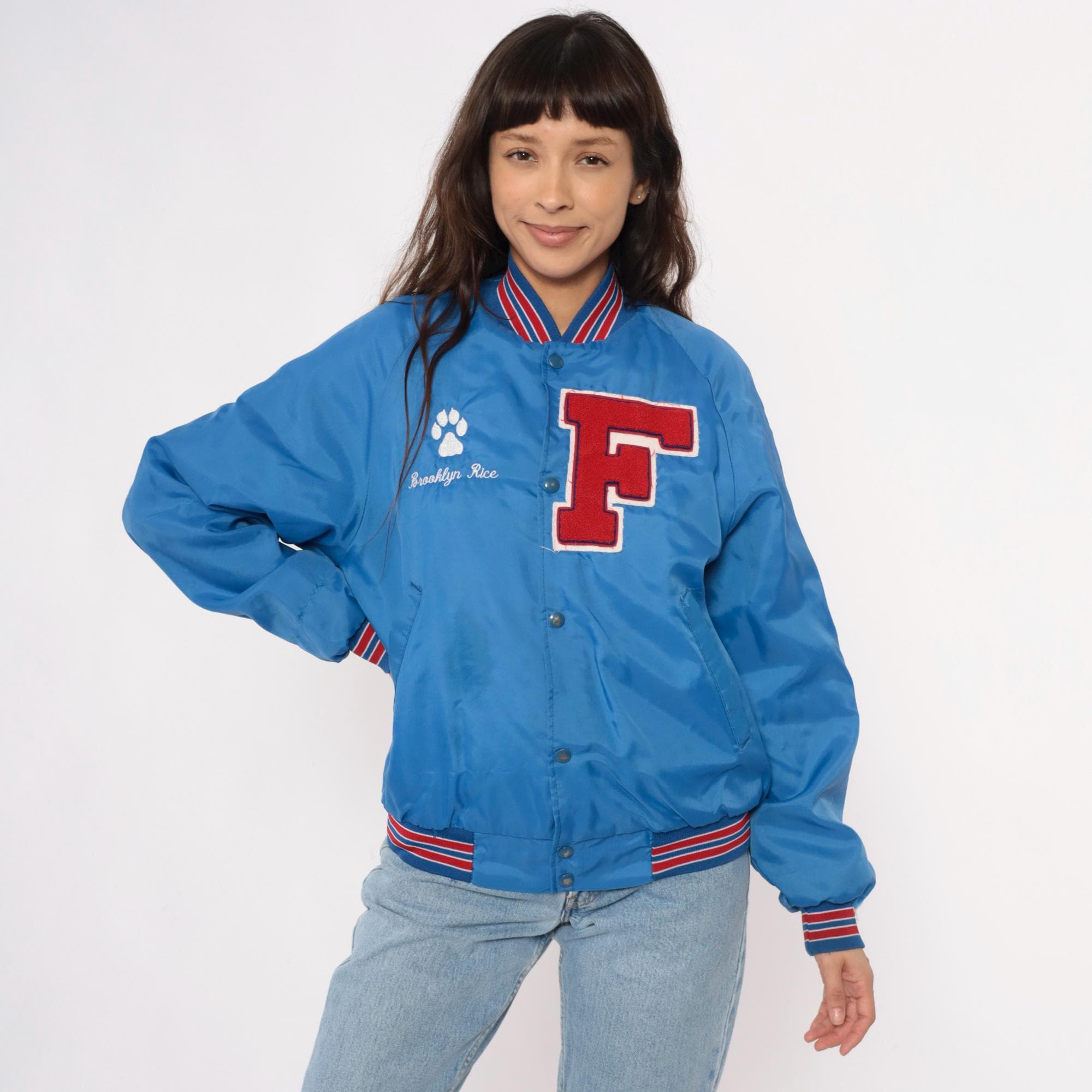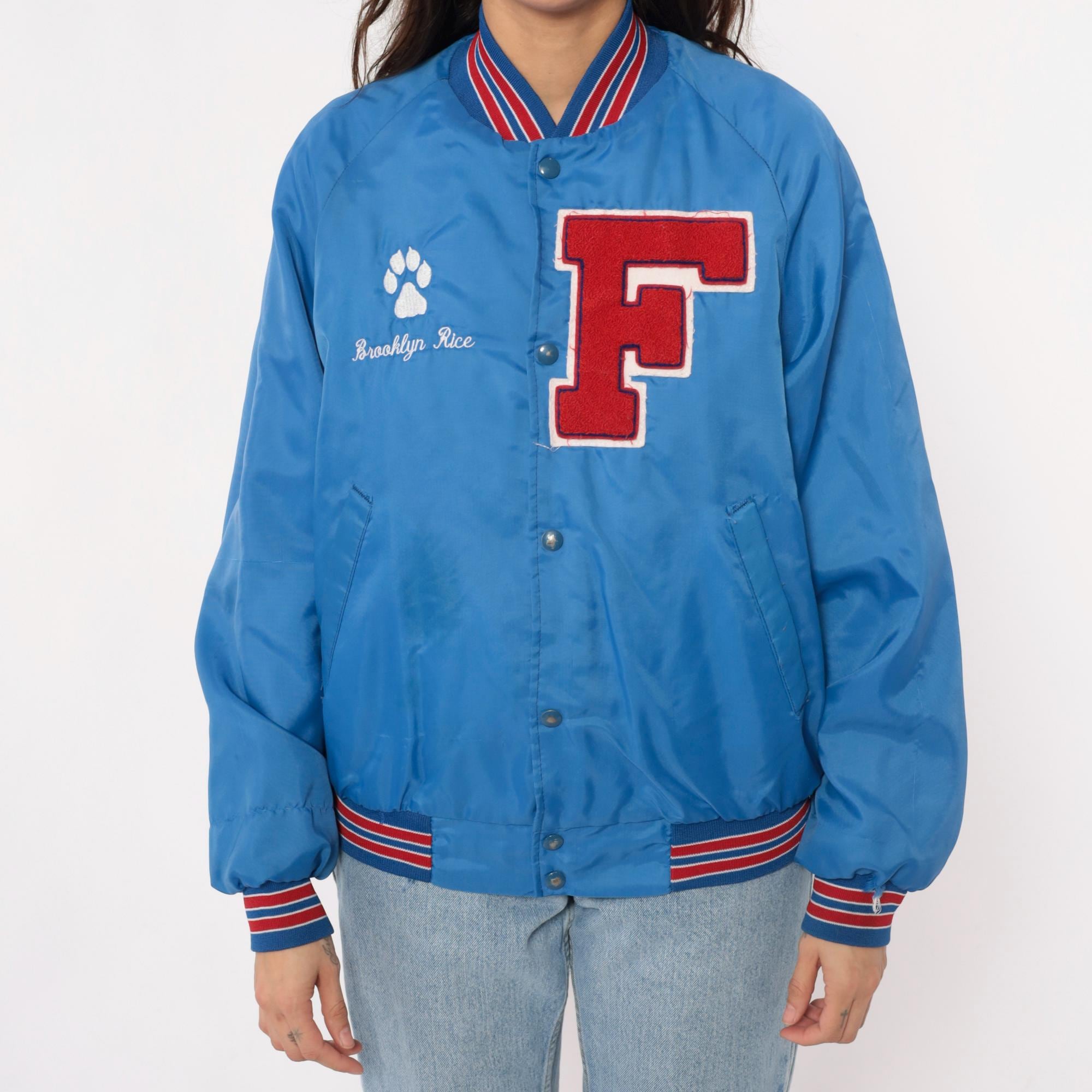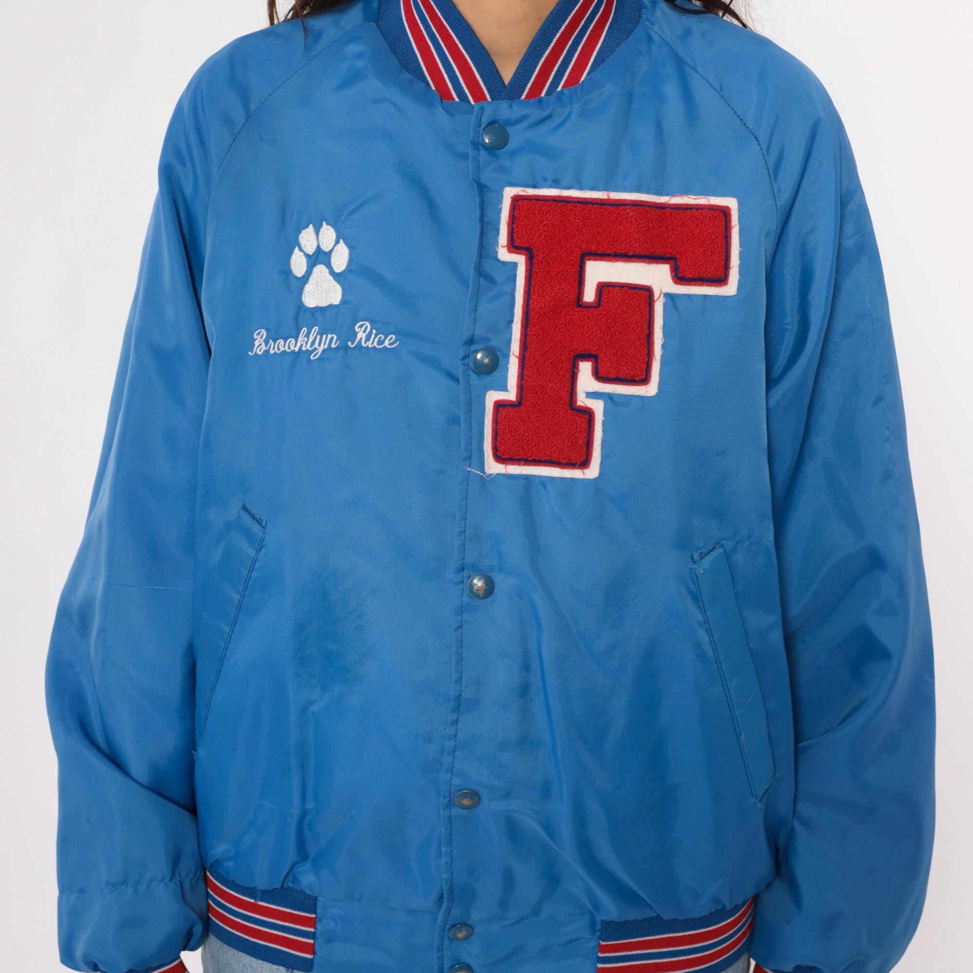 90s blue varsity jacket with large red chenille "F" letter patch on front chest, "FRANKLIN" embroidered across upper back, and "Brooklyn Rice" embroidered script with paw print detail on left chest. Red, white, and blue striped ribbed knit collar, cuffs, and waistband. Snap button front closure with two front pockets.