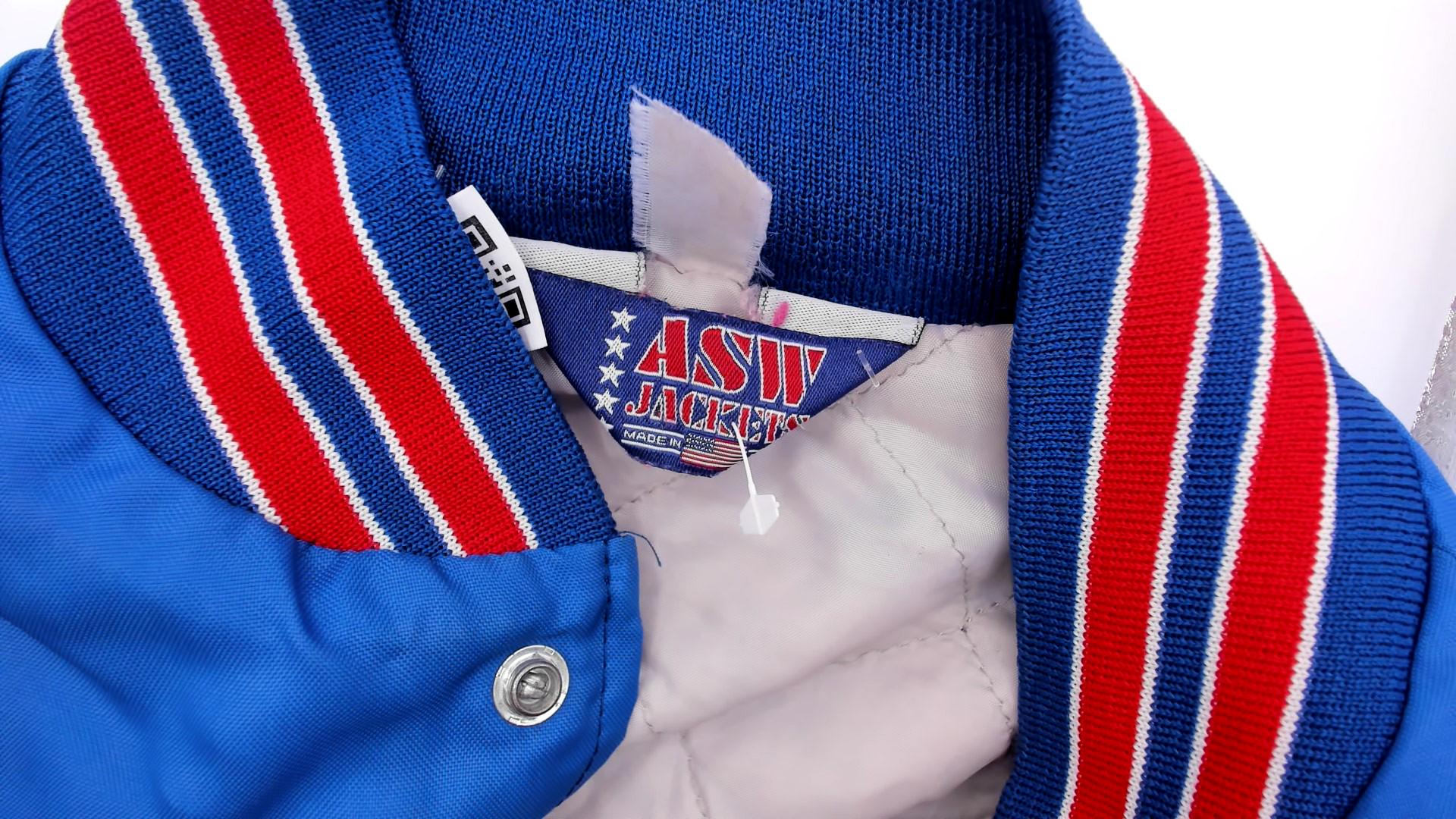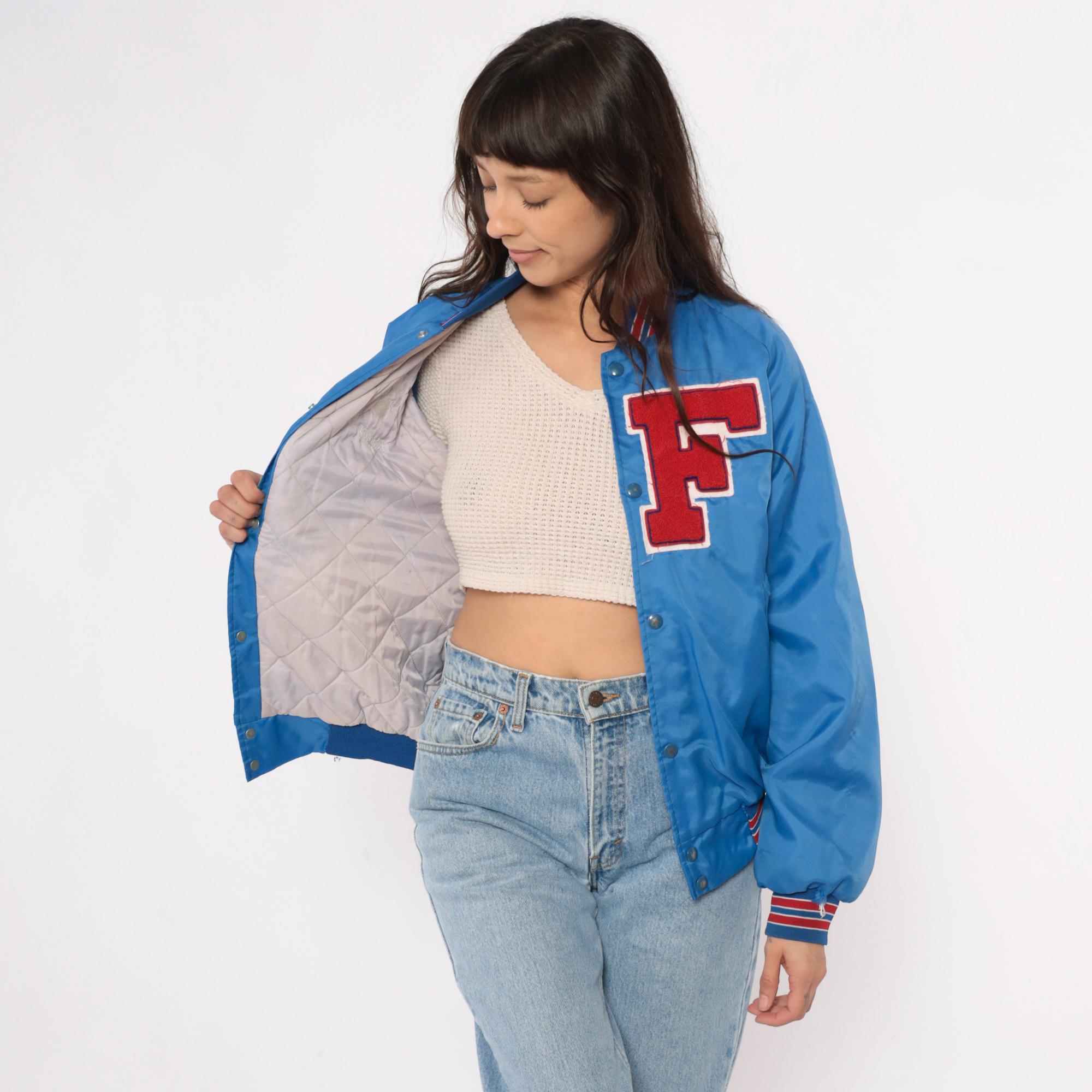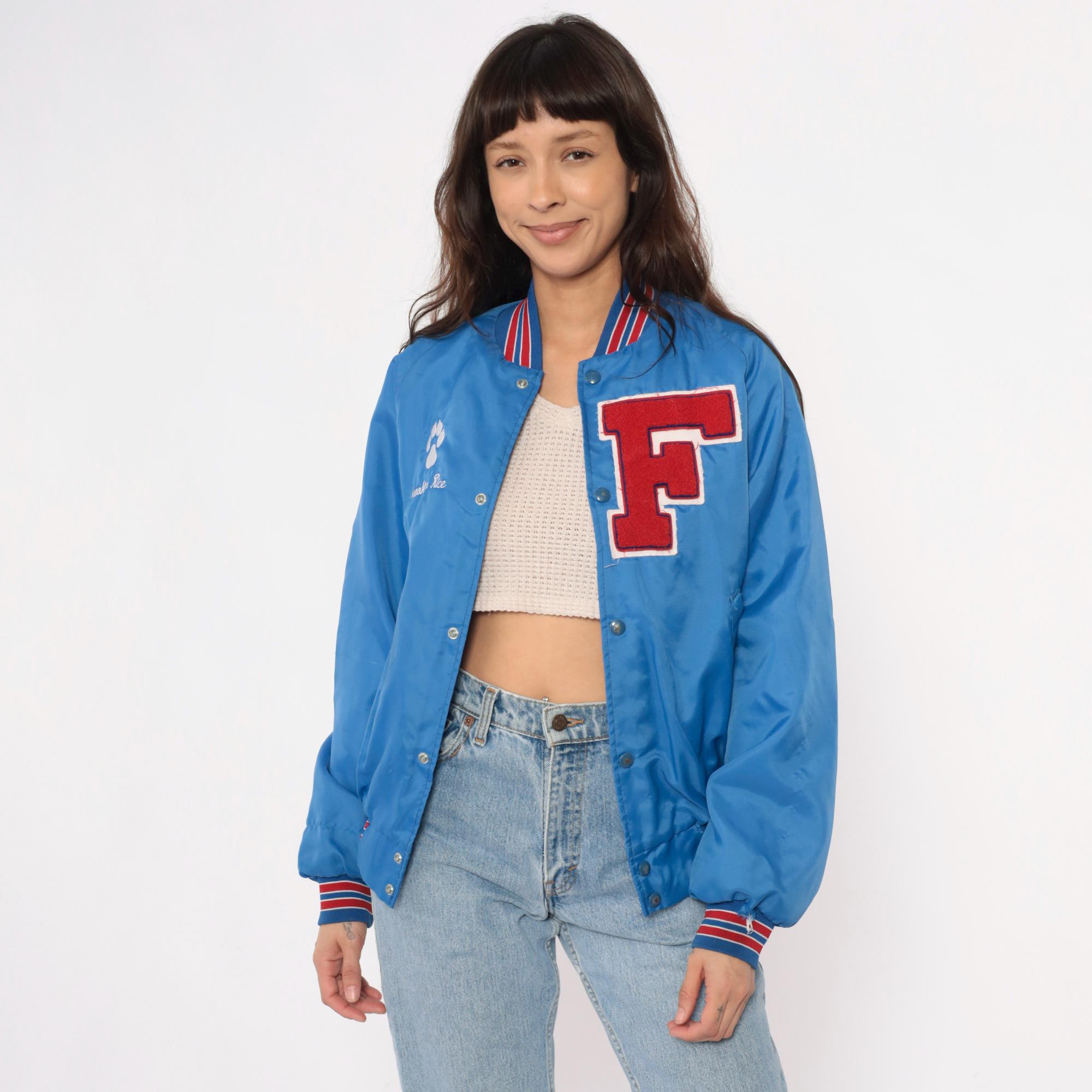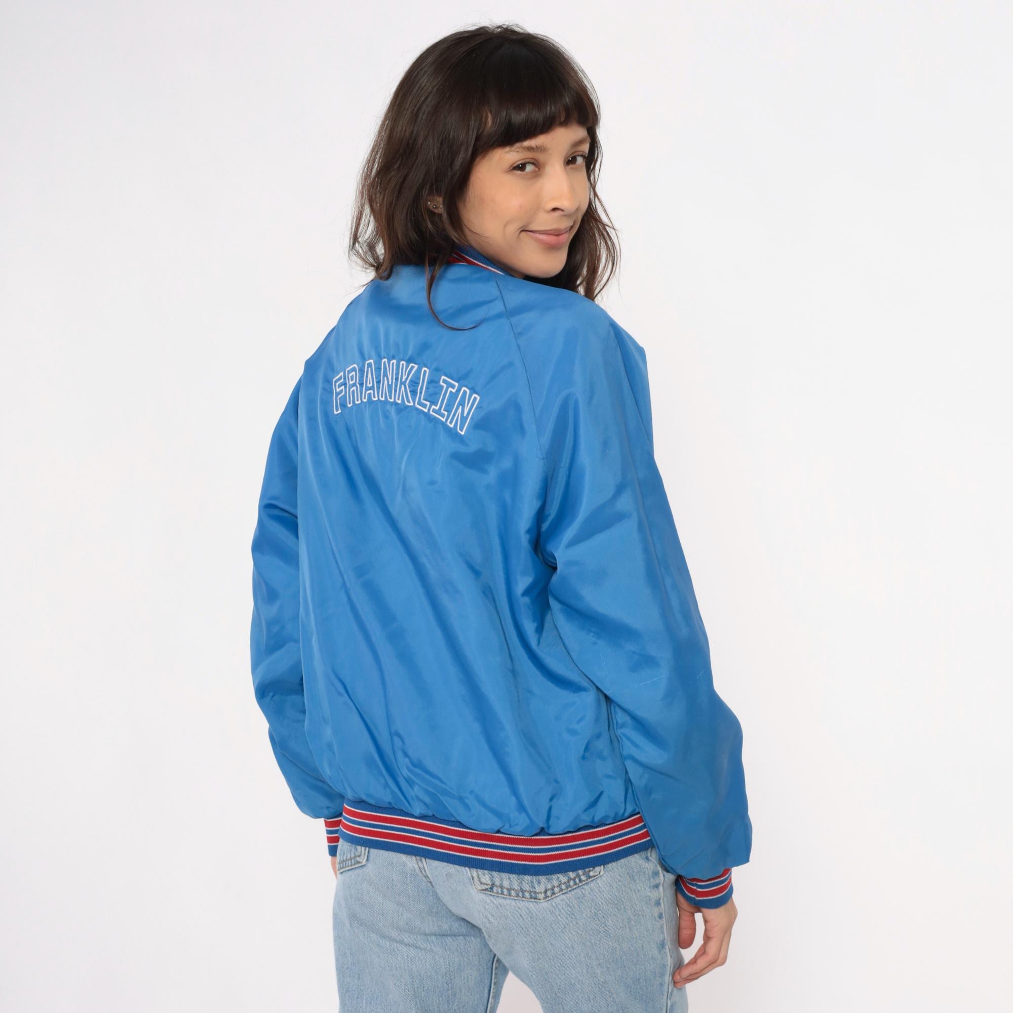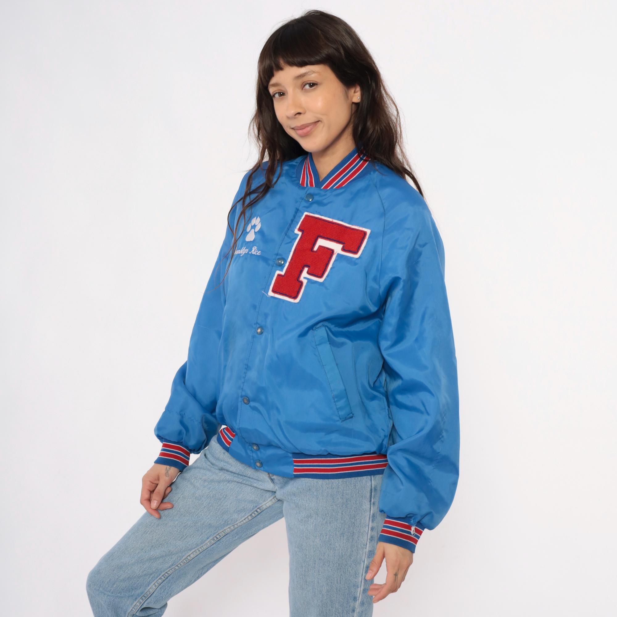90s blue varsity jacket with large red chenille "F" letter patch on front chest, "FRANKLIN" embroidered across upper back, and "Brooklyn Rice" embroidered script with paw print detail on left chest. Red, white, and blue striped ribbed knit collar, cuffs, and waistband. Snap button front closure with two front pockets.