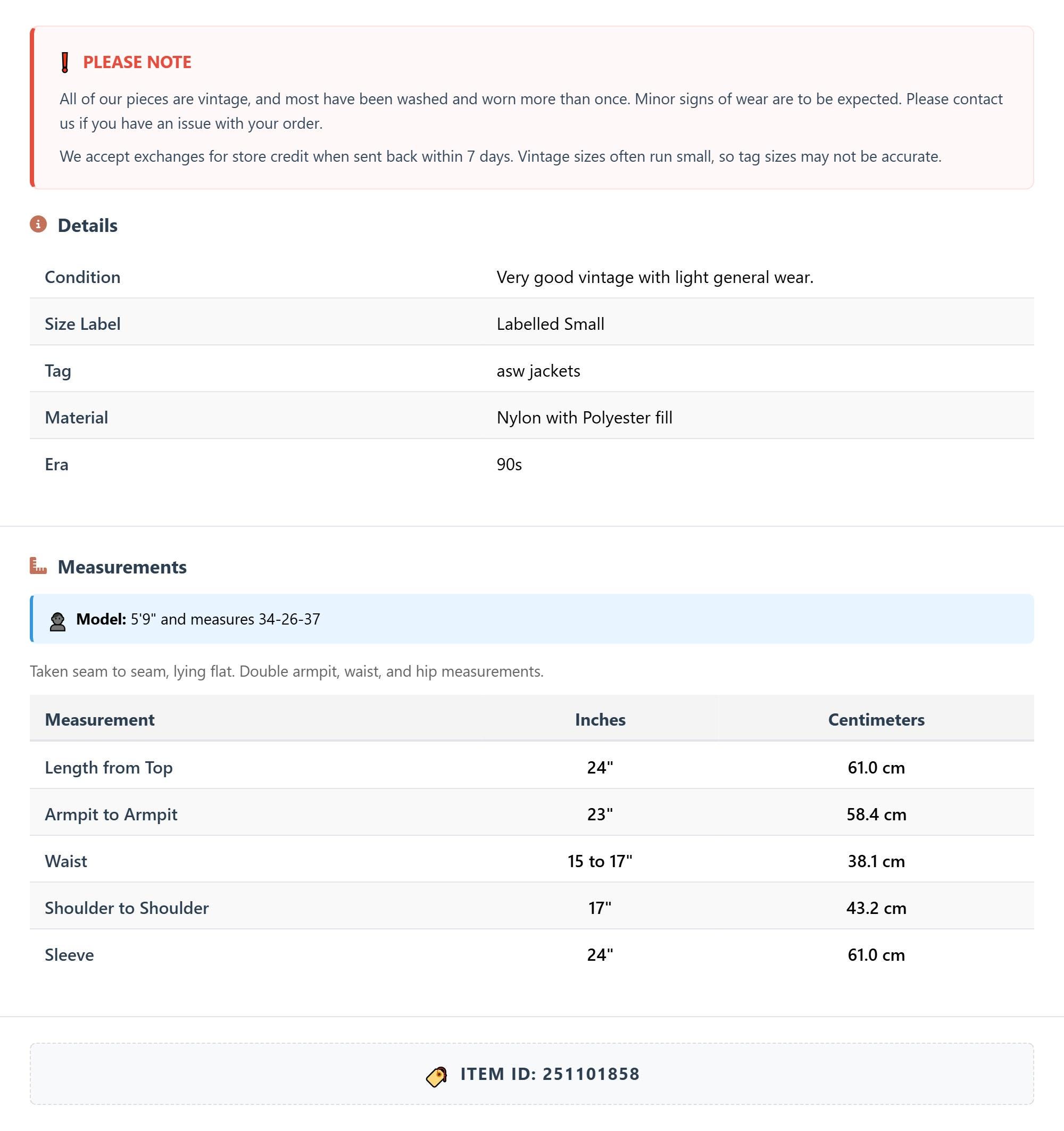 All of our pieces are vintage, and most have been washed and worn more than once. Minor signs of wear are to be expected. Please contact us if you have an issue with your order. We accept exchanges for store credit when sent back within 7 days.