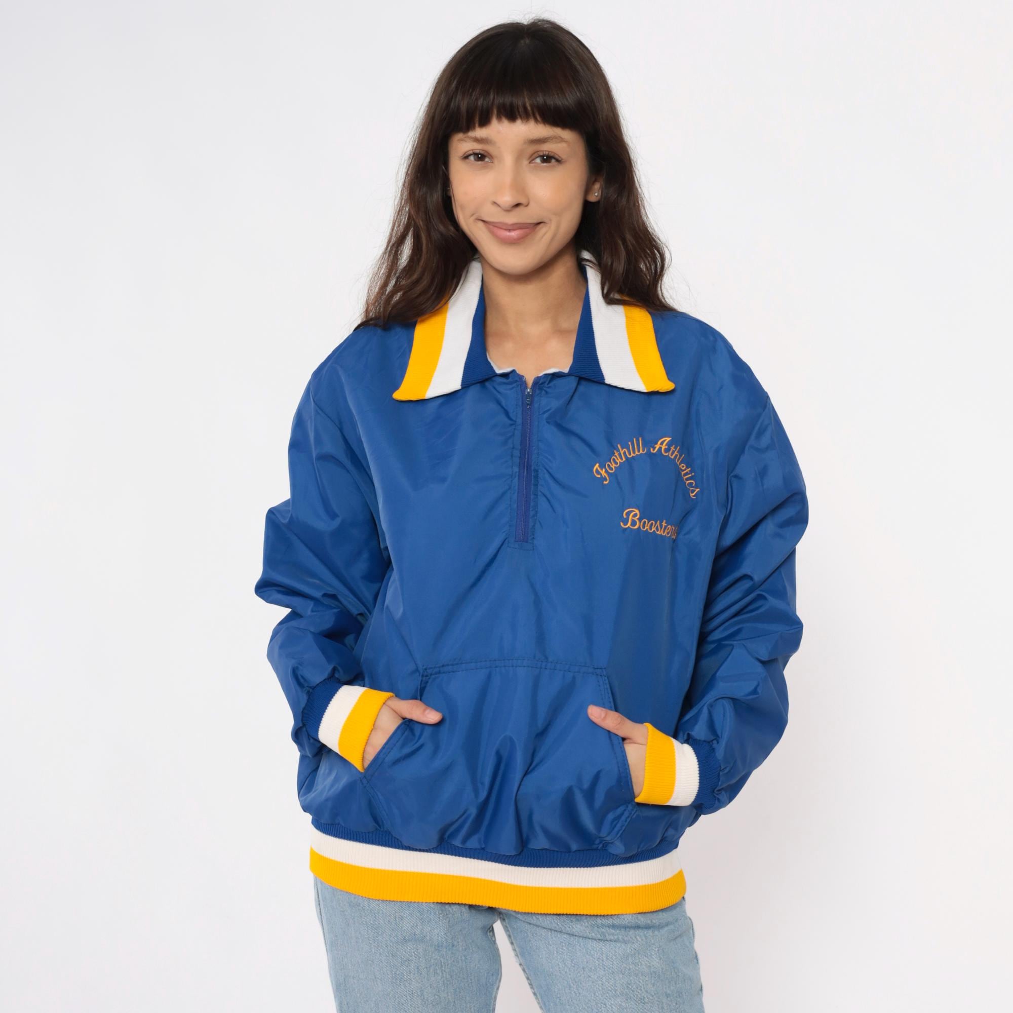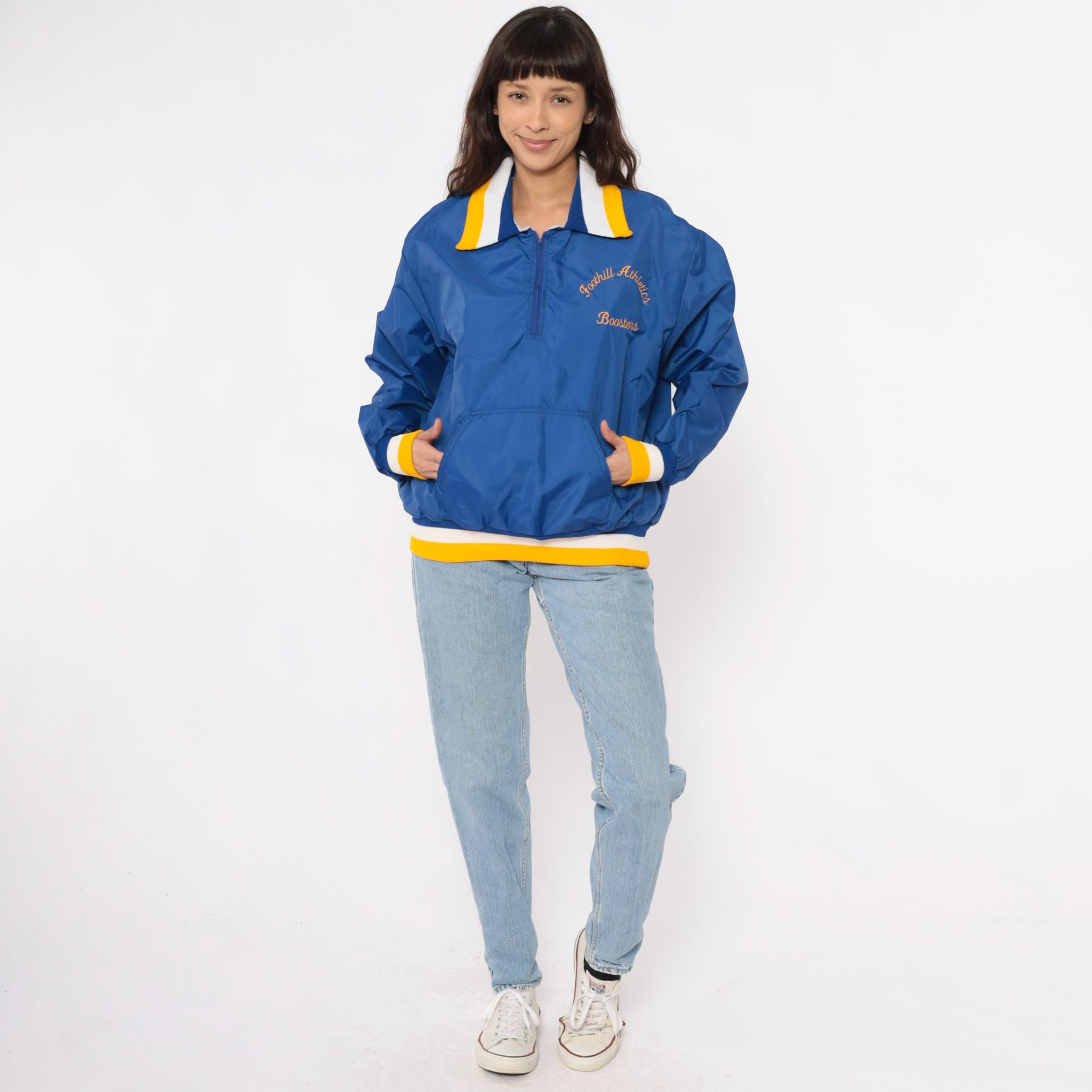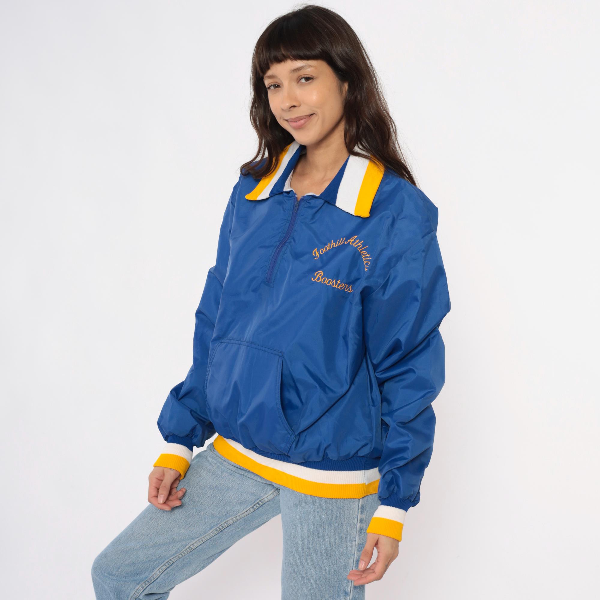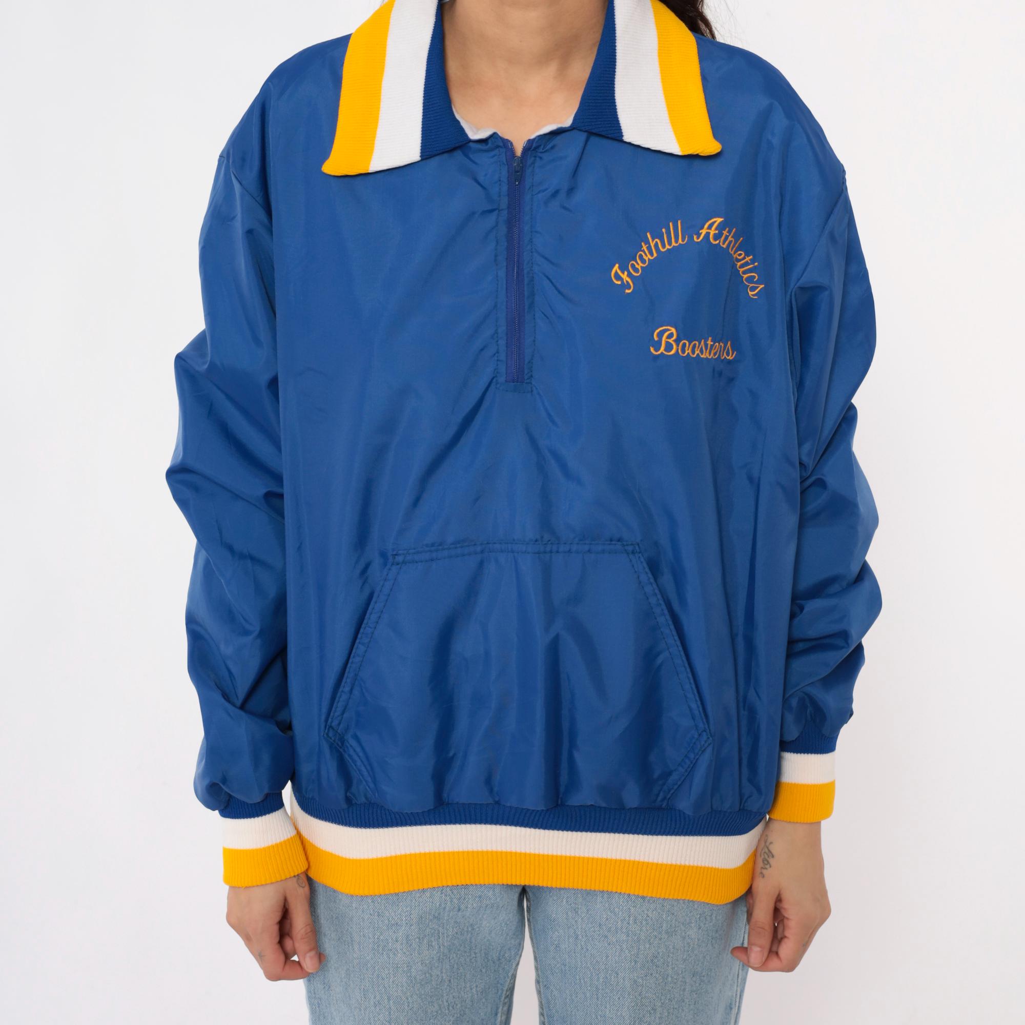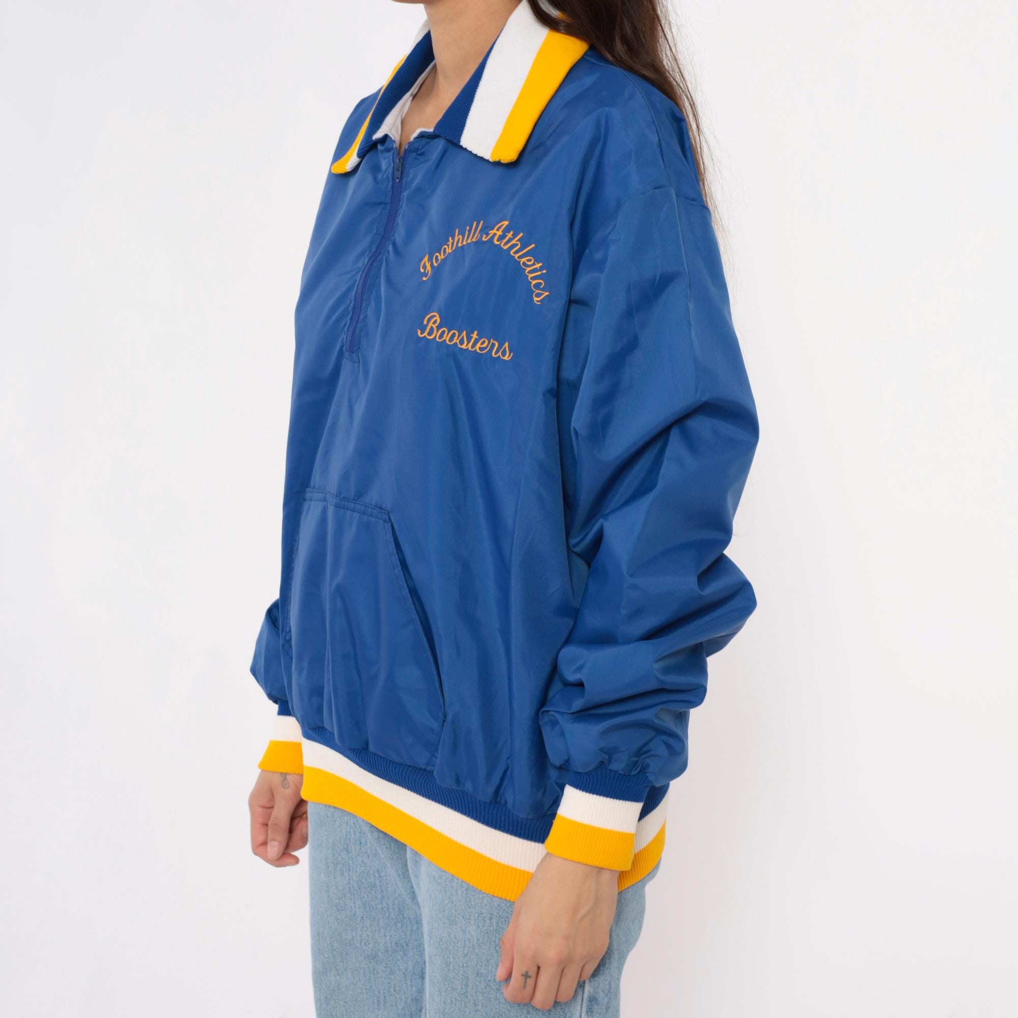 90s blue windbreaker pullover from Foothill Athletics Boosters with yellow, white, and dark blue striped ribbed collar, cuffs, and hem. Partial front zipper closure, front kangaroo pocket, yellow embroidered lettering on chest and back.