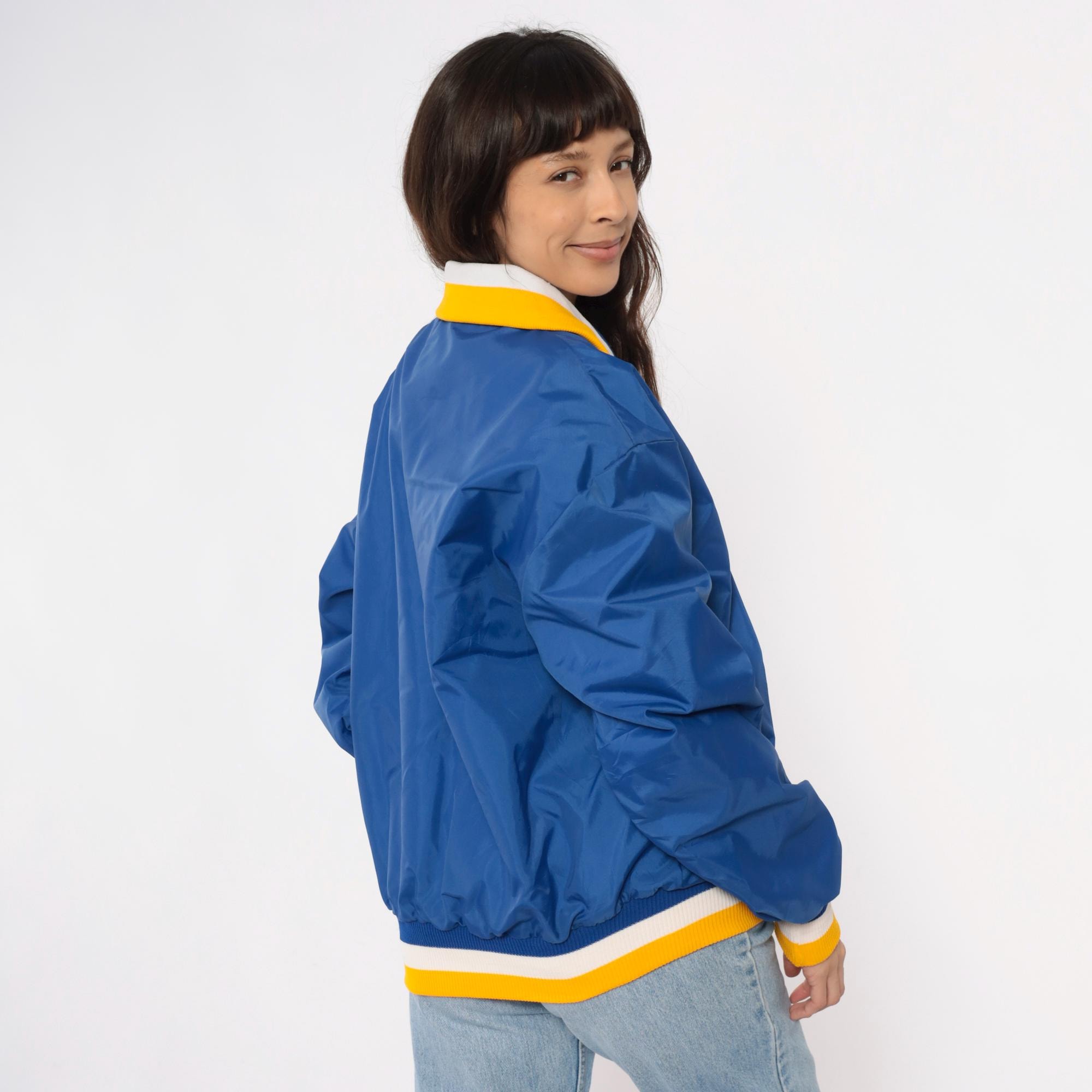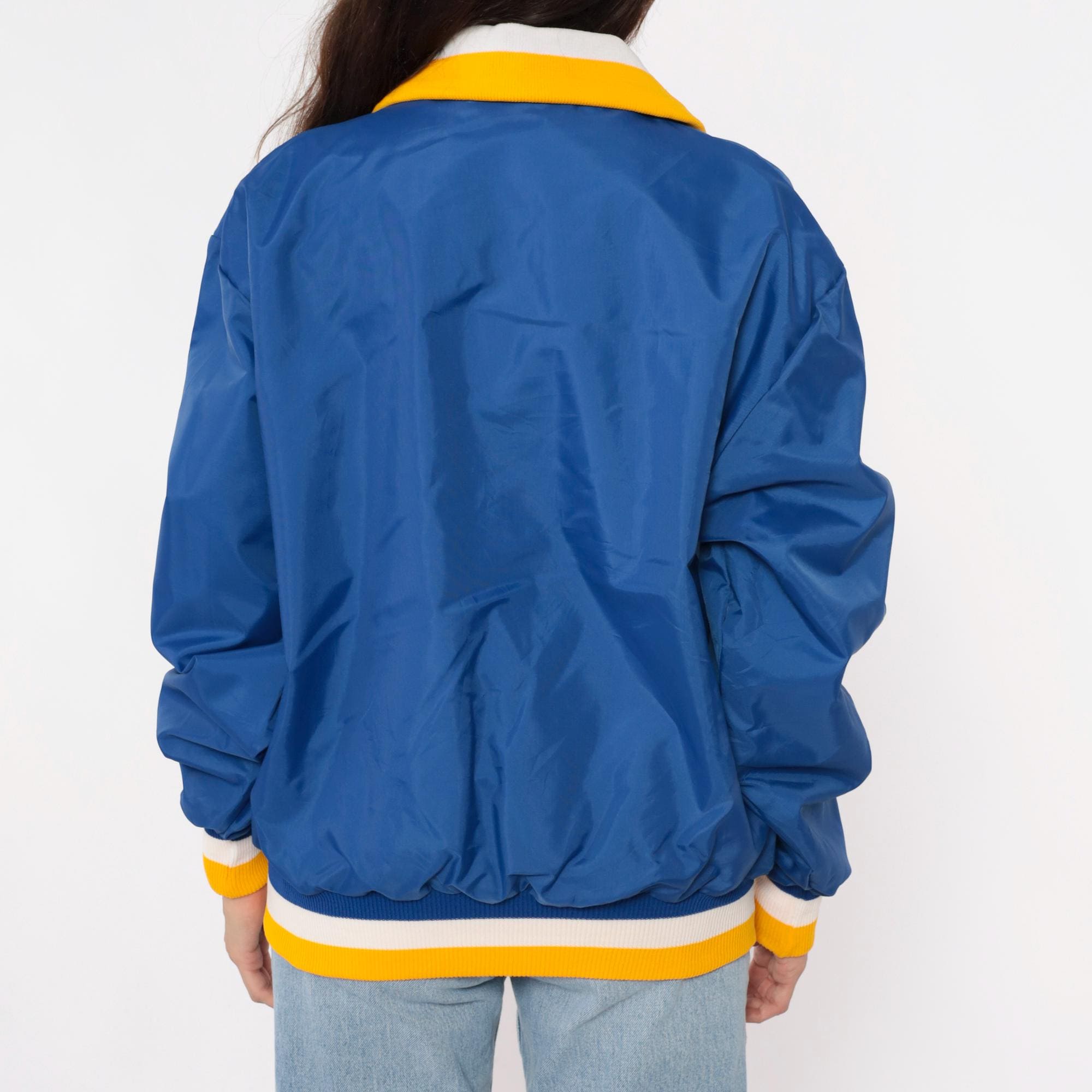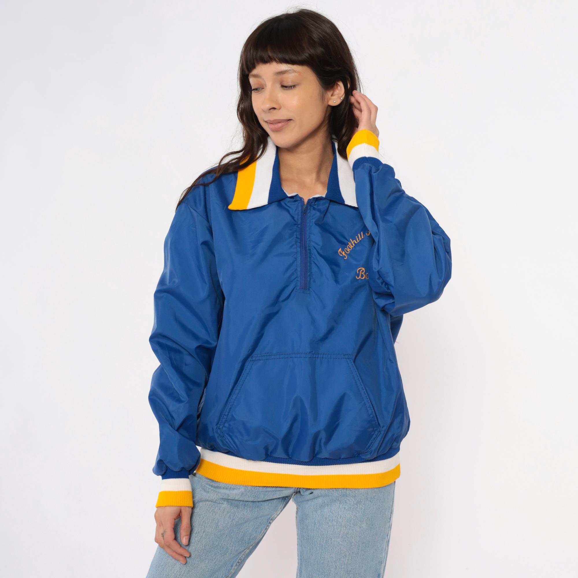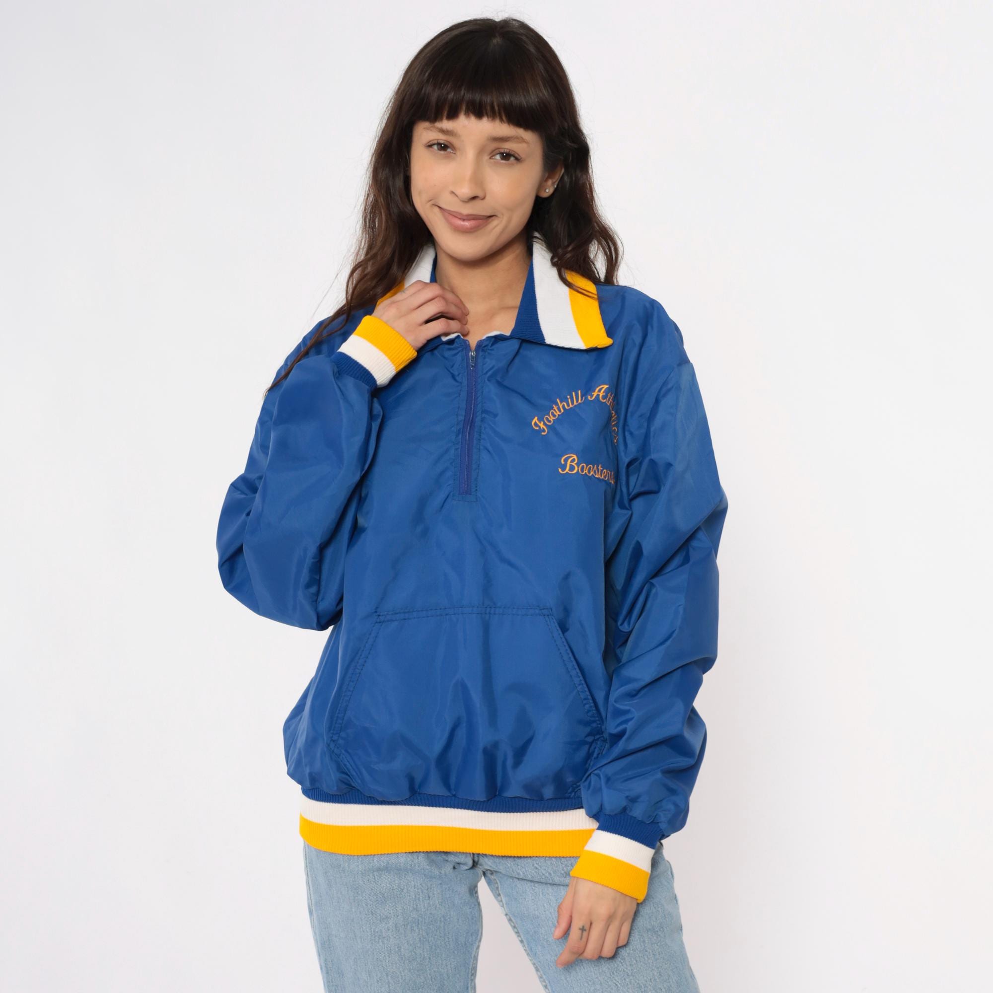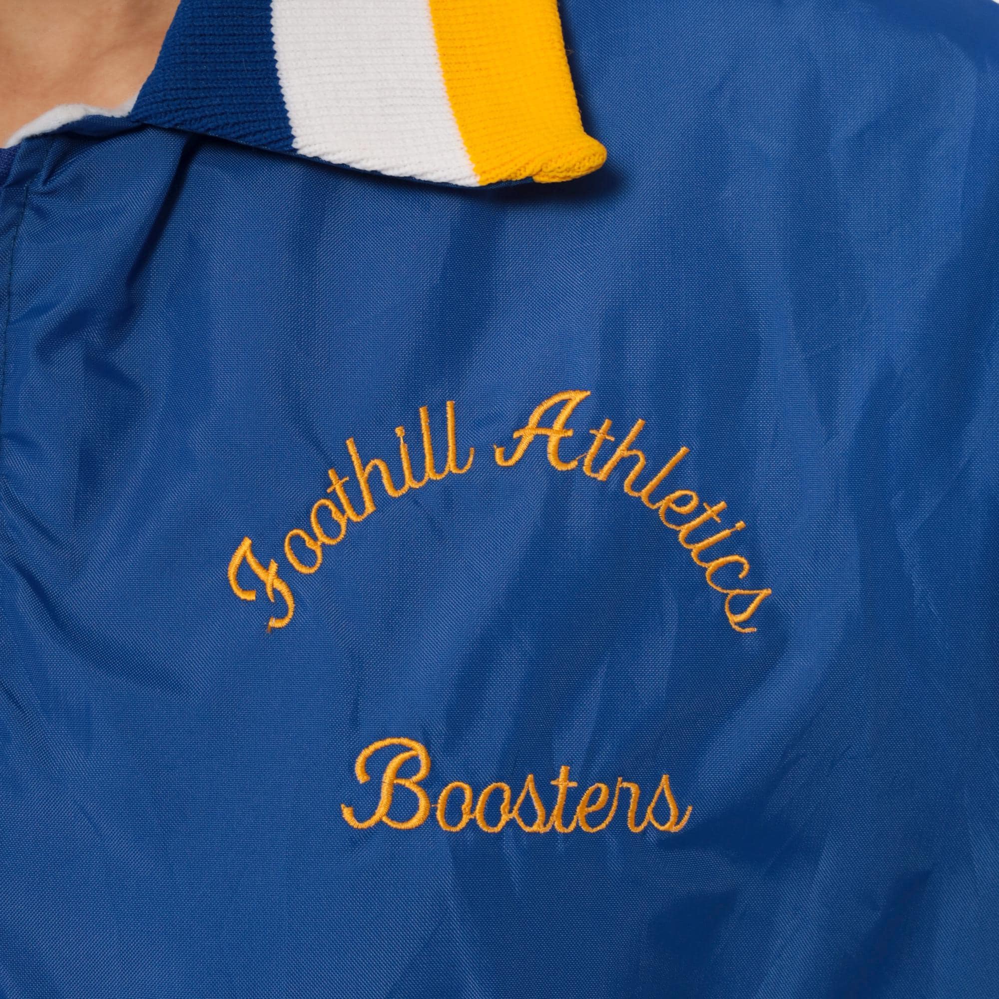 90s blue windbreaker pullover from Foothill Athletics Boosters with yellow, white, and dark blue striped ribbed collar, cuffs, and hem. Partial front zipper closure, front kangaroo pocket, yellow embroidered lettering on chest and back.