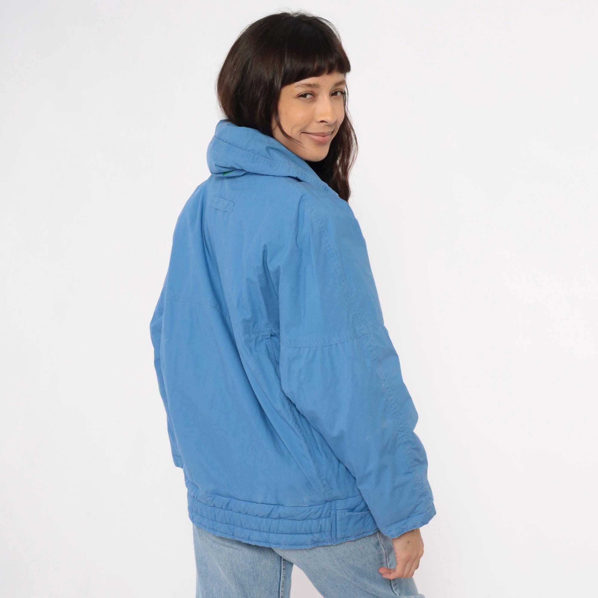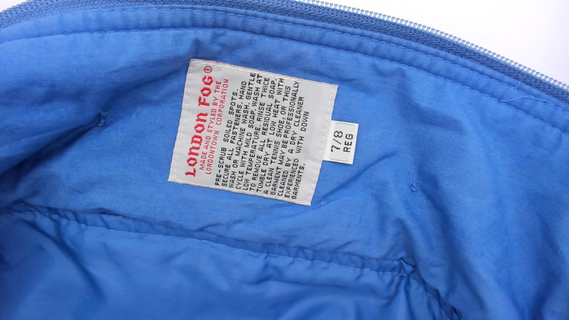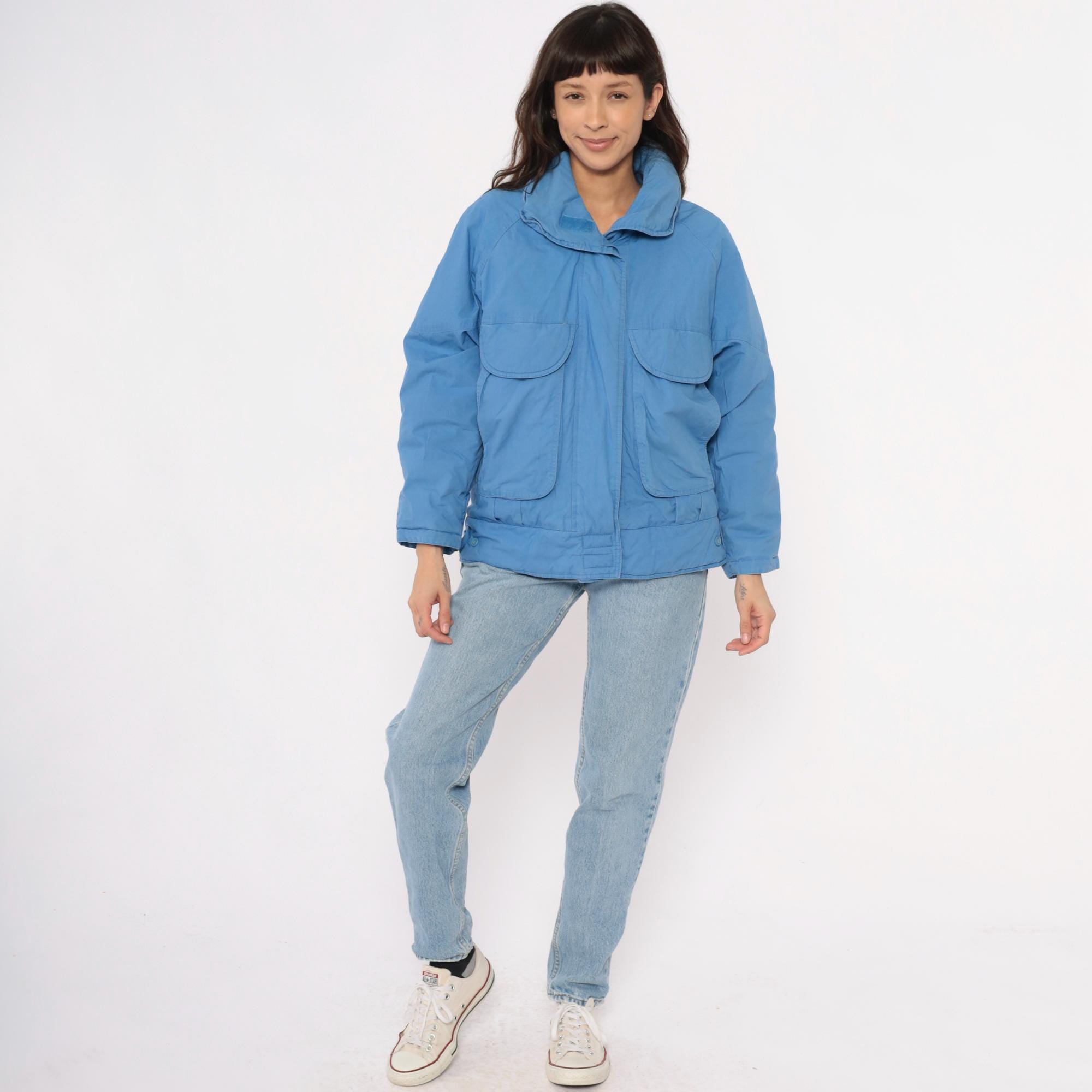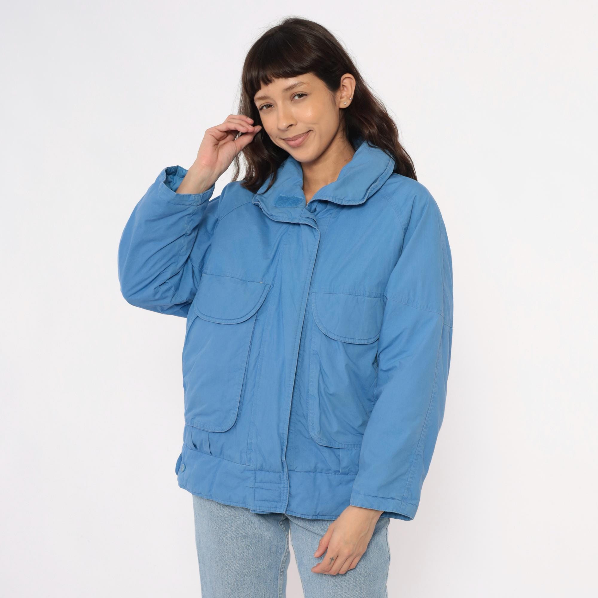 80s periwinkle blue puffer jacket from Winning Edge London Fog with collar and button tab closure at neck. Hidden front zipper, two large chest pockets with curved flaps, raglan sleeves, elasticated hem.