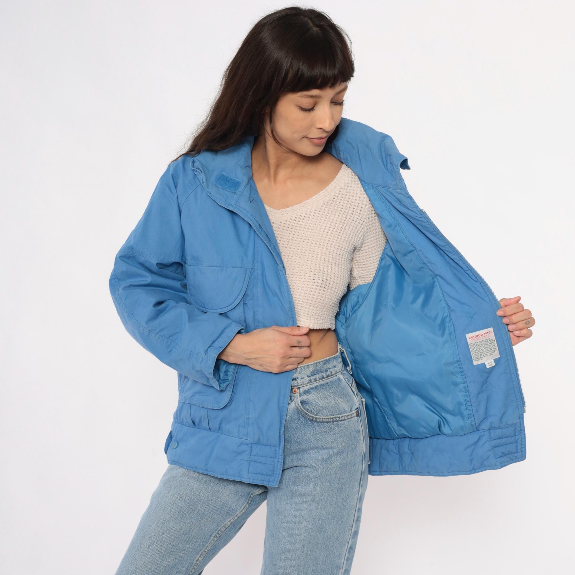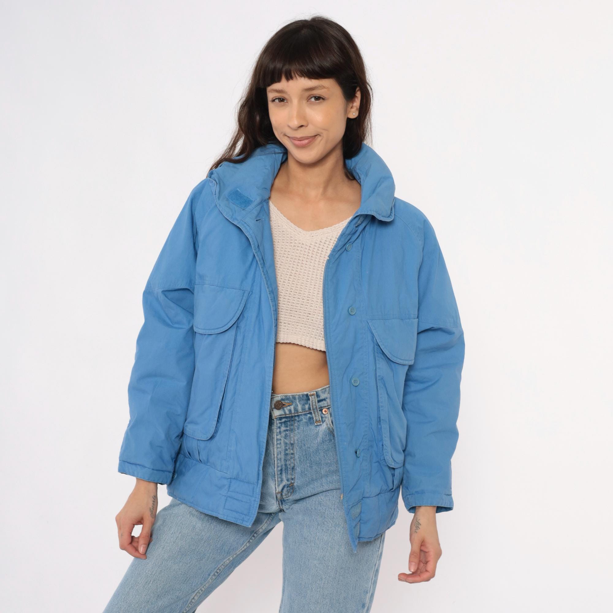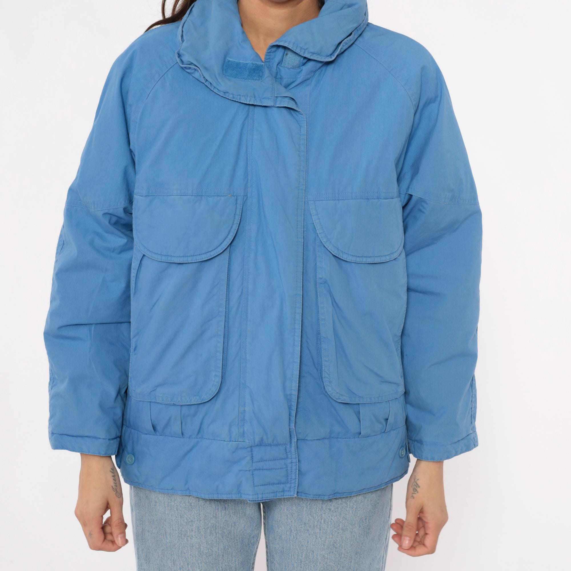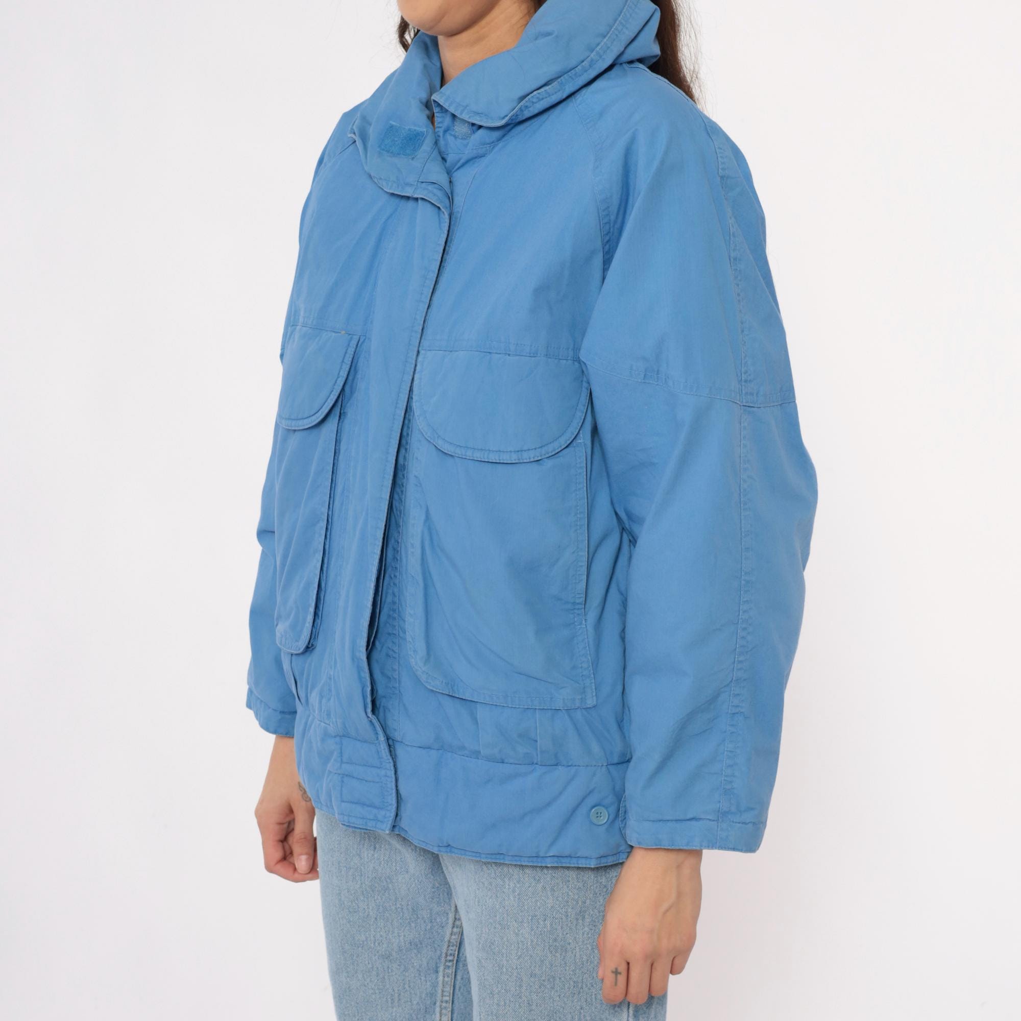 80s periwinkle blue puffer jacket from Winning Edge London Fog with collar and button tab closure at neck. Hidden front zipper, two large chest pockets with curved flaps, raglan sleeves, elasticated hem.