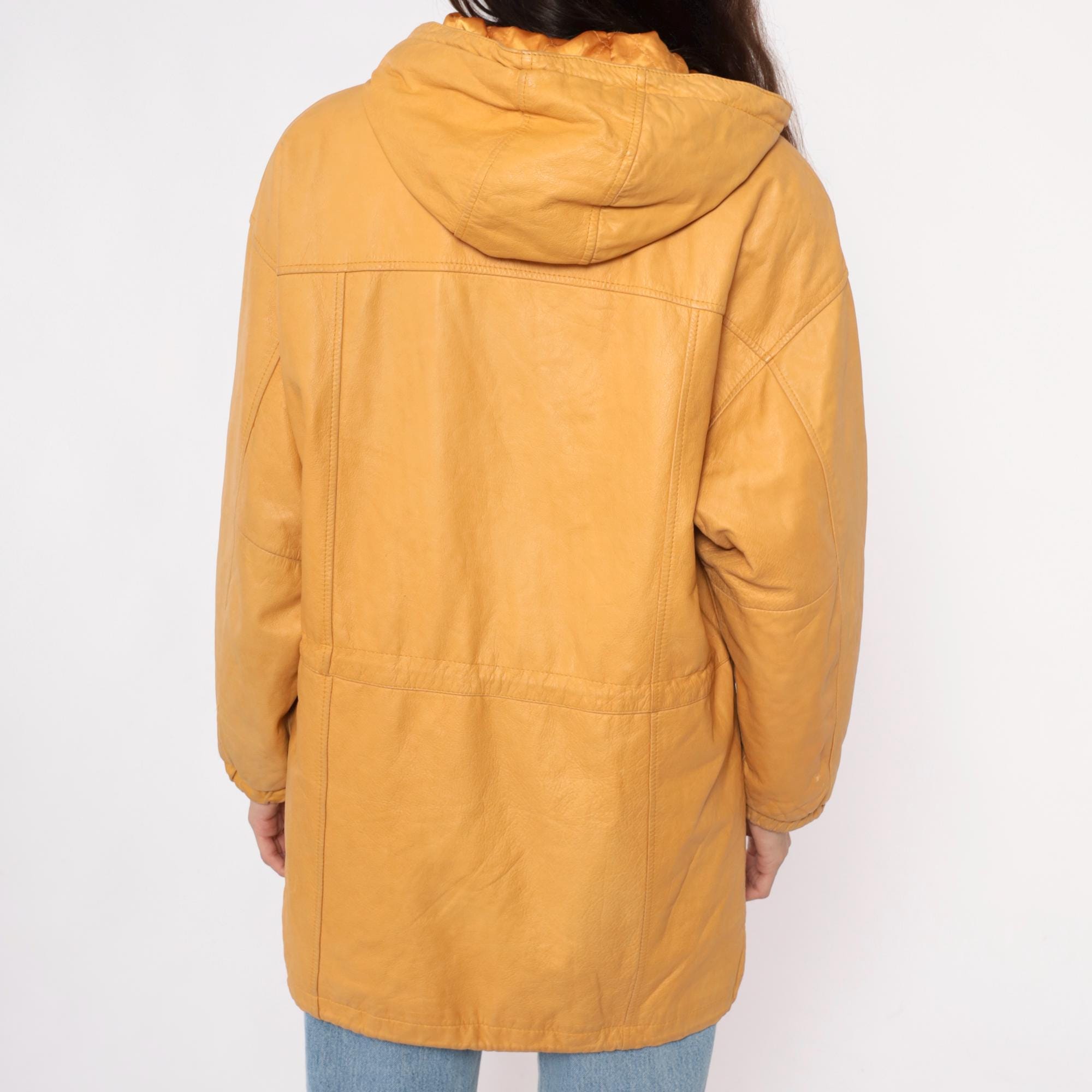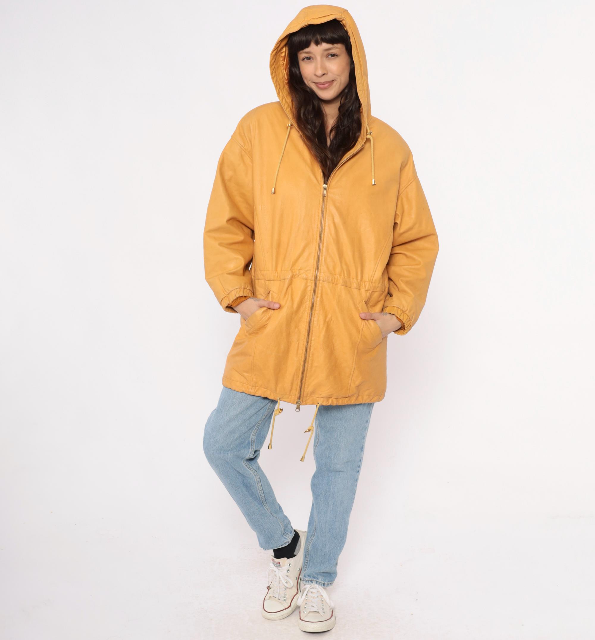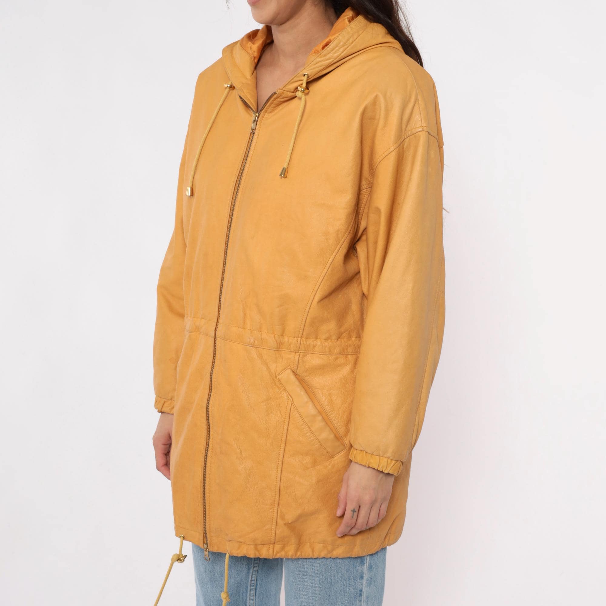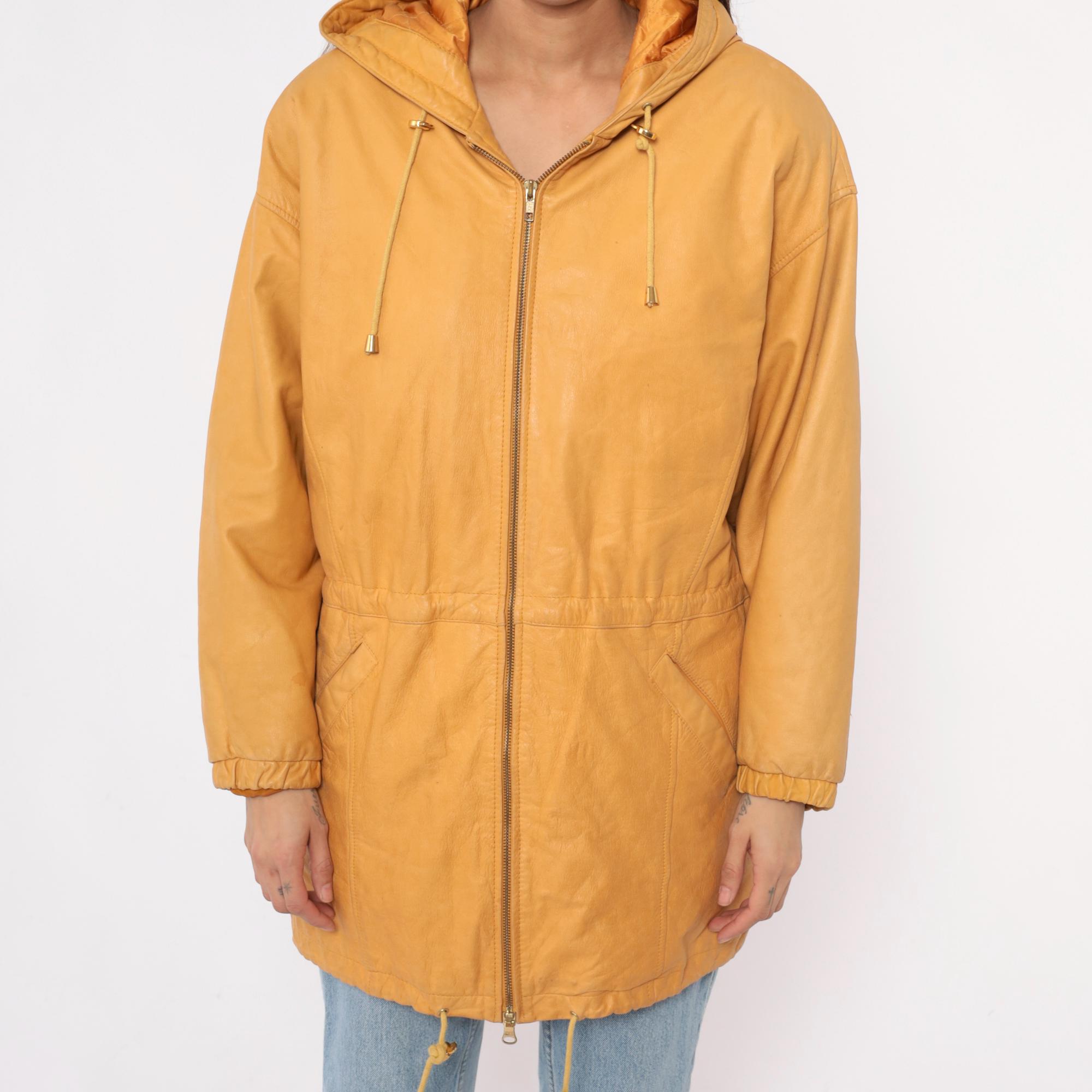 90s golden yellow hooded leather jacket from Wilsons with front zip closure and metal-tipped drawstrings. Two front pockets, structured shoulders, and longer coat-length silhouette.