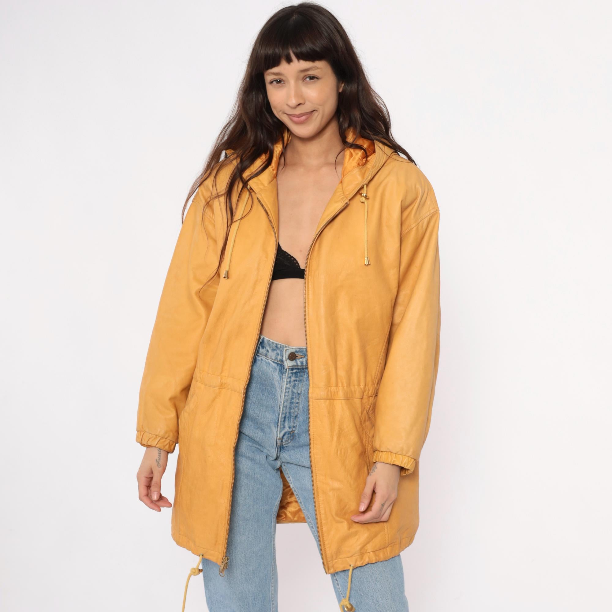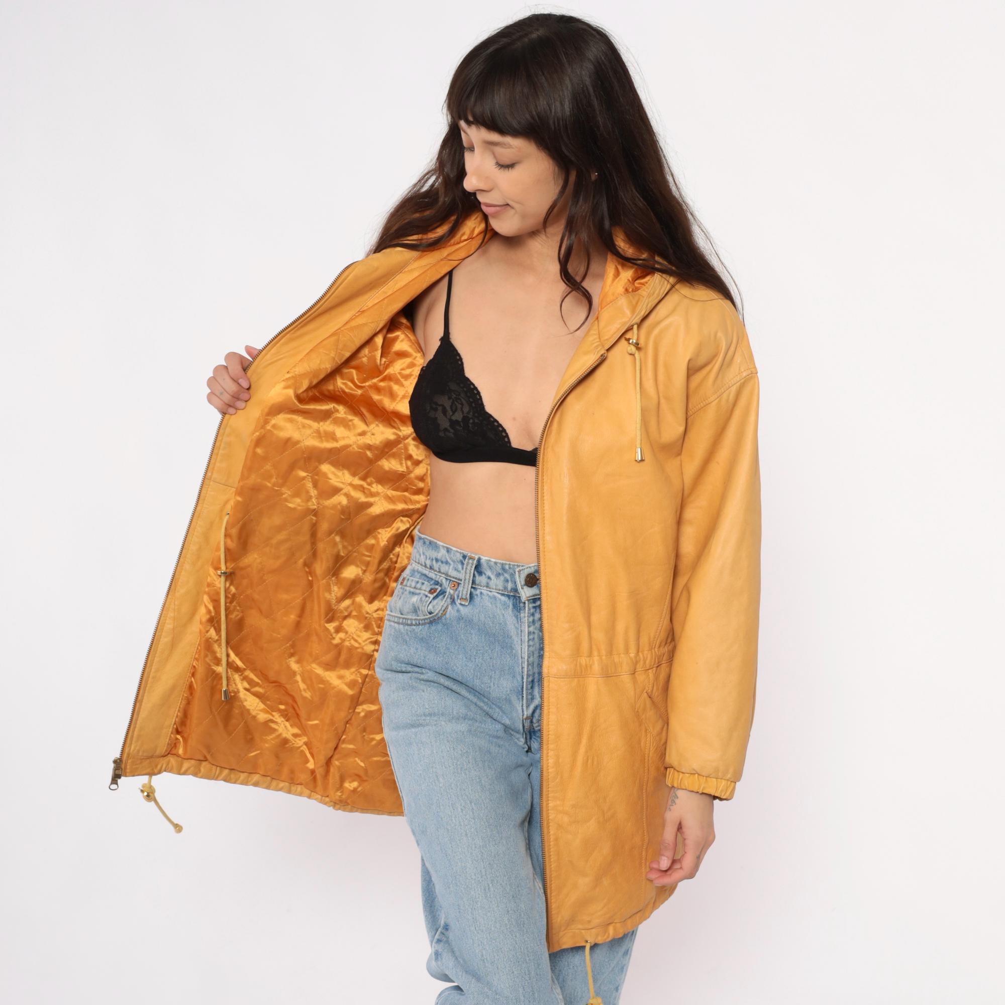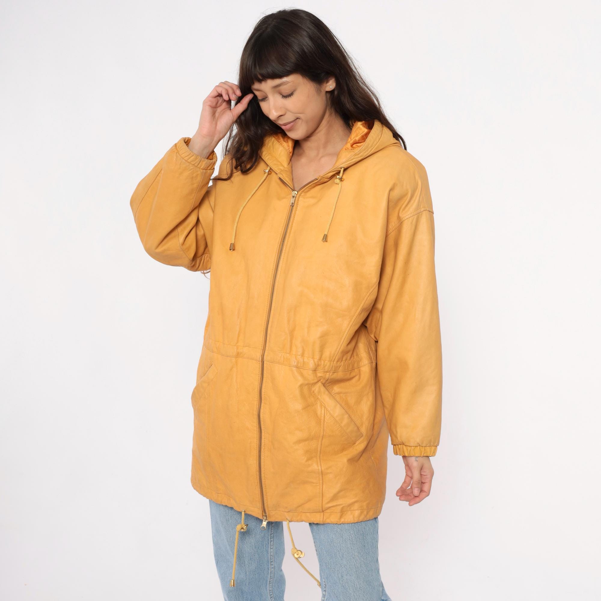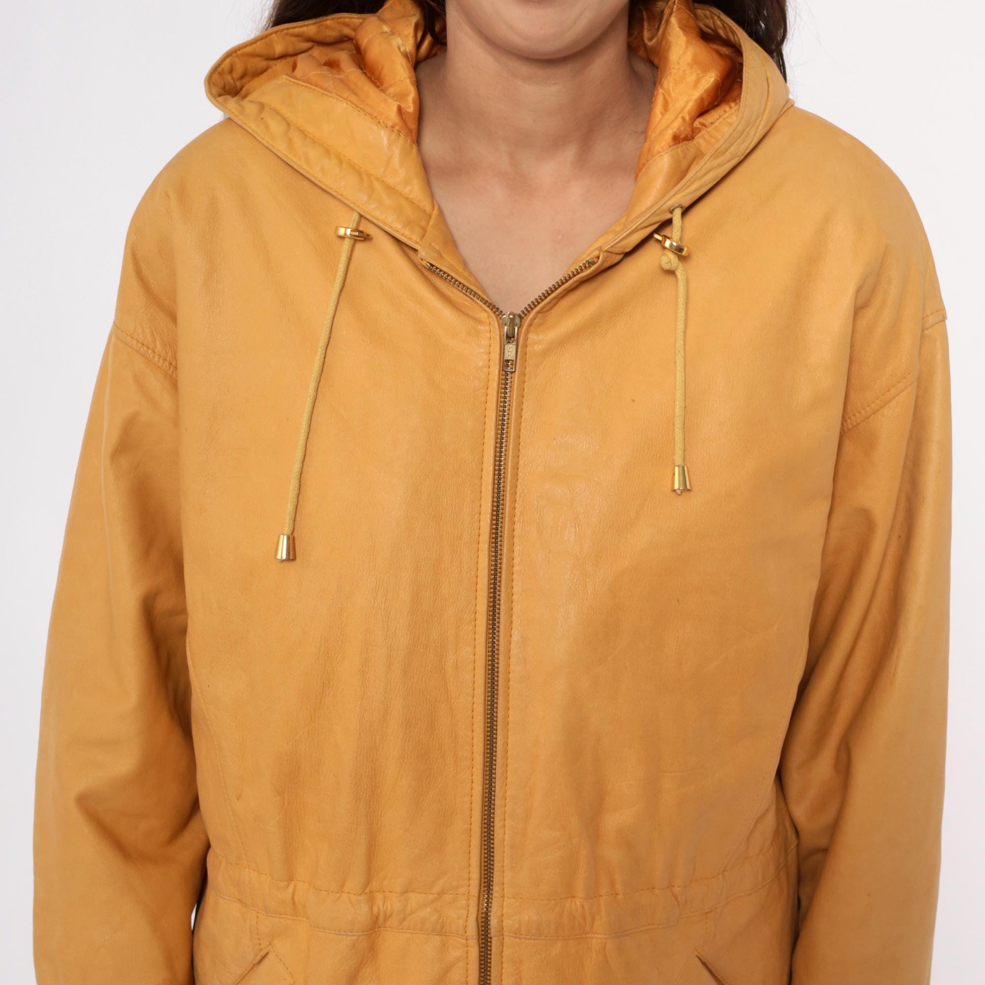 90s golden yellow hooded leather jacket from Wilsons with front zip closure and metal-tipped drawstrings. Two front pockets, structured shoulders, and longer coat-length silhouette.