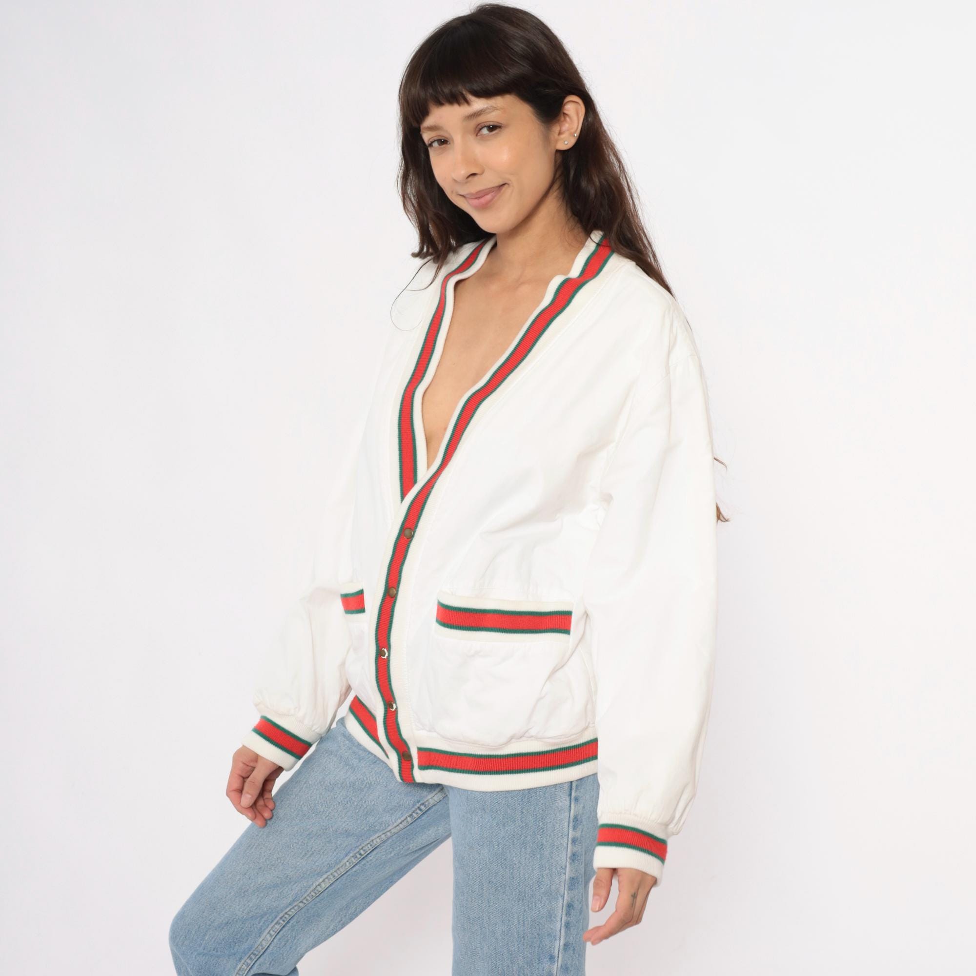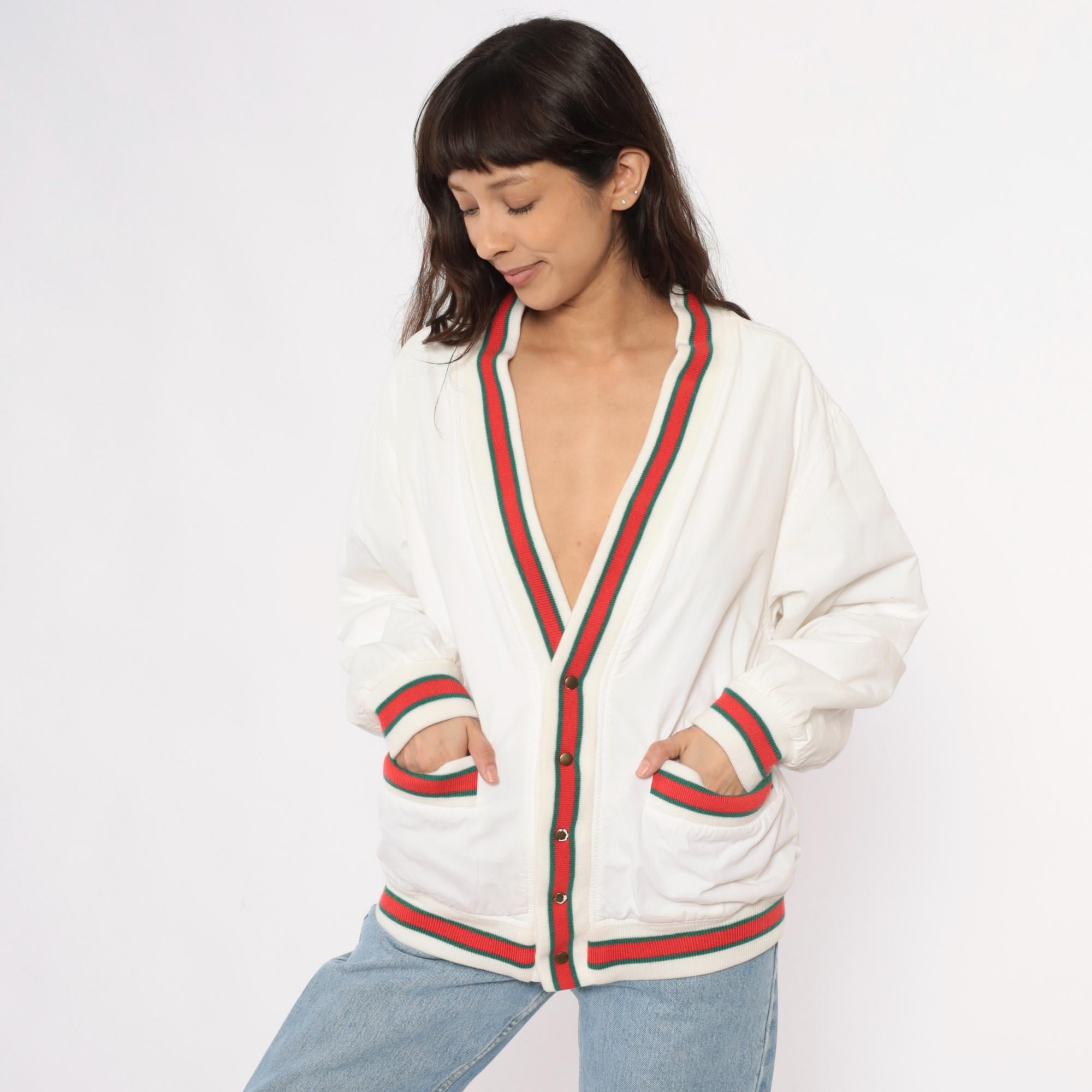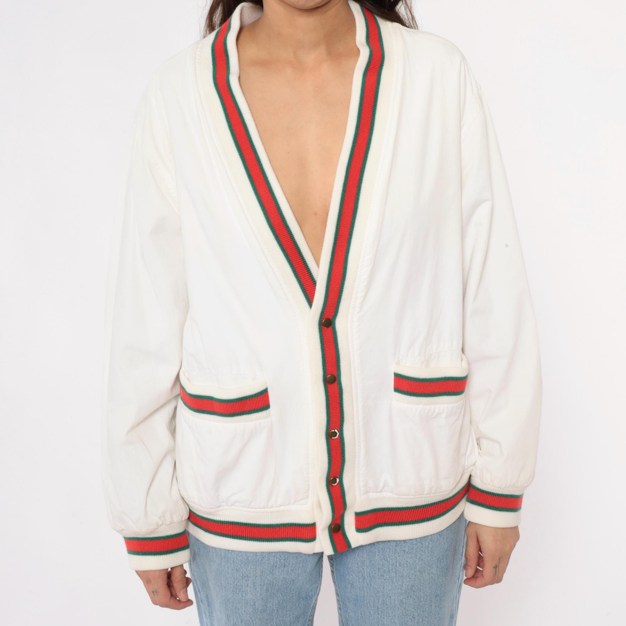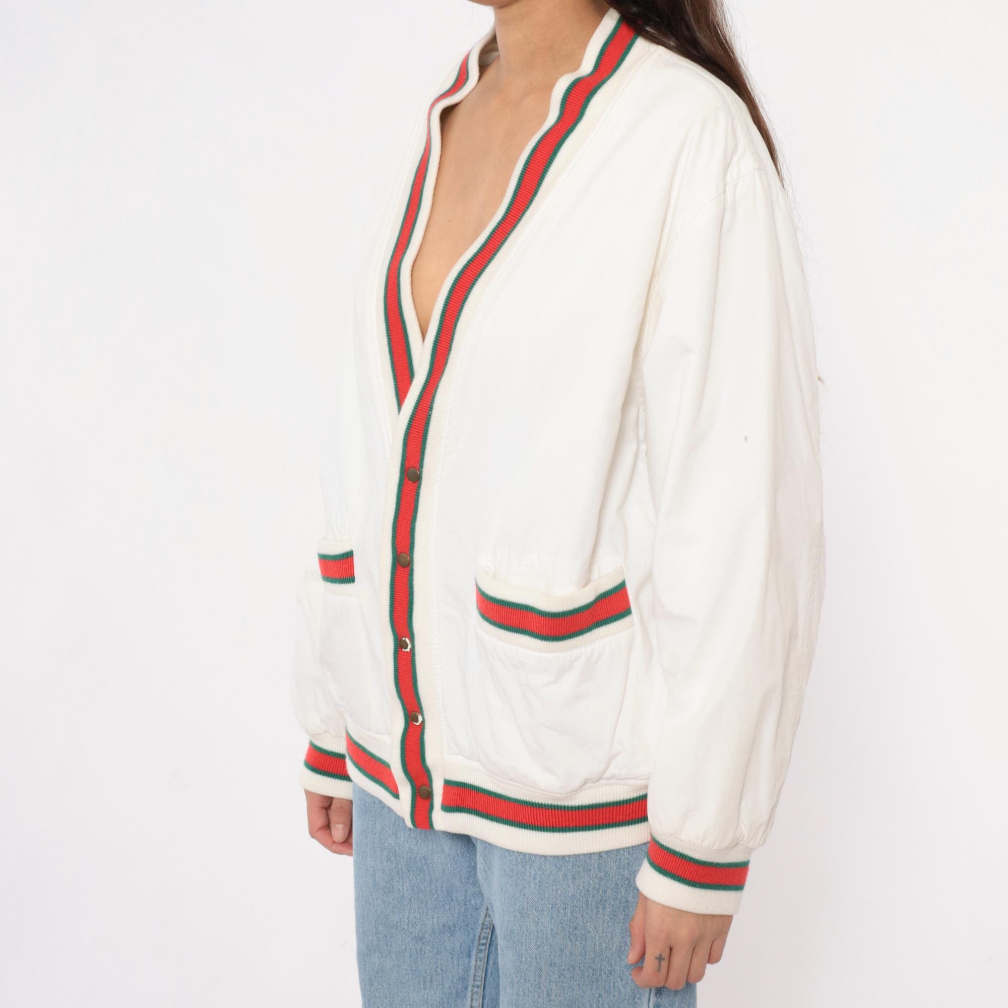 80s cream cardigan with red and green striped ribbed trim at the collar, button placket, cuffs, hem, and patch pocket edges. Button front closure with dark buttons, two front patch pockets, long sleeves.