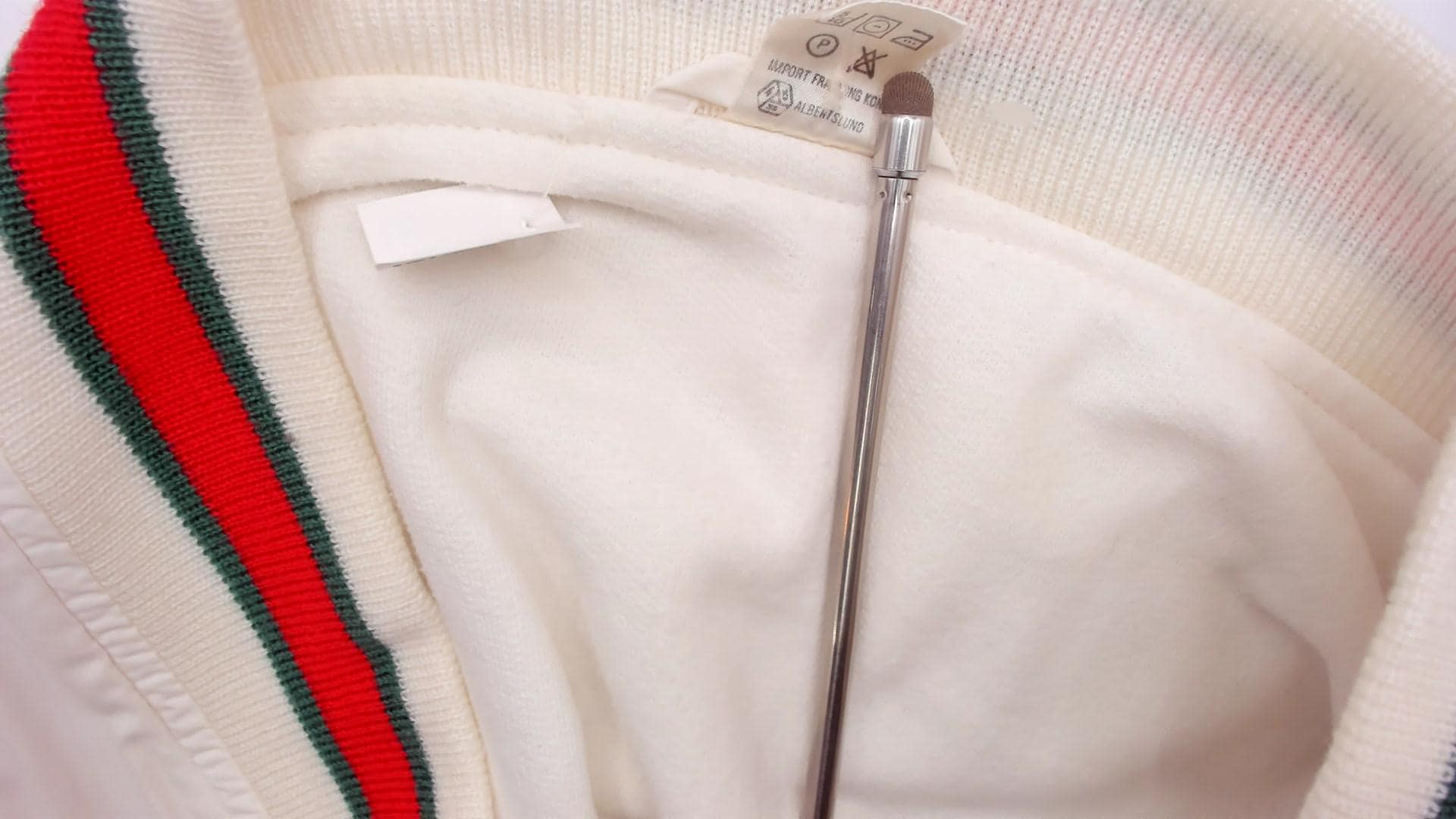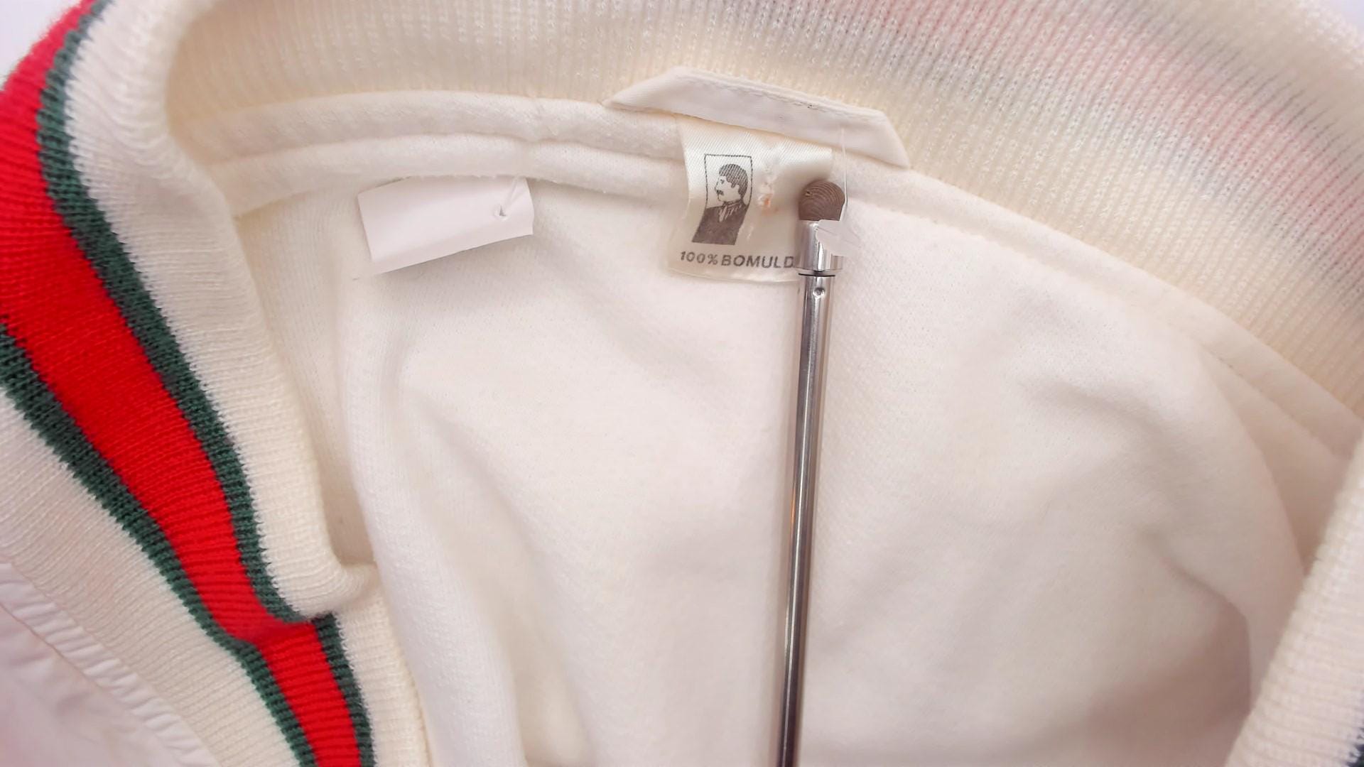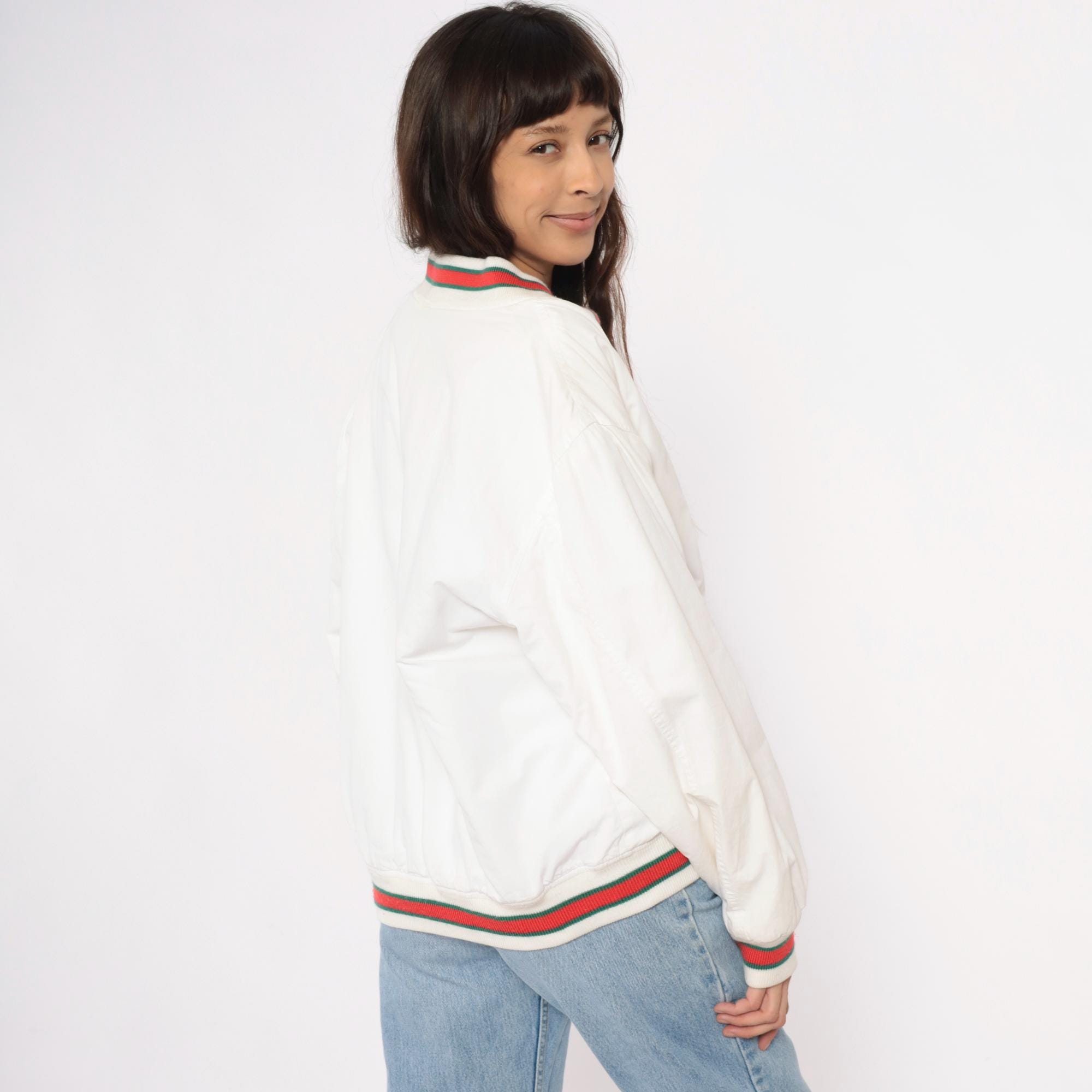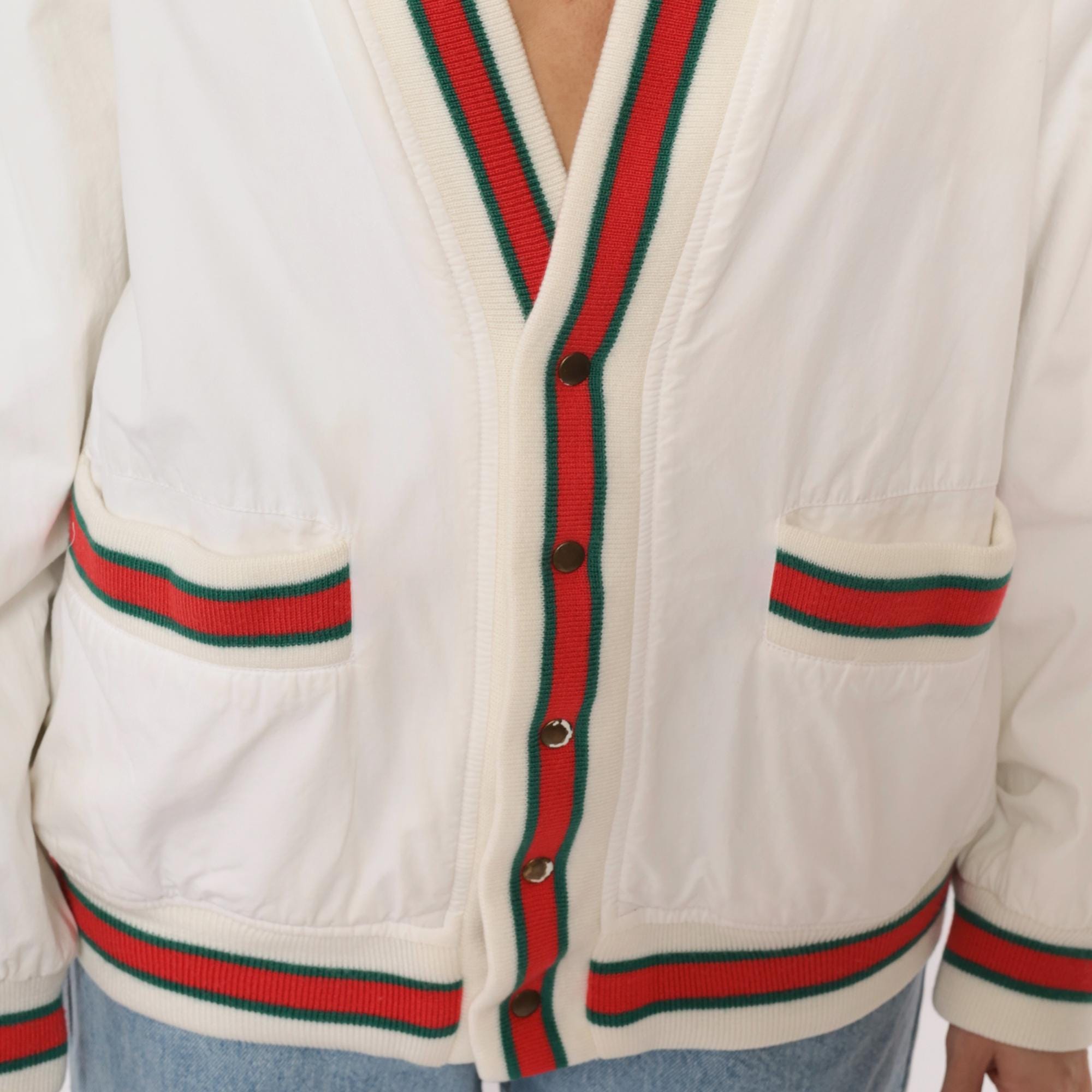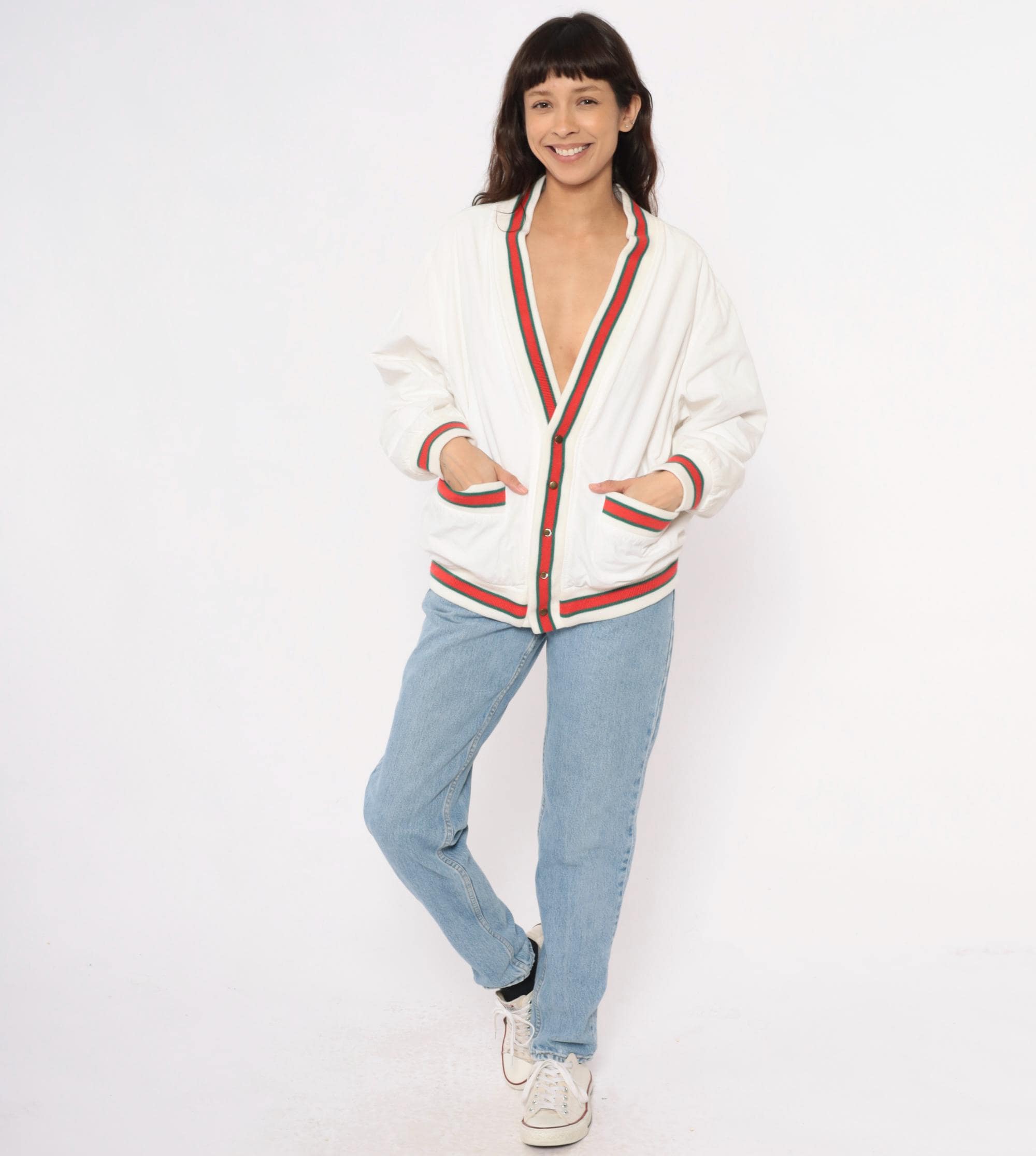 80s cream cardigan with red and green striped ribbed trim at the collar, button placket, cuffs, hem, and patch pocket edges. Button front closure with dark buttons, two front patch pockets, long sleeves.