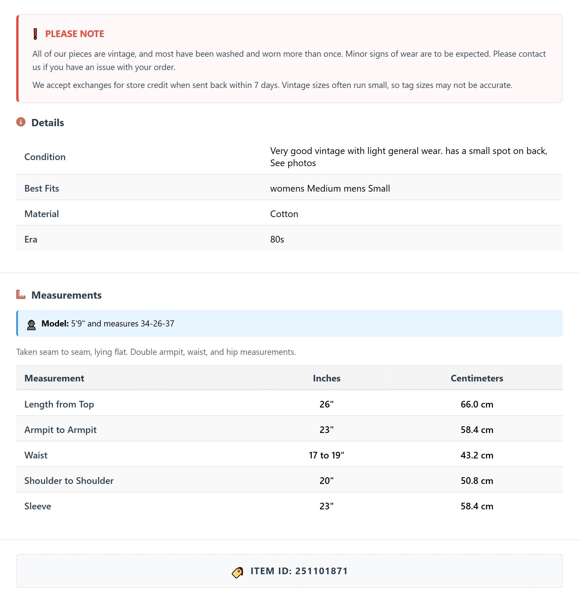 All of our pieces are vintage, and most have been washed and worn more than once. Minor signs of wear are to be expected. Please contact us if you have an issue with your order. We accept exchanges for store credit when sent back within 7 days.