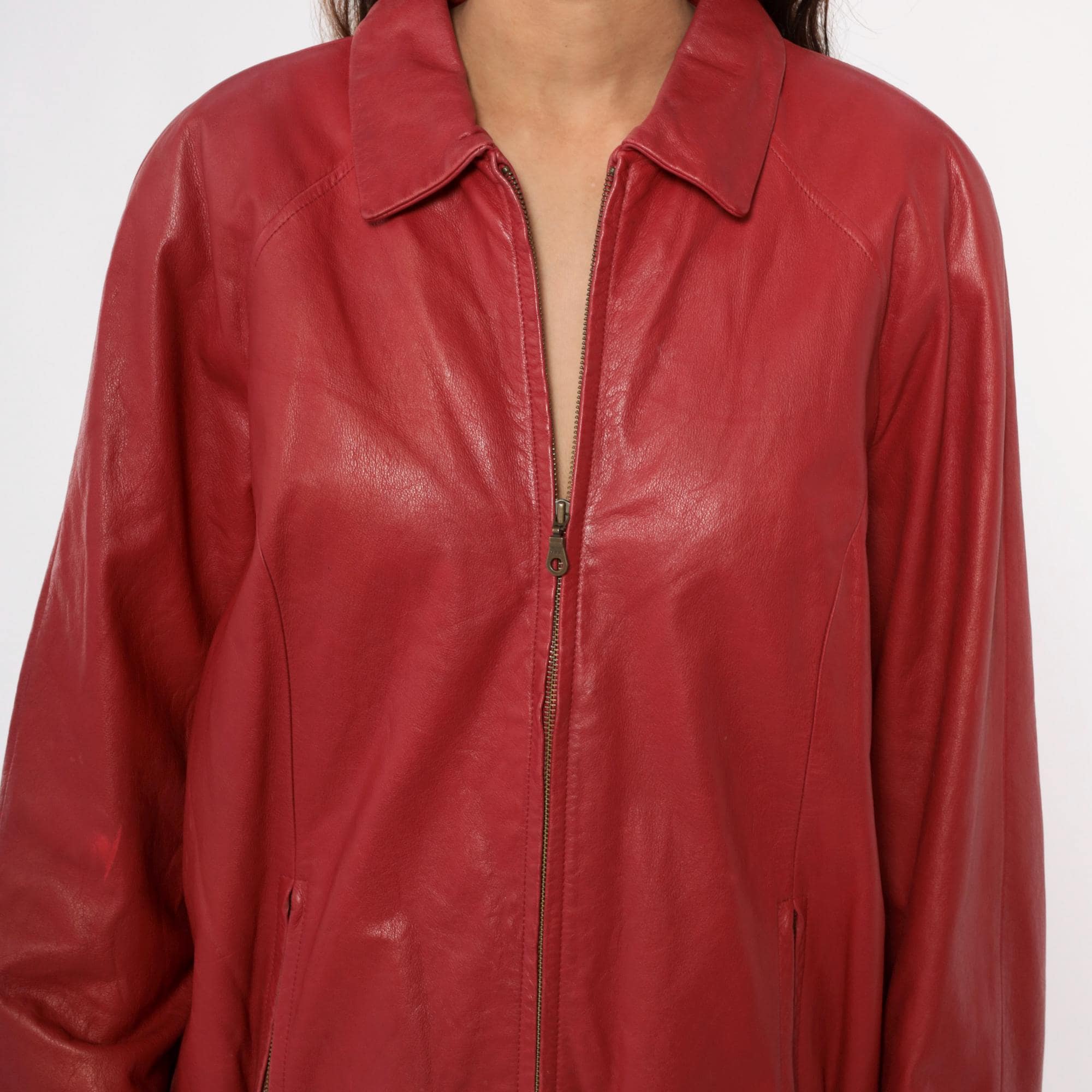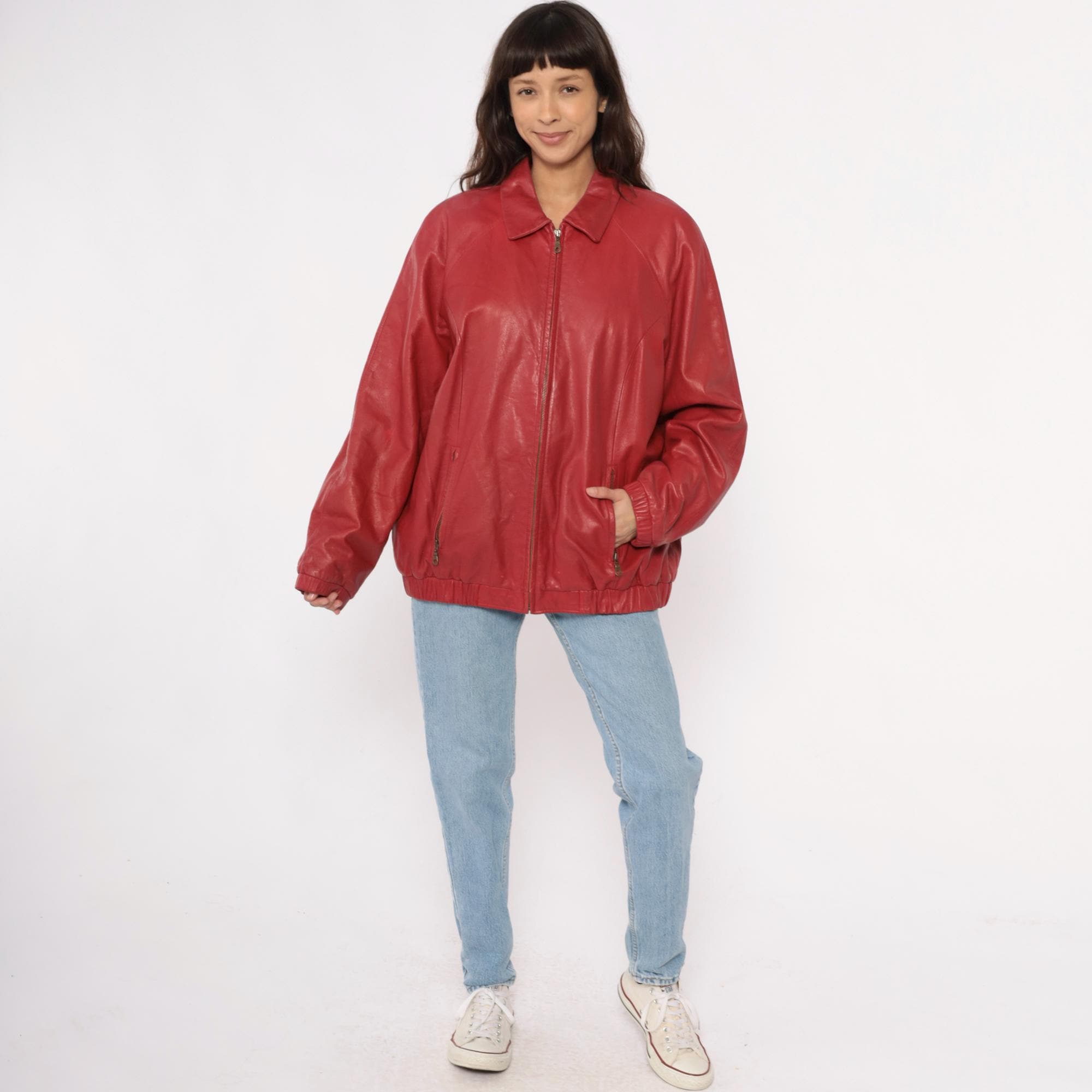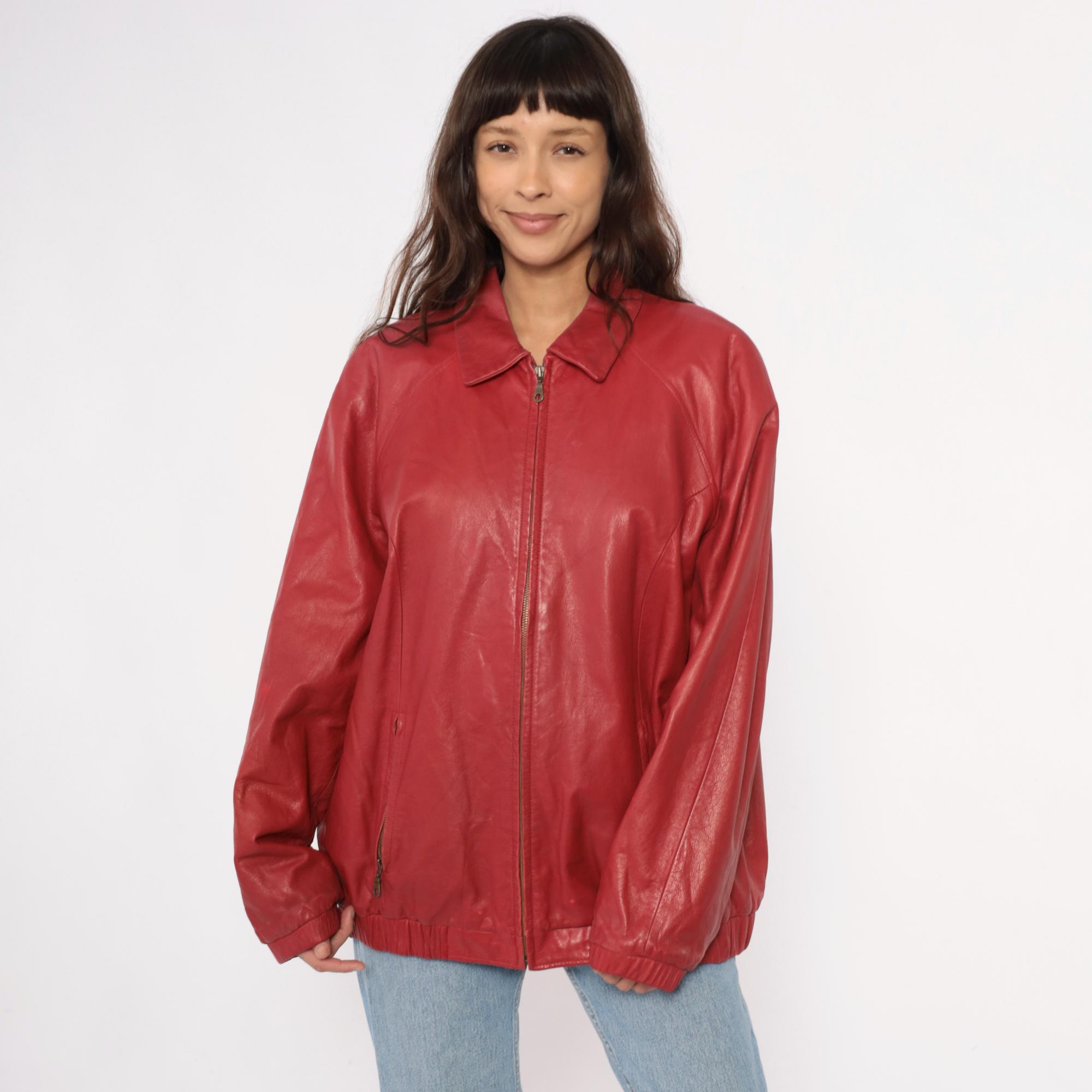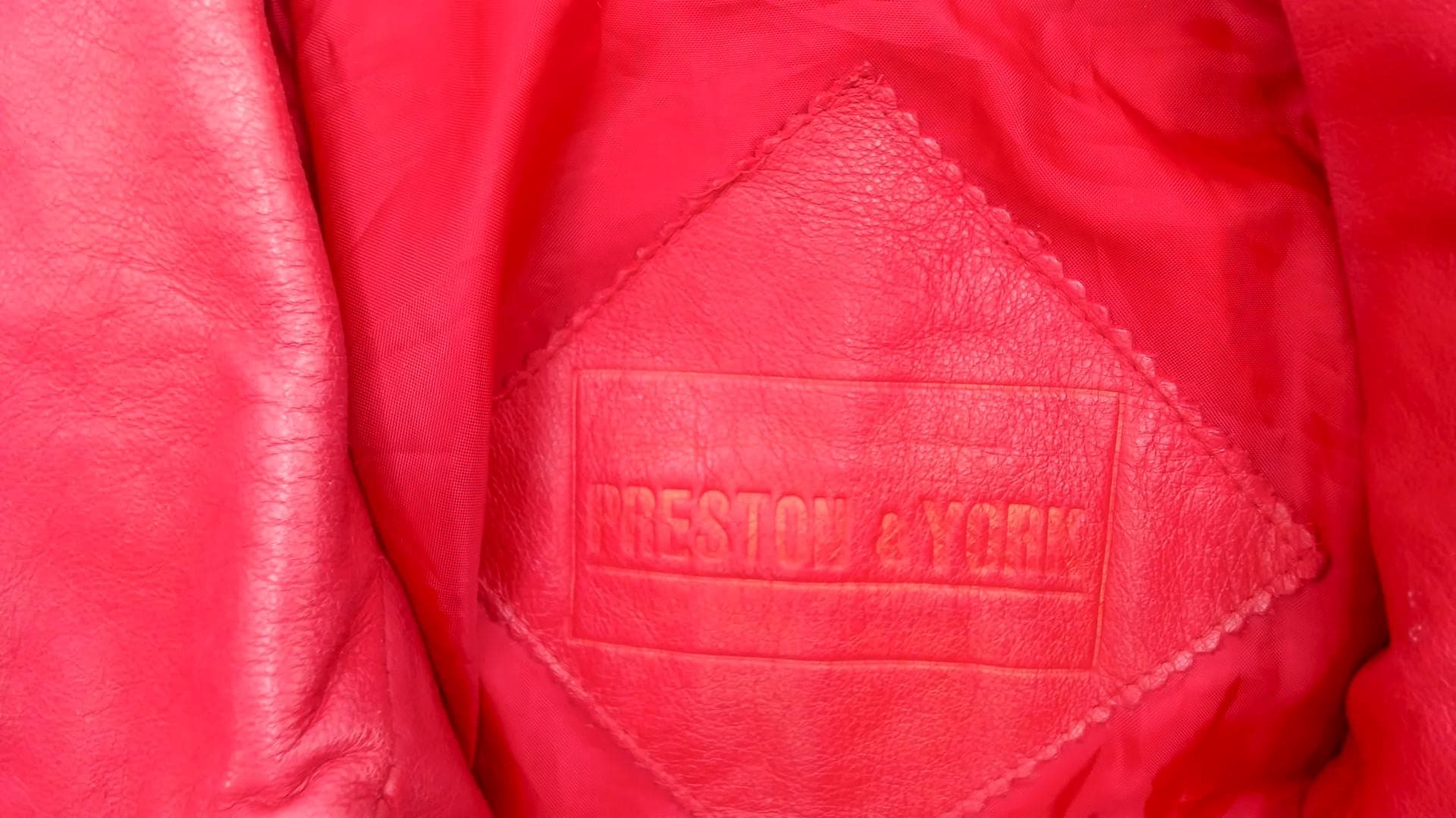 90s red leather jacket from preston & york with pointed collar and full front zipper closure. Two front zipper pockets, long sleeves with elasticized cuffs, elasticized hem at waist.