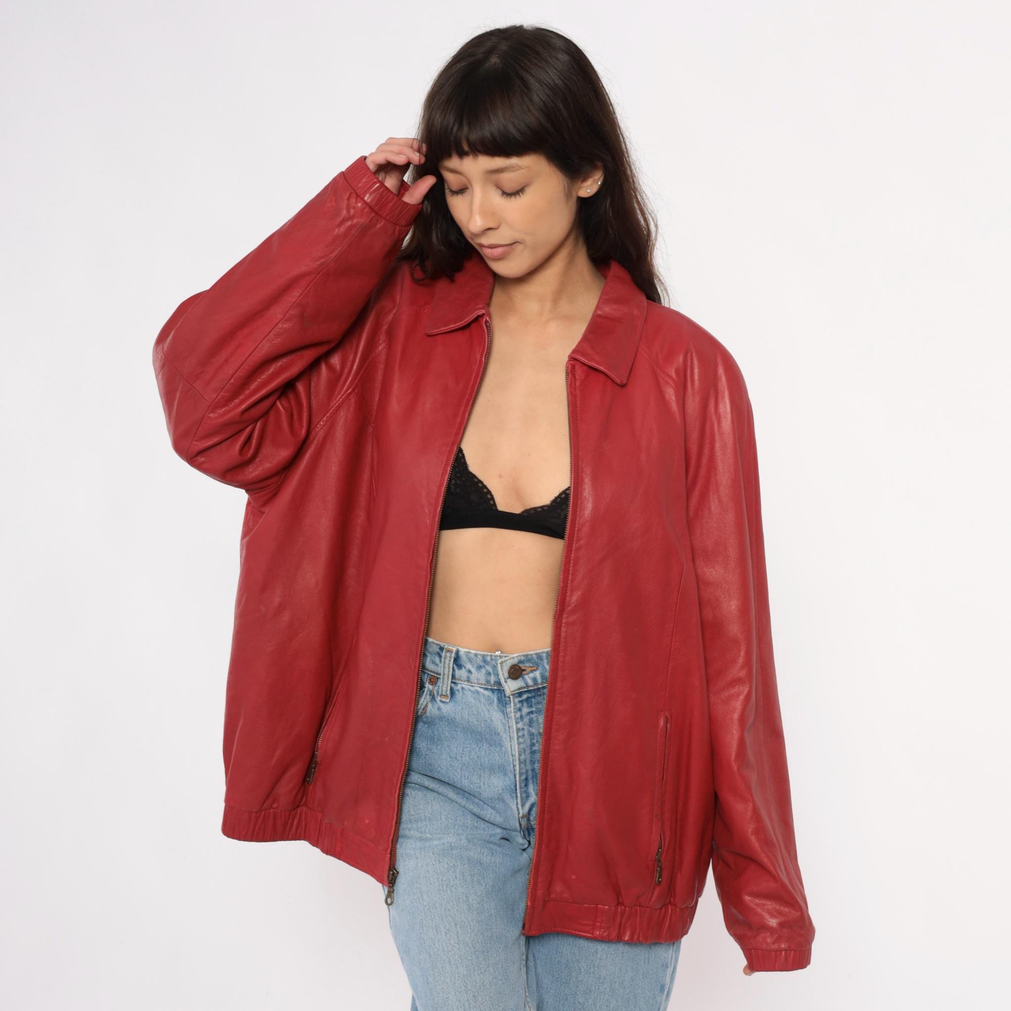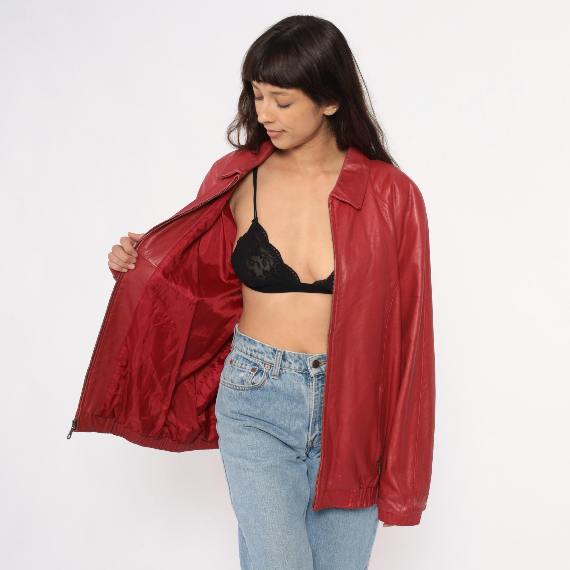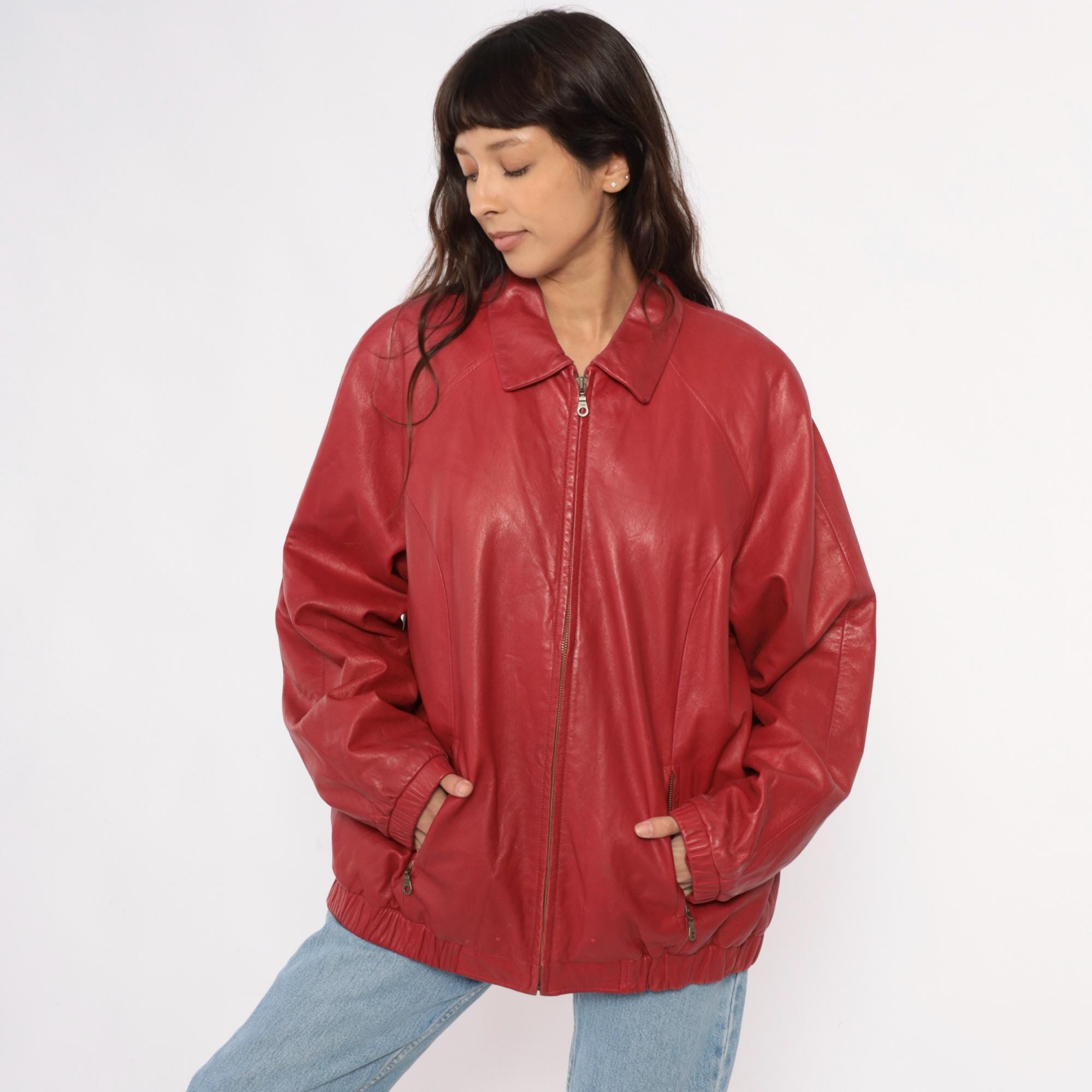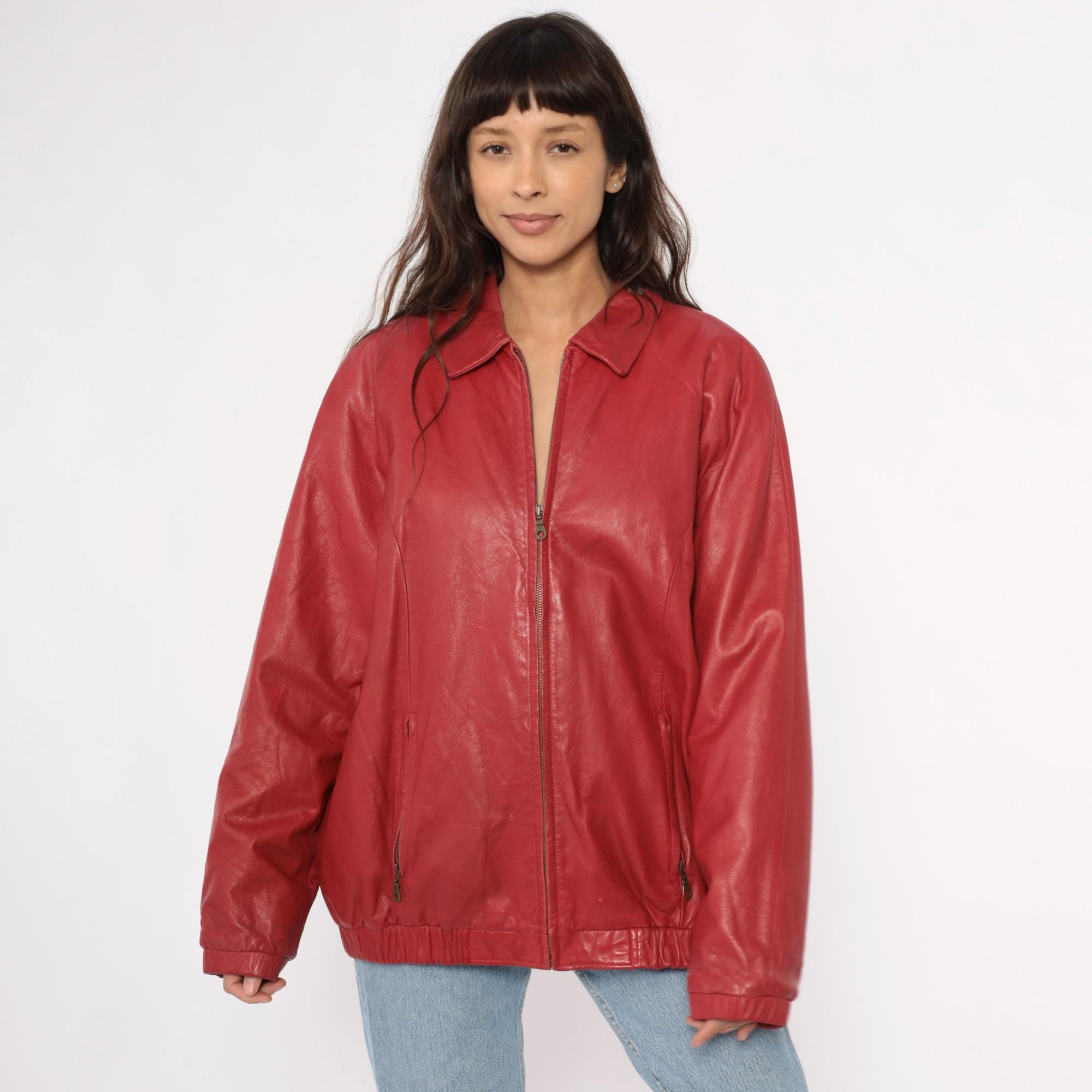90s red leather jacket from preston & york with pointed collar and full front zipper closure. Two front zipper pockets, long sleeves with elasticized cuffs, elasticized hem at waist.