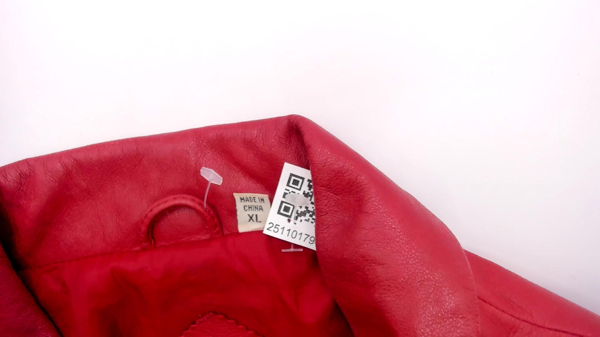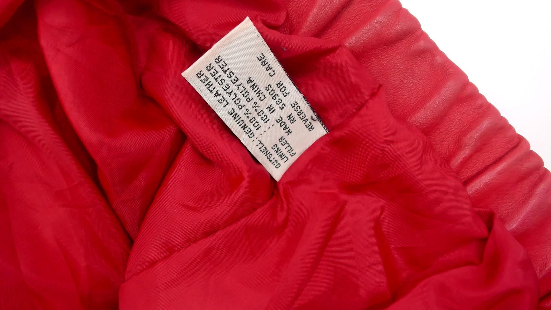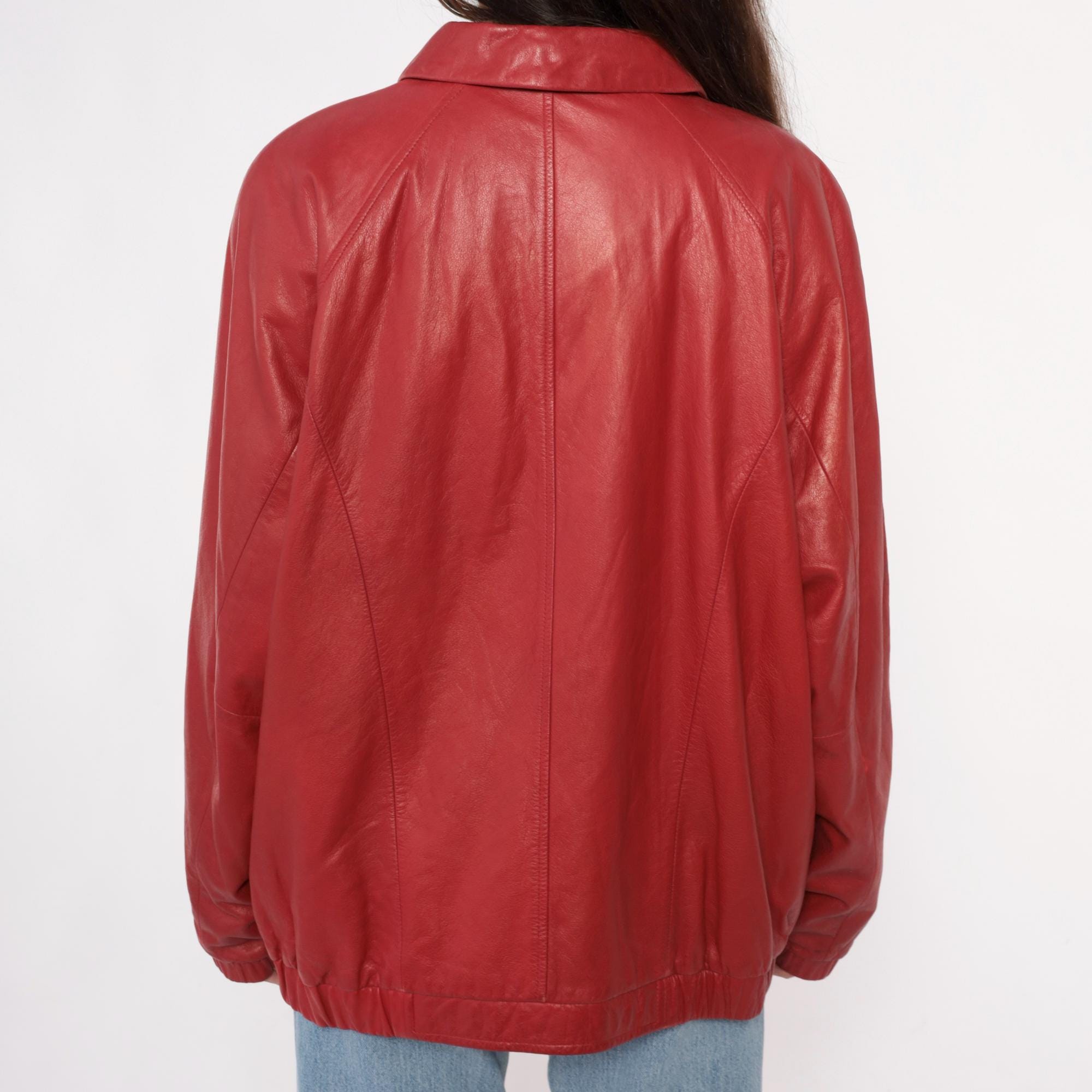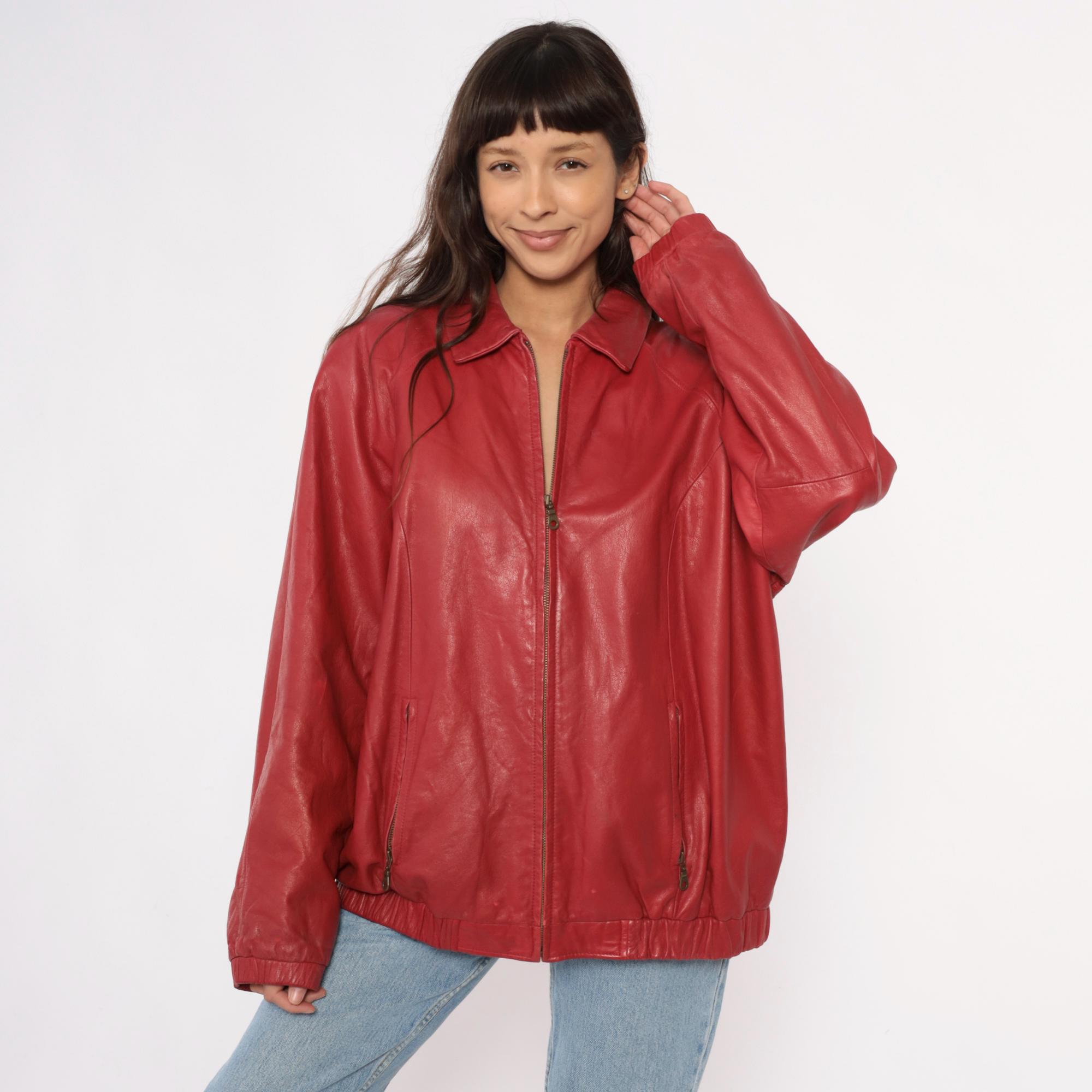 90s red leather jacket from preston & york with pointed collar and full front zipper closure. Two front zipper pockets, long sleeves with elasticized cuffs, elasticized hem at waist.