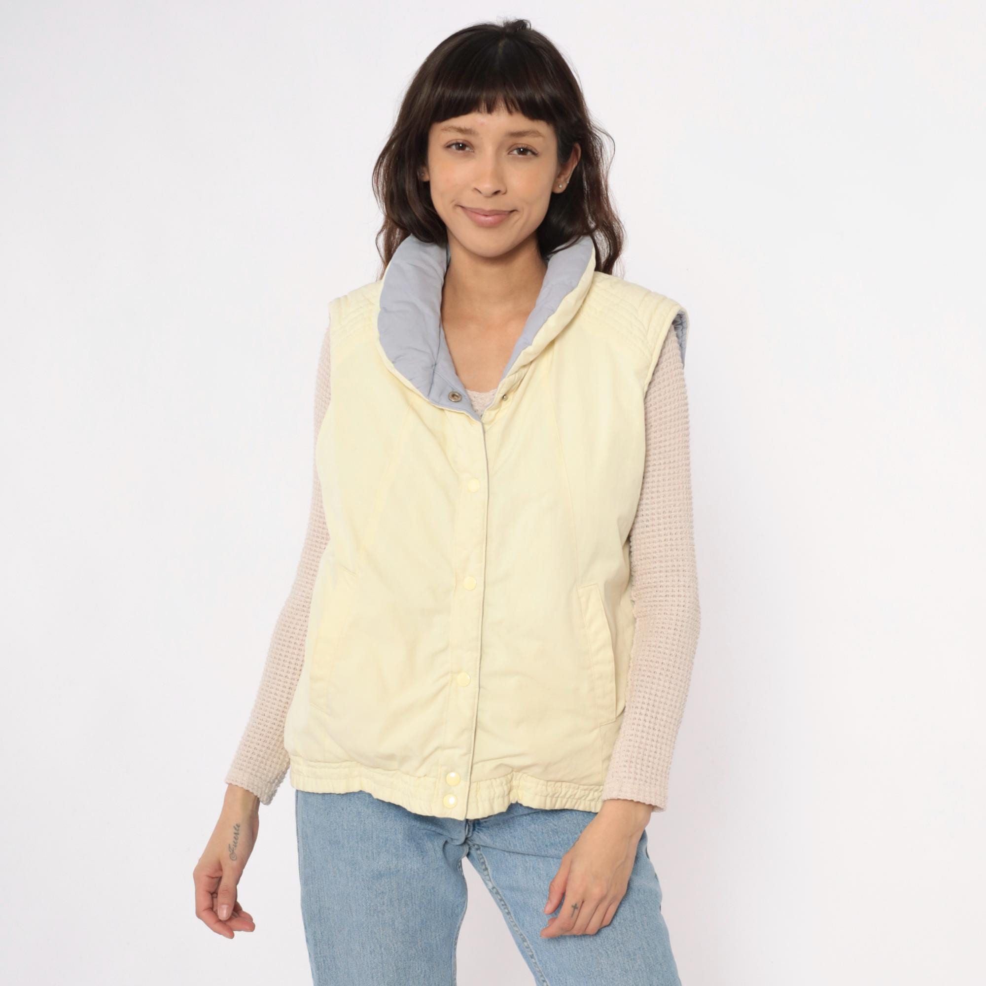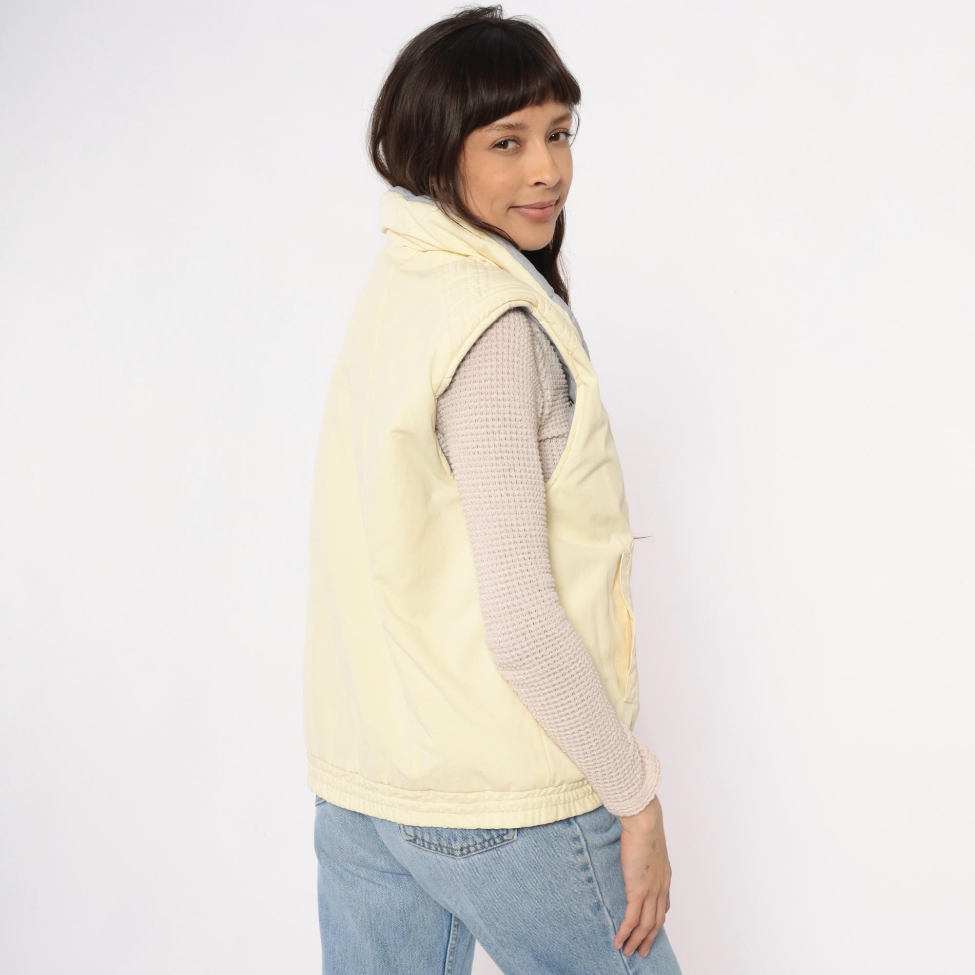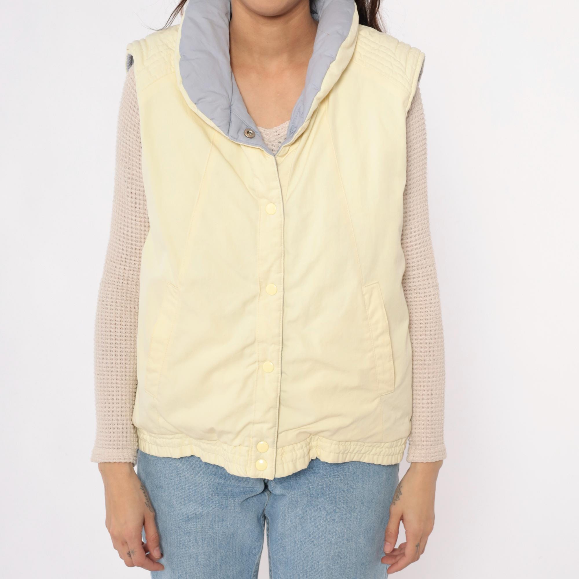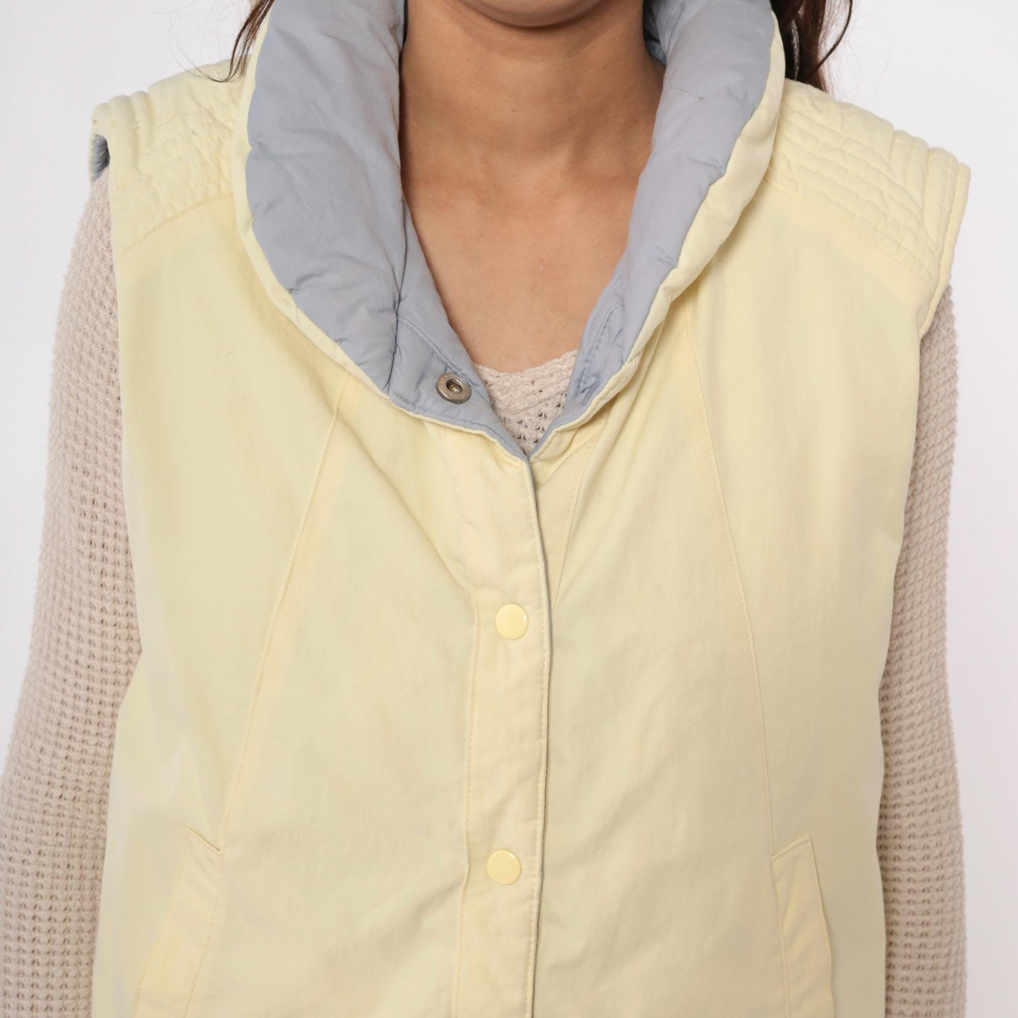 80s reversible quilted vest with pale yellow on one side and light gray on the reverse. Snap front closure, standing collar, and front pockets on both sides. Quilted diamond pattern throughout.
