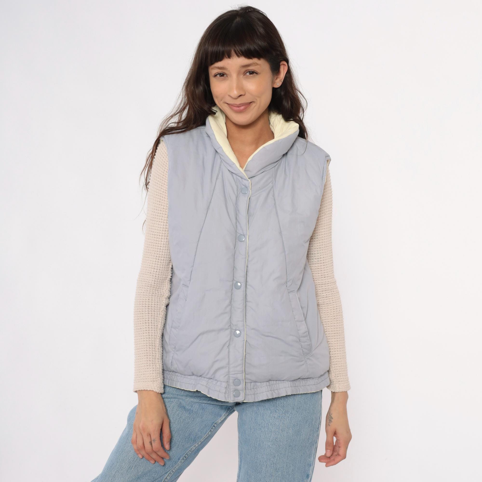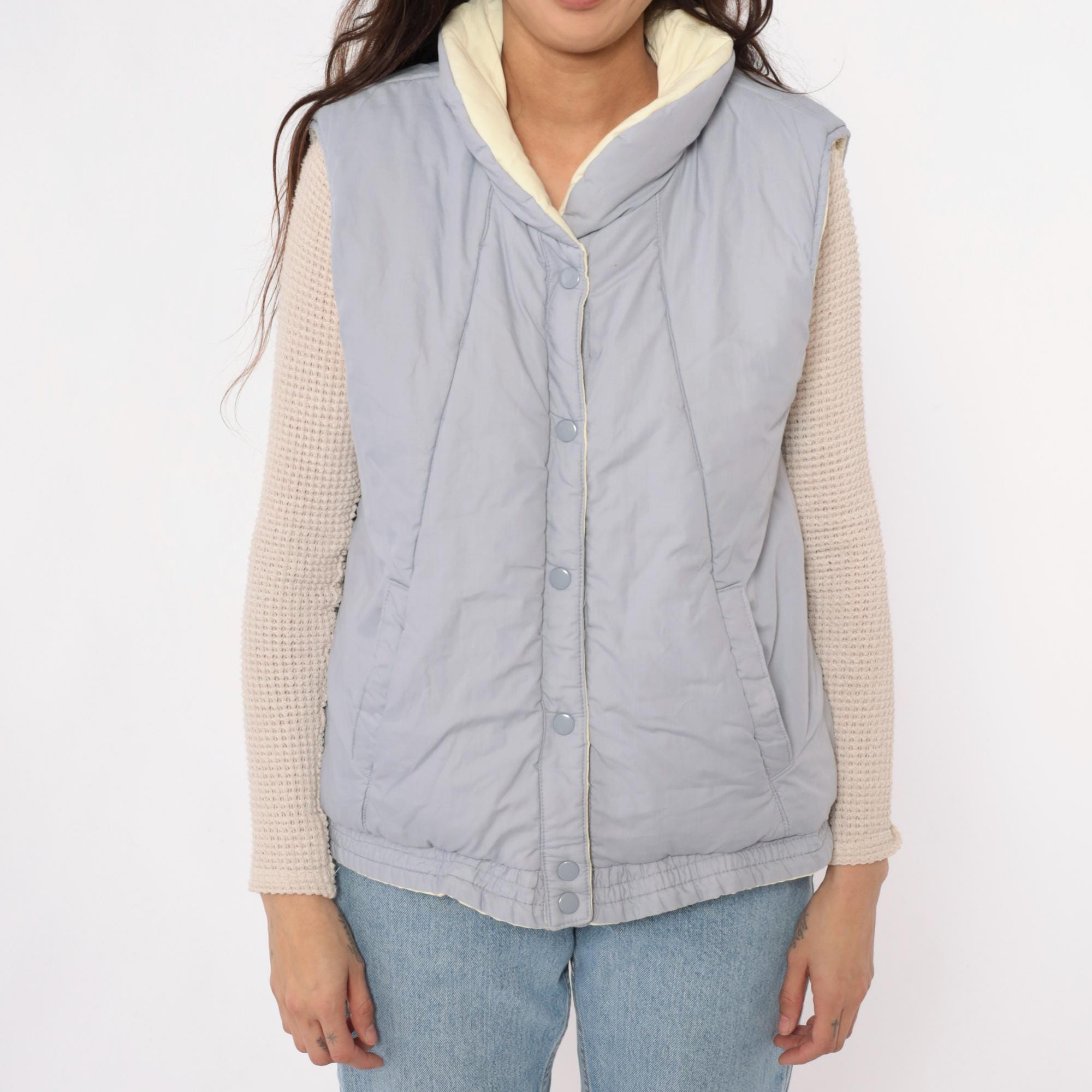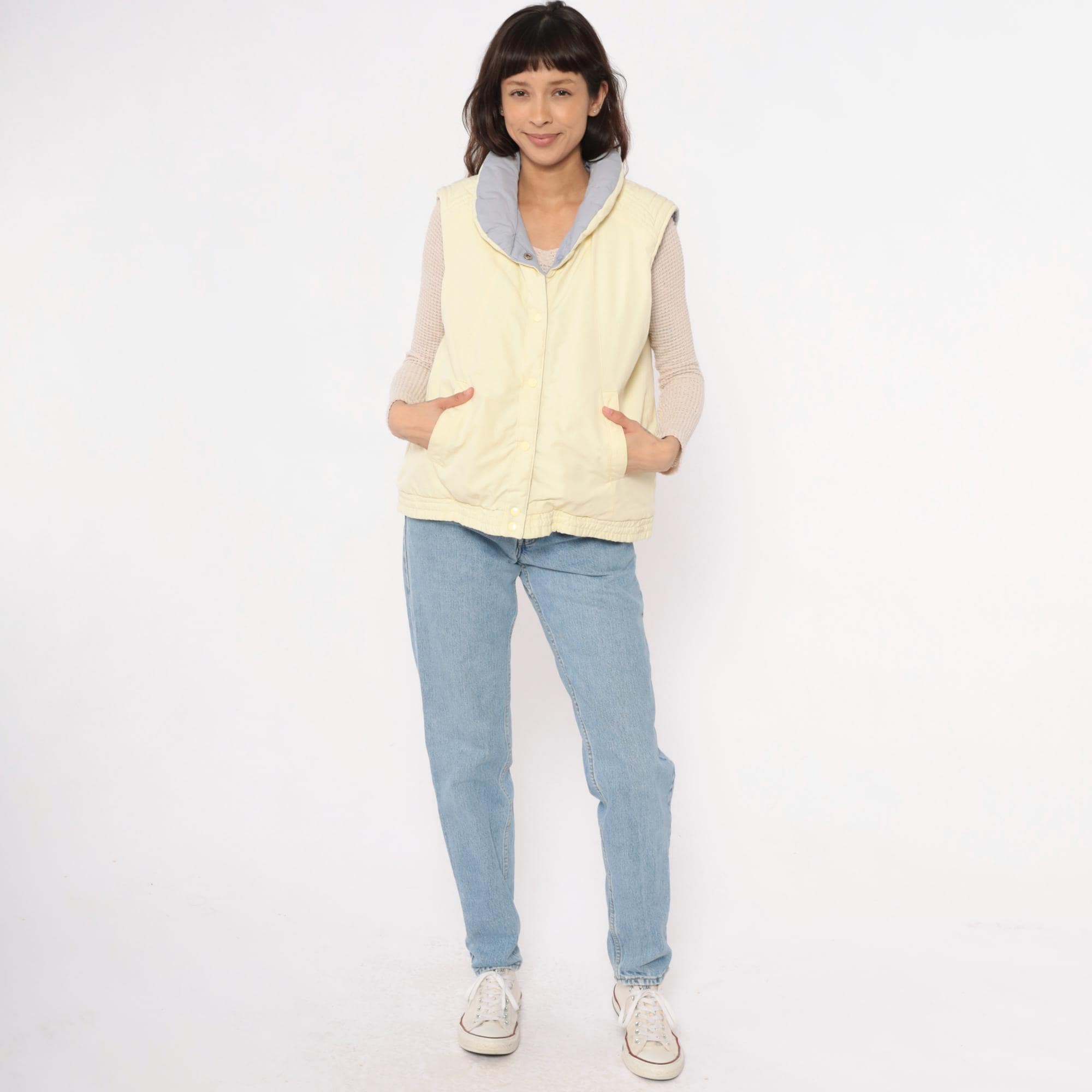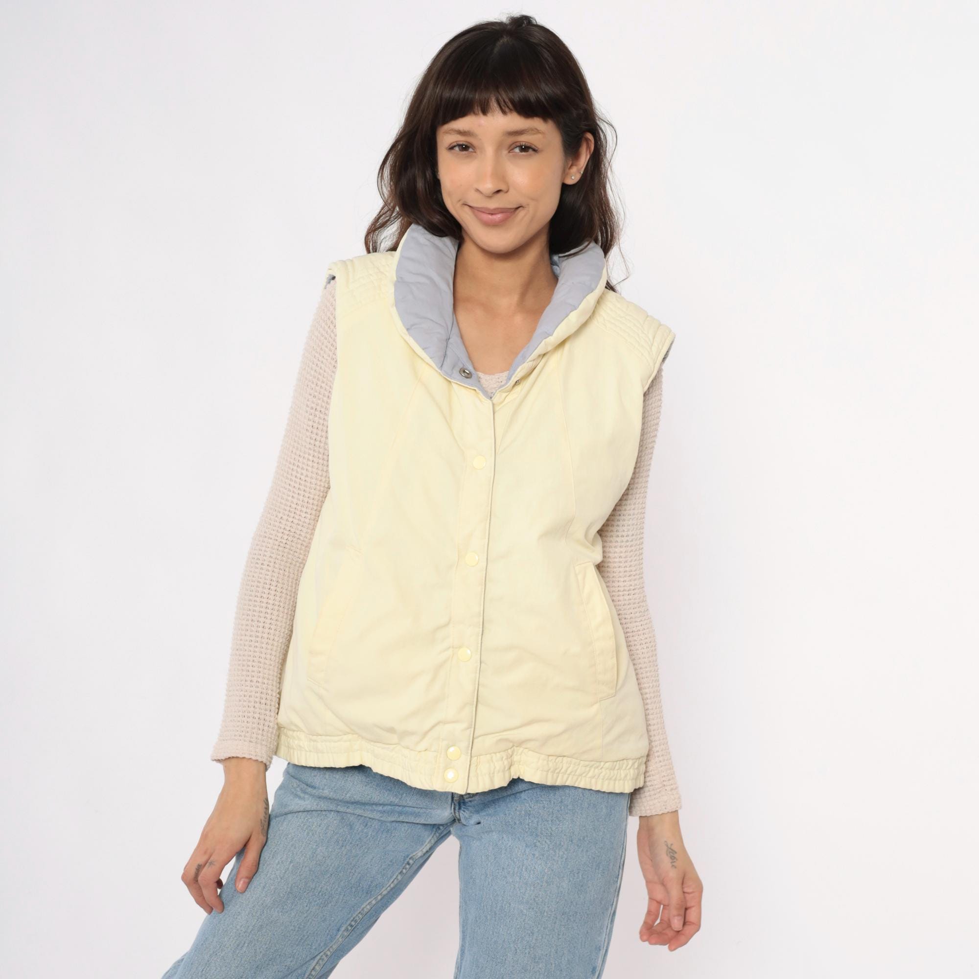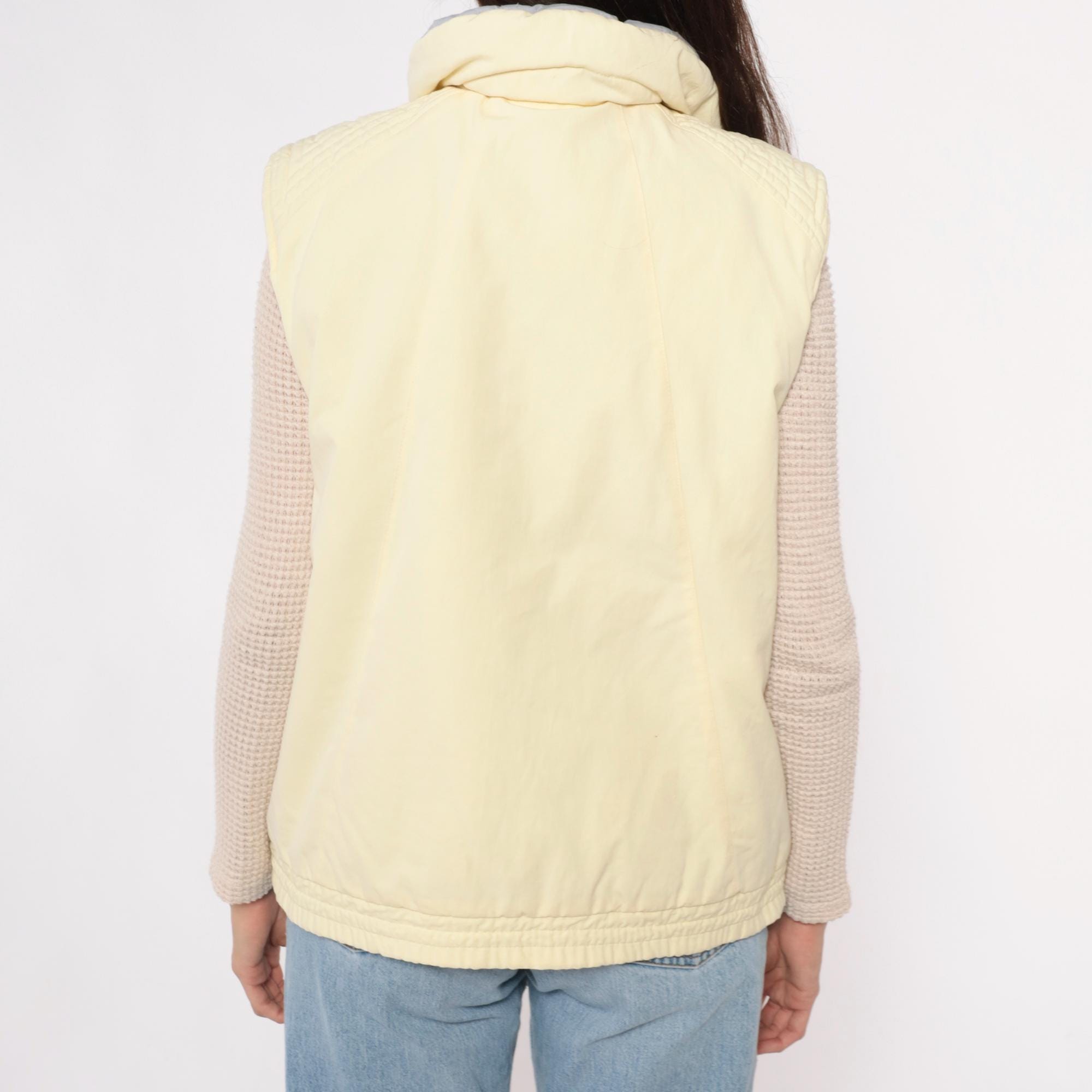 80s reversible quilted vest with pale yellow on one side and light gray on the reverse. Snap front closure, standing collar, and front pockets on both sides. Quilted diamond pattern throughout.