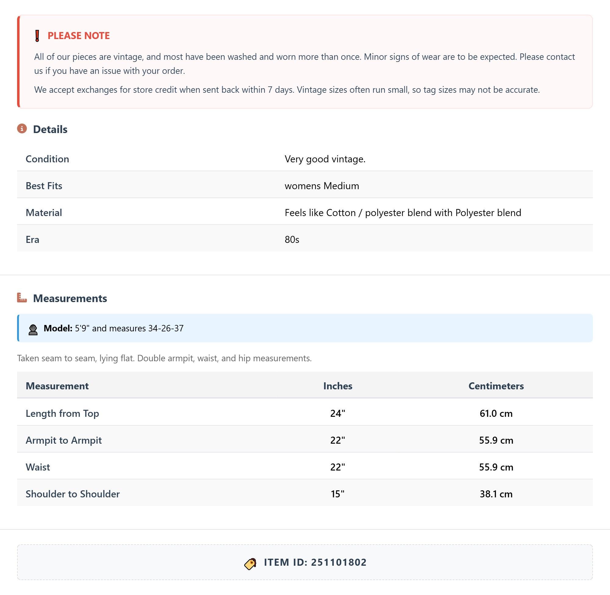 Suggested sizes are estimates only; see measurements for exact sizing. Vintage sizes often run small, so tag sizes may not be accurate.