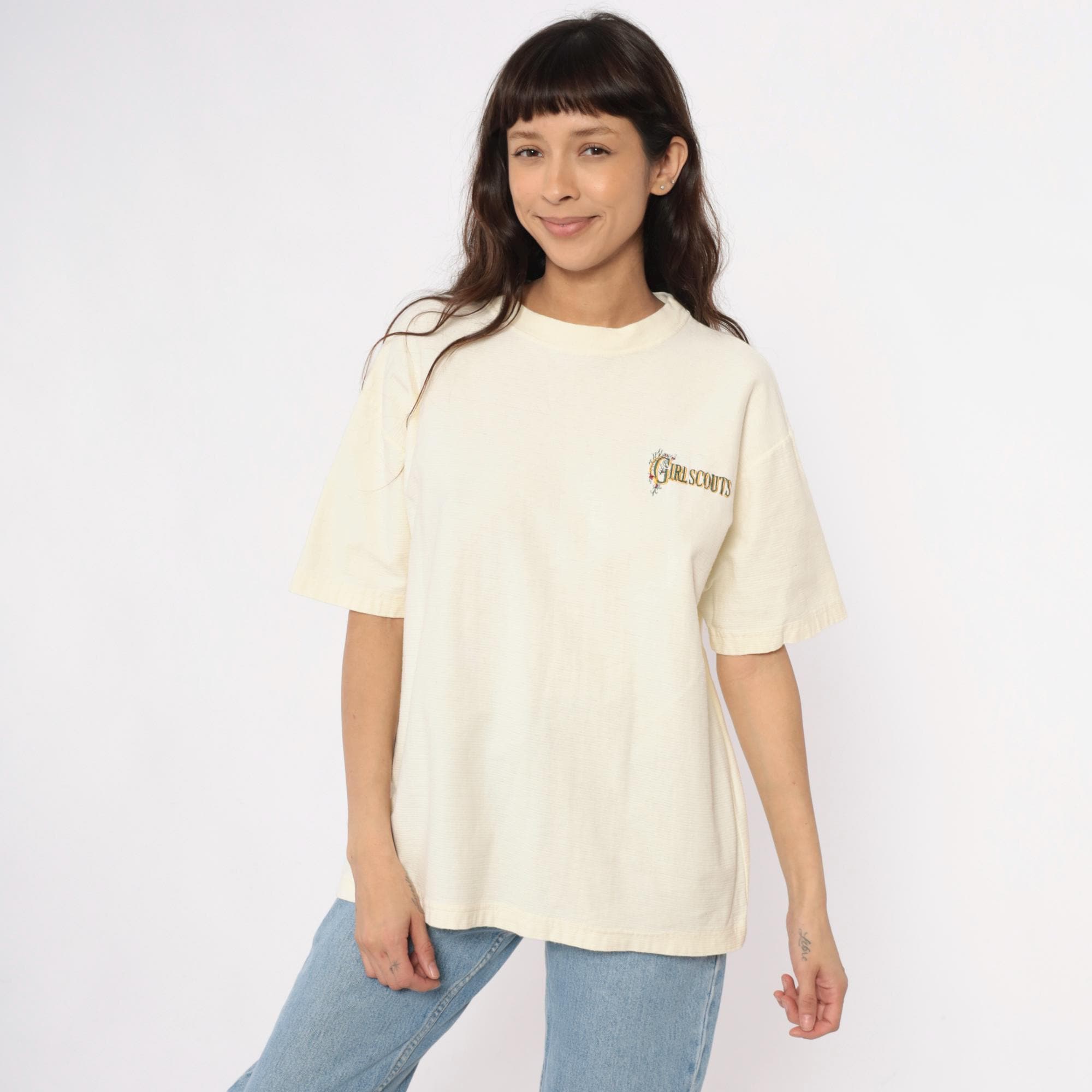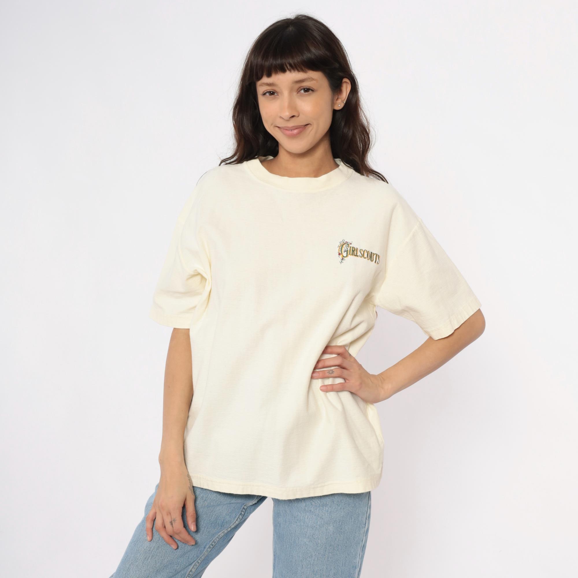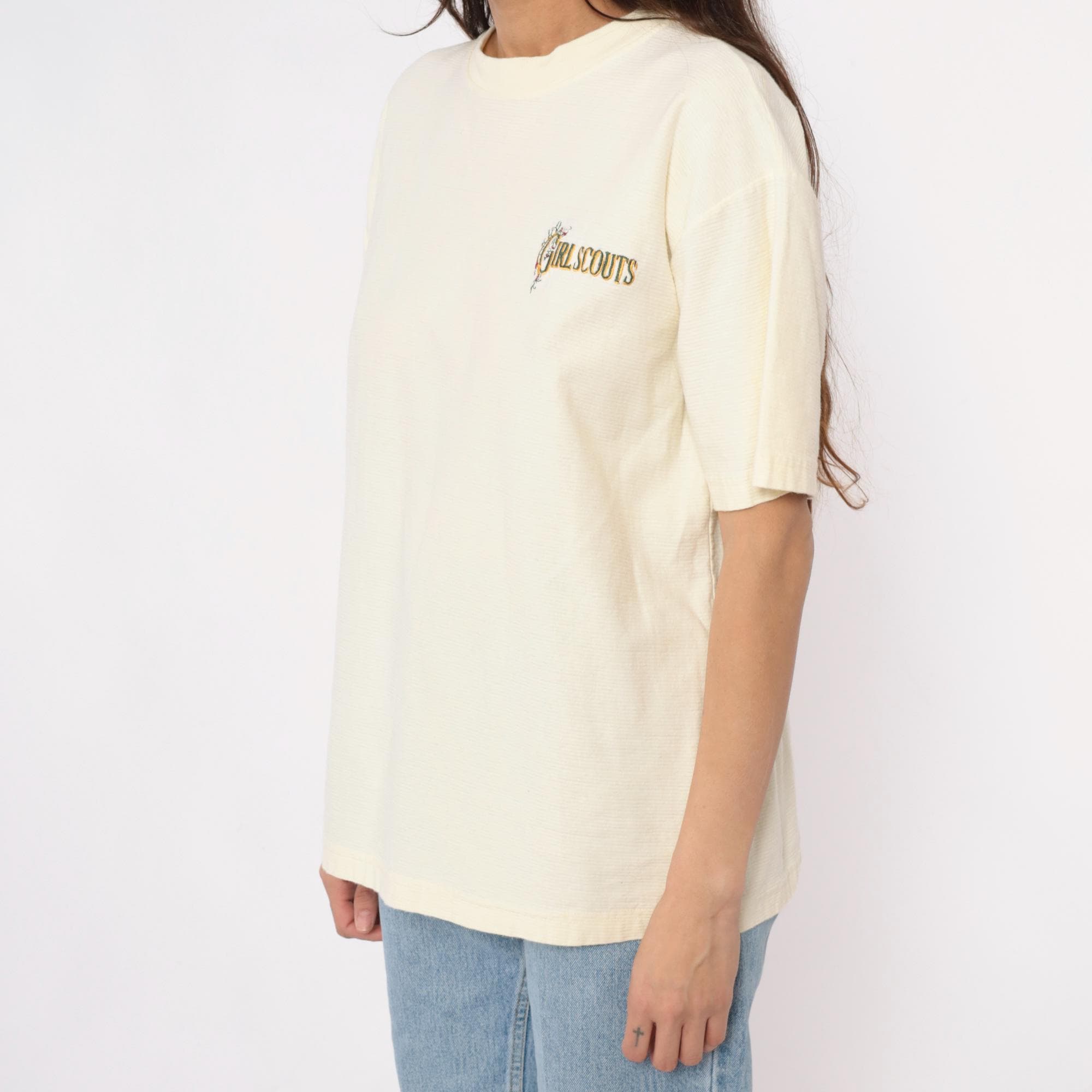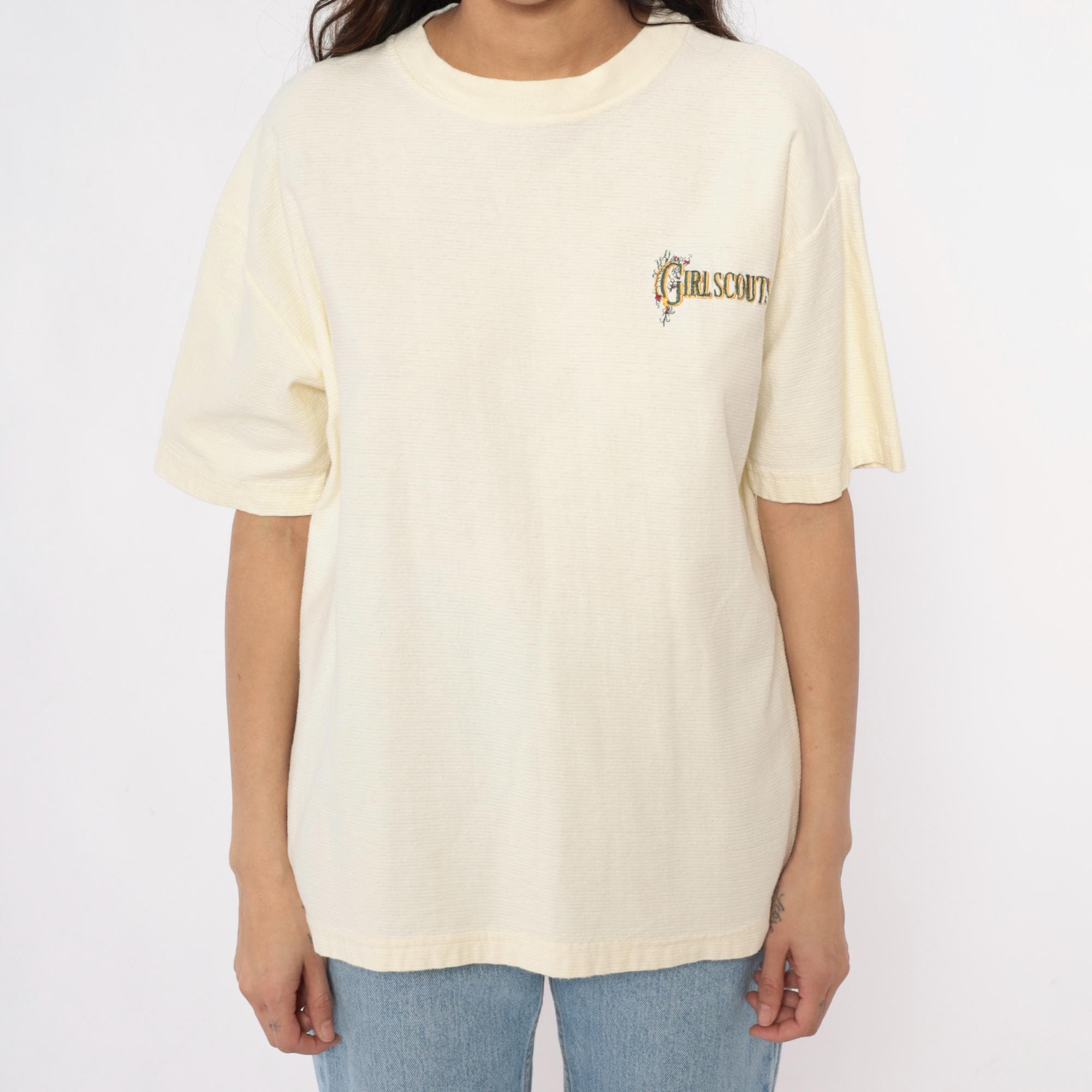 90s cream cotton tee with embroidered Girl Scouts logo on left chest, decorative floral elements in yellow, green, and pink surrounding the lettering. Crew neckline and short sleeves in solid ivory fabric.