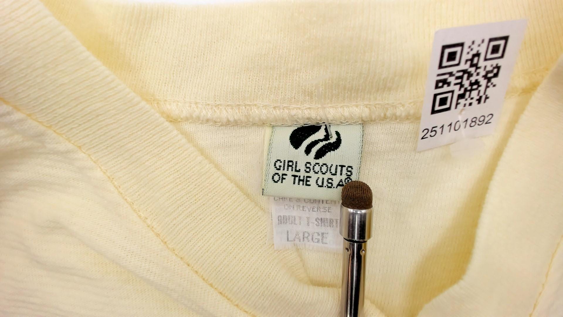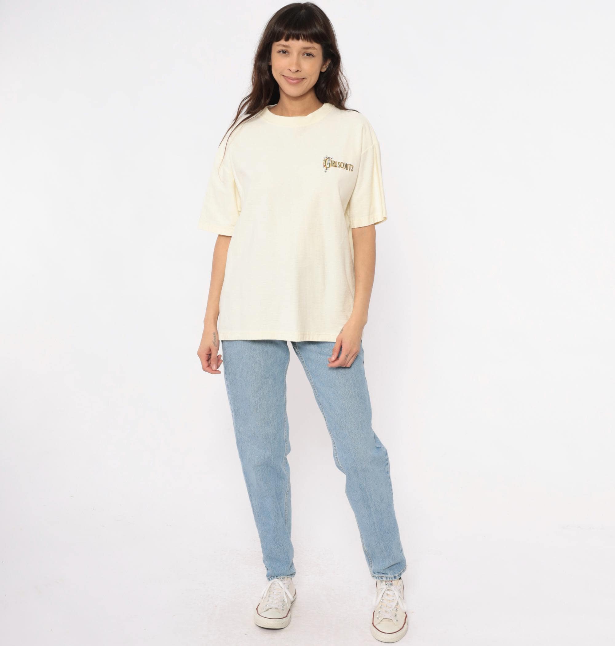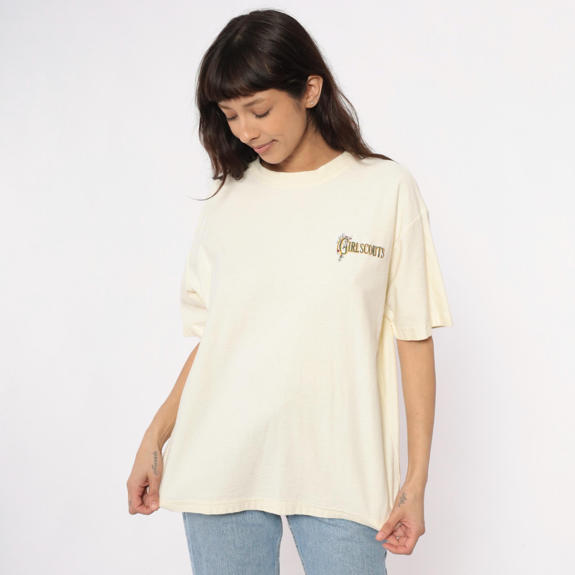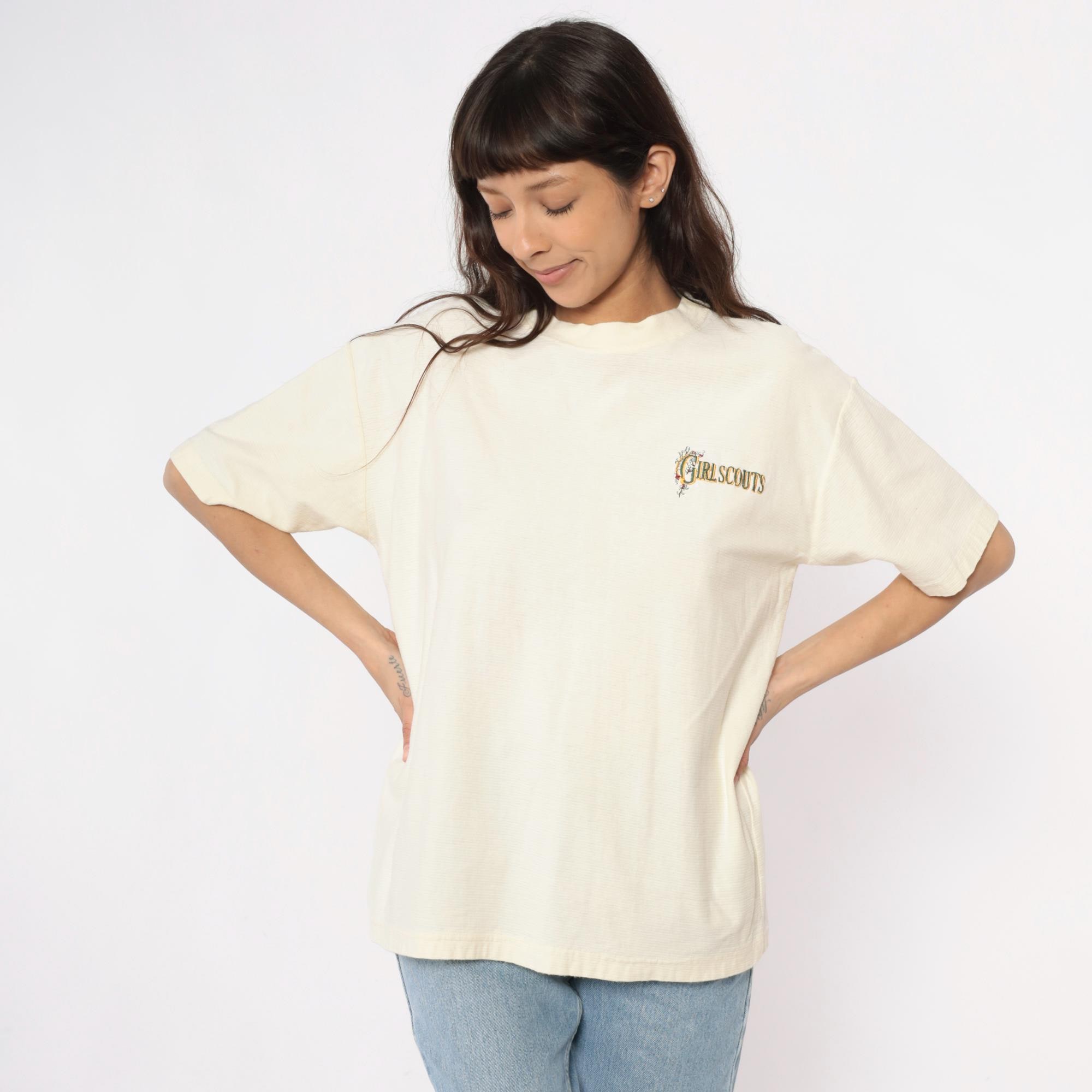 90s cream cotton tee with embroidered Girl Scouts logo on left chest, decorative floral elements in yellow, green, and pink surrounding the lettering. Crew neckline and short sleeves in solid ivory fabric.