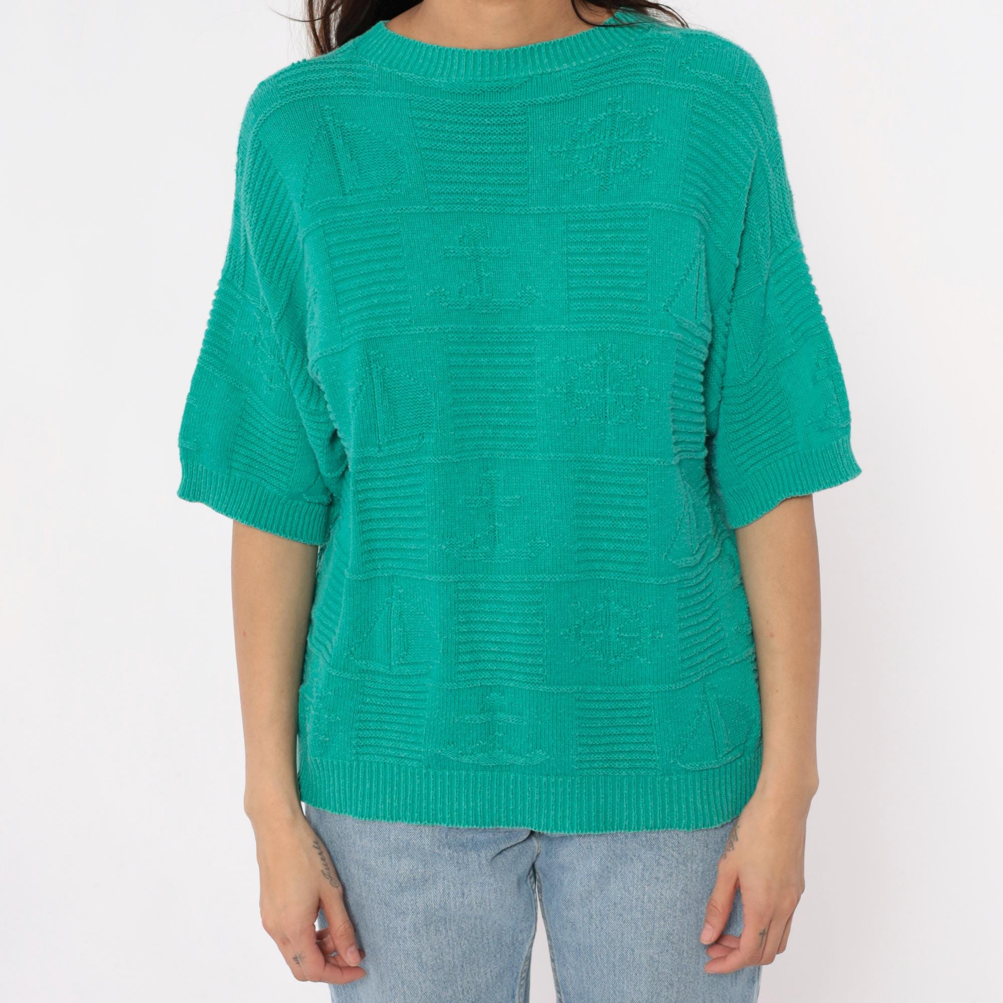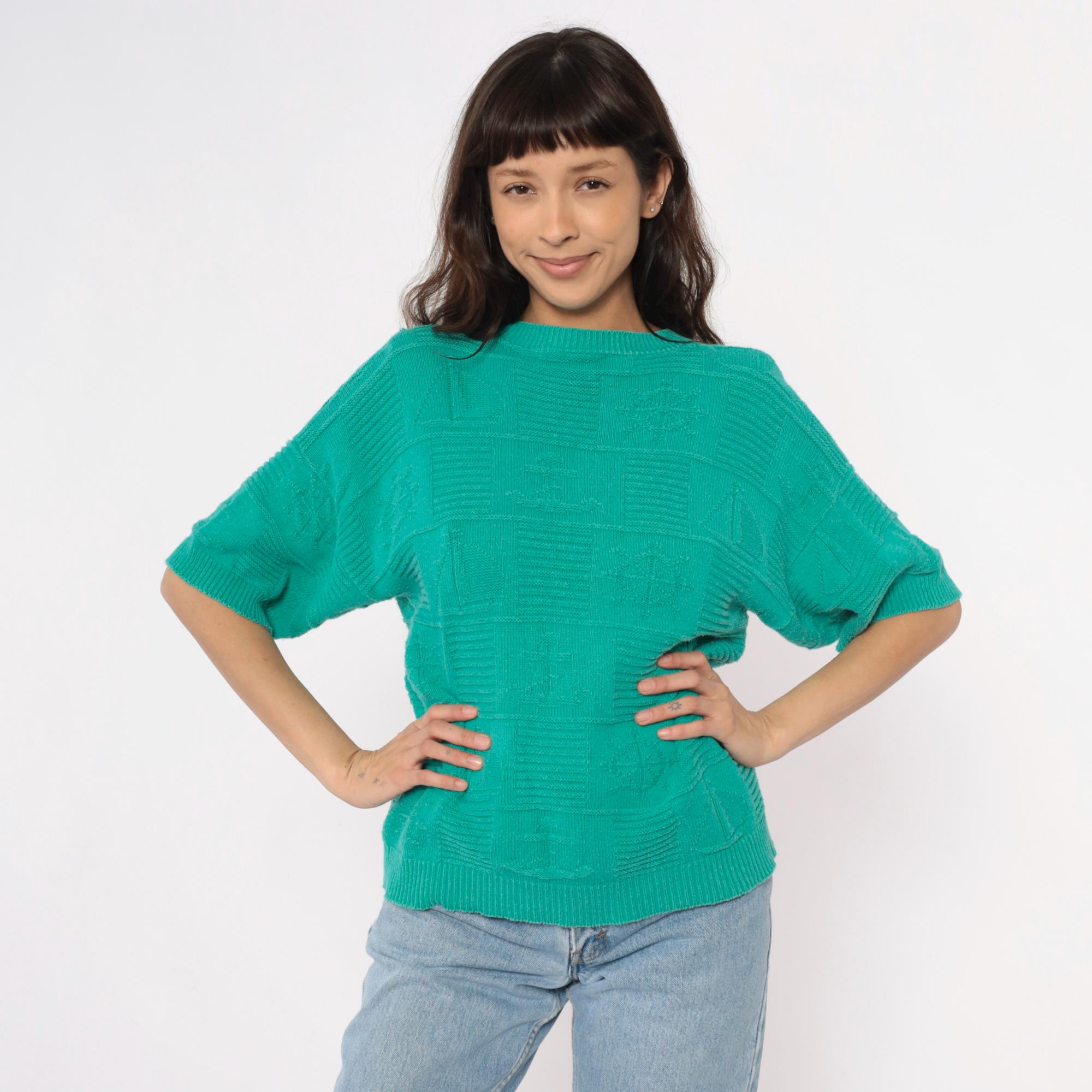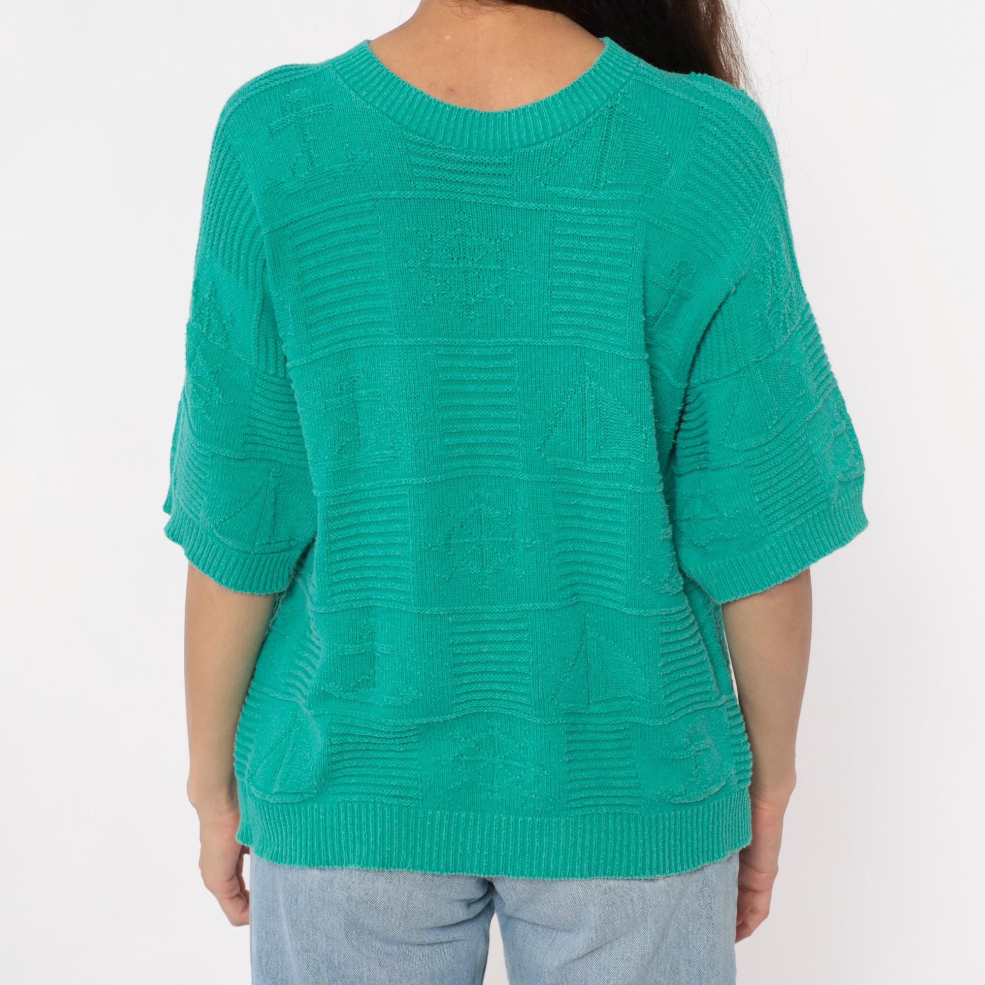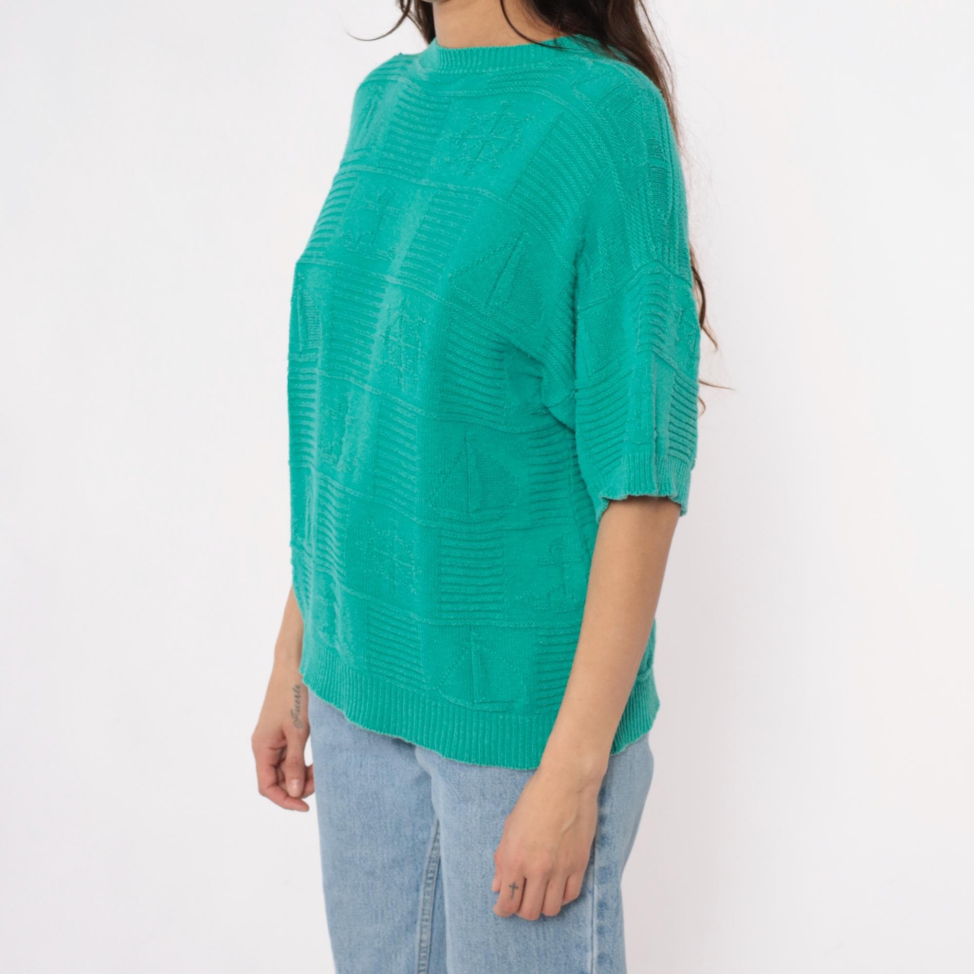 80s turquoise short sleeve sweater with textured geometric checkerboard knit pattern across the entire fabric. Crew neckline with ribbed trim, ribbed cuffs, and ribbed hem in a relaxed boxy silhouette.