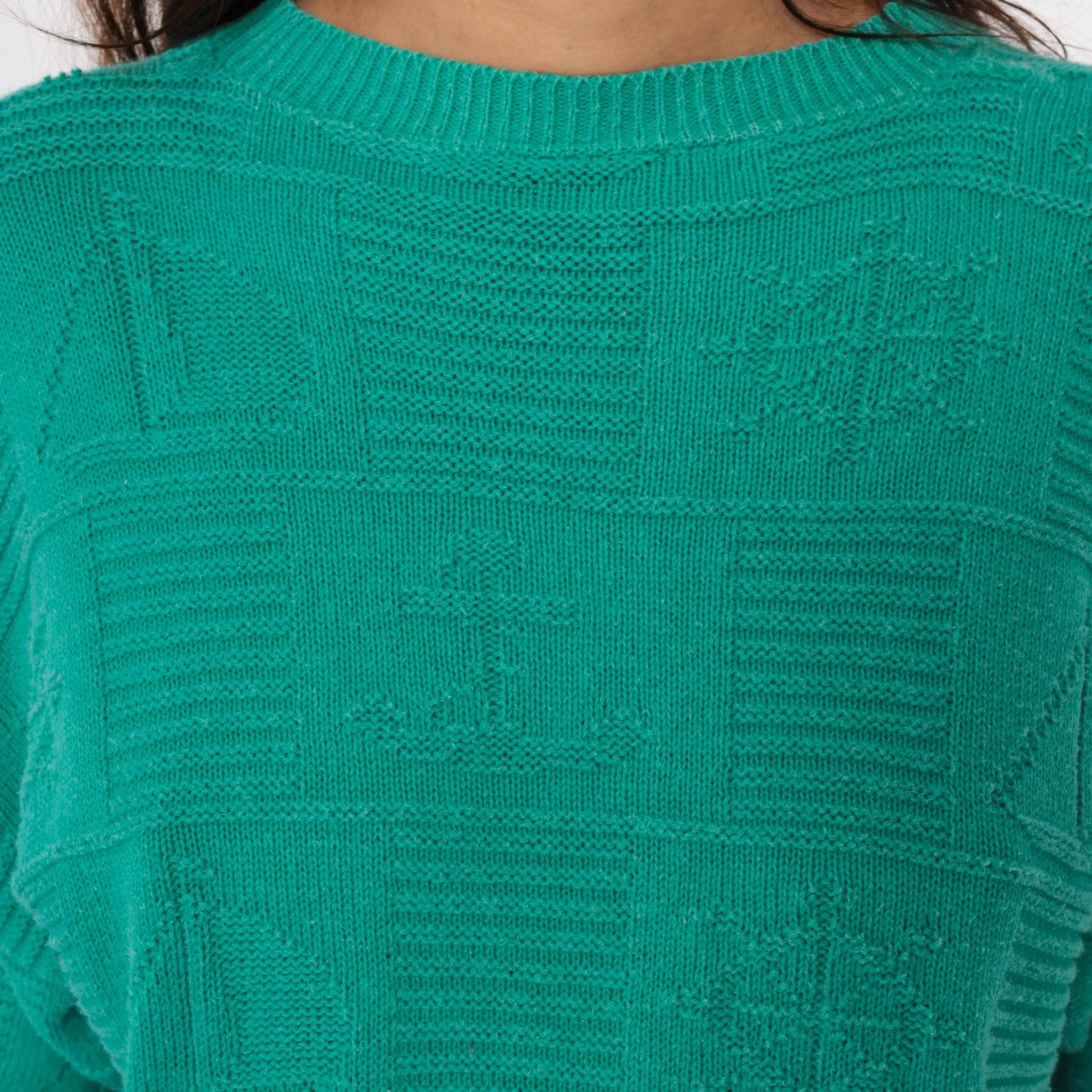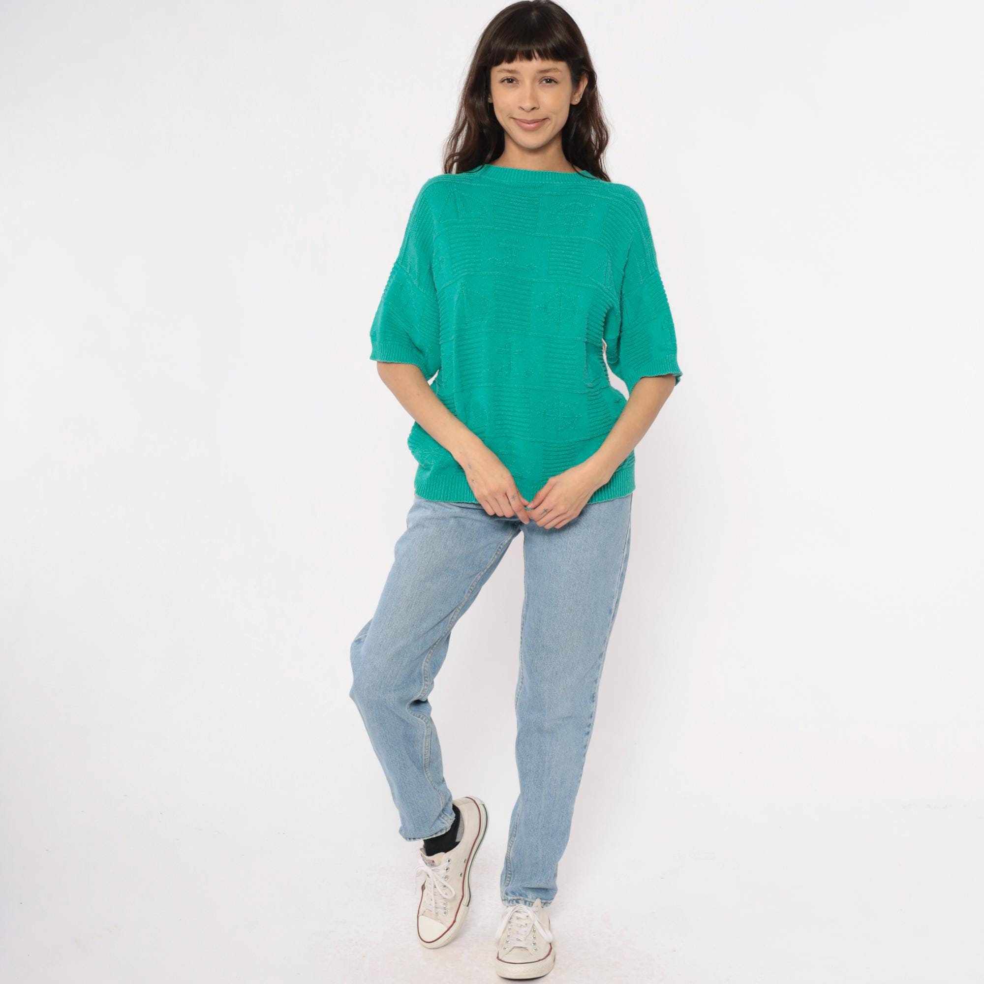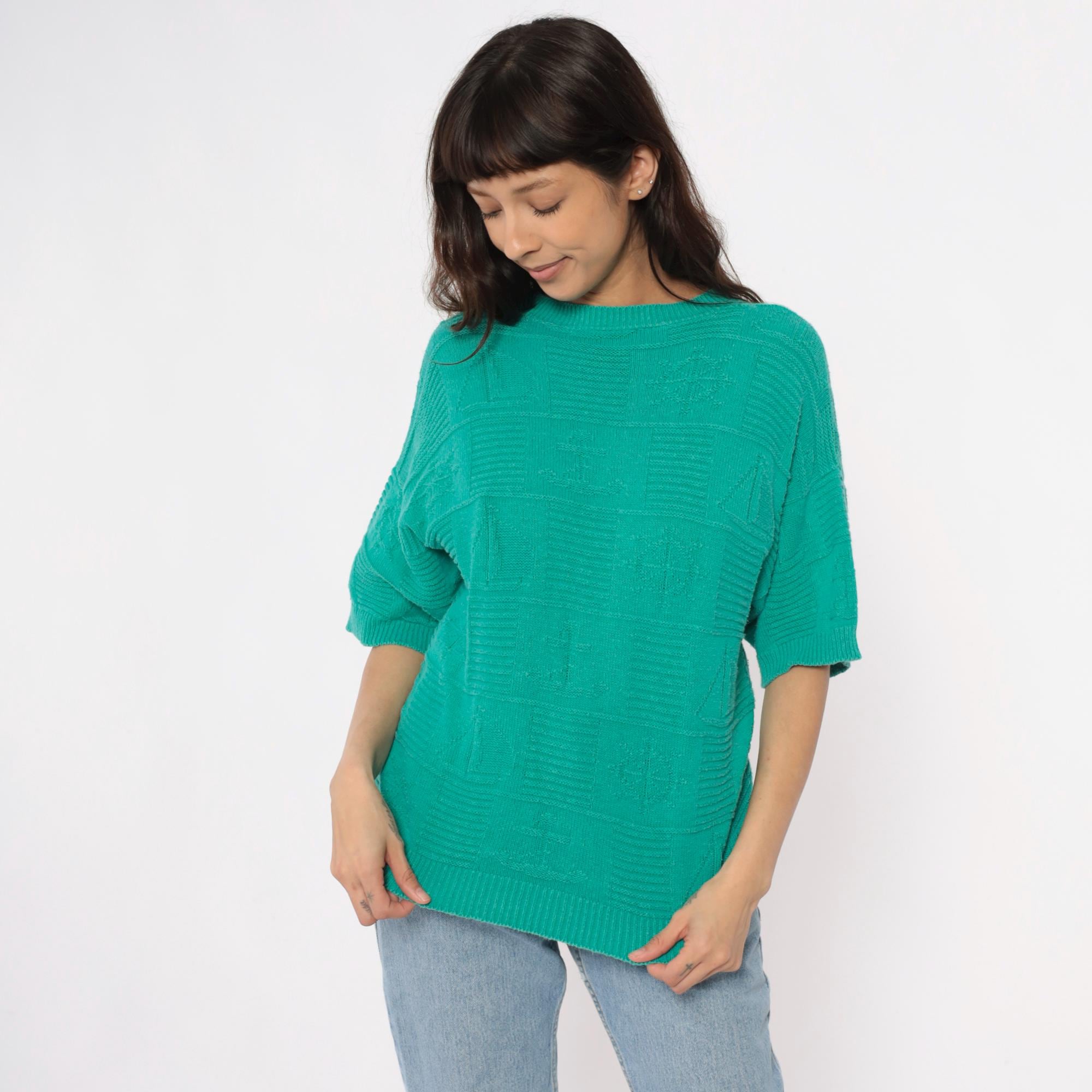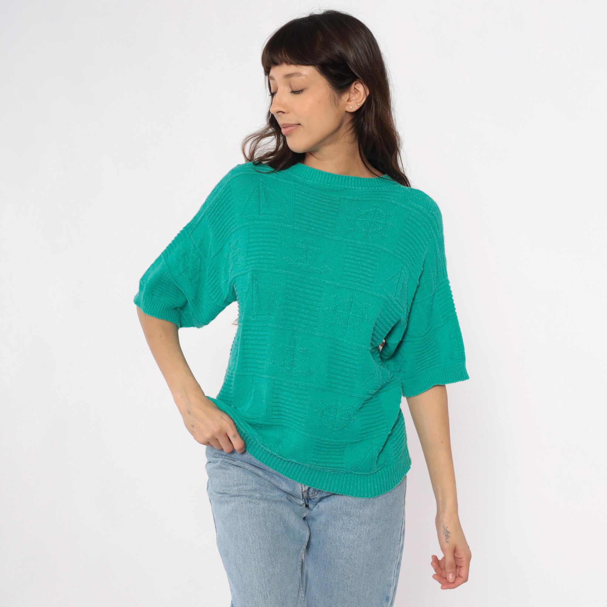 80s turquoise short sleeve sweater with textured geometric checkerboard knit pattern across the entire fabric. Crew neckline with ribbed trim, ribbed cuffs, and ribbed hem in a relaxed boxy silhouette.