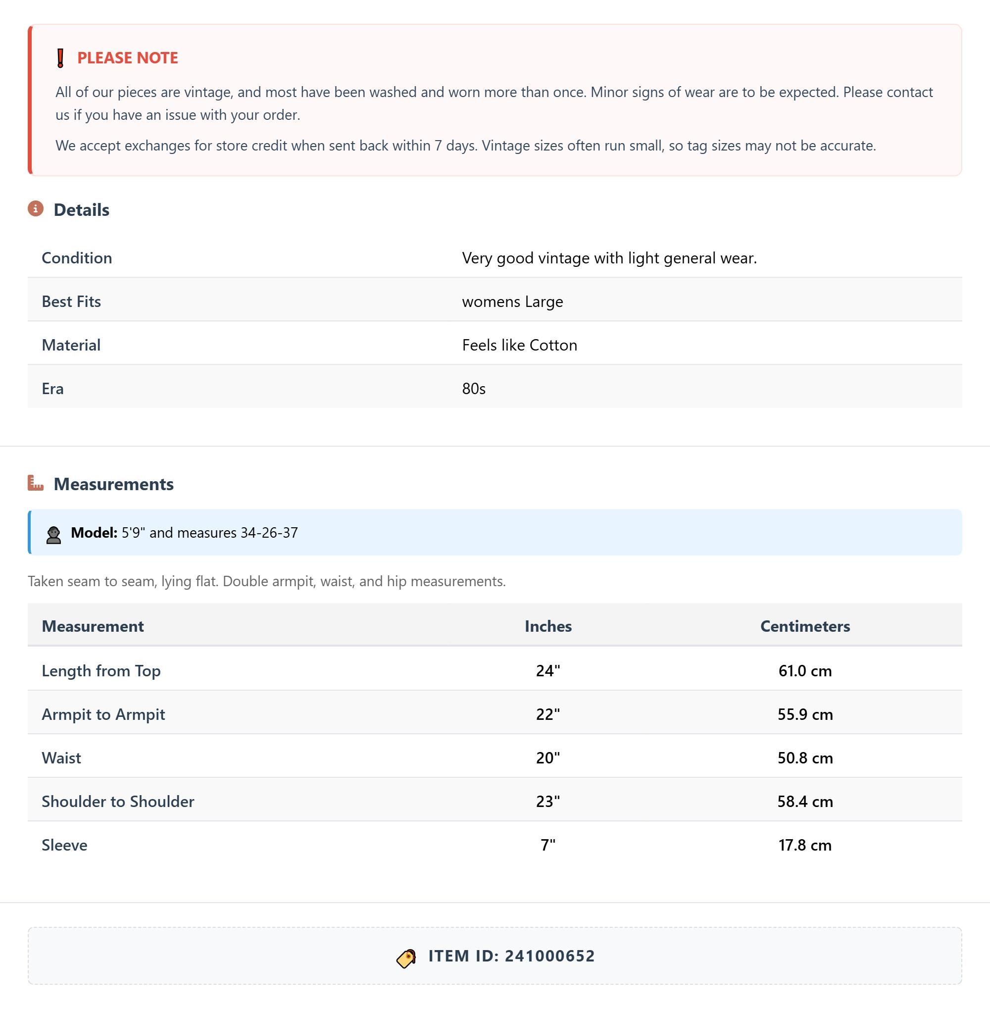 All of our pieces are vintage, and most have been washed and worn more than once. Minor signs of wear are to be expected. Please contact us if you have an issue with your order. We accept exchanges for store credit when sent back within 7 days.