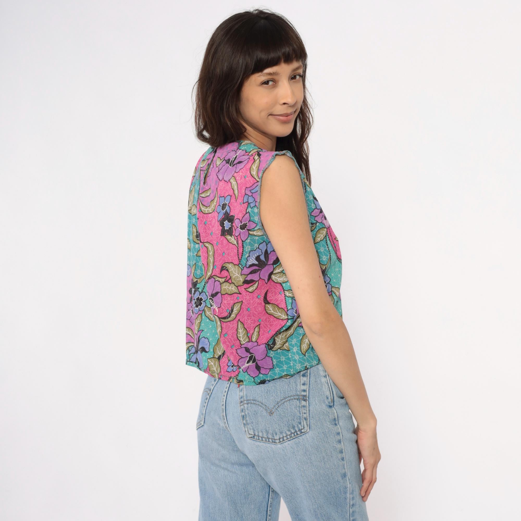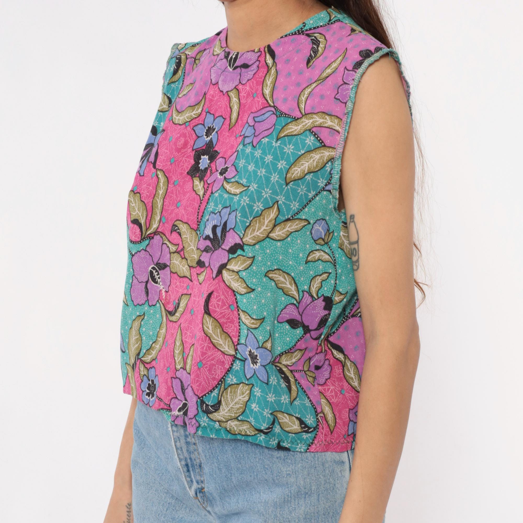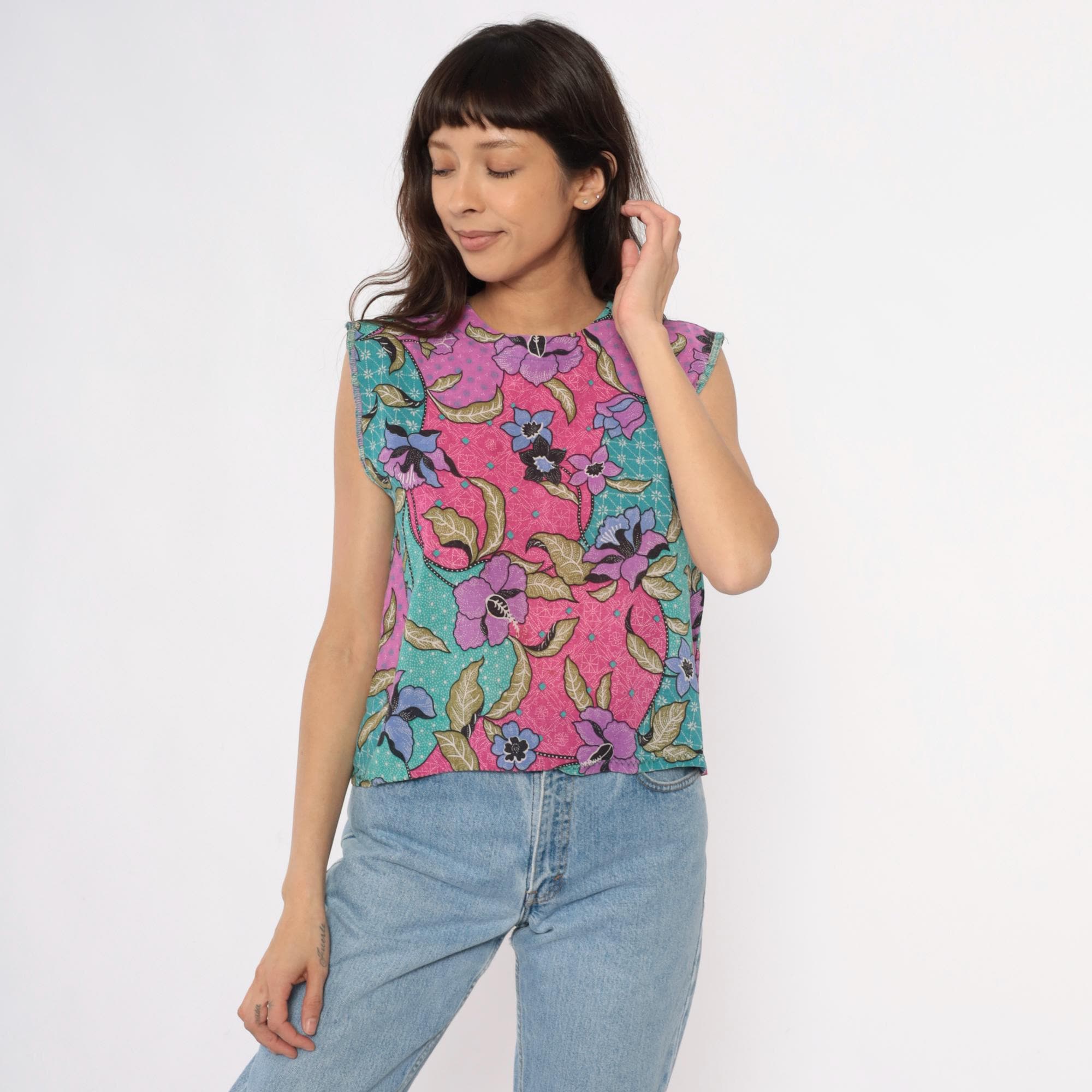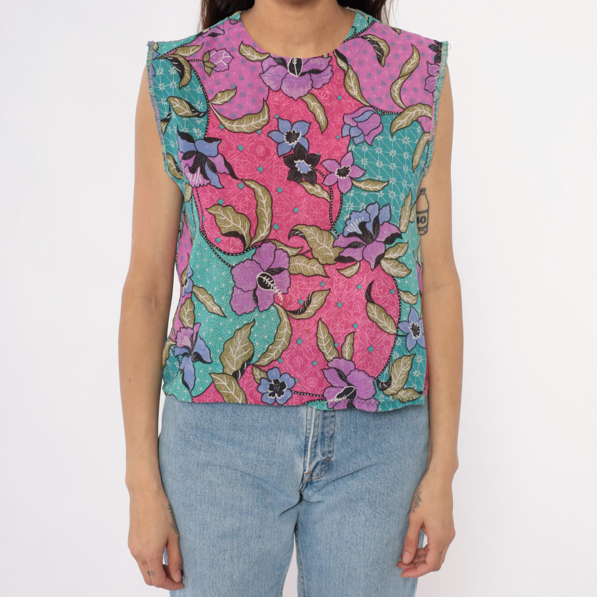90s psychedelic floral print sleeveless shell in pink, purple, and turquoise color blocks with large outlined flowers and gold leaves. Raw serged edges at armholes and hem, jewel neckline.