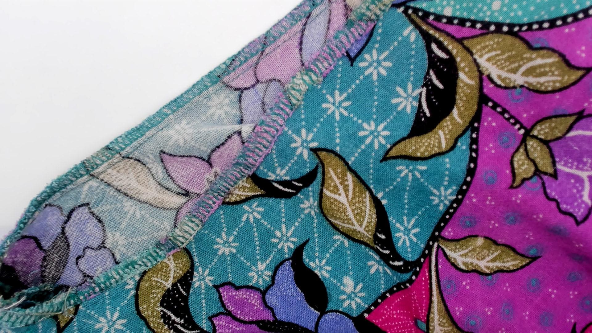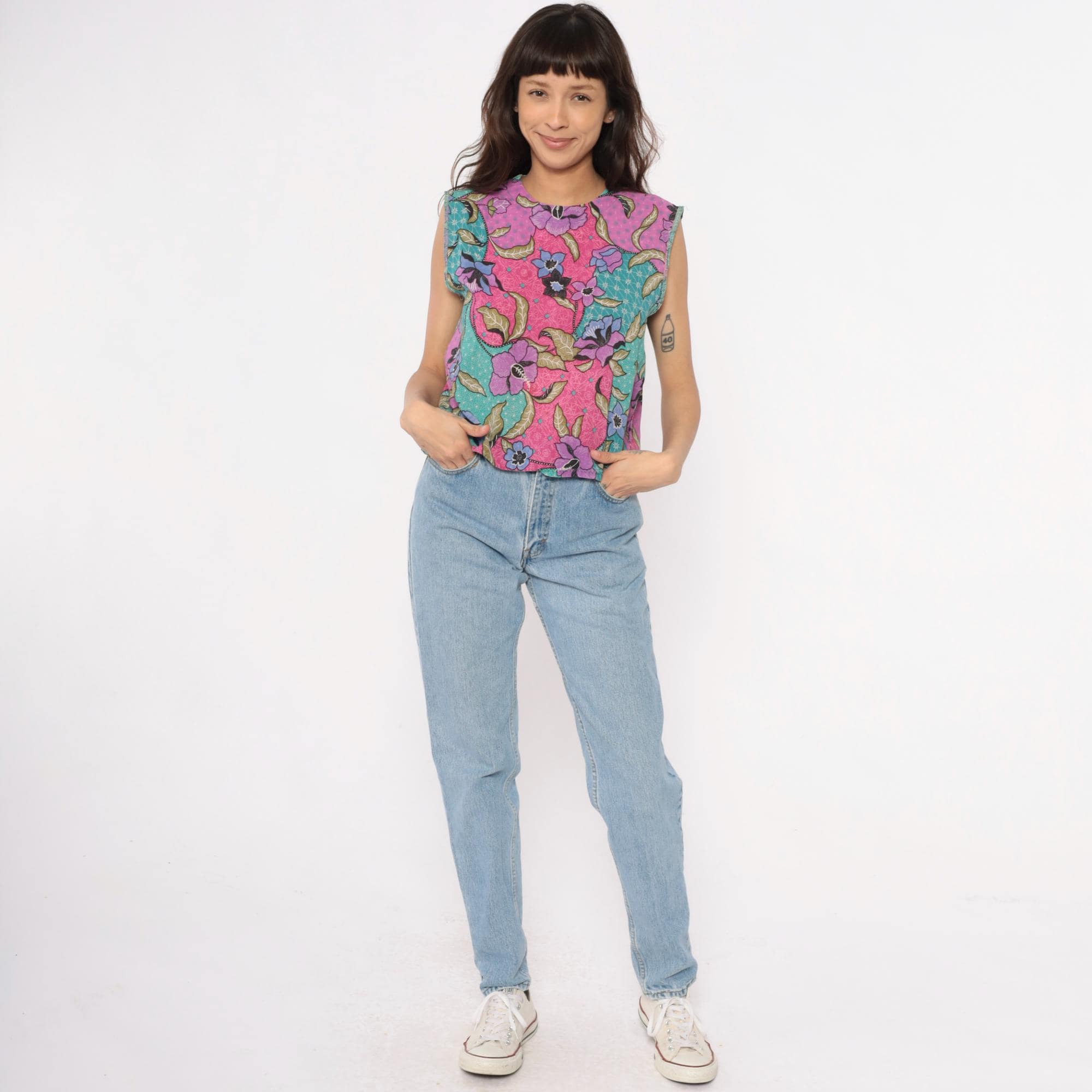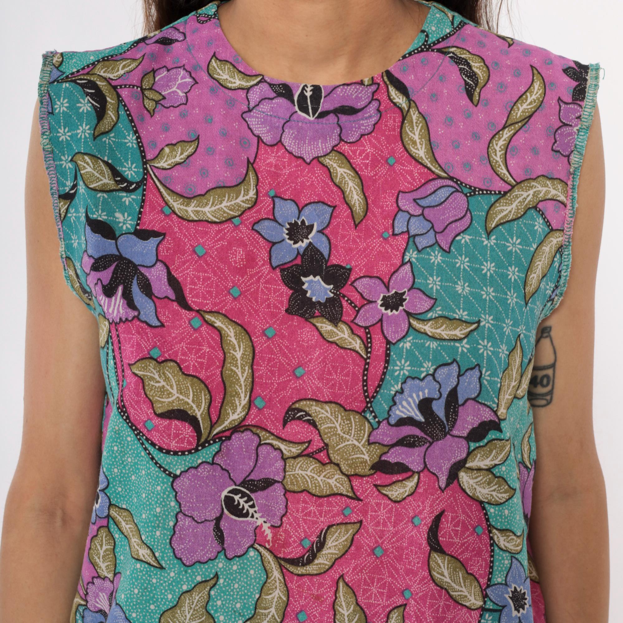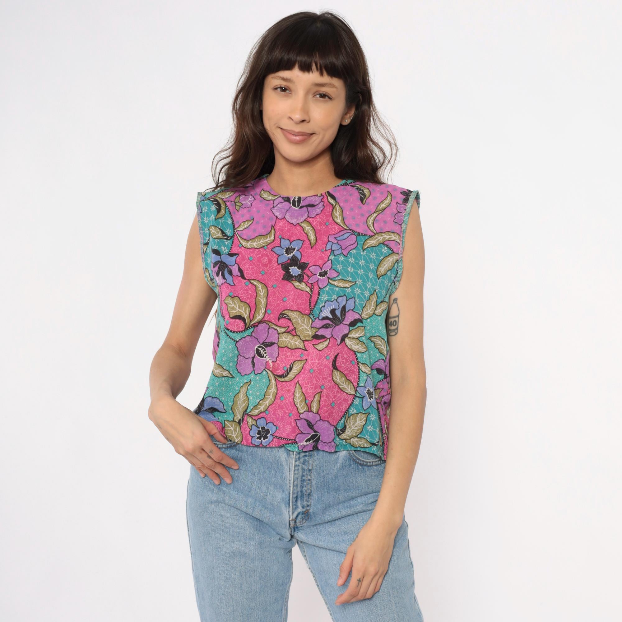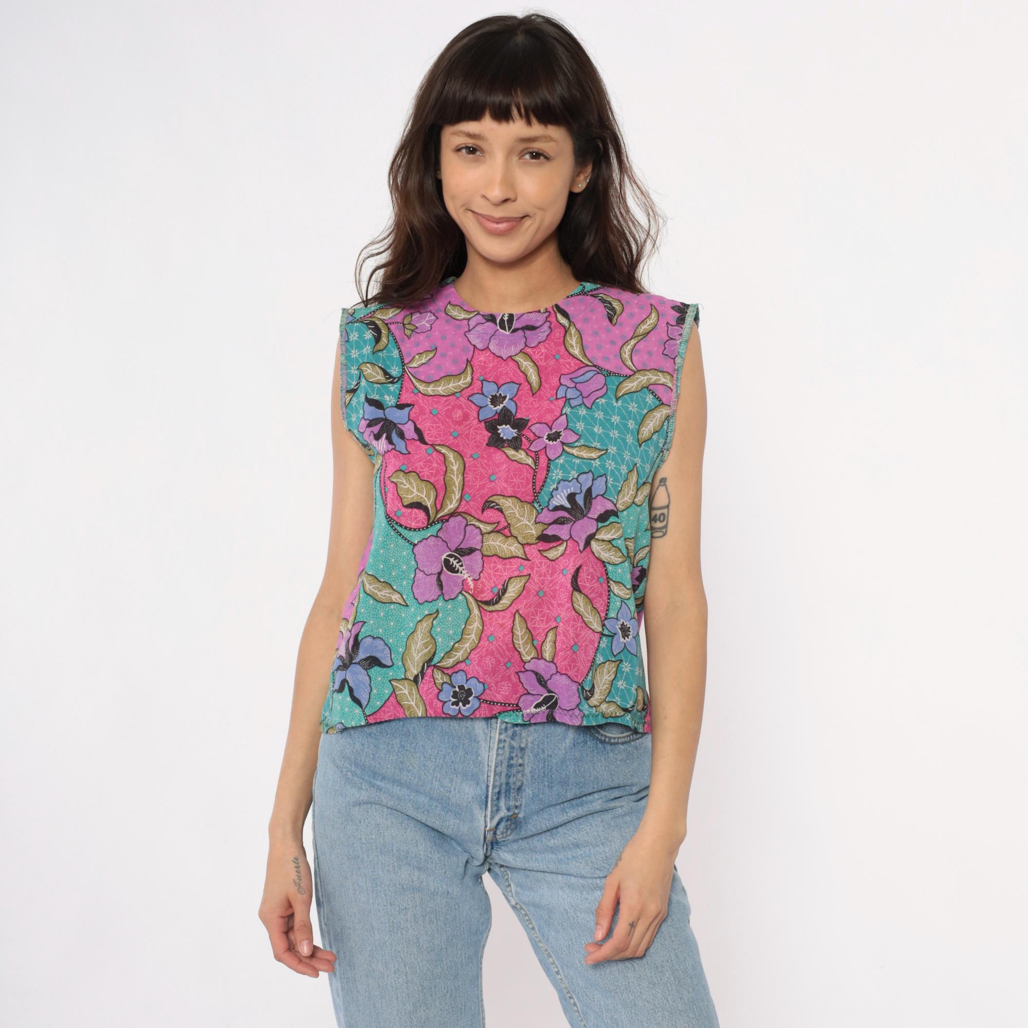 90s psychedelic floral print sleeveless shell in pink, purple, and turquoise color blocks with large outlined flowers and gold leaves. Raw serged edges at armholes and hem, jewel neckline.