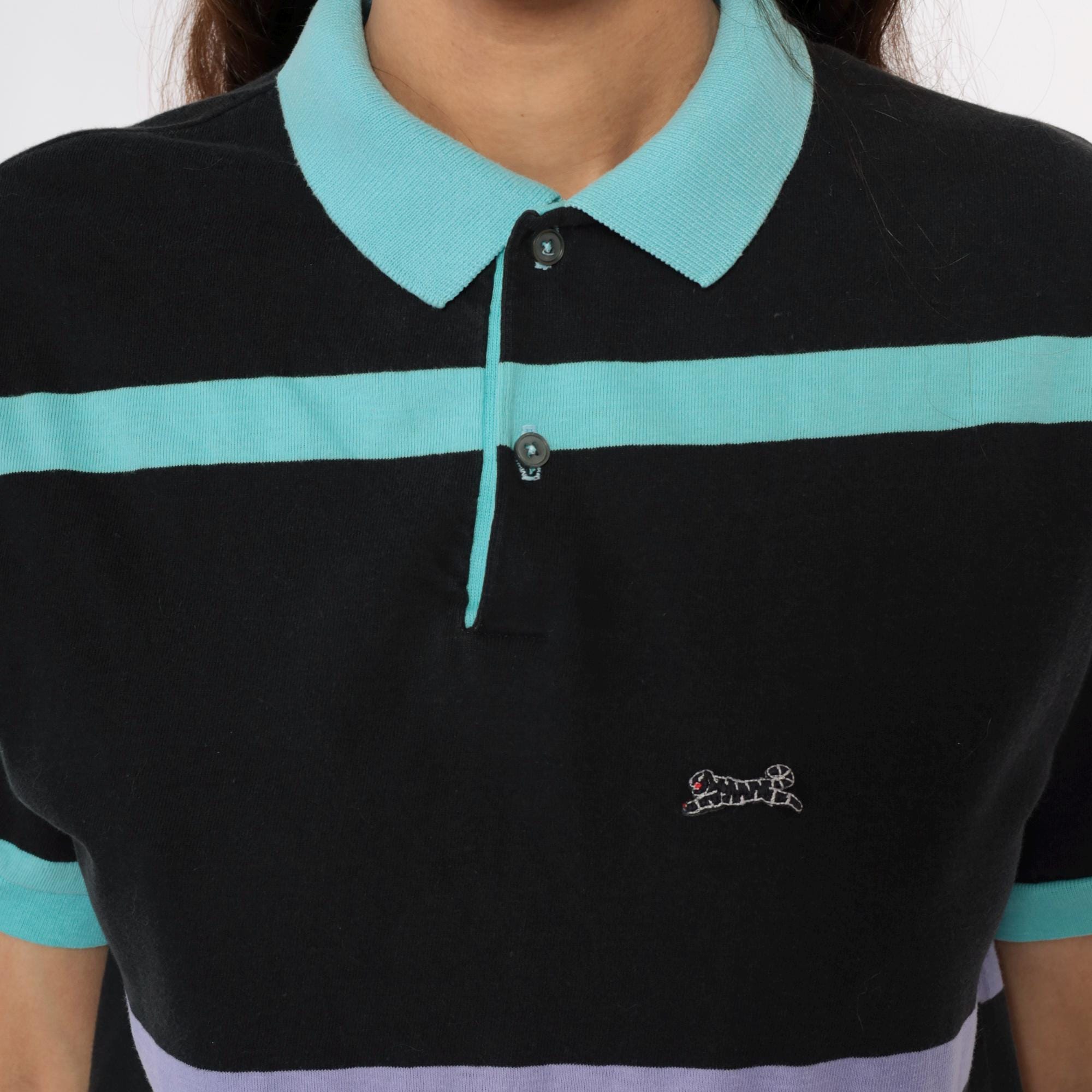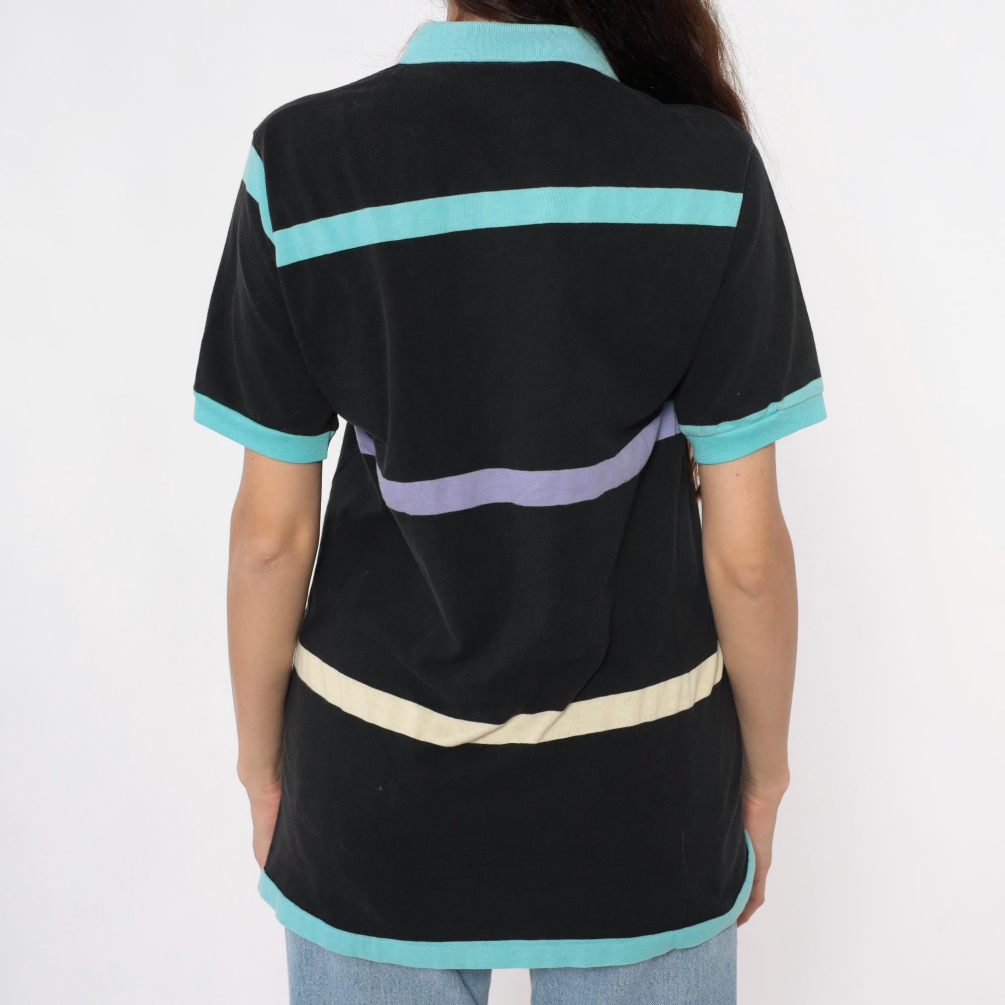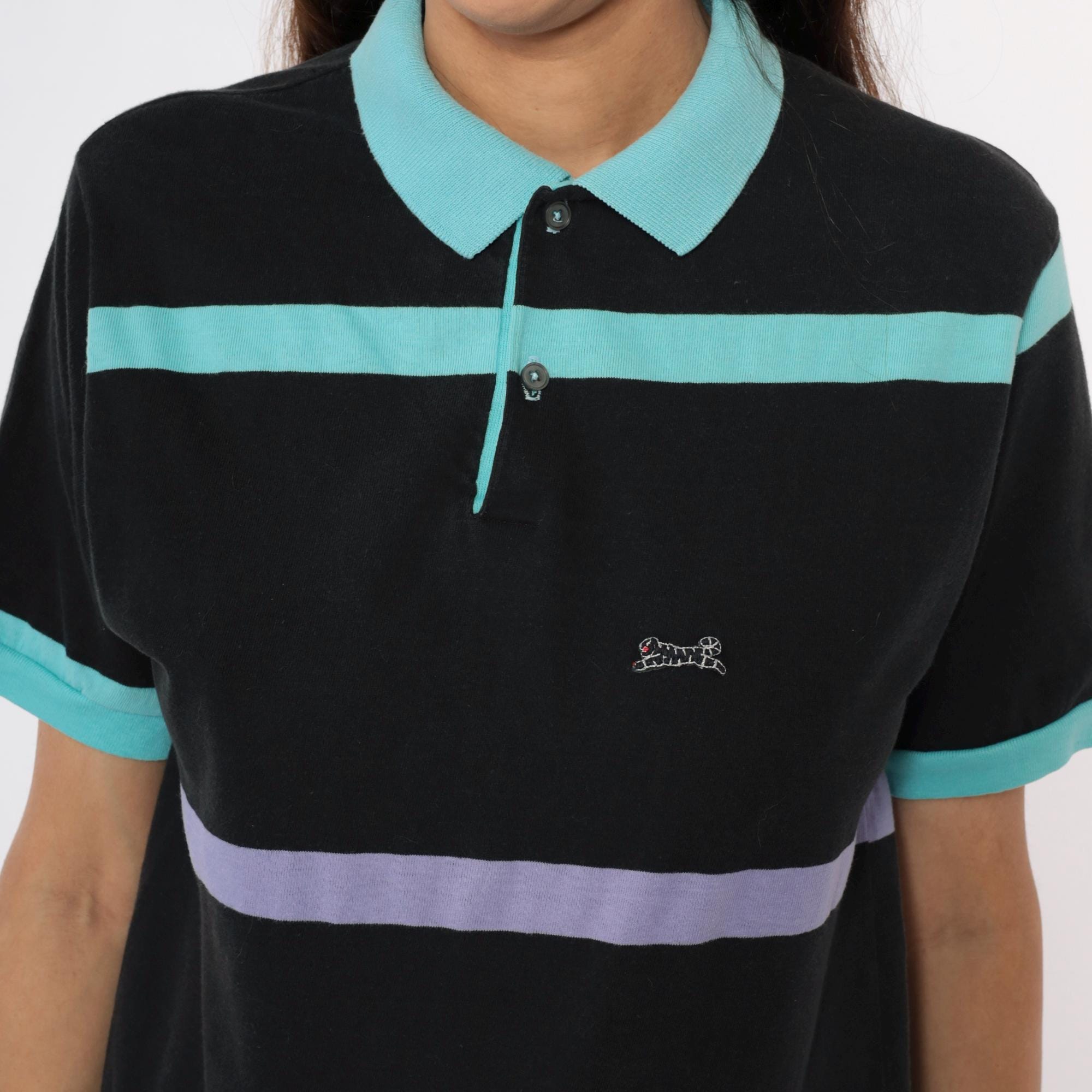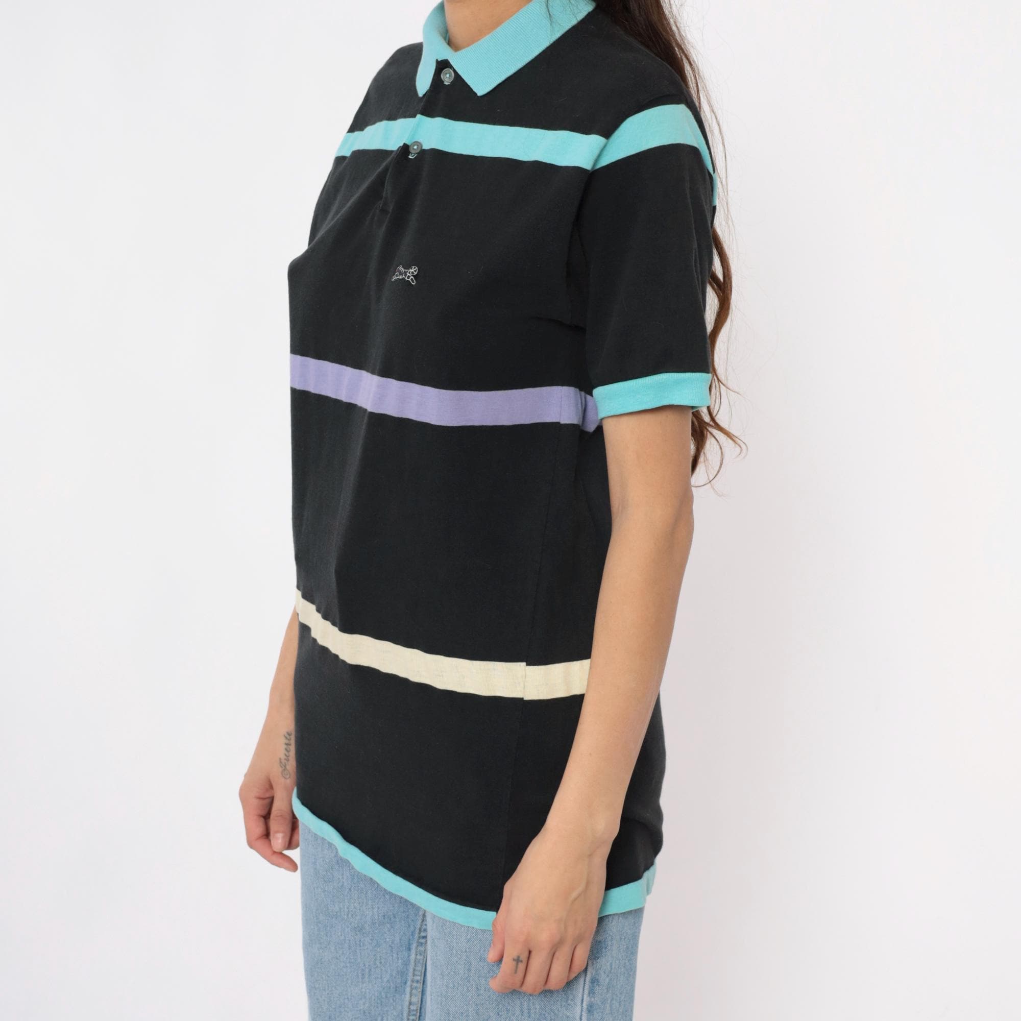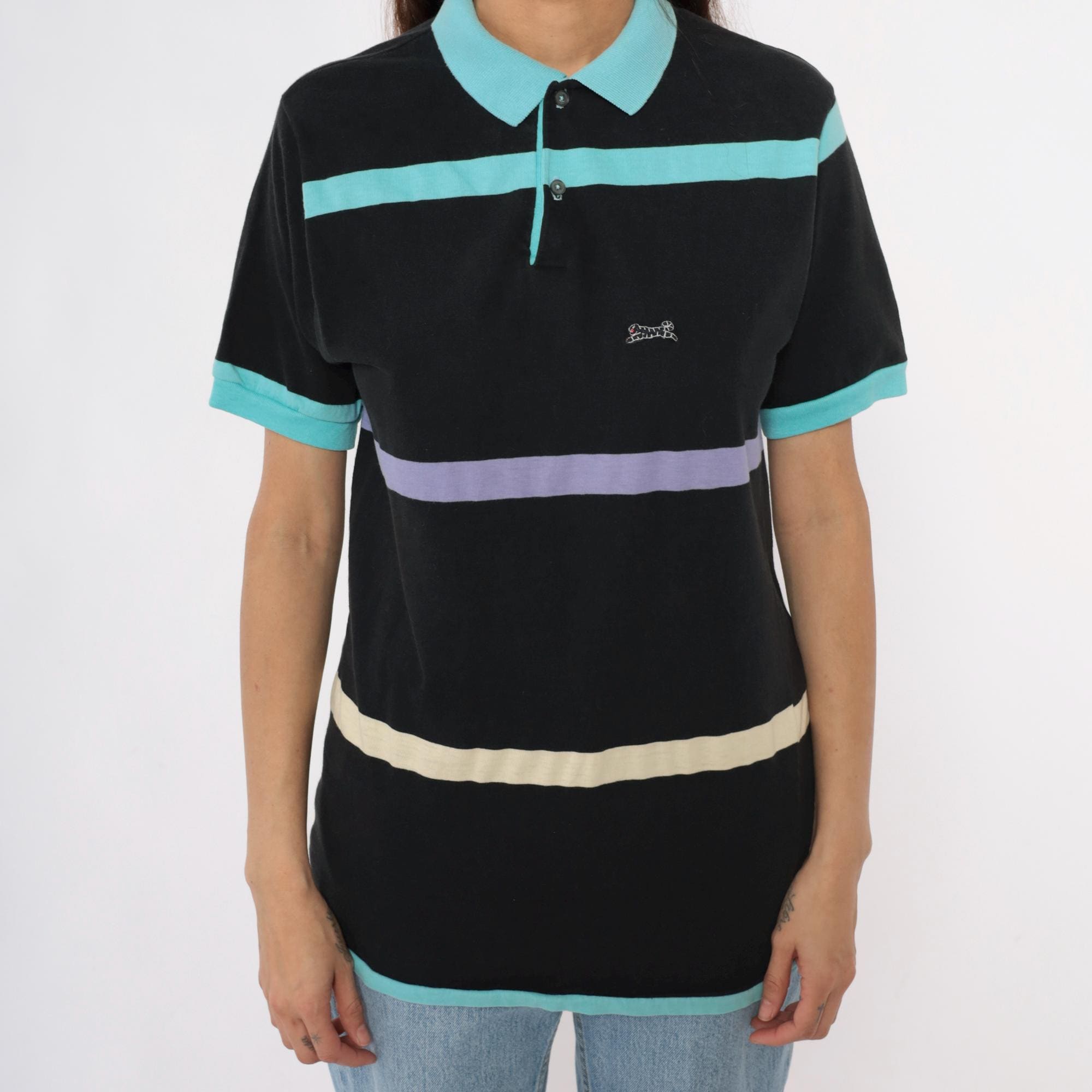 90s black polo shirt from le tigre with bold horizontal stripes in turquoise, purple, and cream. Short sleeves with turquoise ribbed cuffs, turquoise collar, two-button placket, embroidered brand logo on chest.