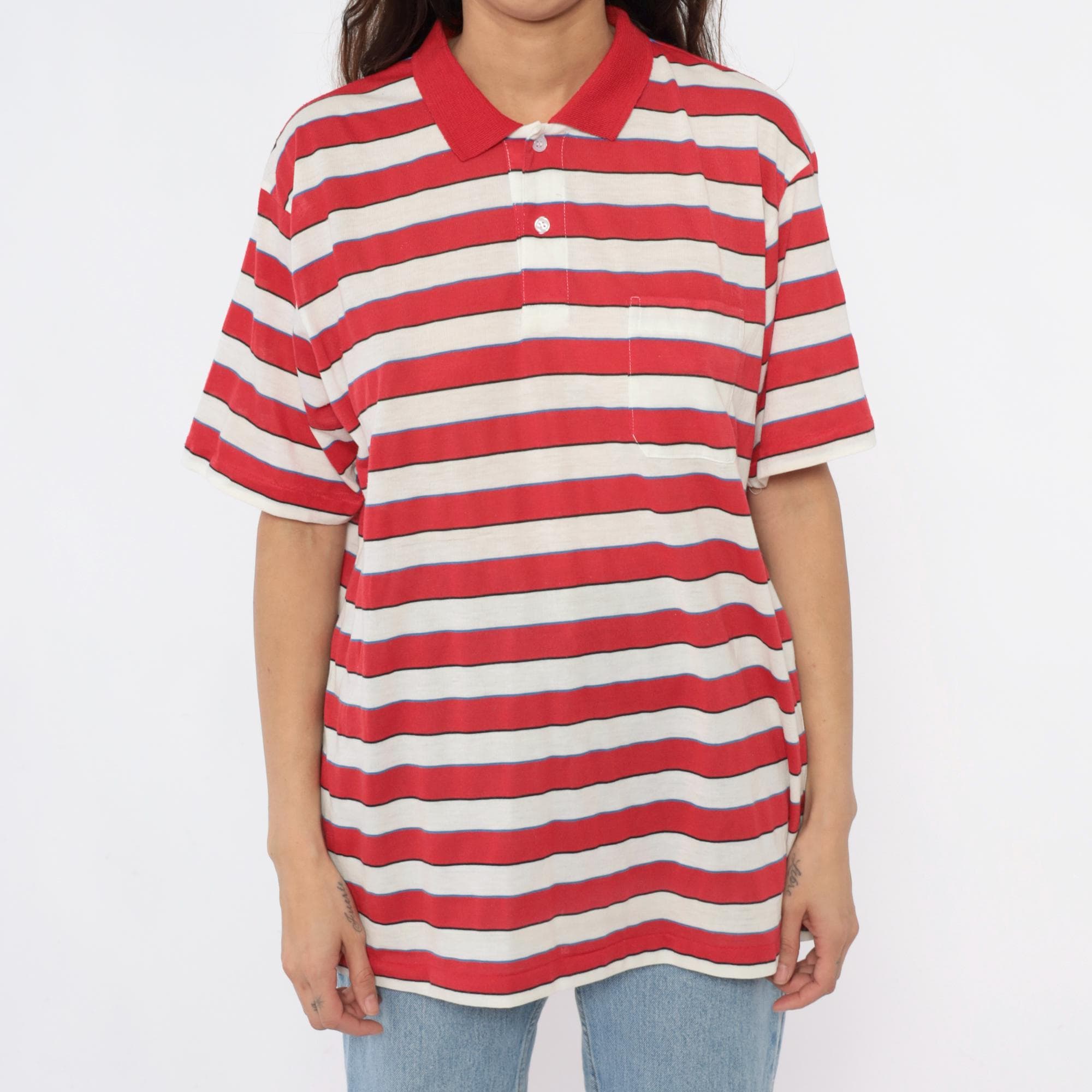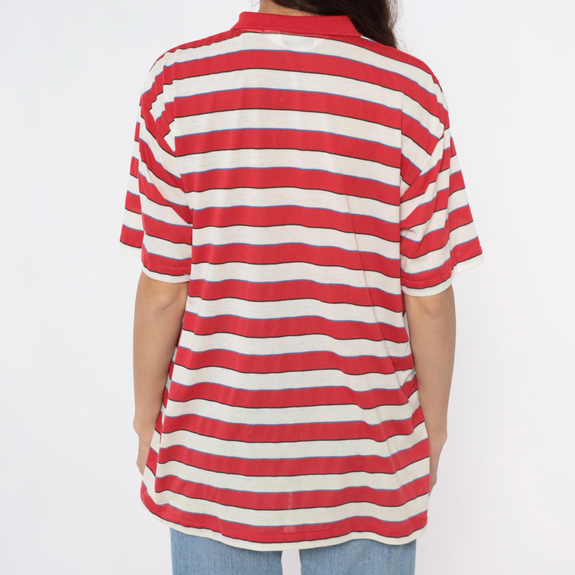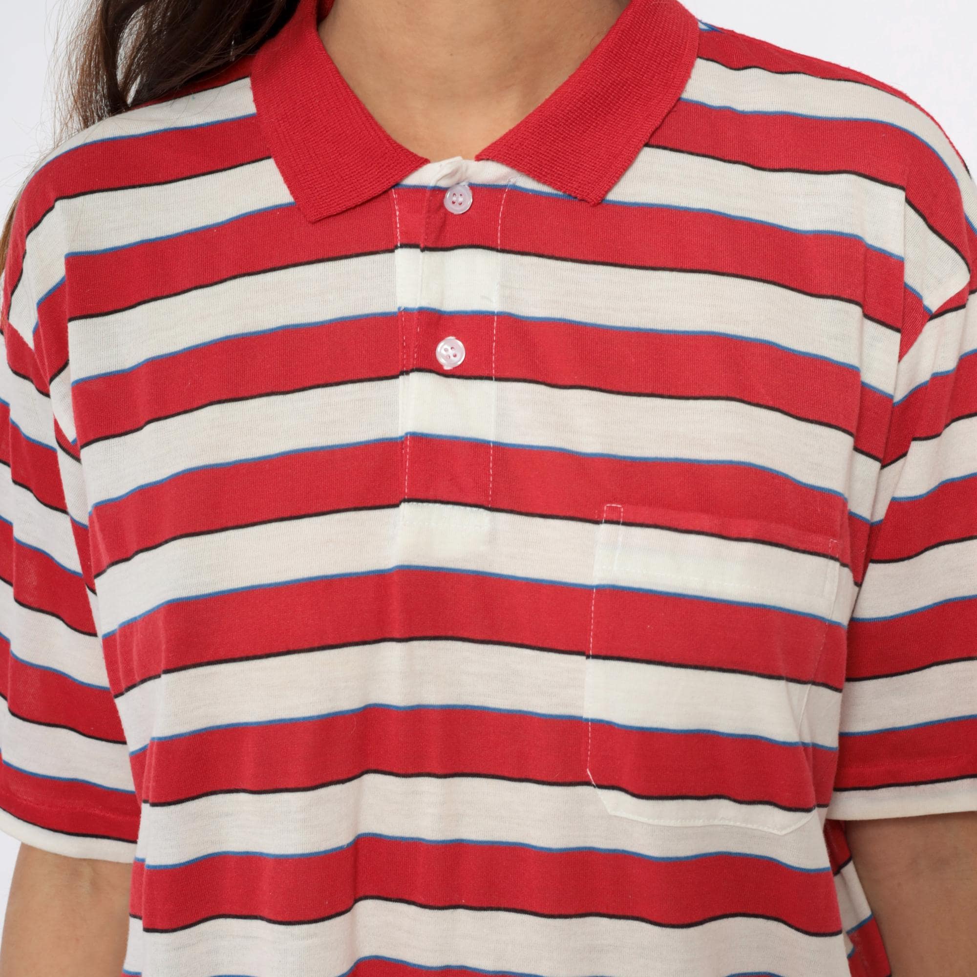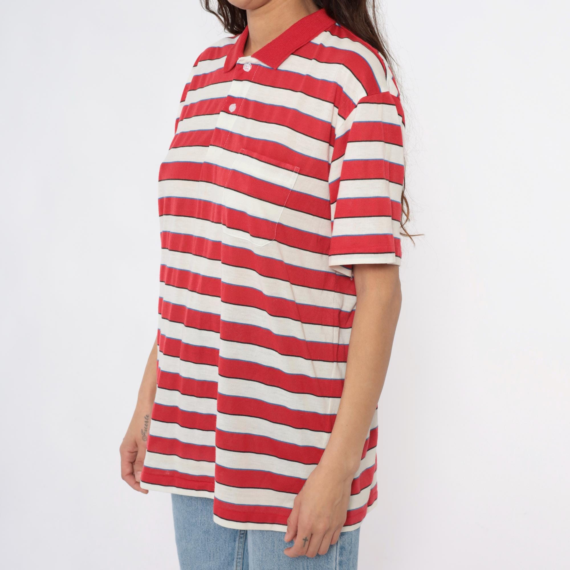 80s red and white horizontal striped polo shirt with thin blue pinstripes running between the wider stripes. Solid red ribbed polo collar, short sleeves with ribbed cuffs, two-button placket, and breast pocket.