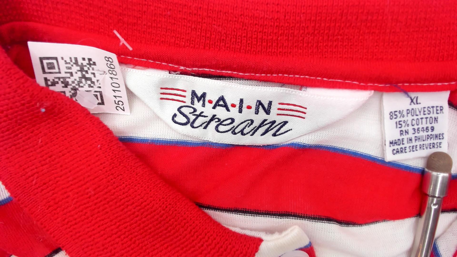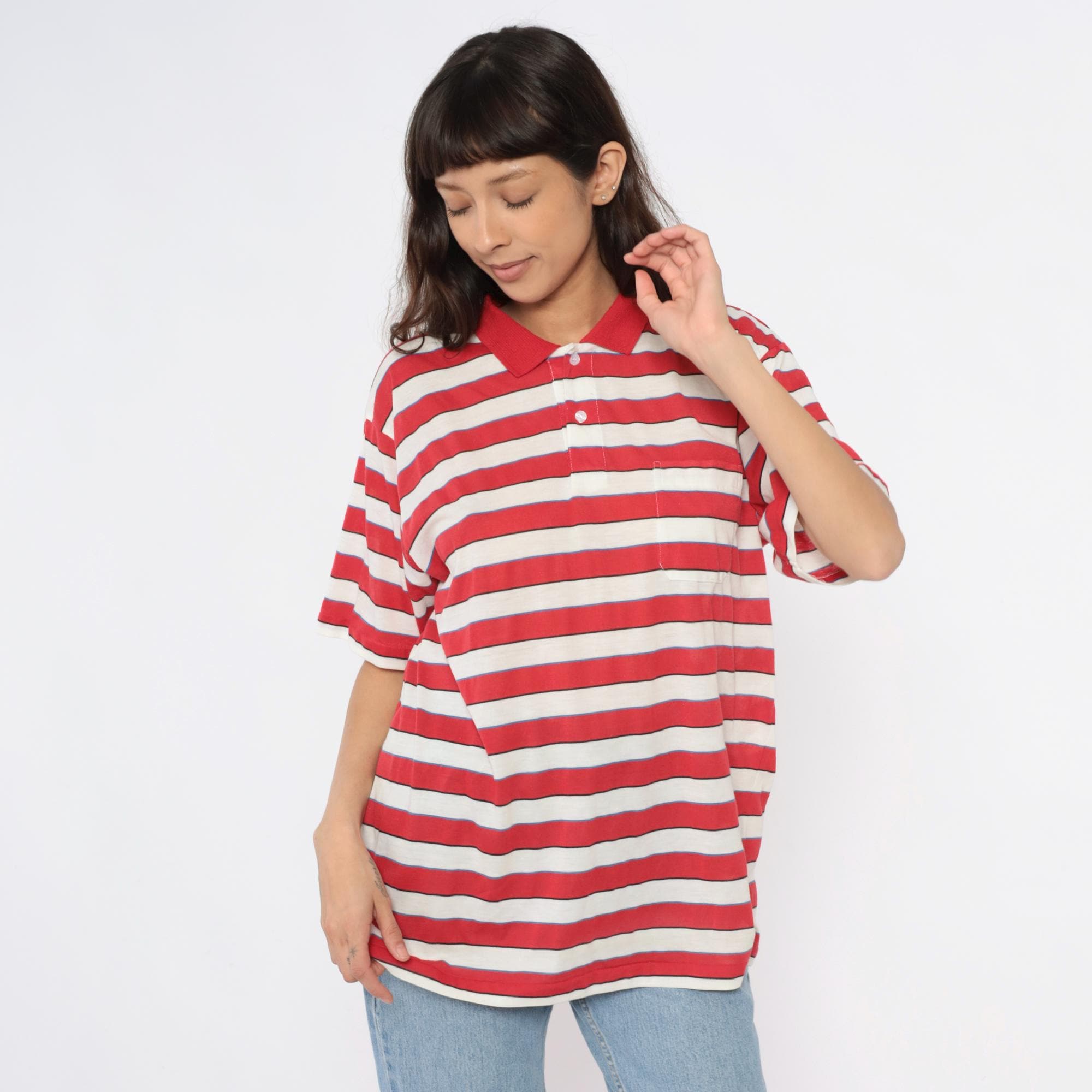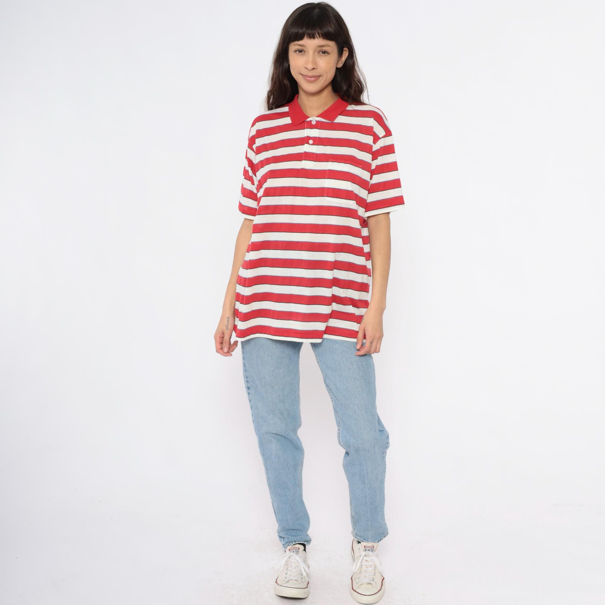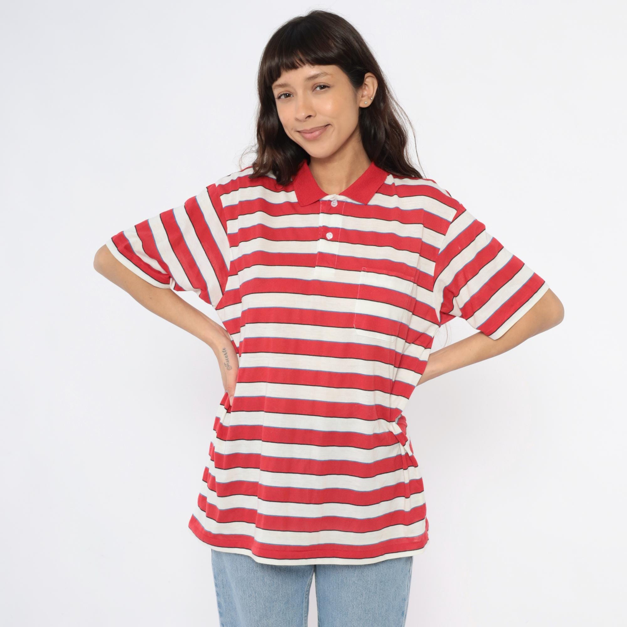 80s red and white horizontal striped polo shirt with thin blue pinstripes running between the wider stripes. Solid red ribbed polo collar, short sleeves with ribbed cuffs, two-button placket, and breast pocket.