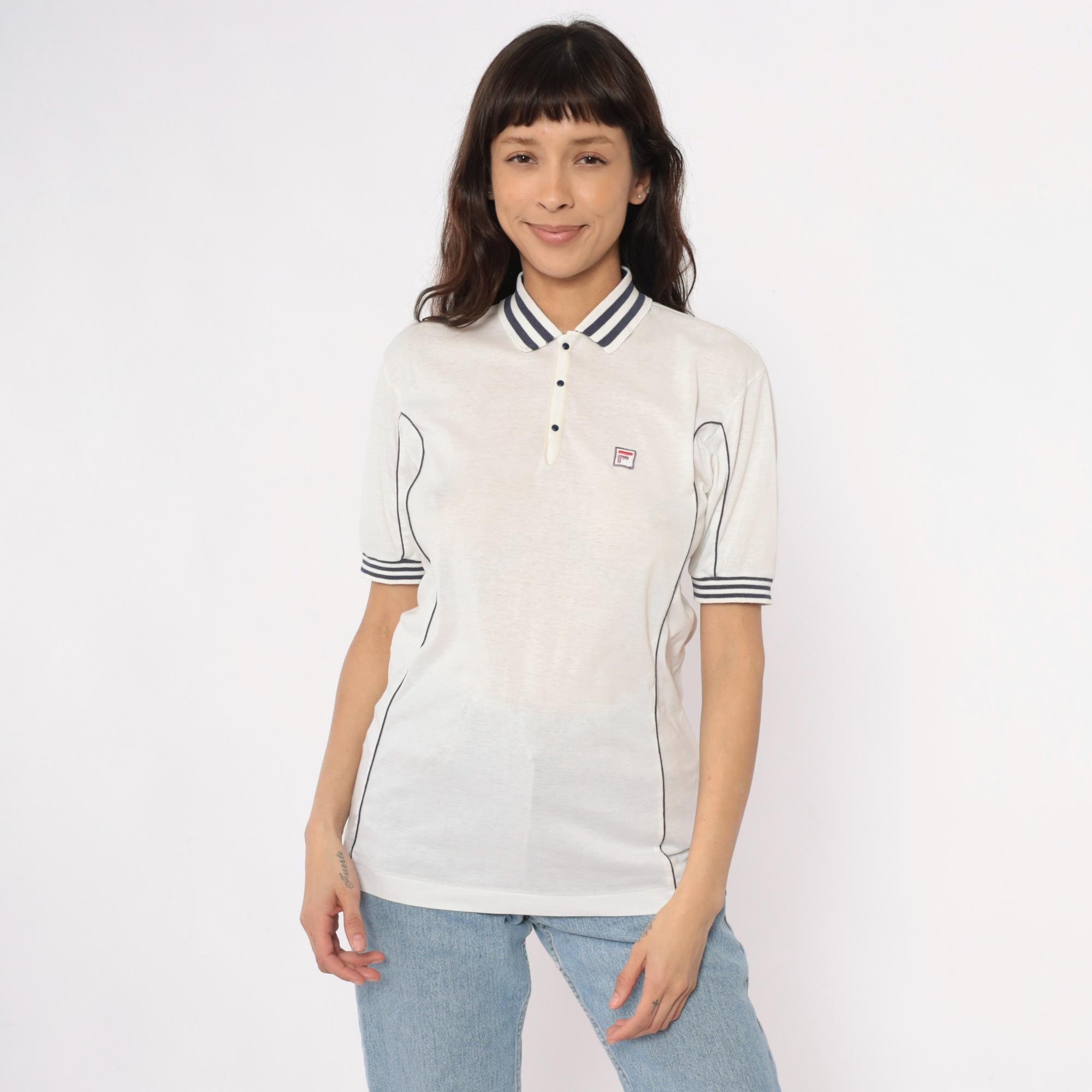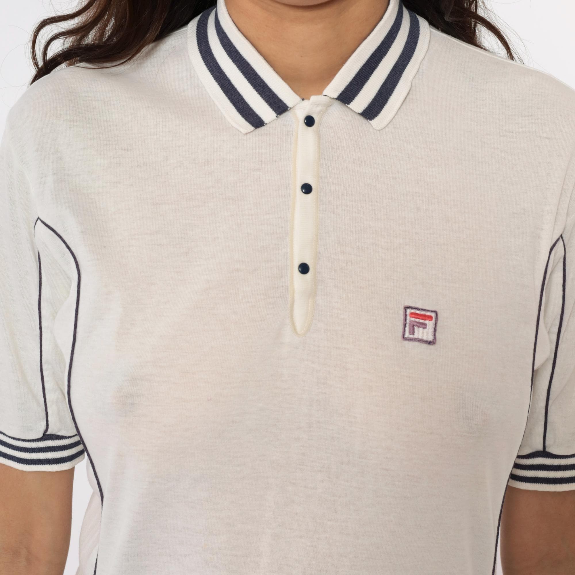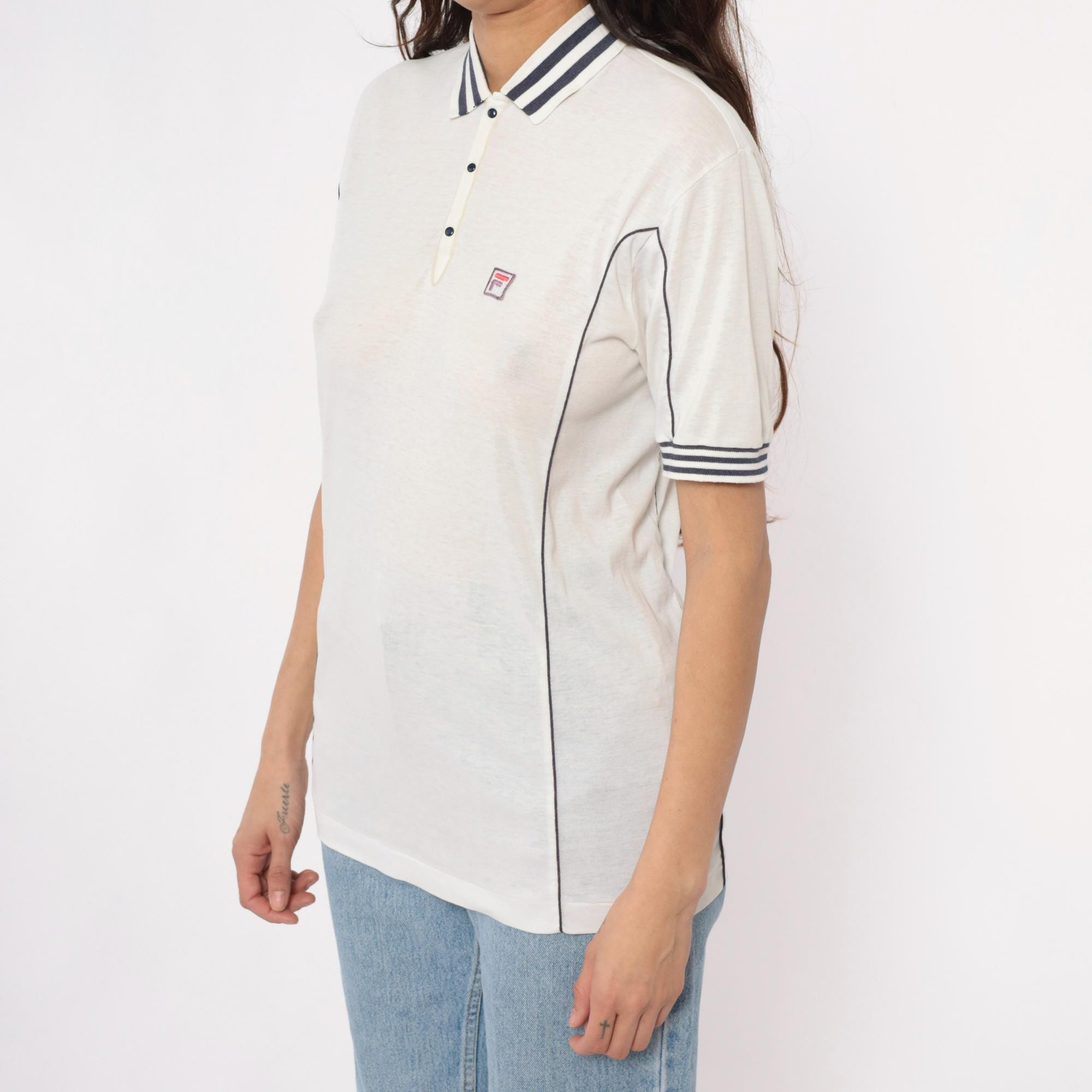 80s white polo shirt from Fila with navy blue striped collar and sleeve cuffs. Three-button placket front, short sleeves, embroidered Fila logo on left chest. Navy piping along side seams.