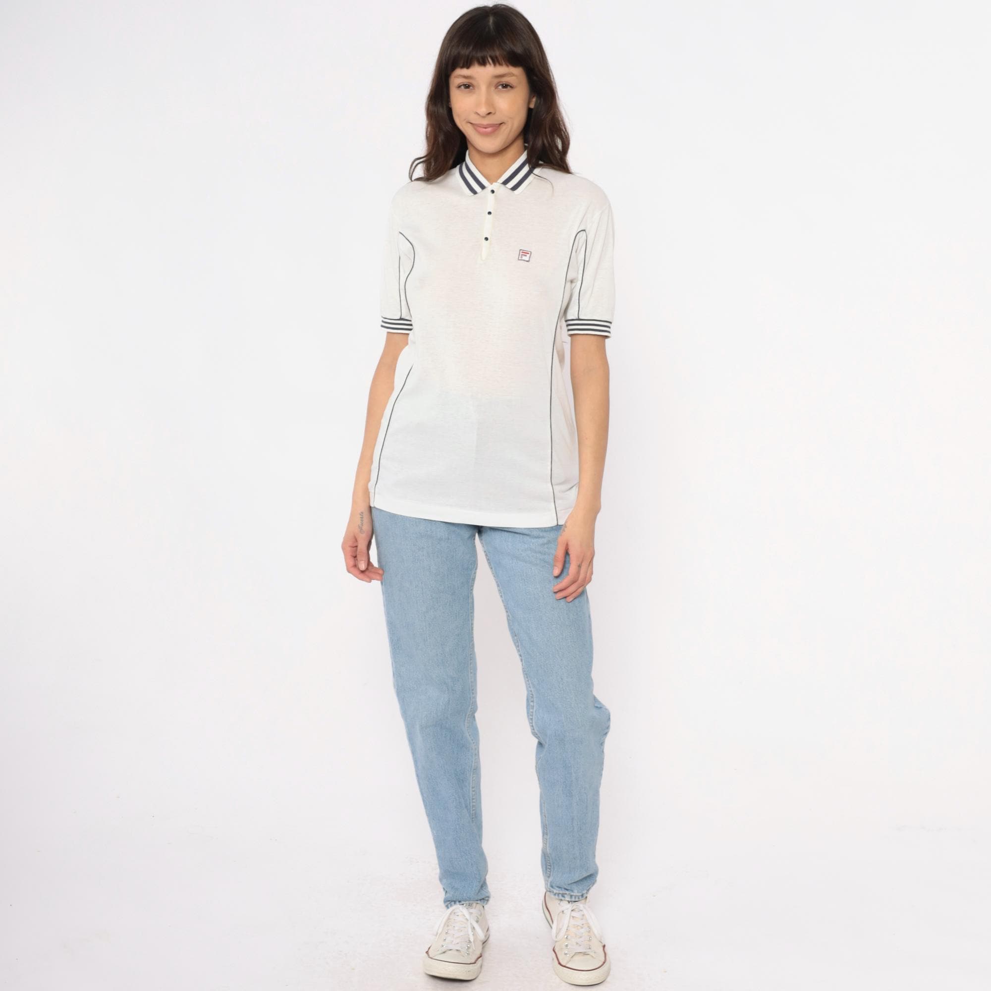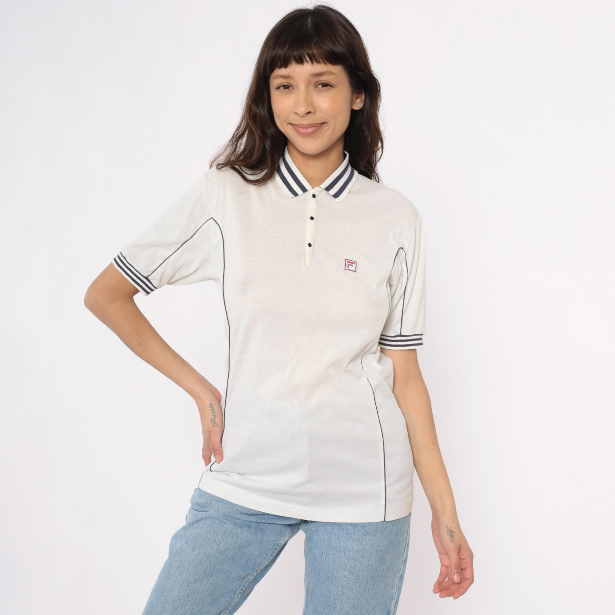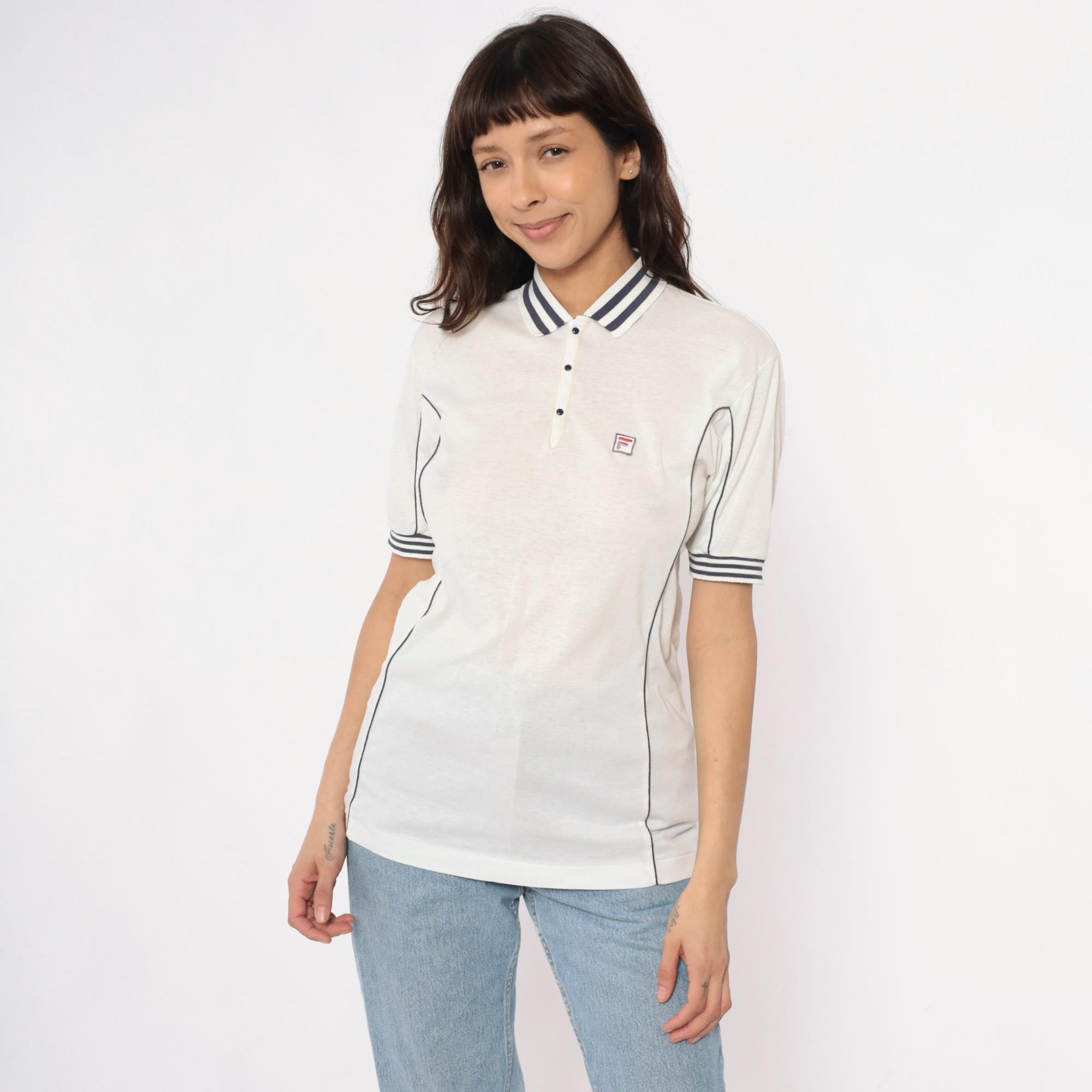 80s white polo shirt from Fila with navy blue striped collar and sleeve cuffs. Three-button placket front, short sleeves, embroidered Fila logo on left chest. Navy piping along side seams.