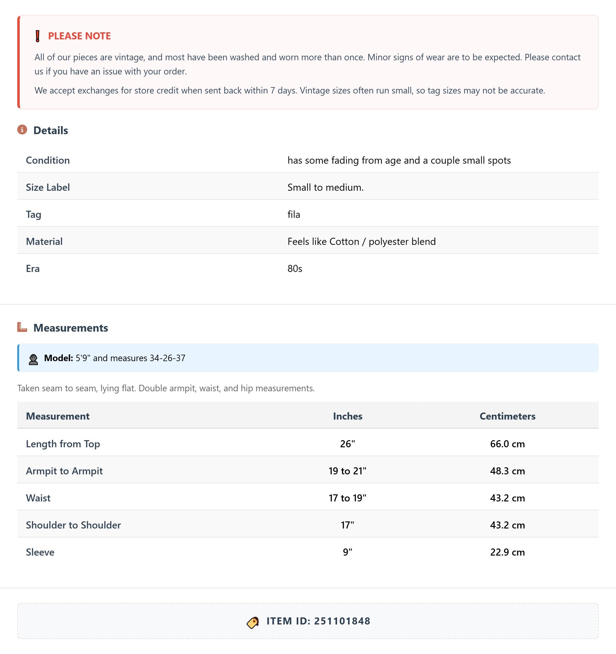 All of our pieces are vintage, and most have been washed and worn more than once. Minor signs of wear are to be expected. Please contact us if you have an issue with your order. We accept exchanges for store credit when sent back within 7 days.