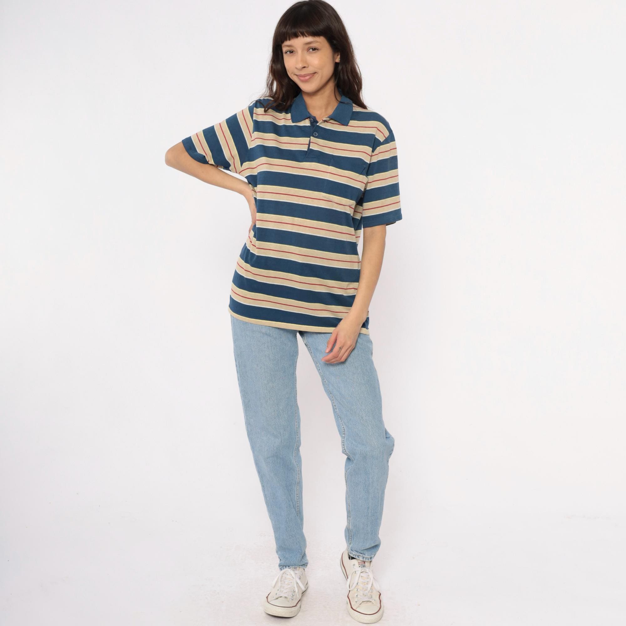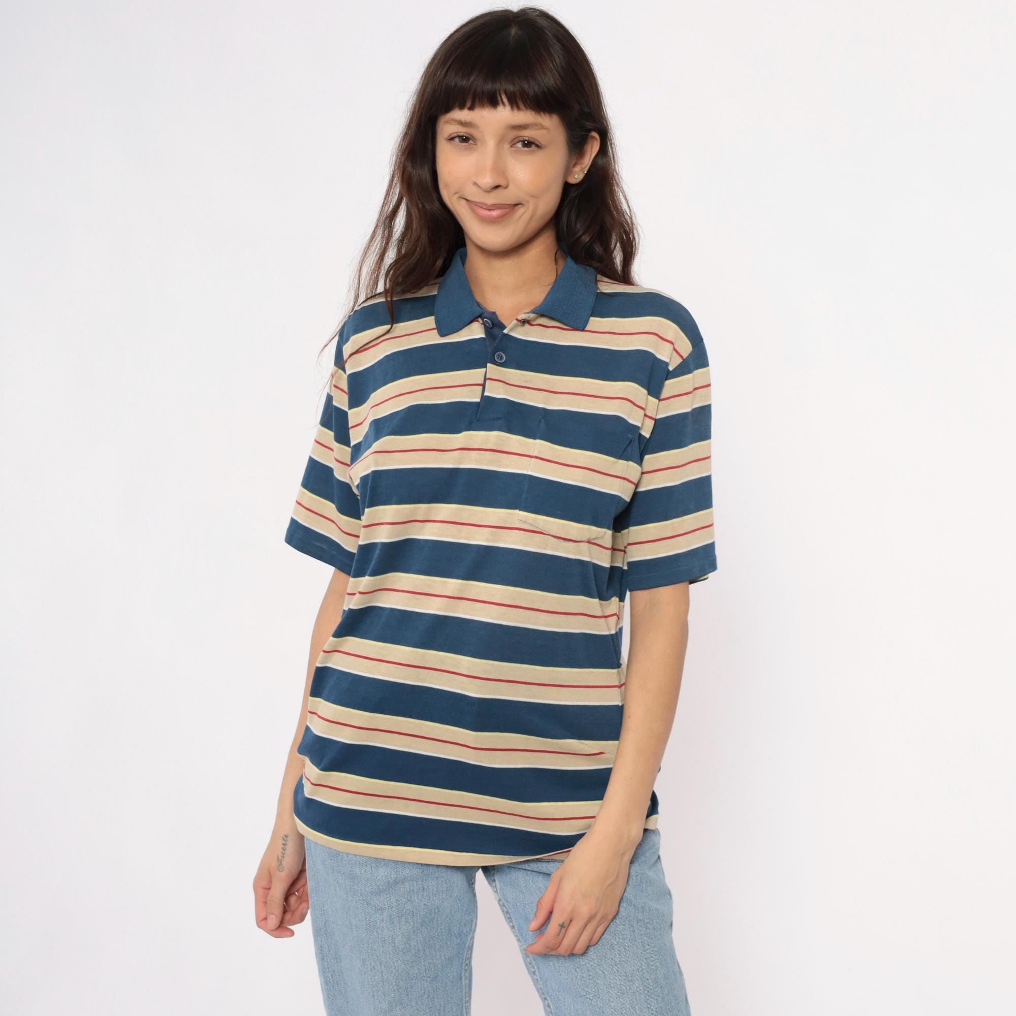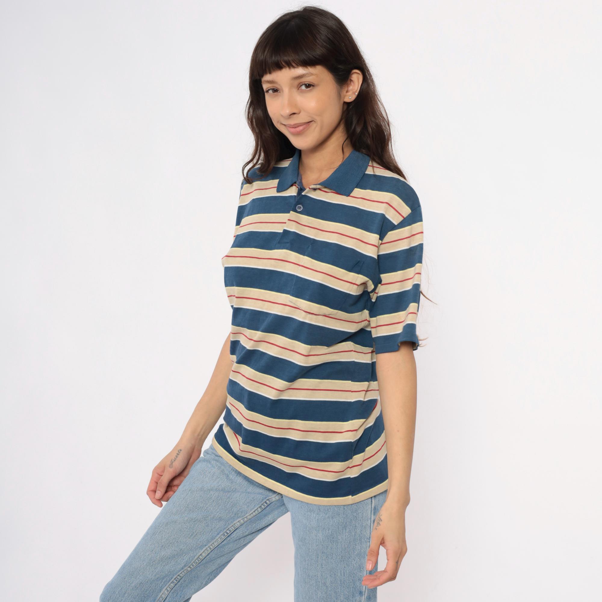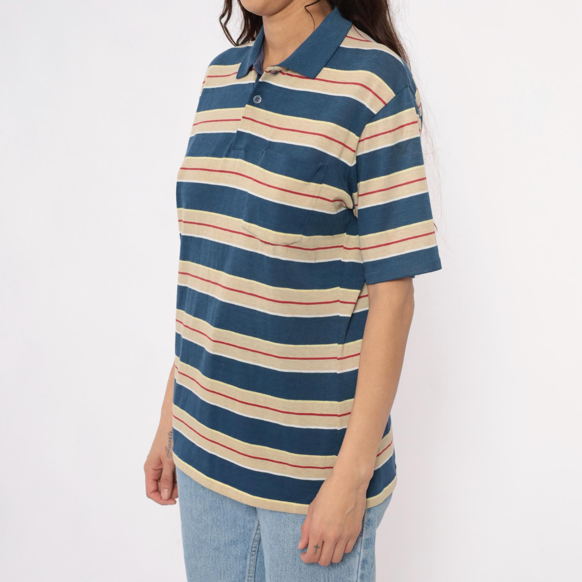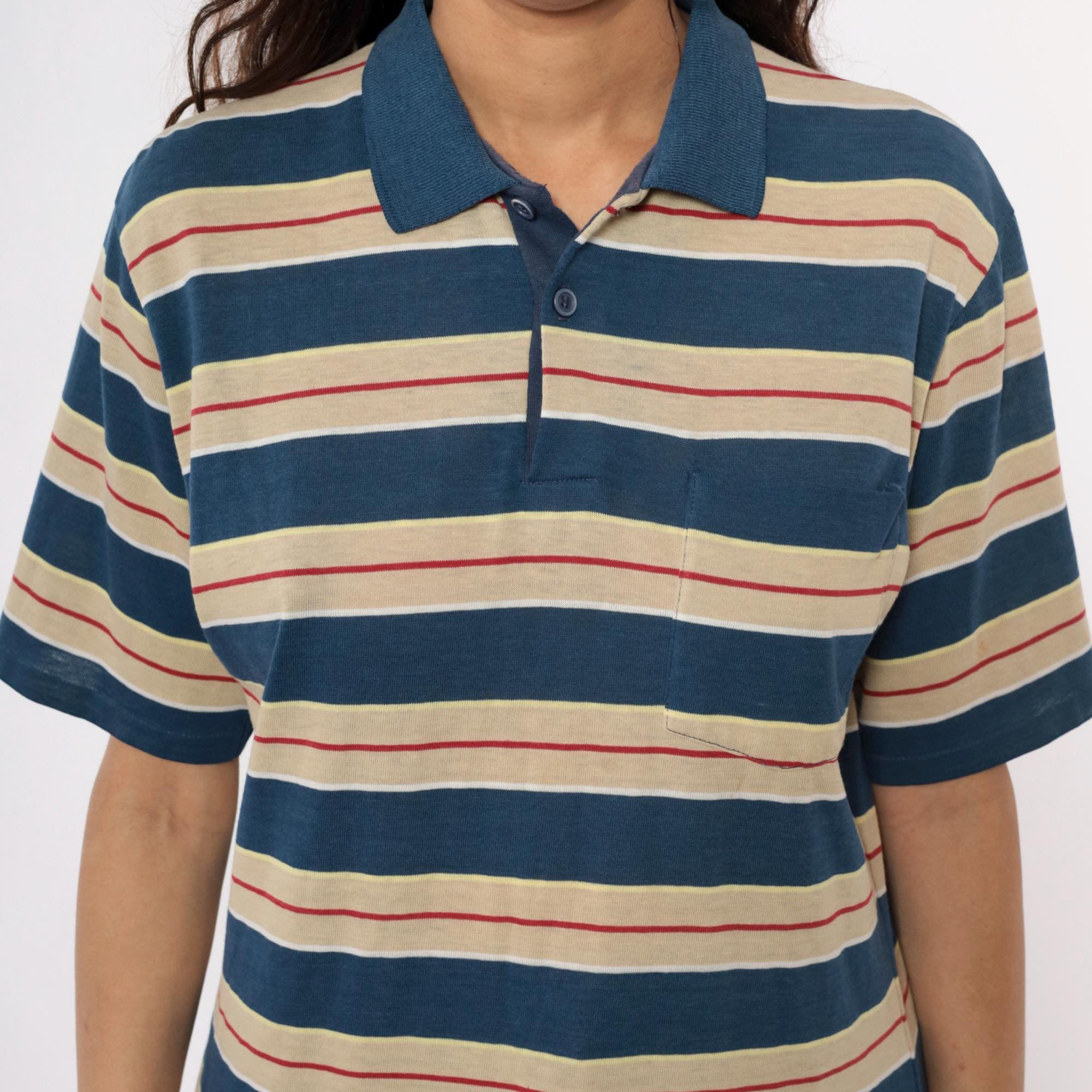 80s navy and cream striped polo shirt with thin red accent stripes throughout. Collared neckline with two-button placket, short sleeves, horizontal stripe pattern across body.