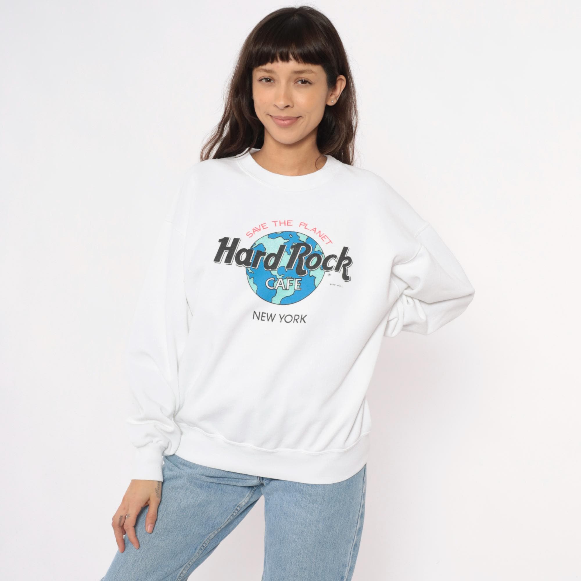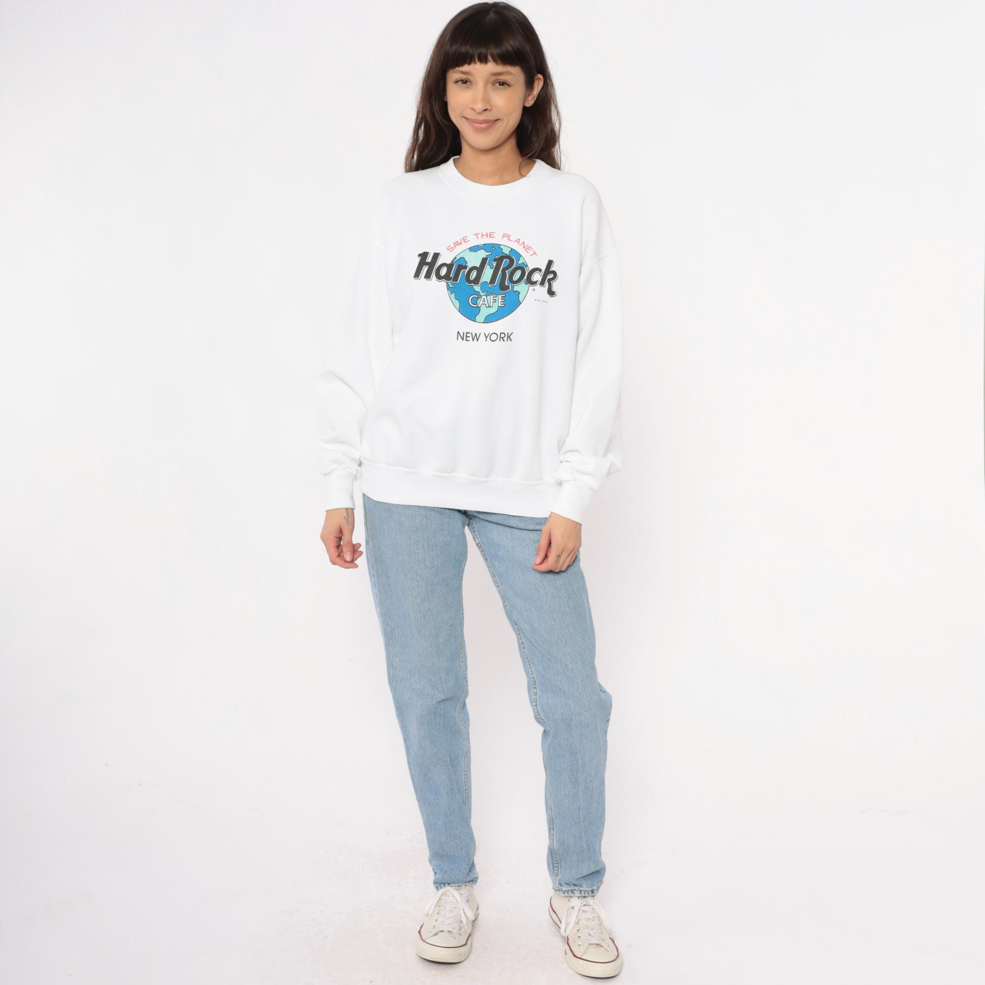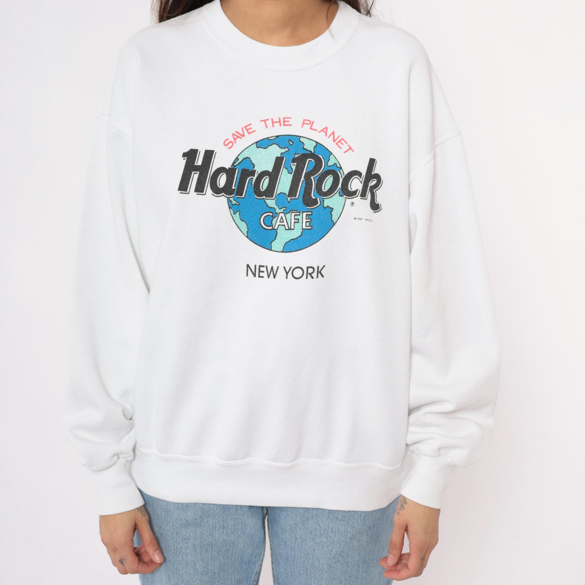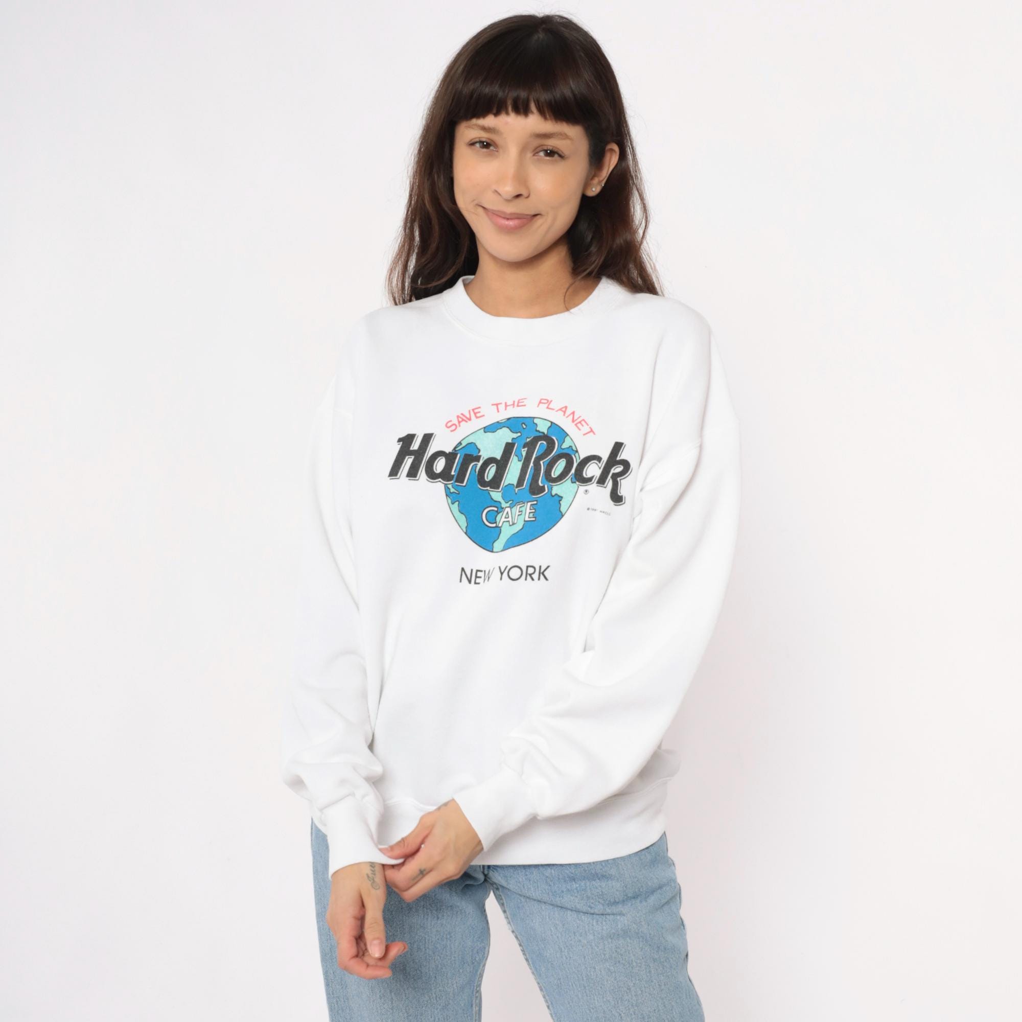 90s white Hard Rock Cafe New York sweatshirt with "Save the Planet" graphic featuring earth globe logo in blue and green. Crew neckline, long sleeves with ribbed cuffs, ribbed hem and collar.