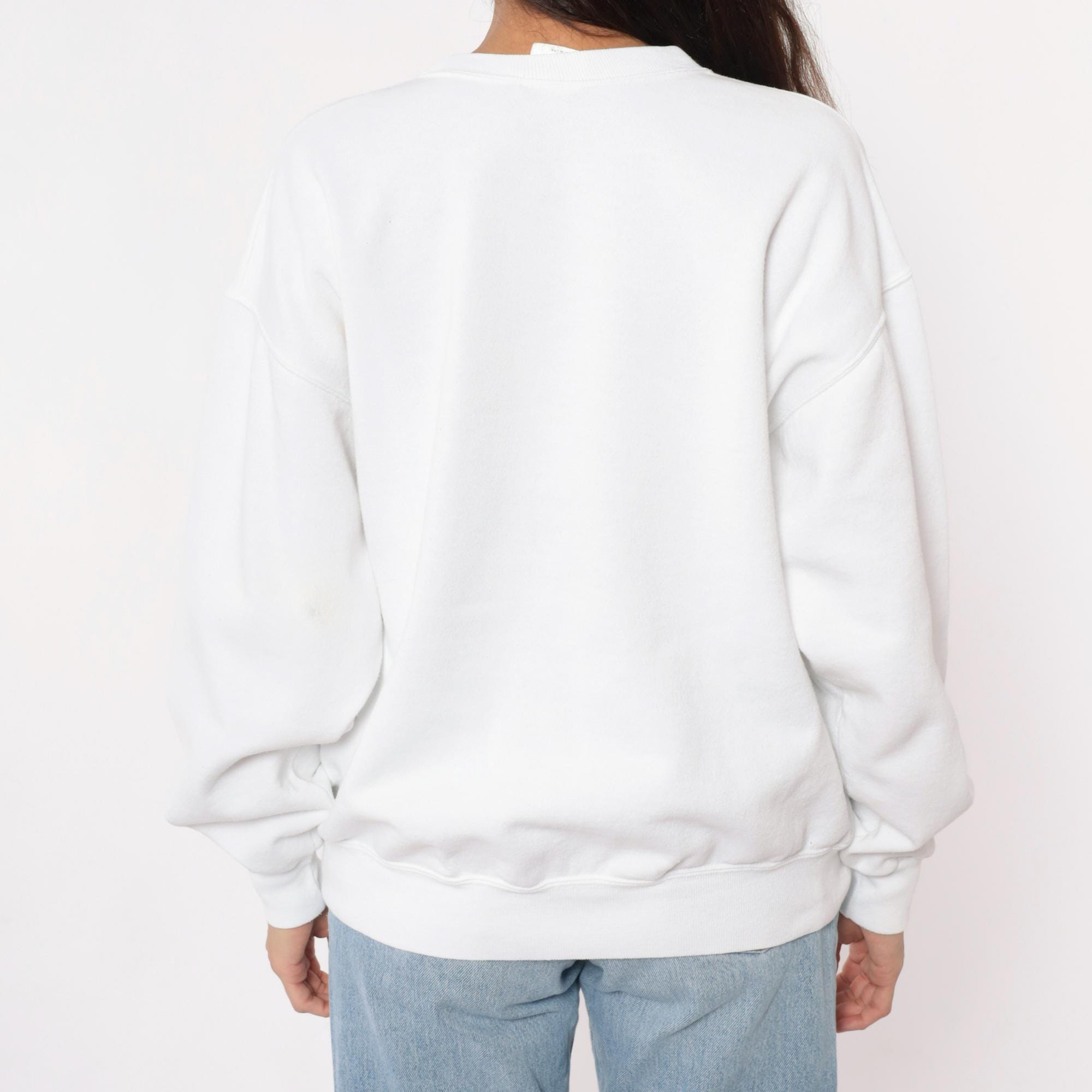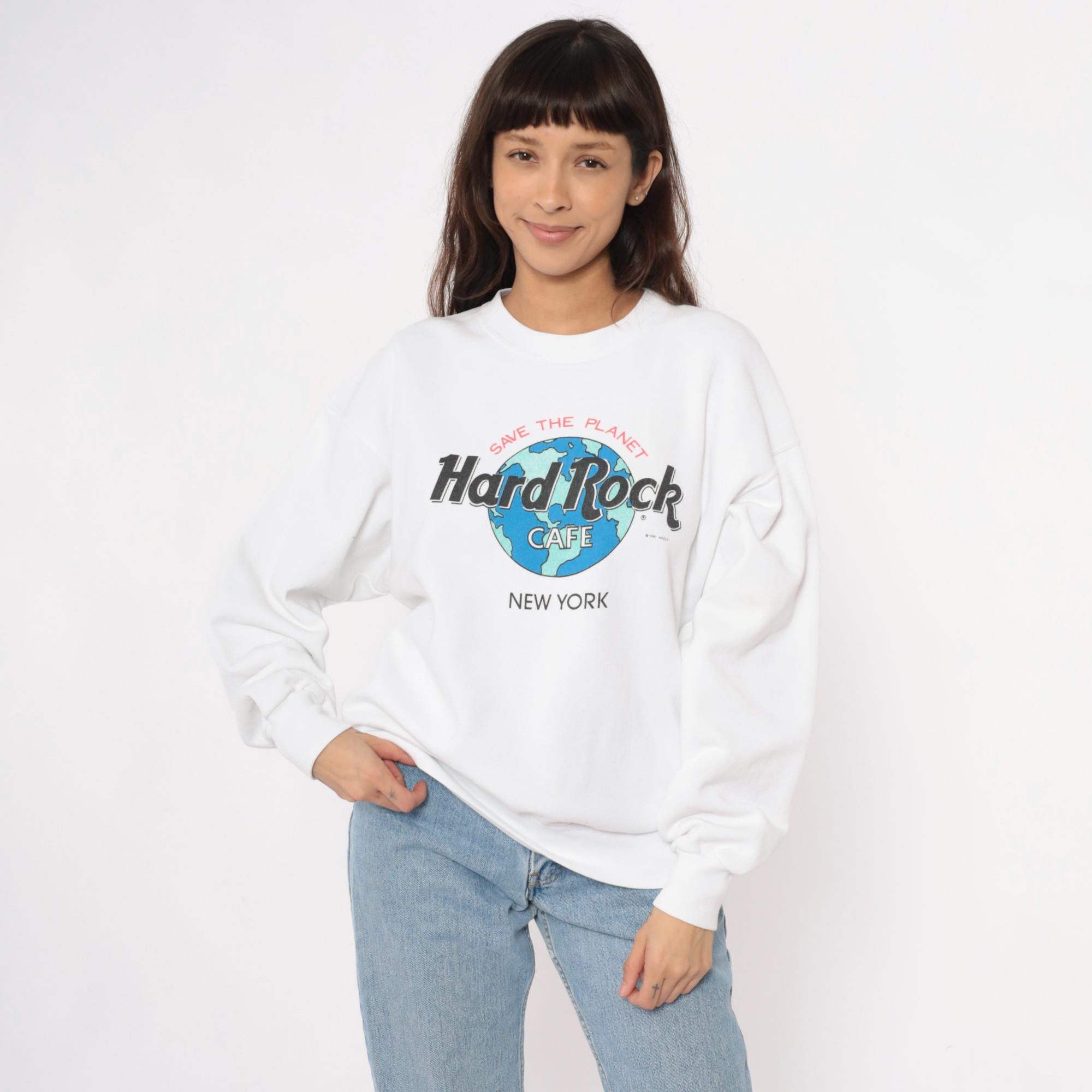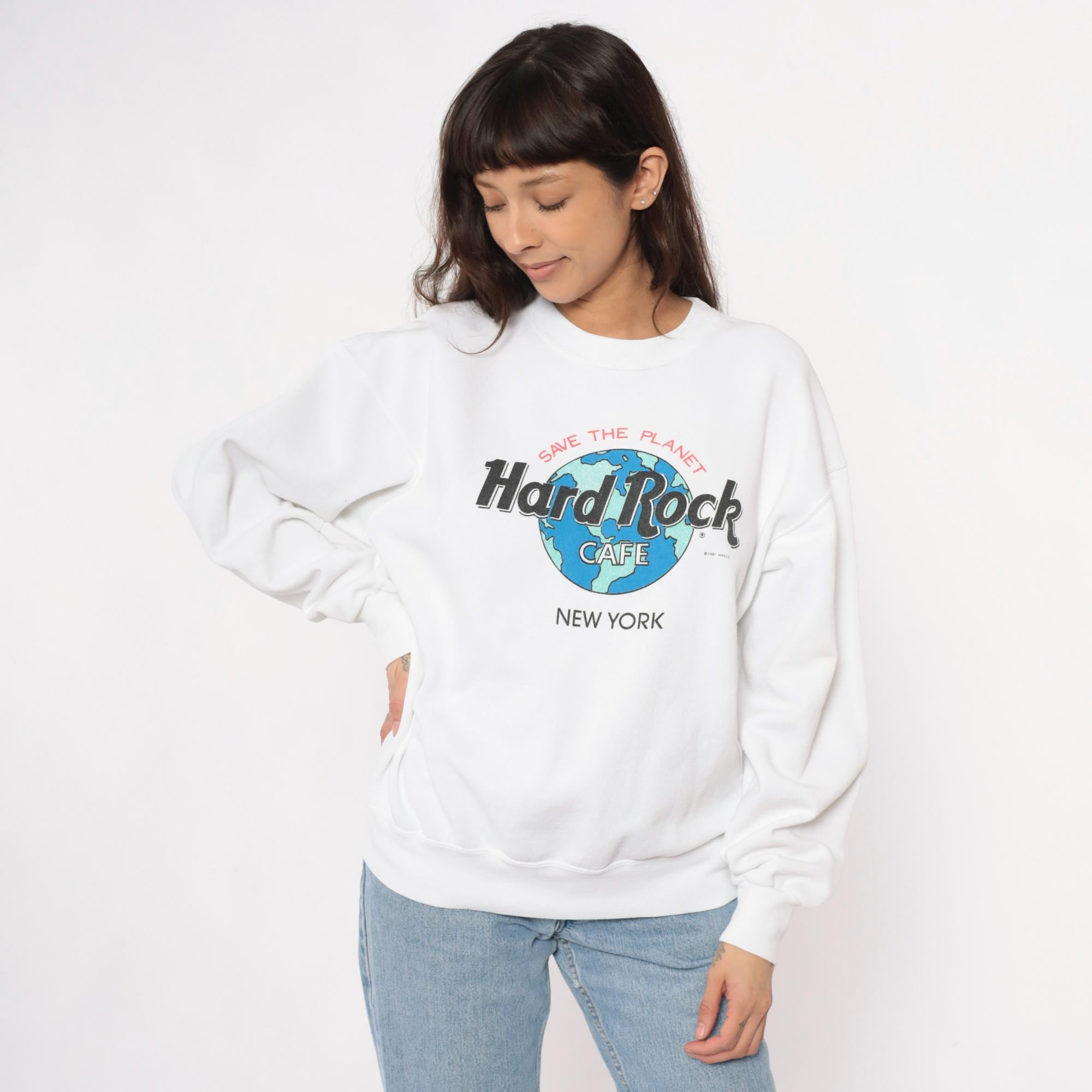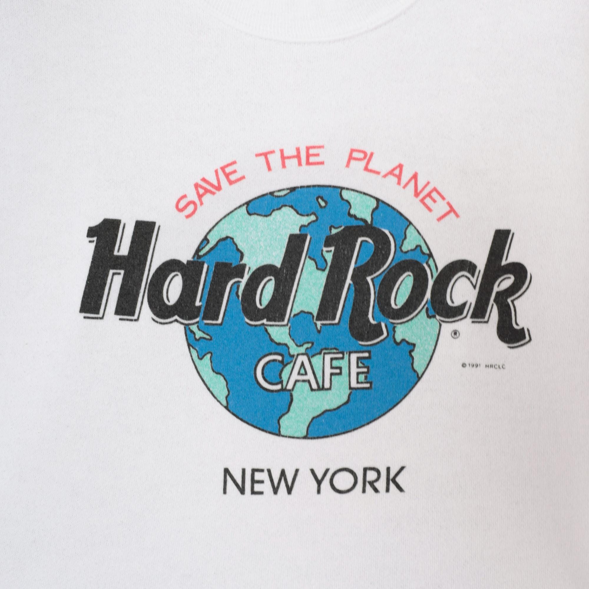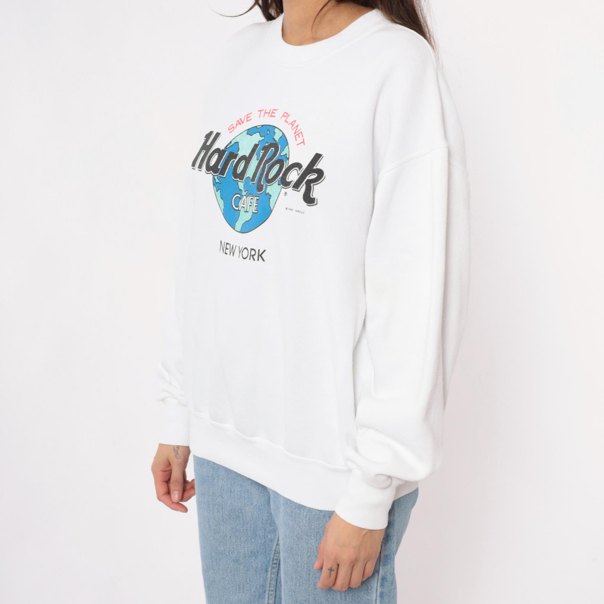 90s white Hard Rock Cafe New York sweatshirt with "Save the Planet" graphic featuring earth globe logo in blue and green. Crew neckline, long sleeves with ribbed cuffs, ribbed hem and collar.