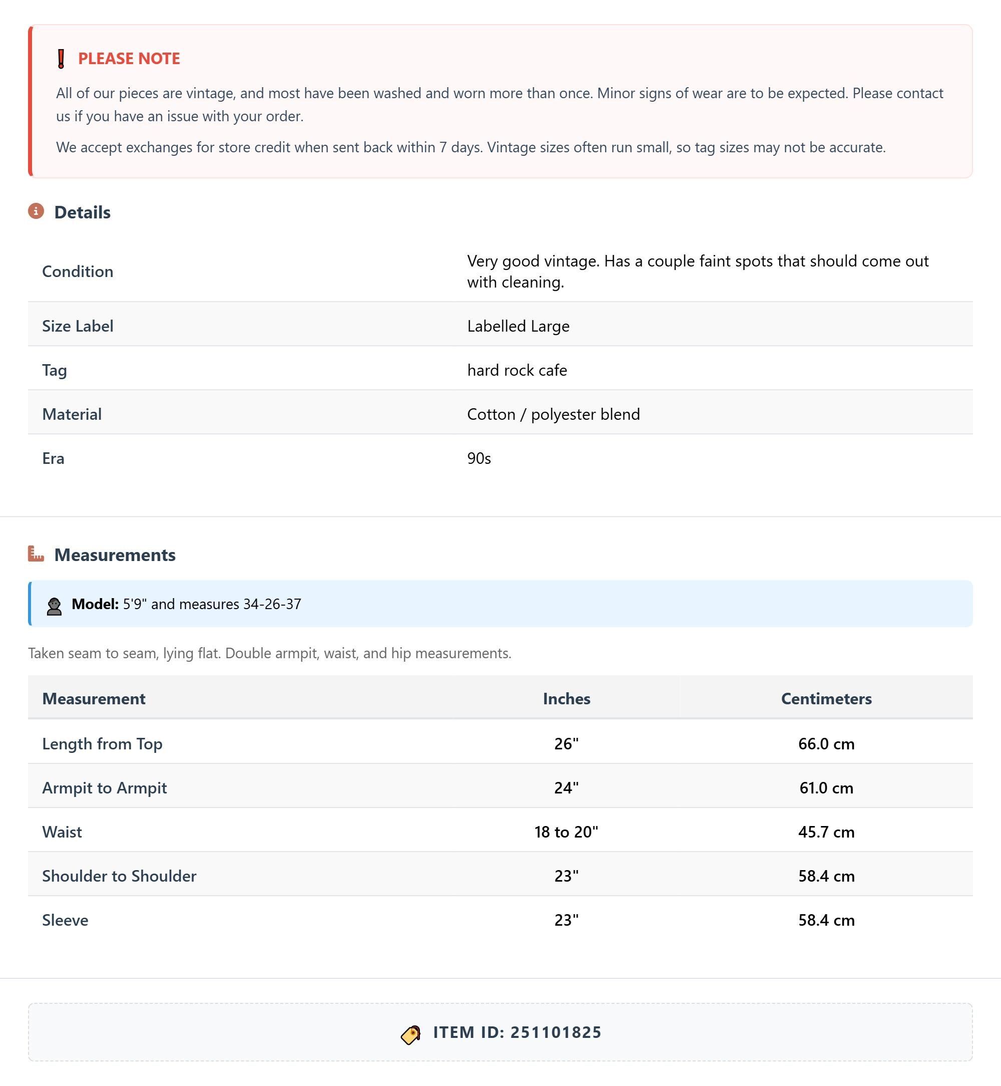 All of our pieces are vintage, and most have been washed and worn more than once. Minor signs of wear are to be expected. Please contact us if you have an issue with your order. We accept exchanges for store credit when sent back within 7 days.