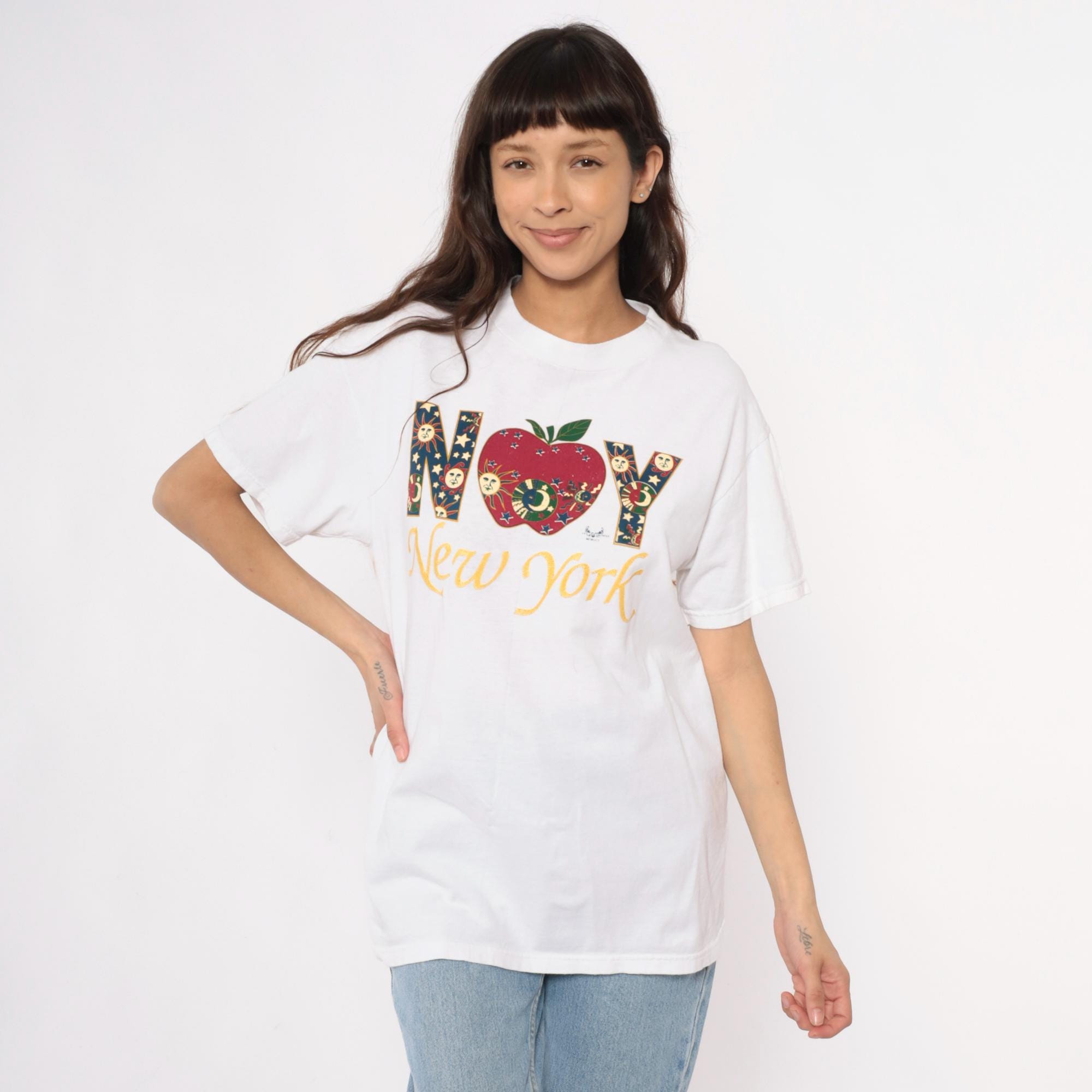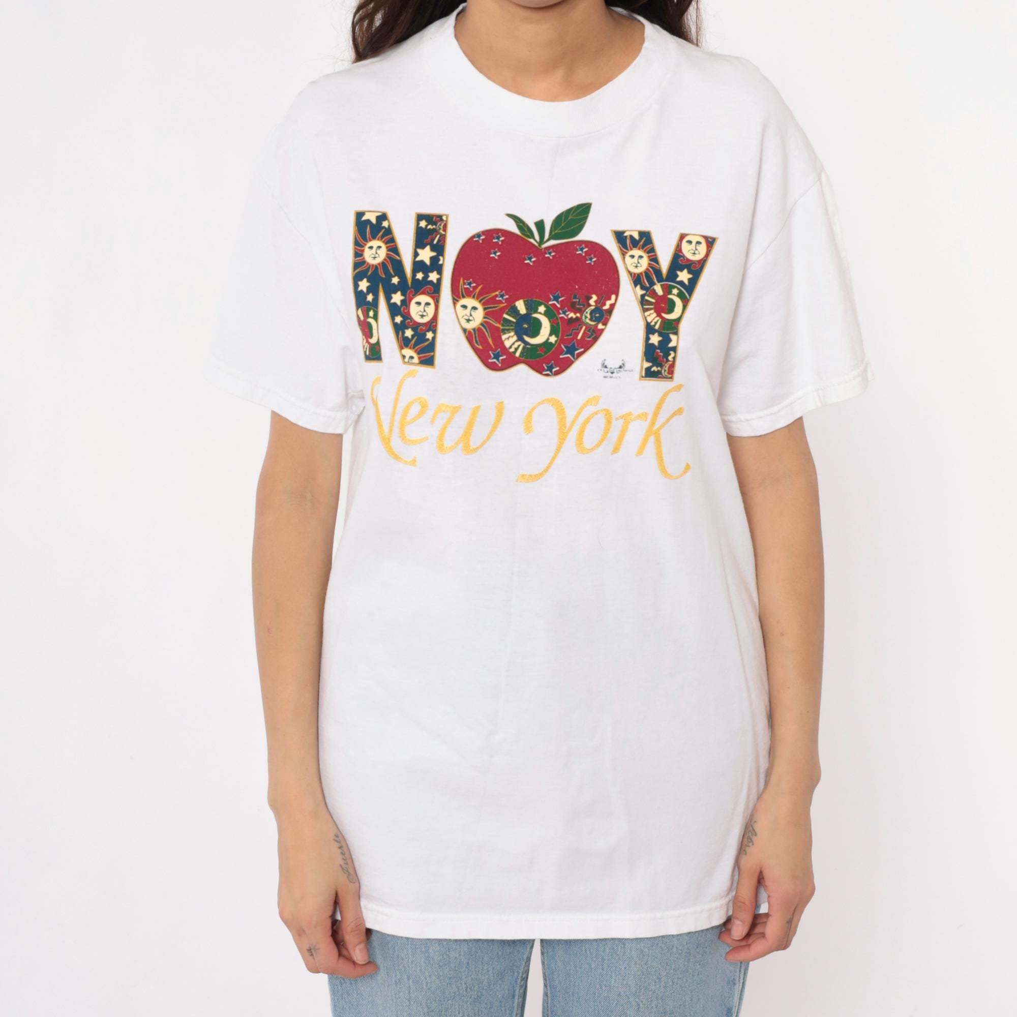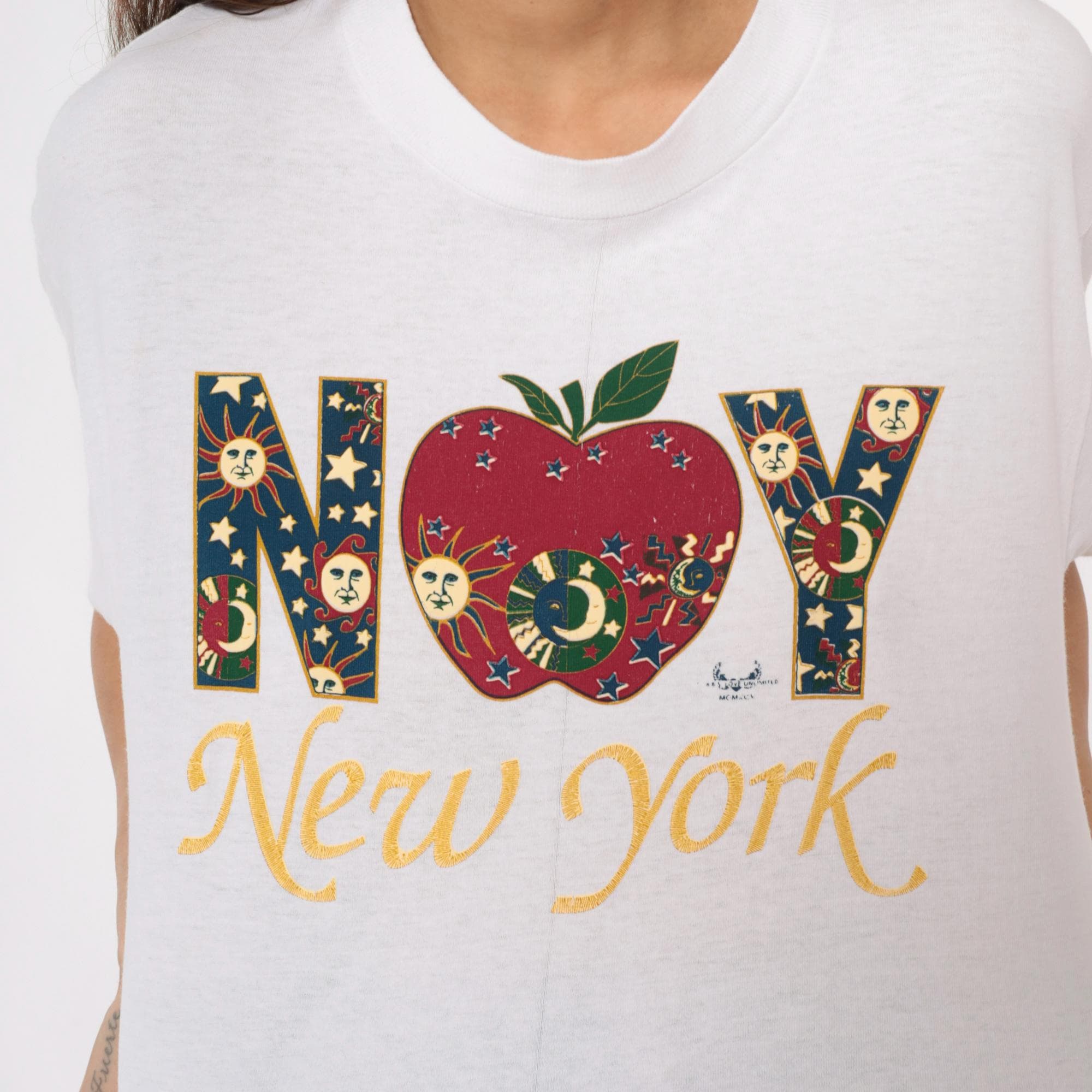 90s white New York graphic t-shirt from delta with celestial-patterned lettering and apple design. Letters N and Y feature dark blue fabric with sun, moon, and star motifs, red apple with matching celestial pattern replacing the O, gold script "New York" text below.
