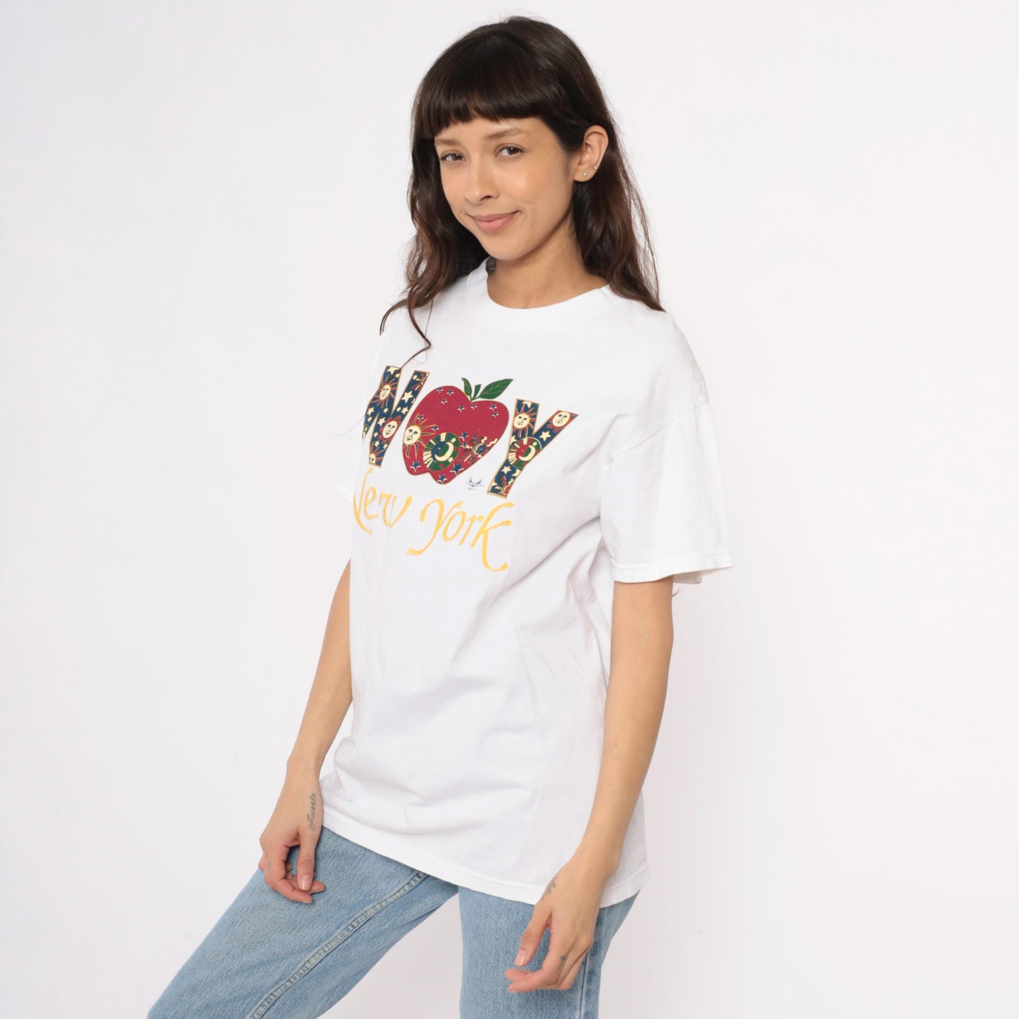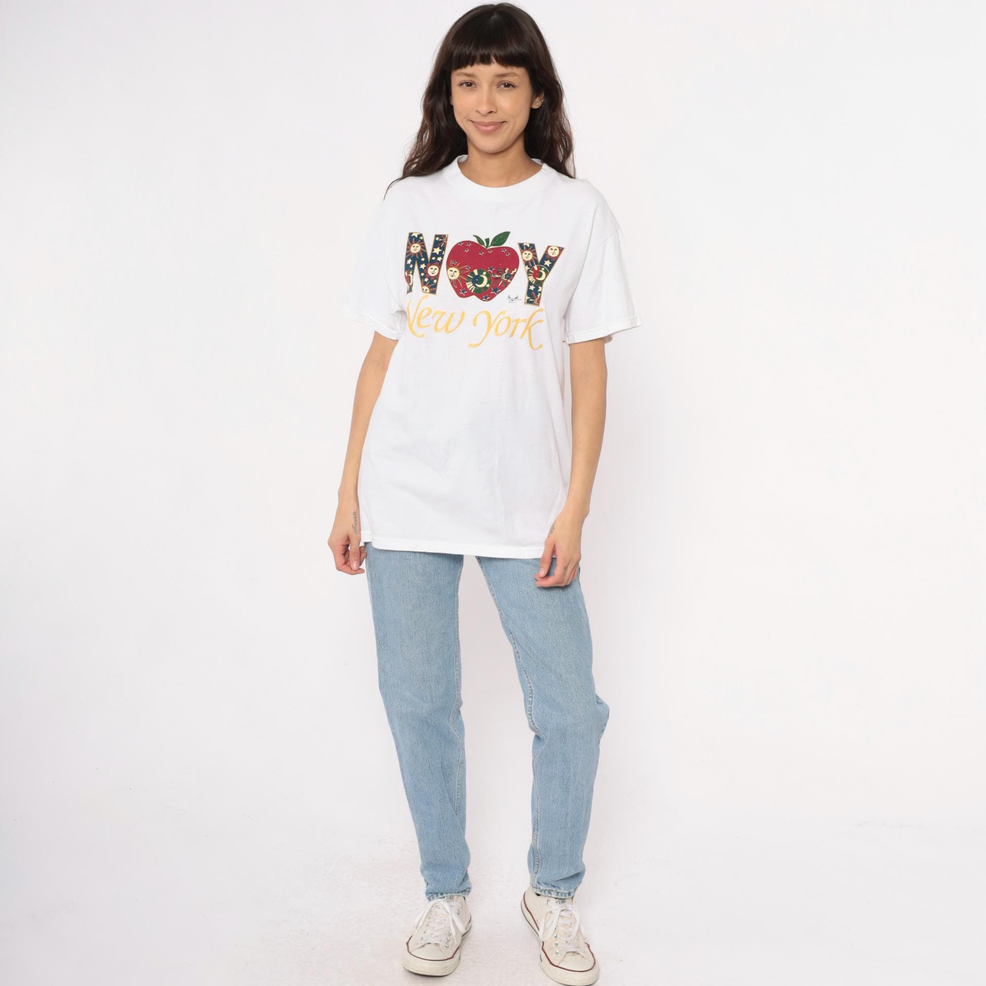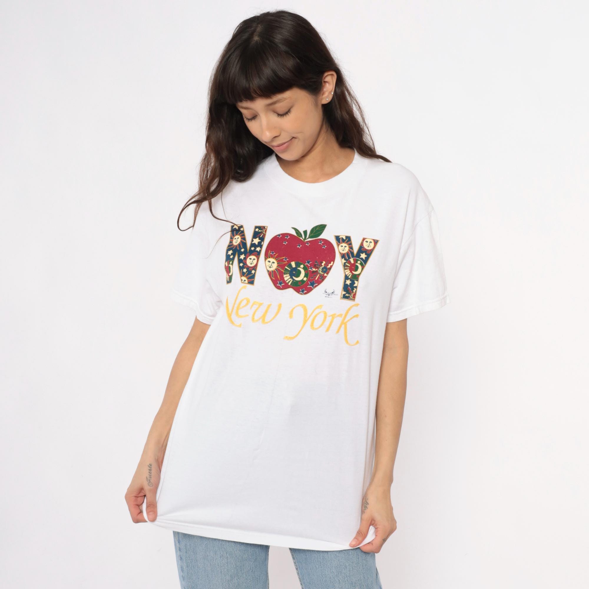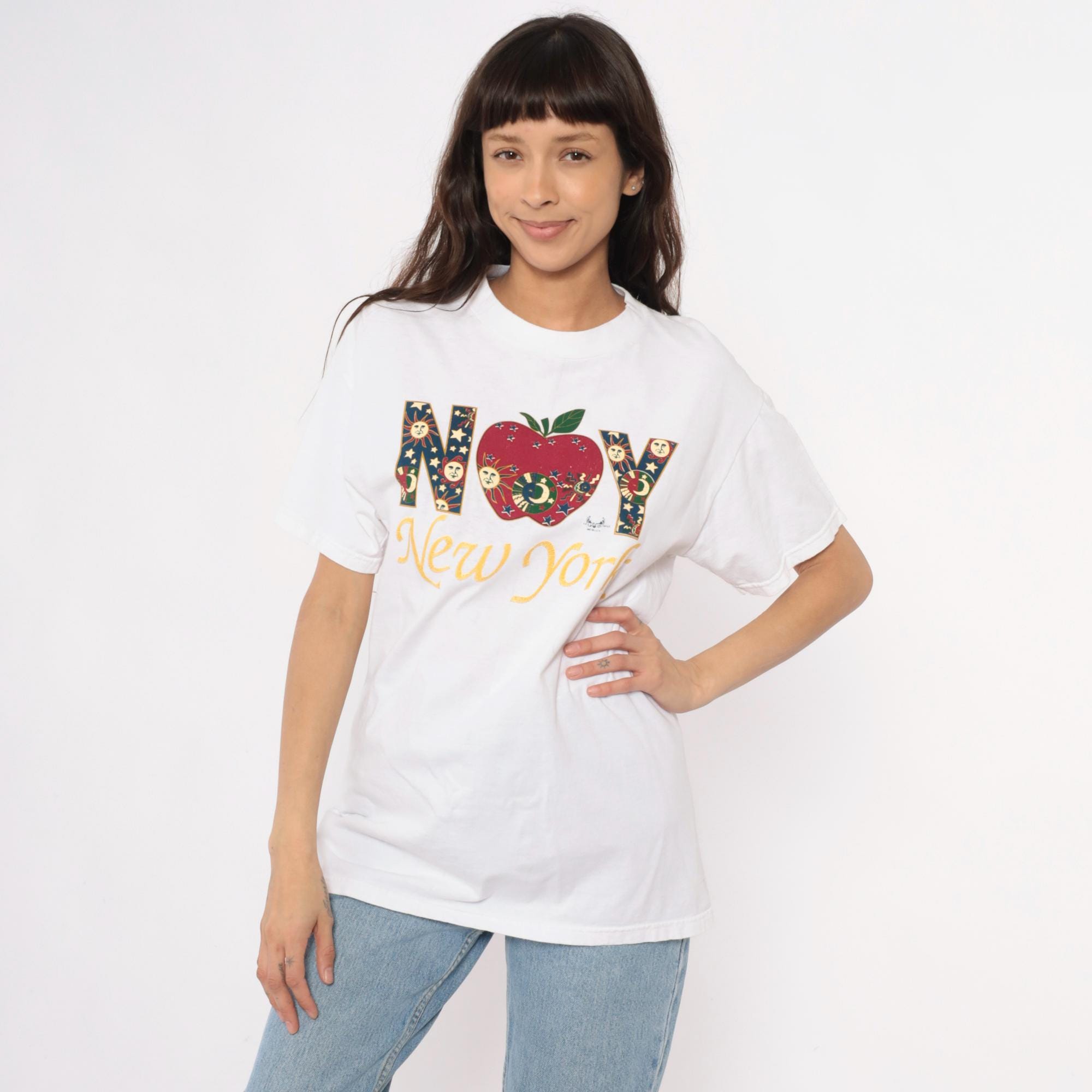 90s white New York graphic t-shirt from delta with celestial-patterned lettering and apple design. Letters N and Y feature dark blue fabric with sun, moon, and star motifs, red apple with matching celestial pattern replacing the O, gold script "New York" text below.