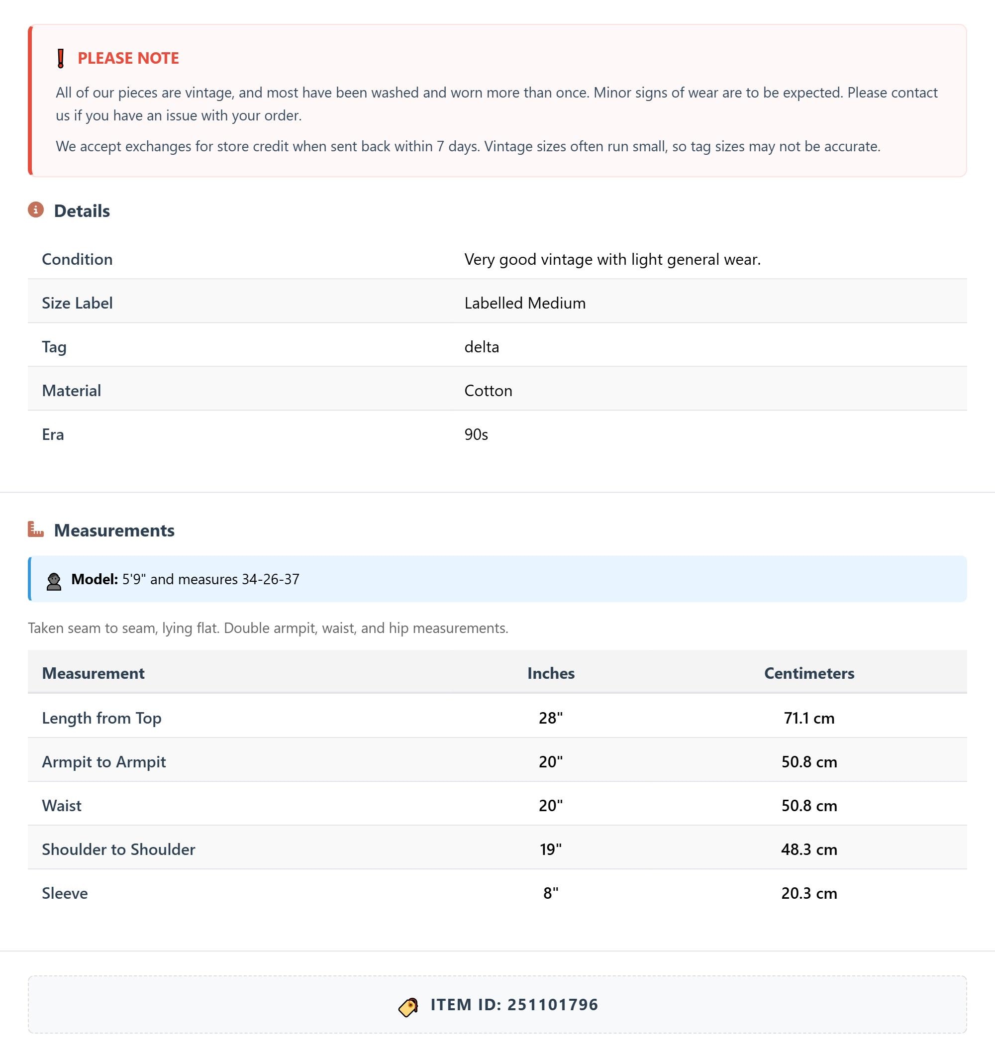 All of our pieces are vintage, and most have been washed and worn more than once. Minor signs of wear are to be expected. Please contact us if you have an issue with your order. We accept exchanges for store credit when sent back within 7 days.