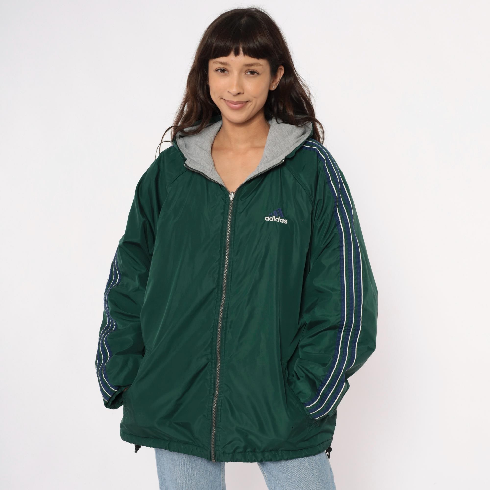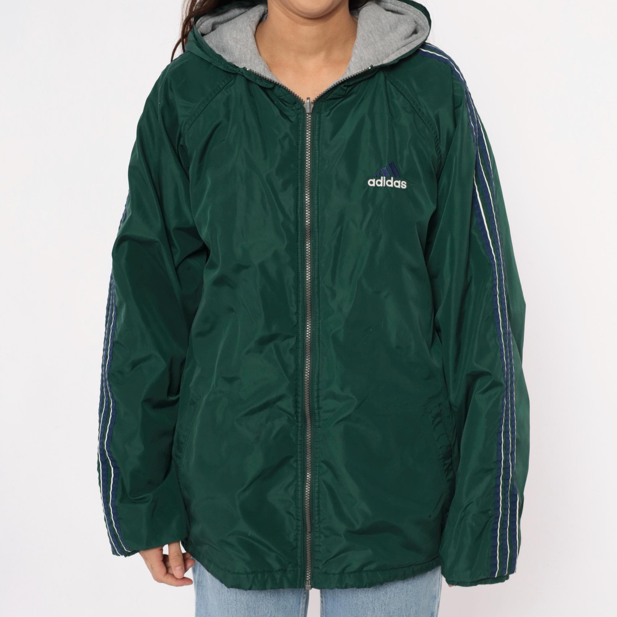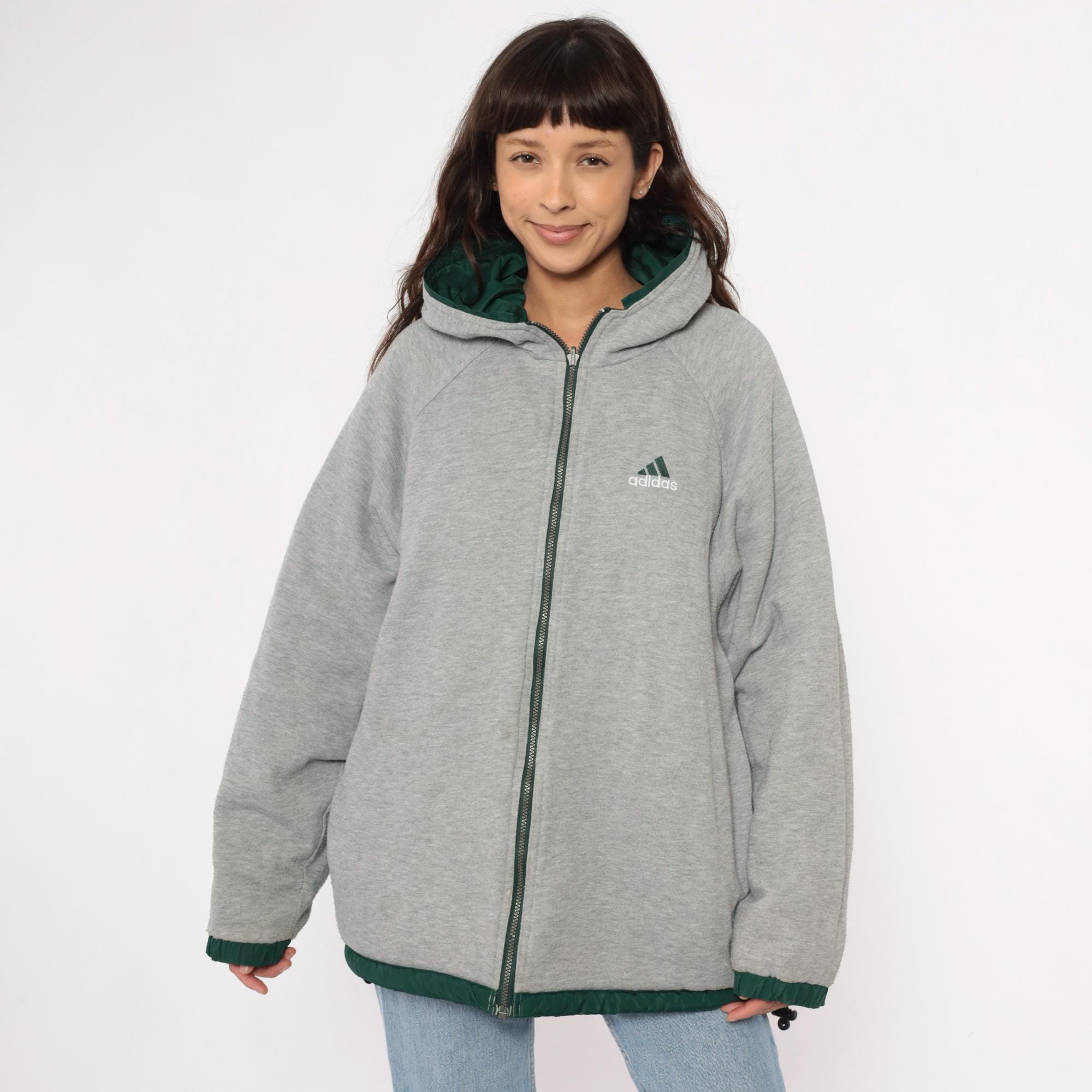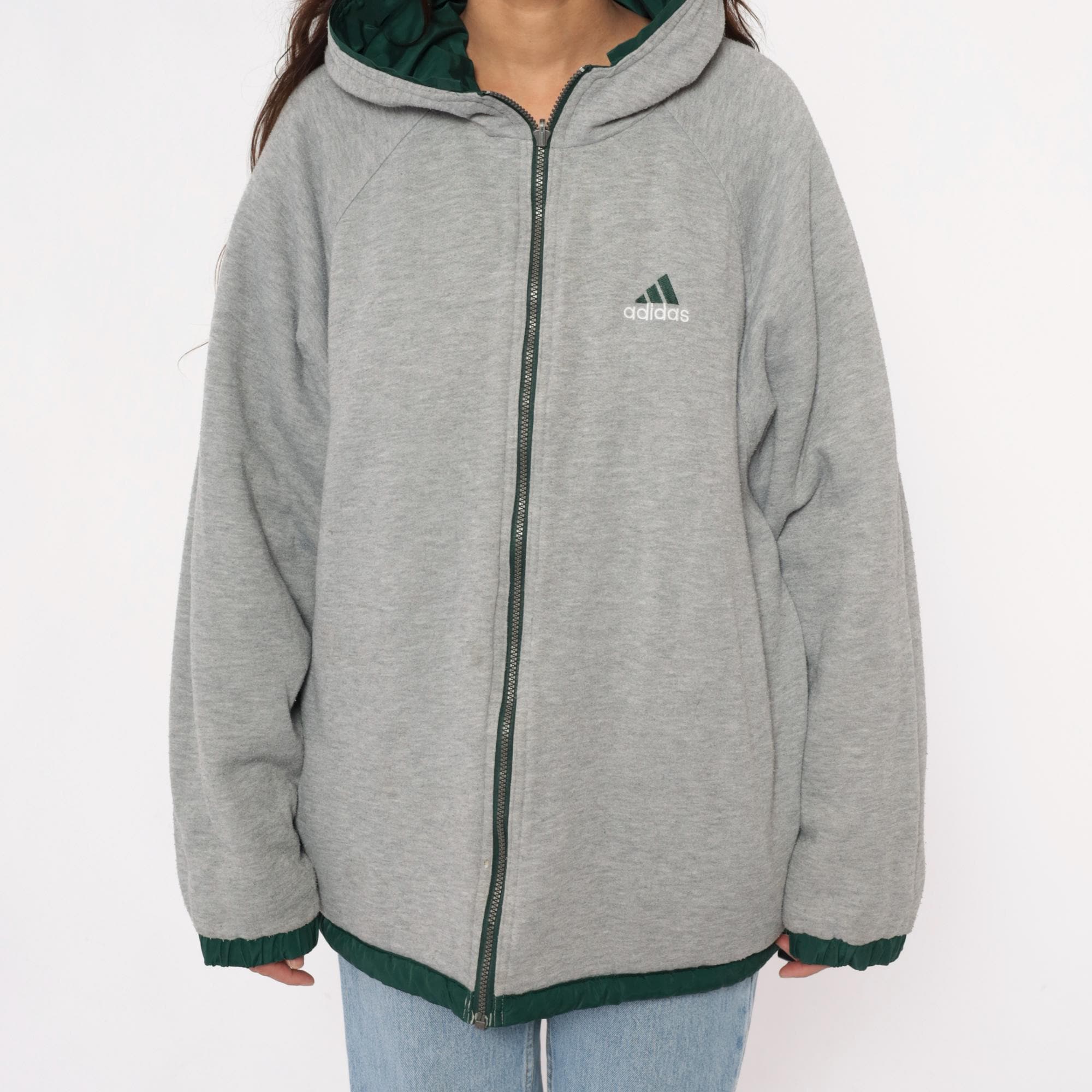 Y2K reversible adidas jacket with forest green nylon shell on one side and heather gray fleece on the reverse. Green side has embroidered adidas text logo on chest and navy stripe detail with white piping on shoulders, gray side has adidas logo graphic on back. Full front zipper closure, hood with drawstring, elastic cuffs and hem.