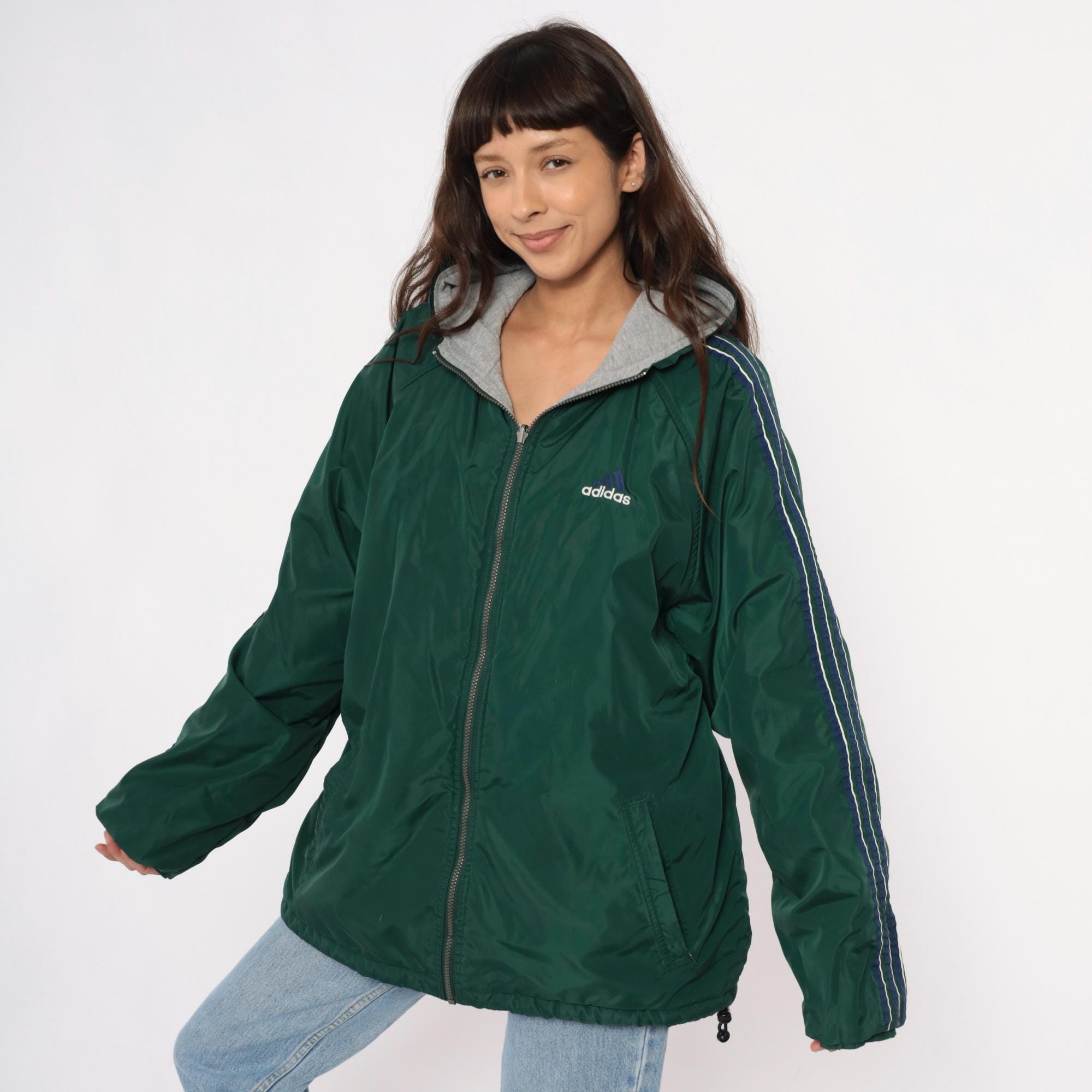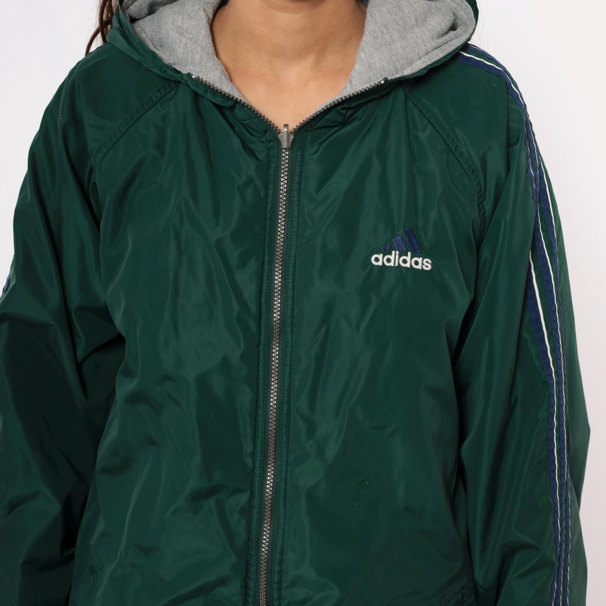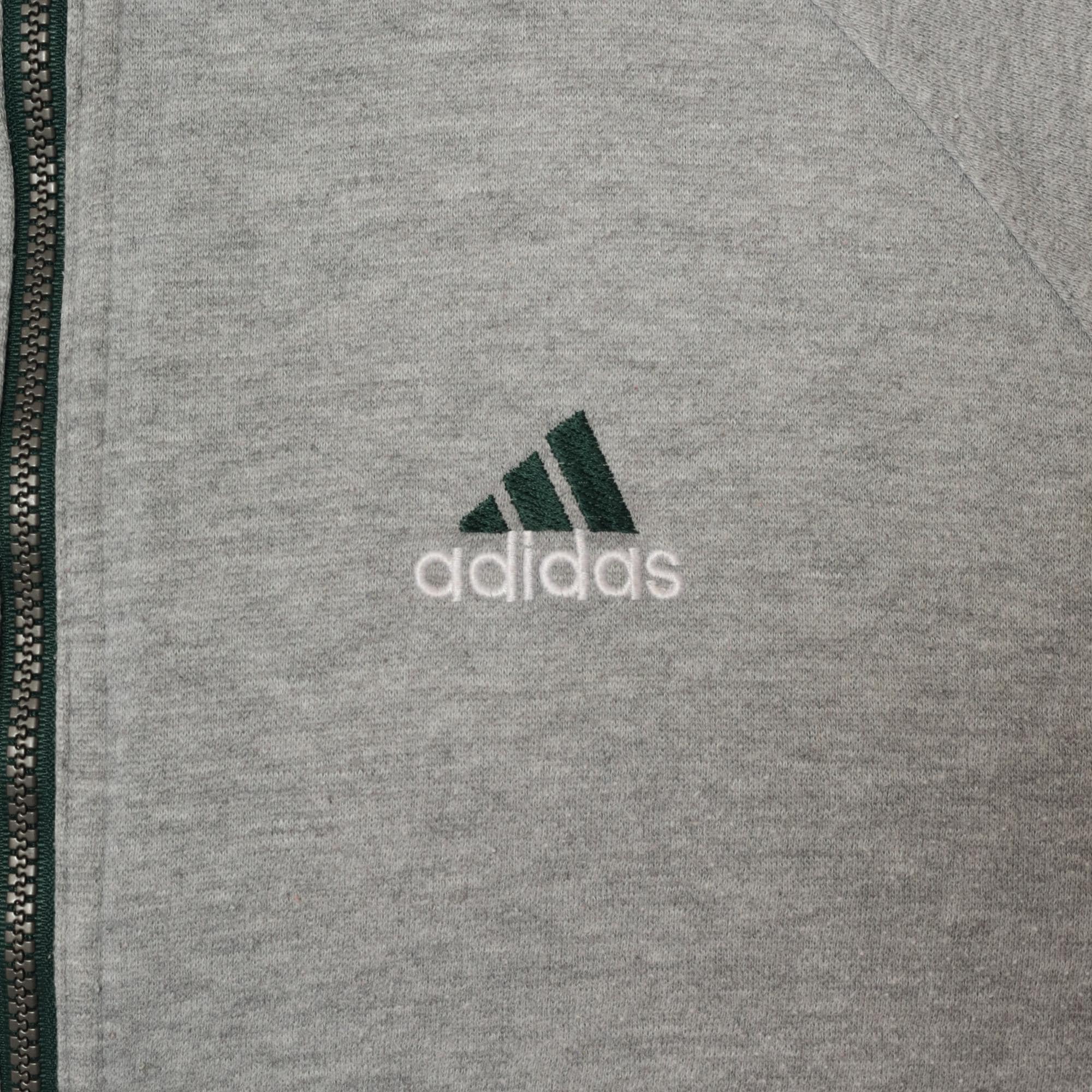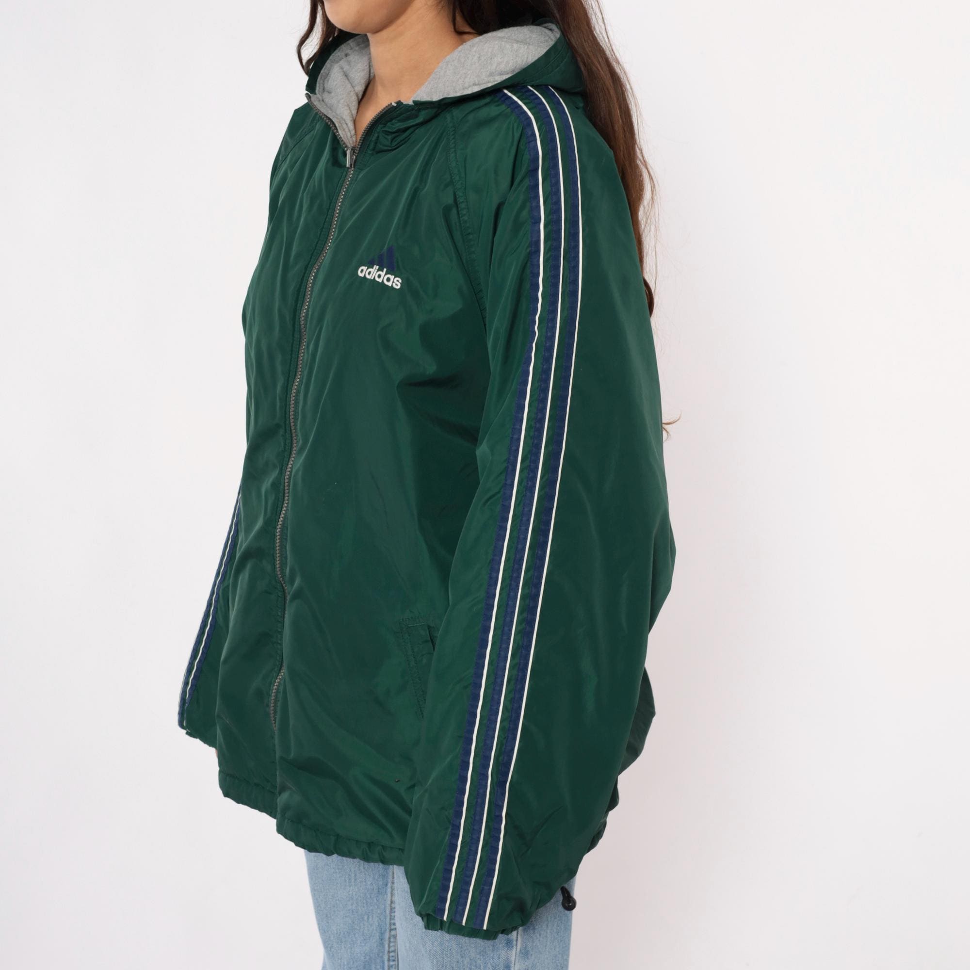 Y2K reversible adidas jacket with forest green nylon shell on one side and heather gray fleece on the reverse. Green side has embroidered adidas text logo on chest and navy stripe detail with white piping on shoulders, gray side has adidas logo graphic on back. Full front zipper closure, hood with drawstring, elastic cuffs and hem.