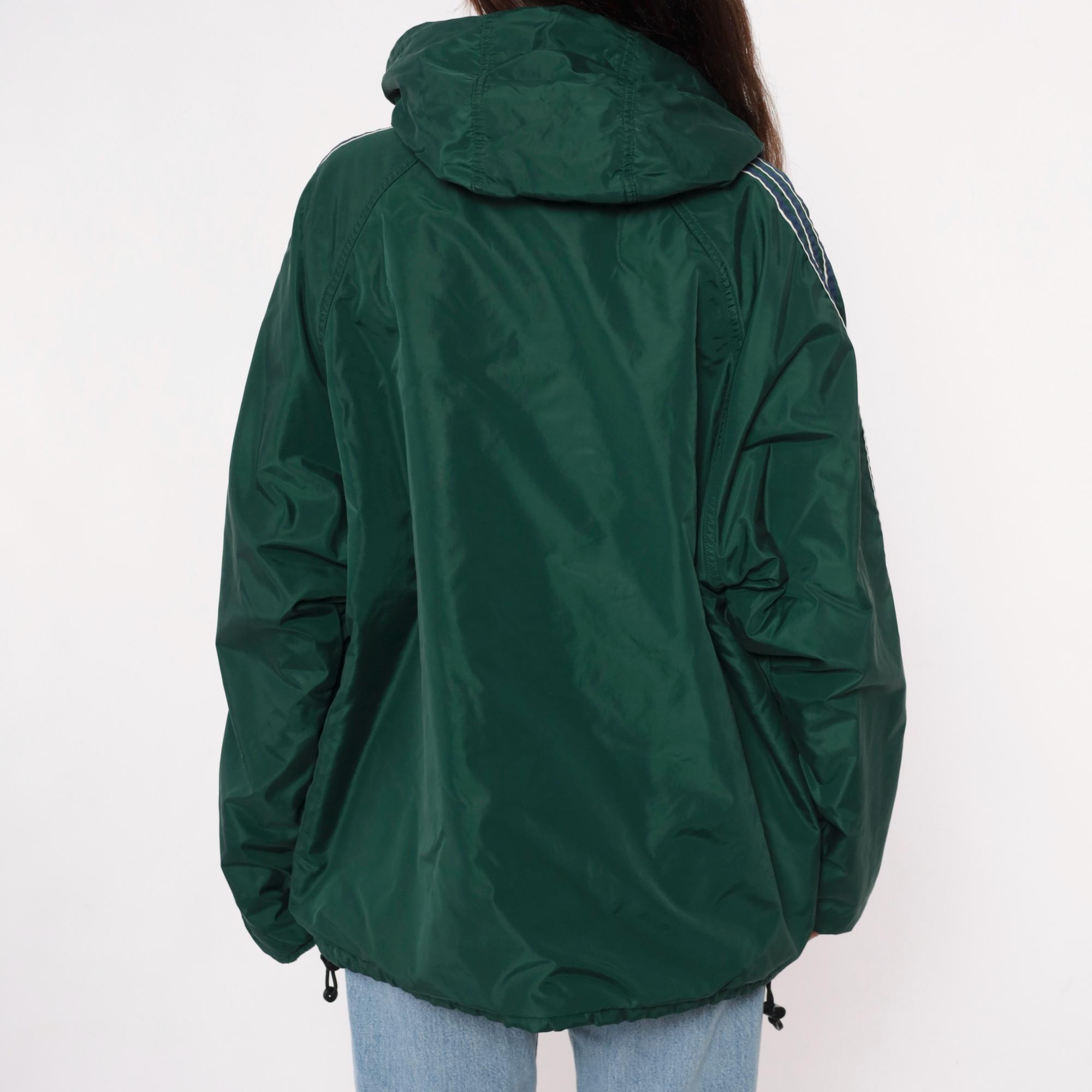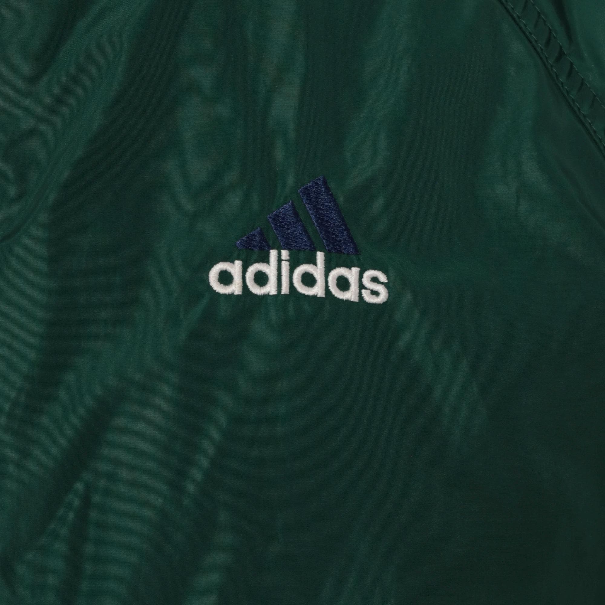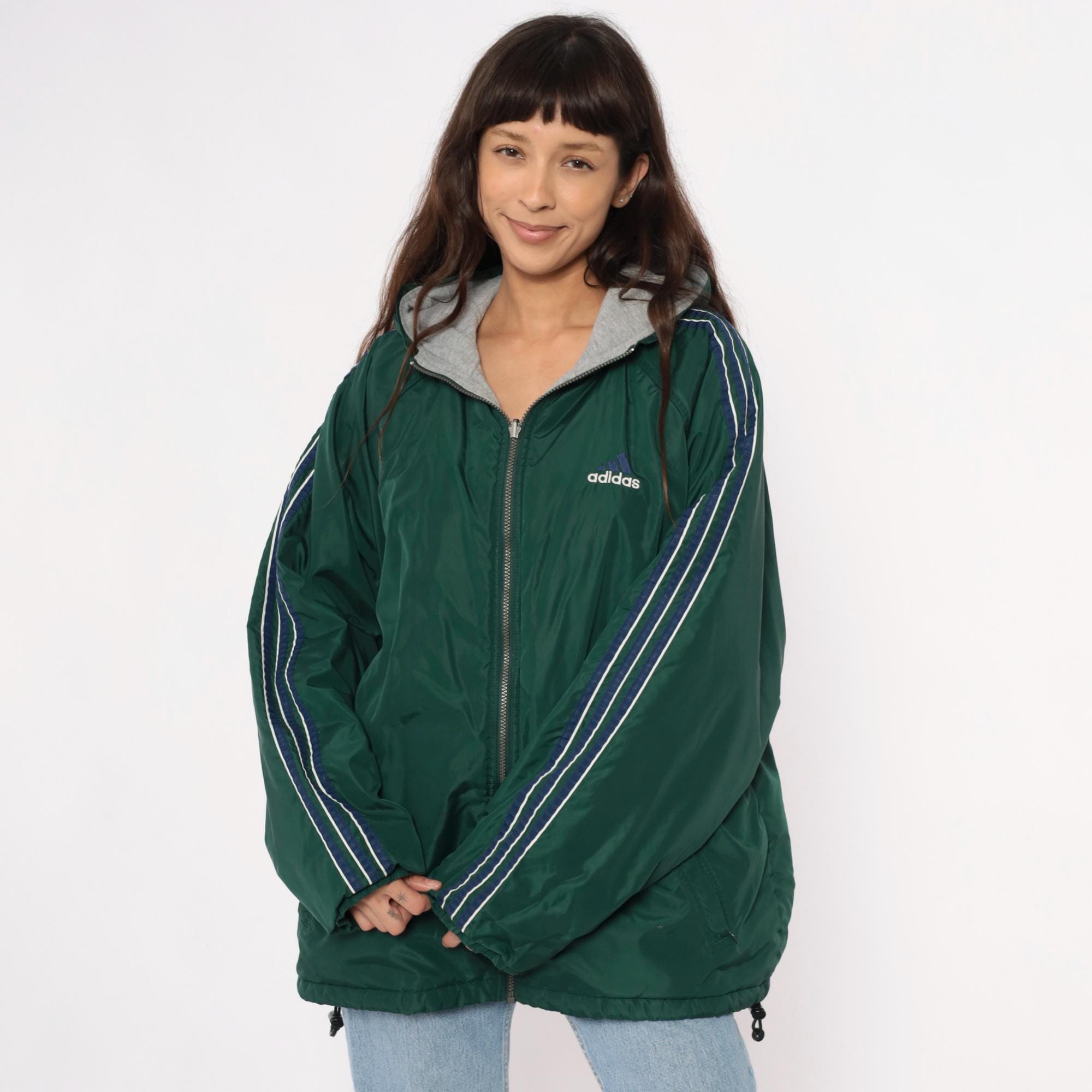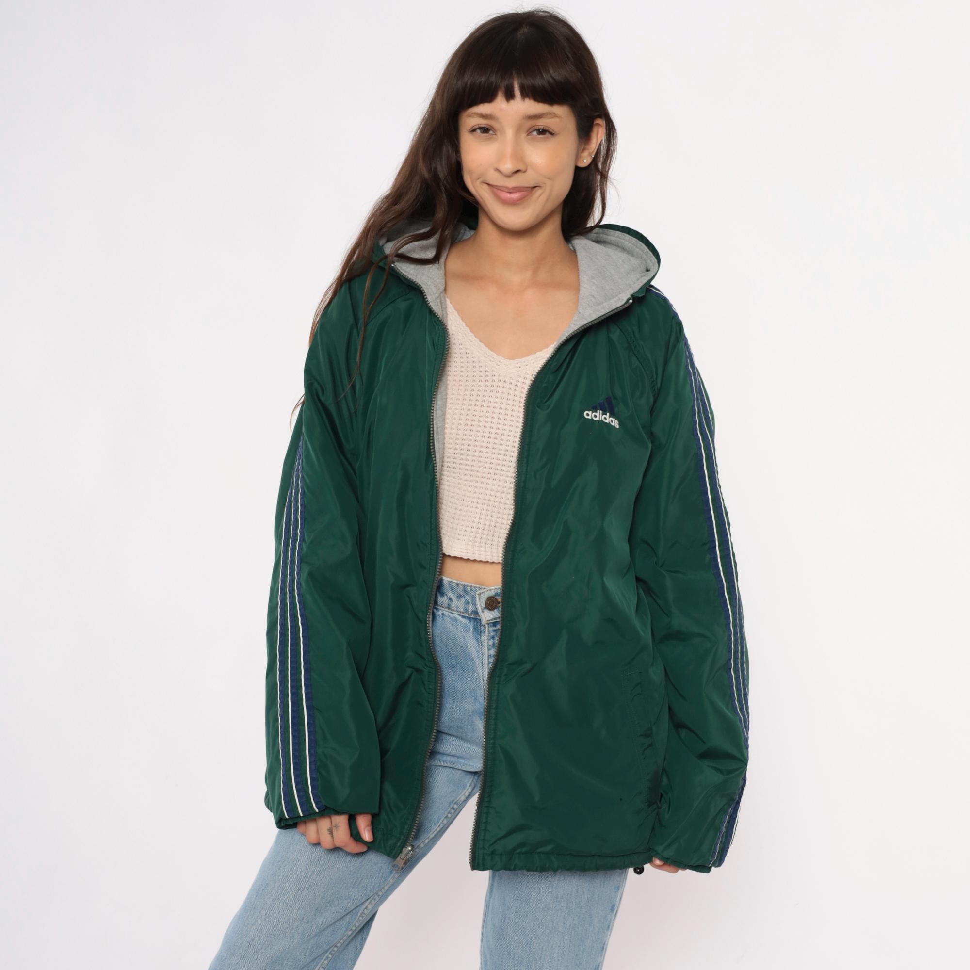 Y2K reversible adidas jacket with forest green nylon shell on one side and heather gray fleece on the reverse. Green side has embroidered adidas text logo on chest and navy stripe detail with white piping on shoulders, gray side has adidas logo graphic on back. Full front zipper closure, hood with drawstring, elastic cuffs and hem.