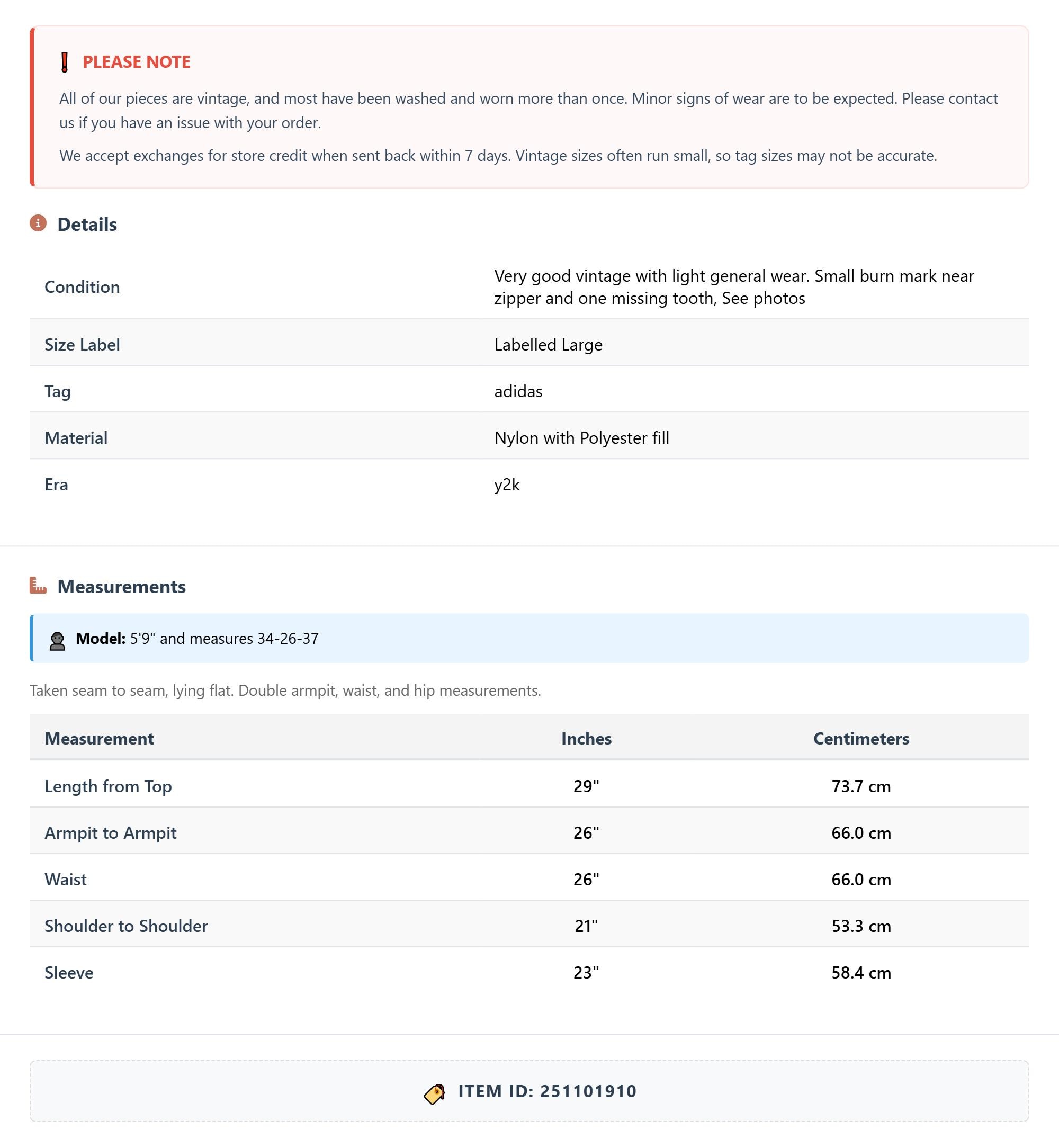 All of our pieces are vintage, and most have been washed and worn more than once. Minor signs of wear are to be expected. Please contact us if you have an issue with your order. We accept exchanges for store credit when sent back within 7 days.