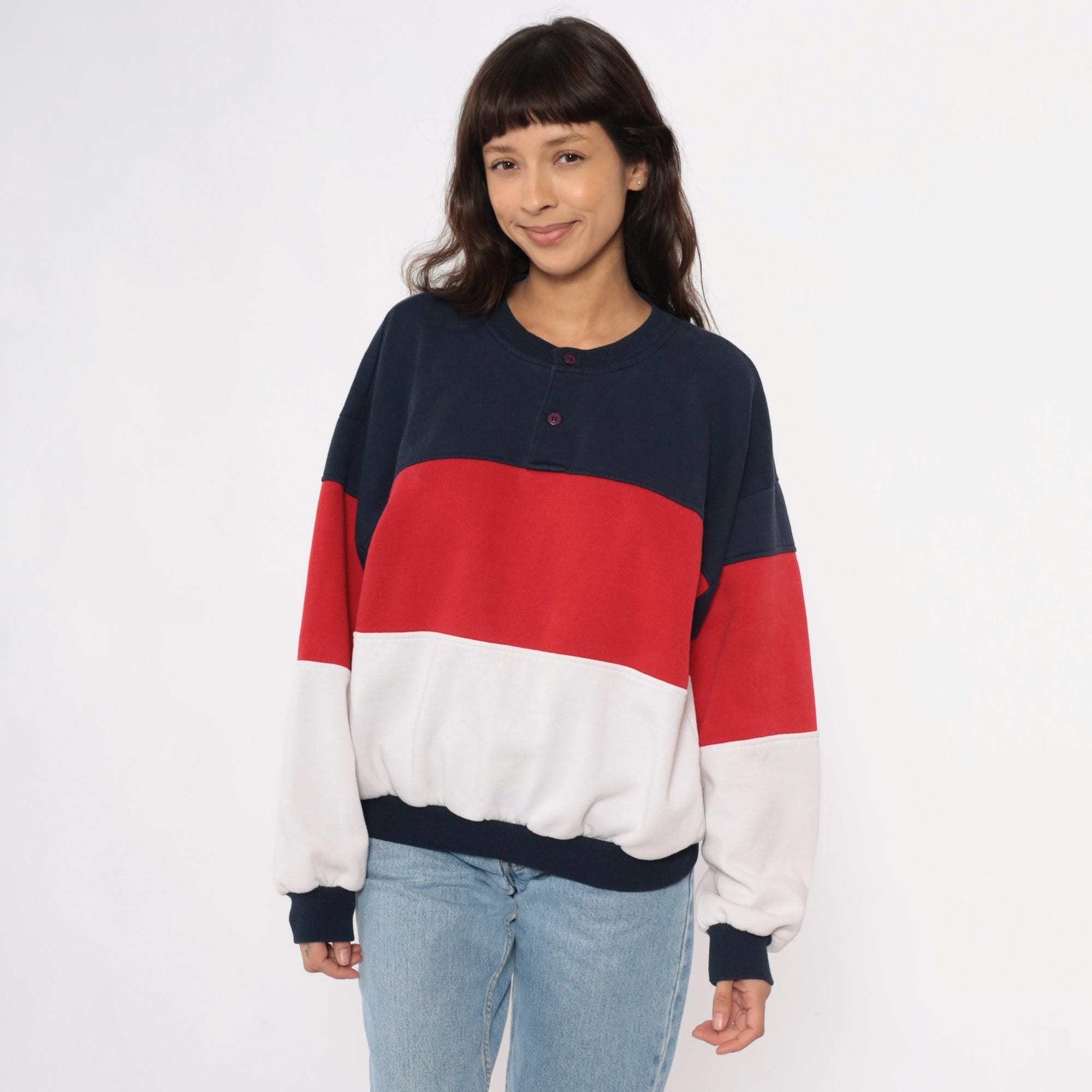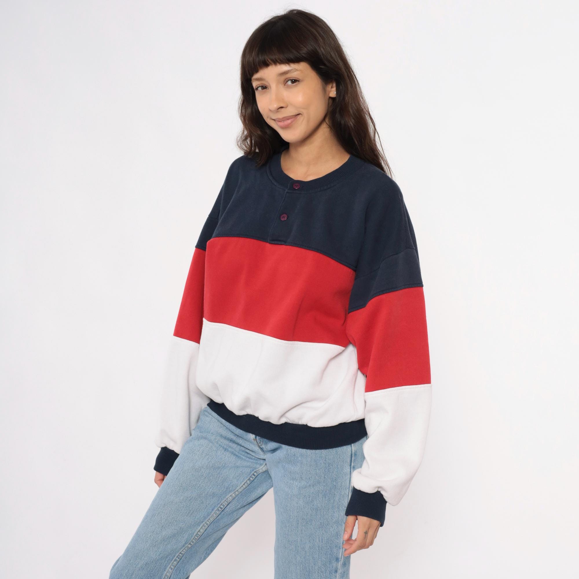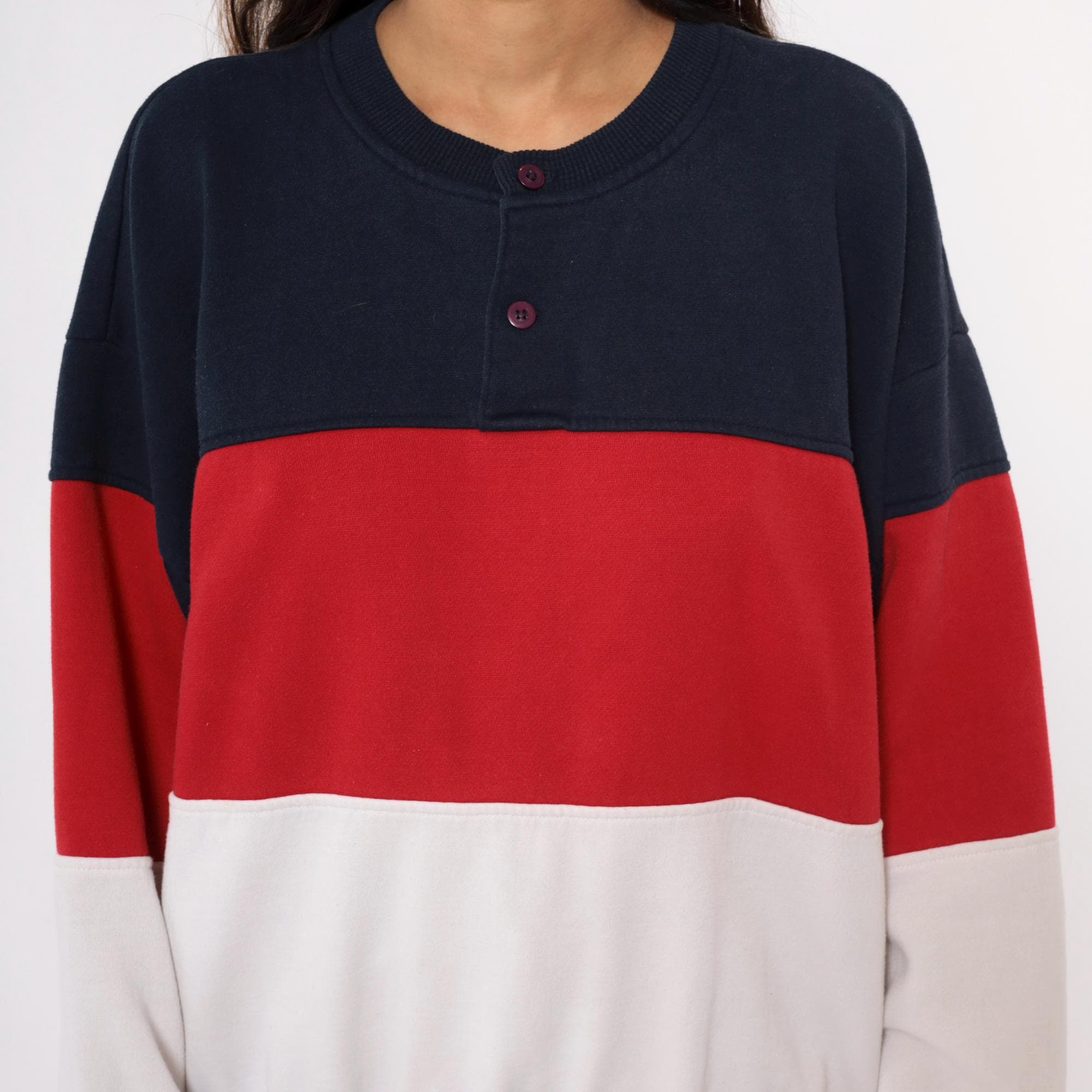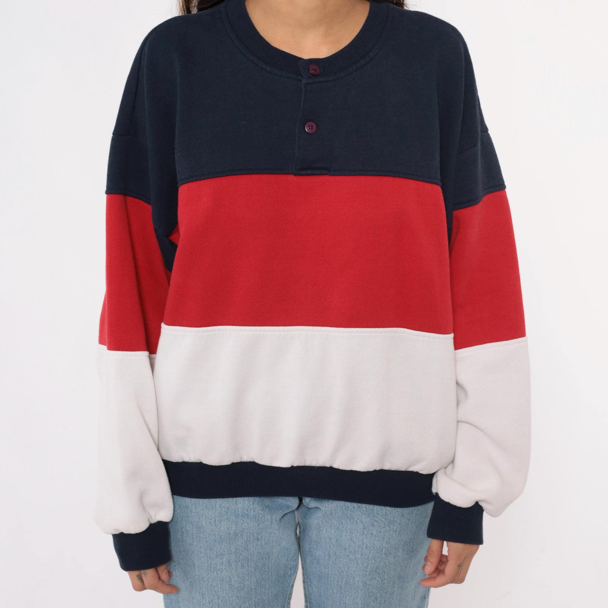 80s color-blocked sweatshirt in navy, red, and white horizontal stripes with henley-style neckline and three-button front closure. Long sleeves with ribbed cuffs, ribbed collar and hem.