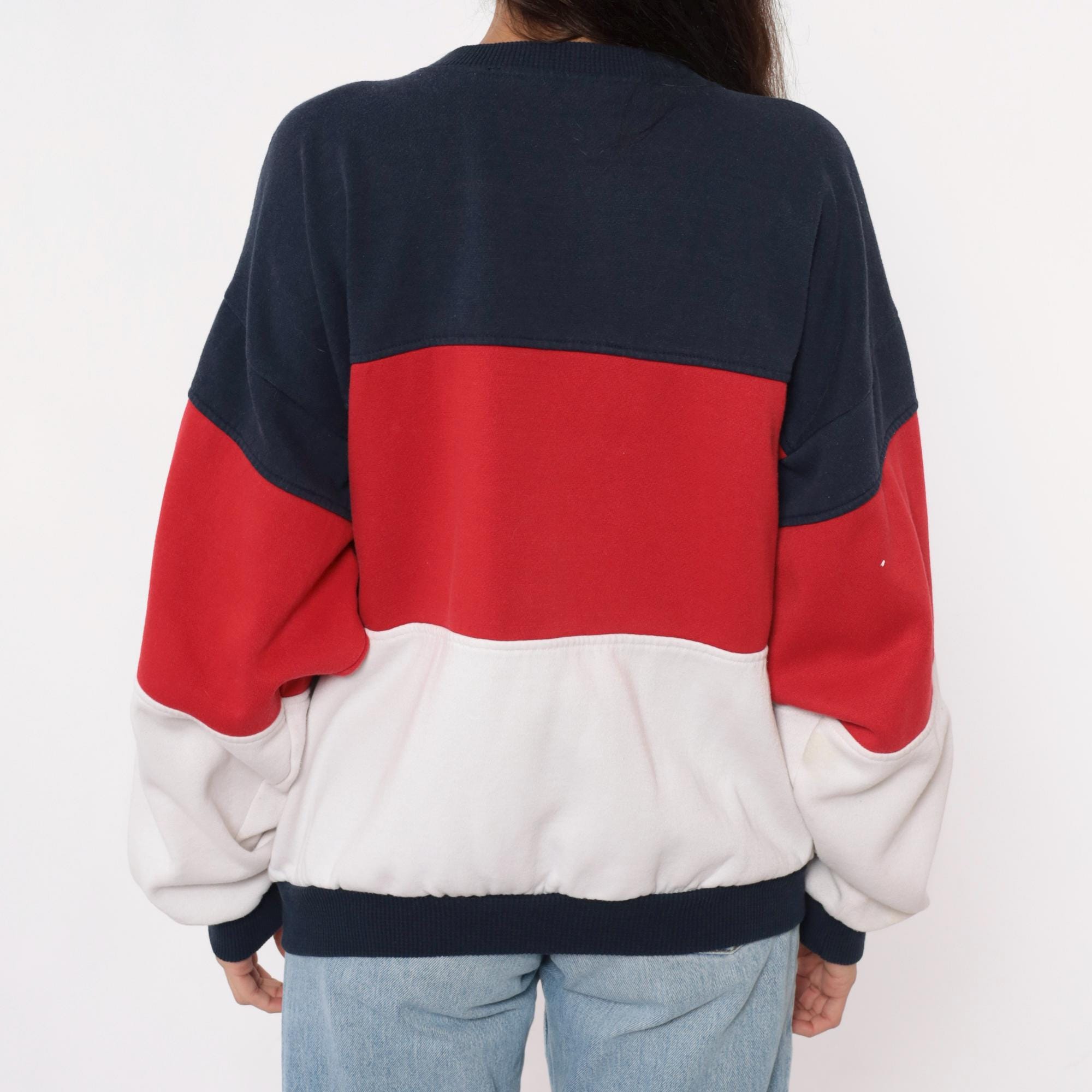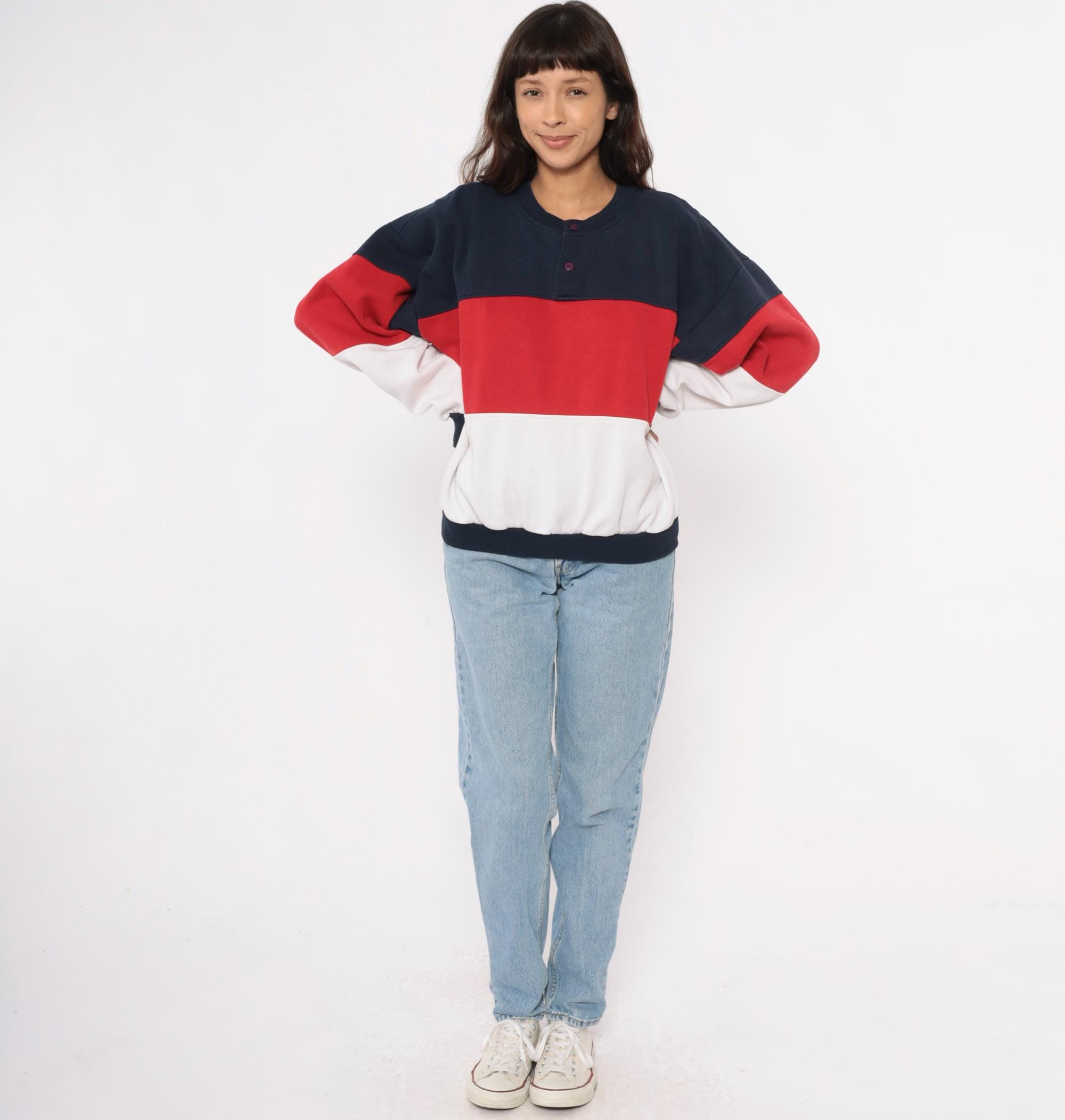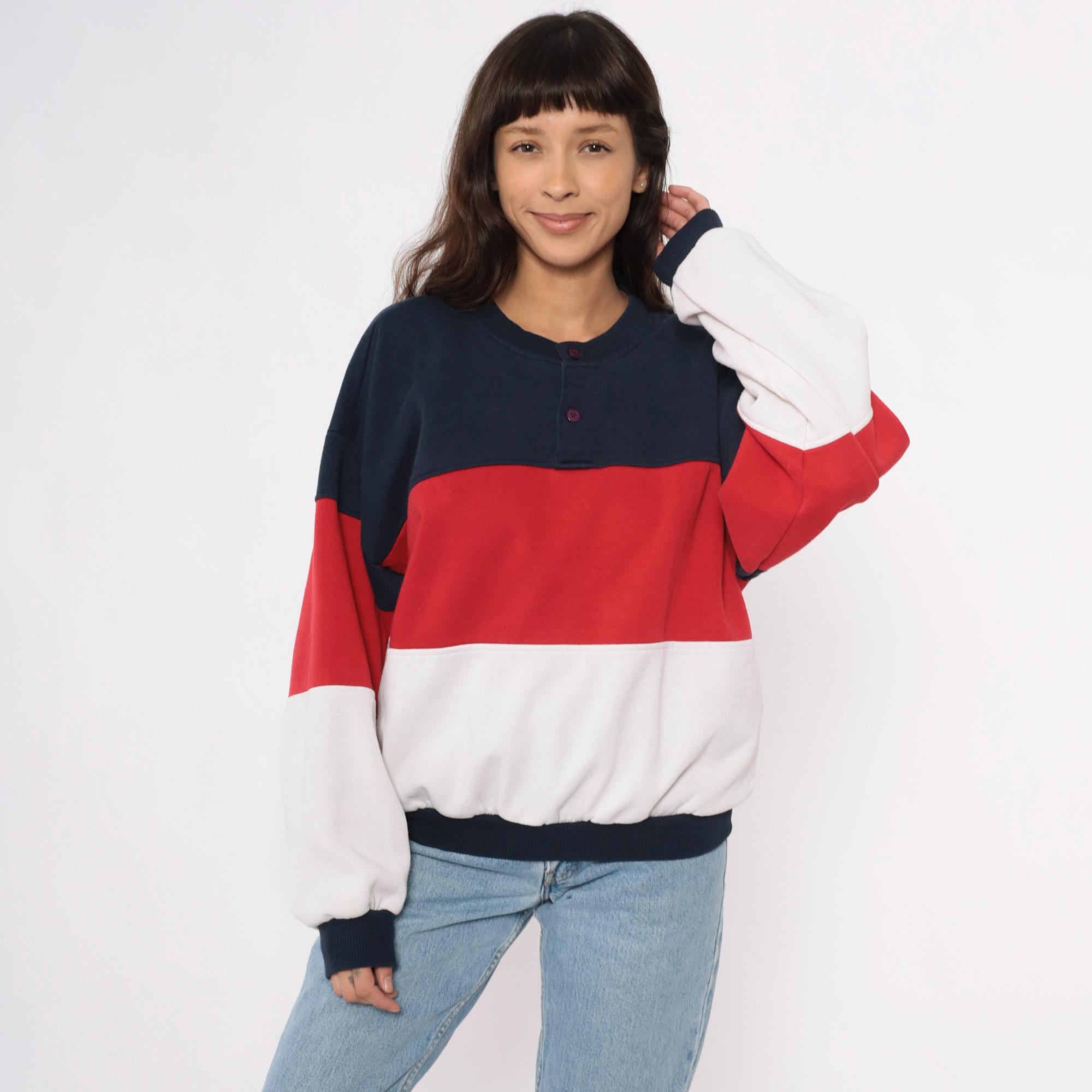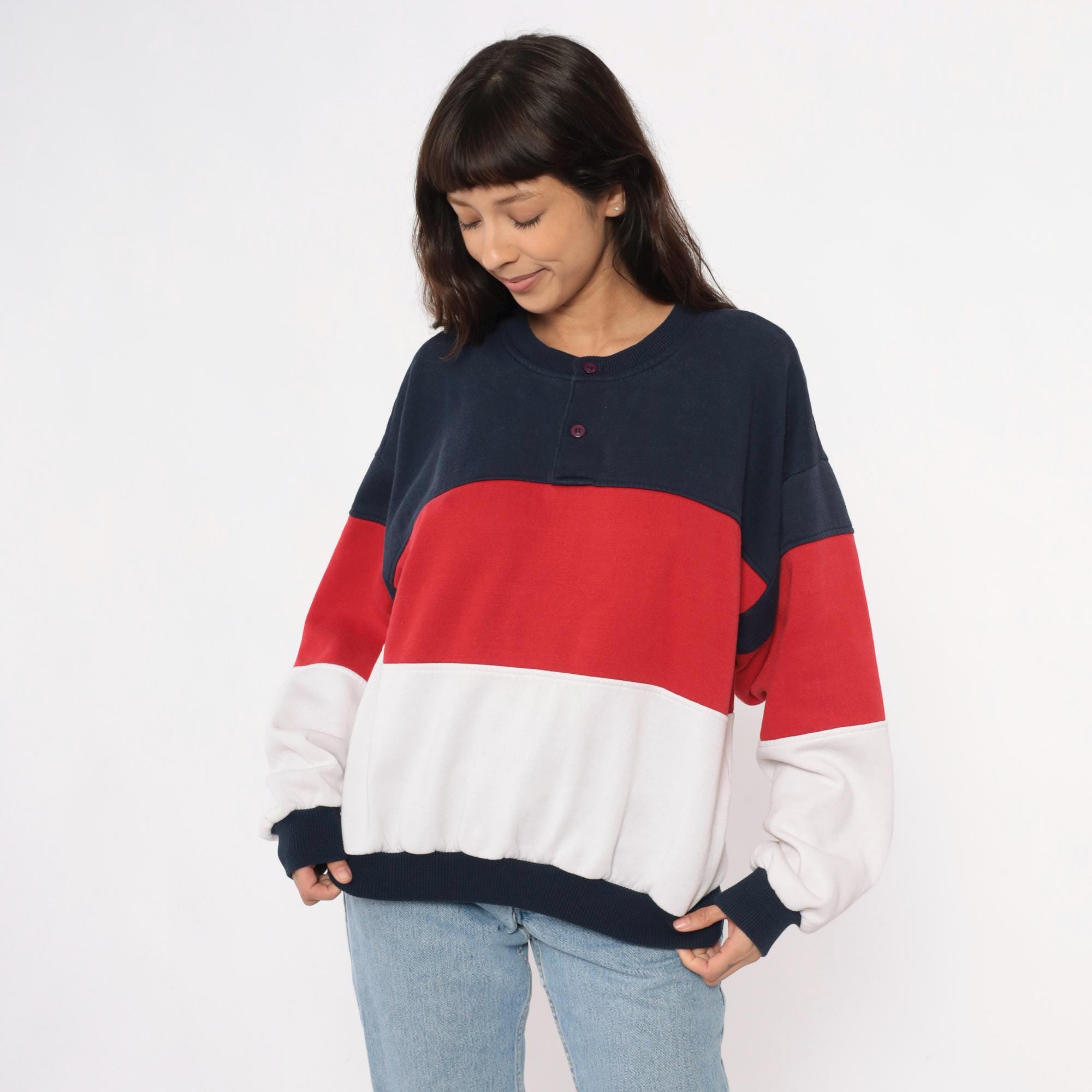 80s color-blocked sweatshirt in navy, red, and white horizontal stripes with henley-style neckline and three-button front closure. Long sleeves with ribbed cuffs, ribbed collar and hem.