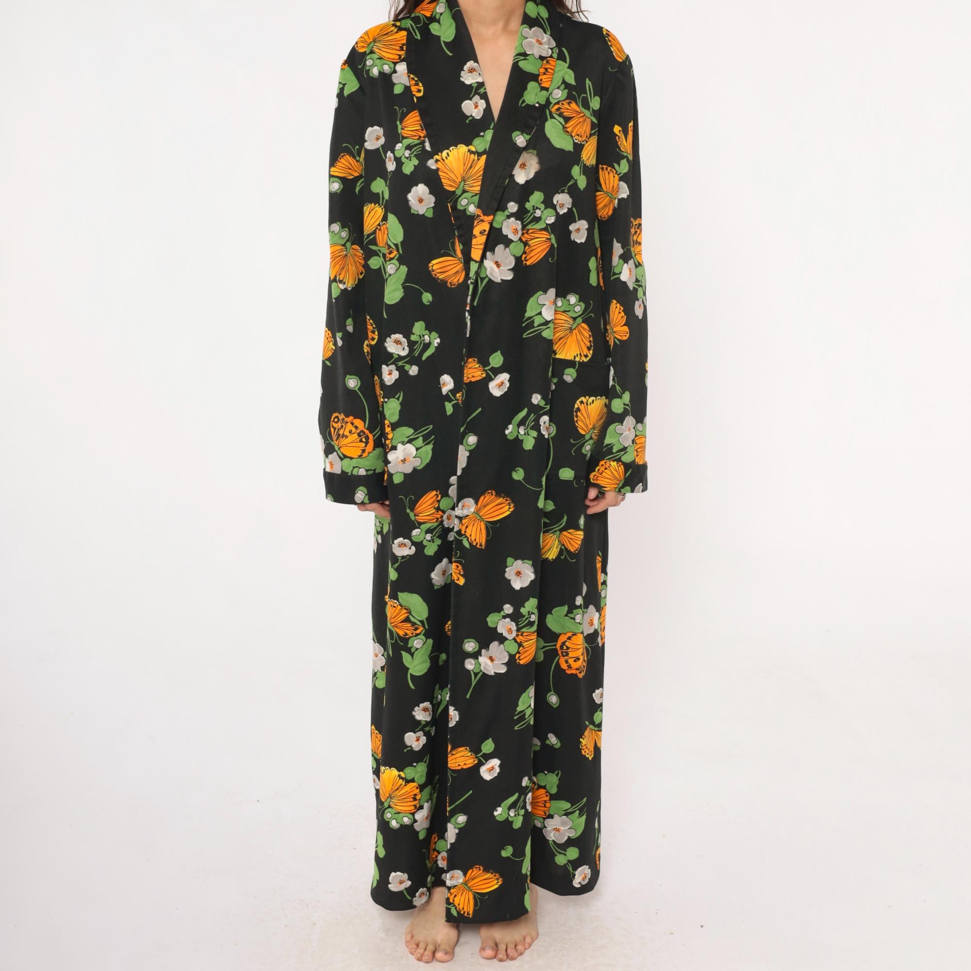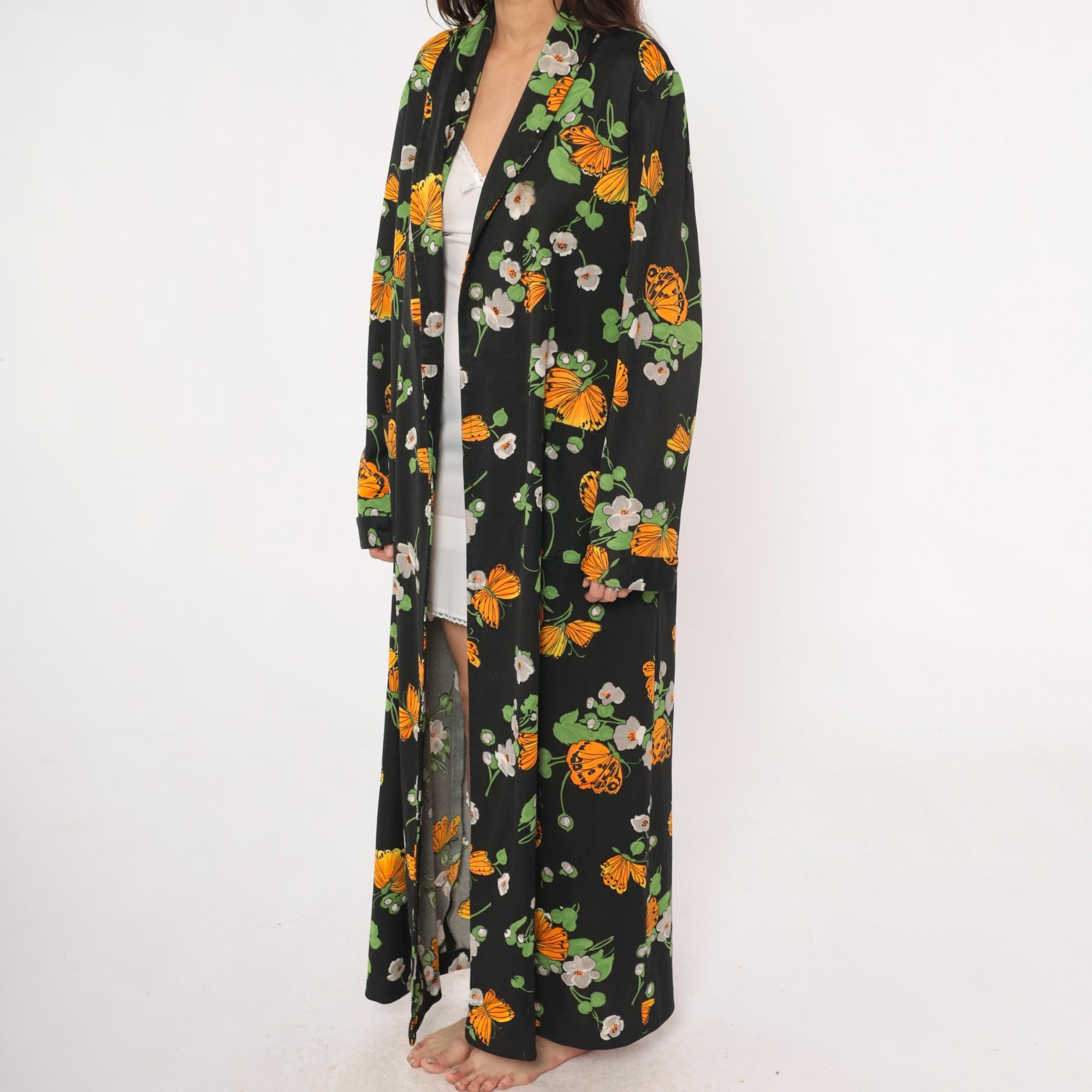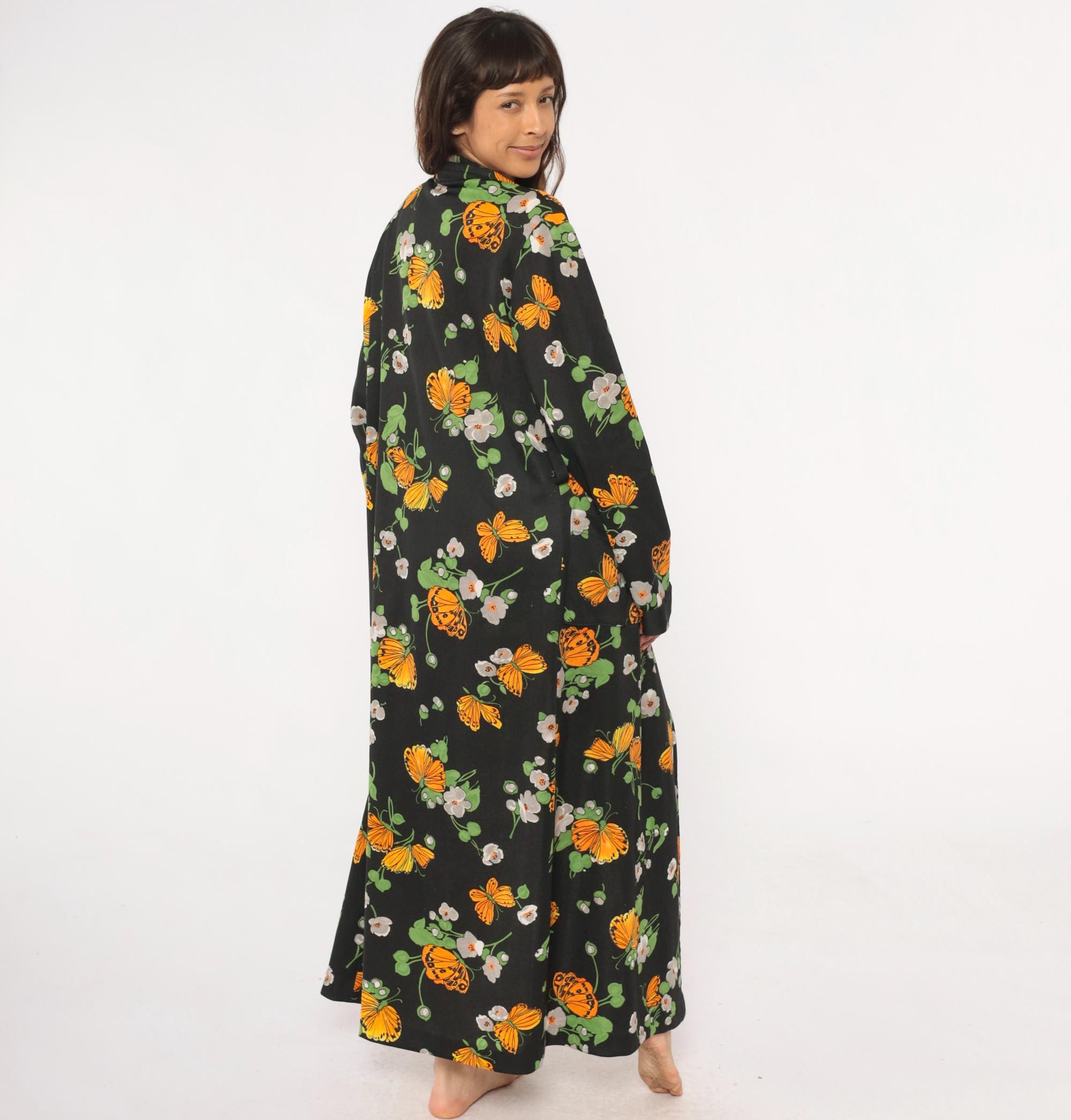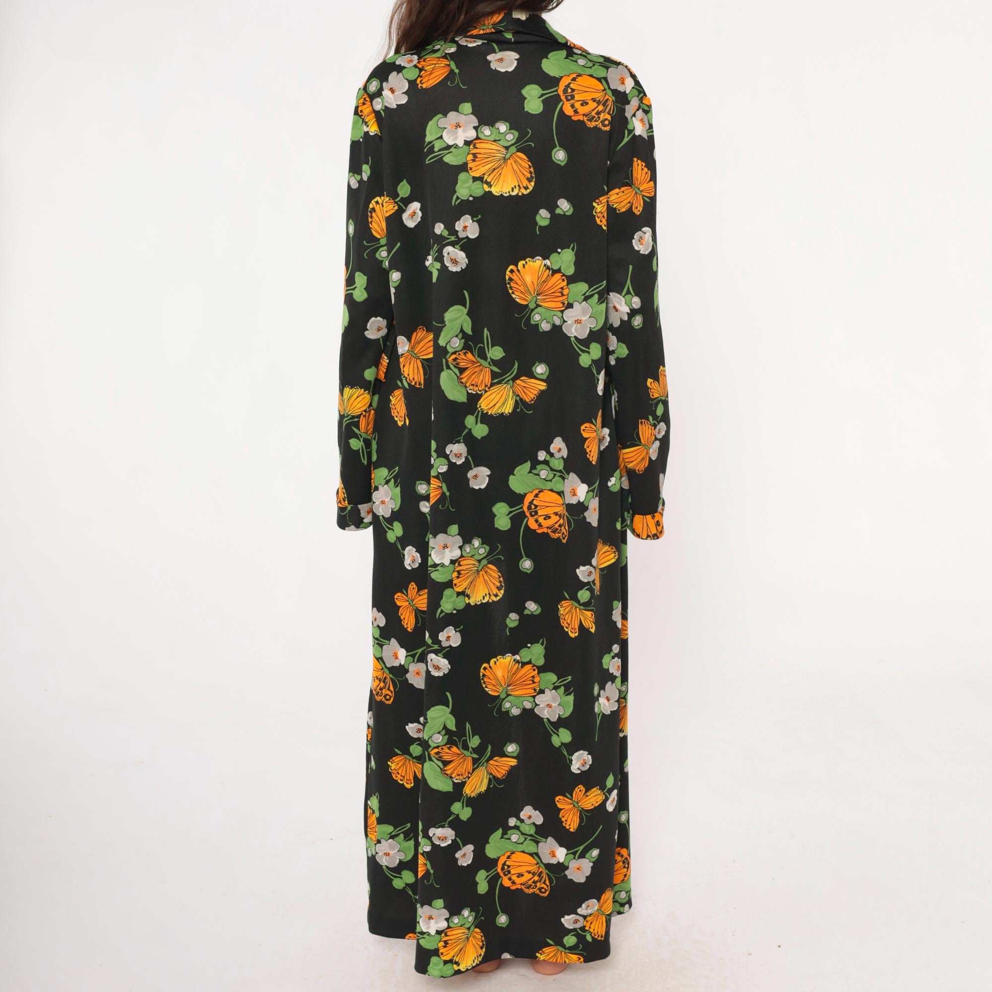 70s black maxi robe with orange butterfly and white floral print across the fabric. Open front with collar, long sleeves, floor-length hem. Green leaves and stems complete the psychedelic garden pattern.