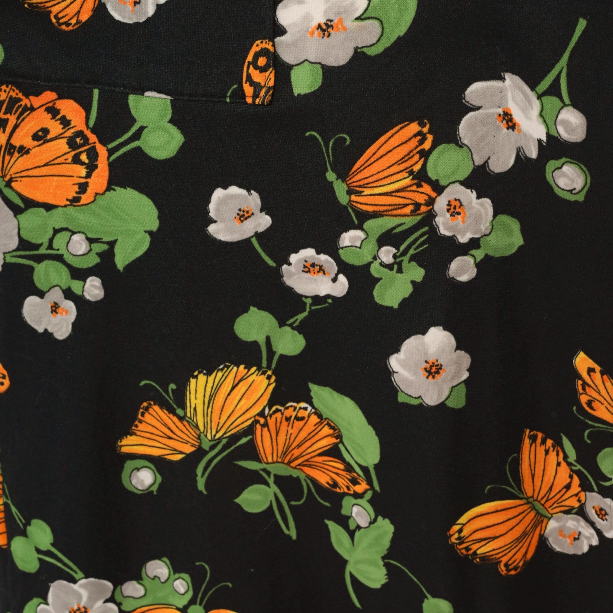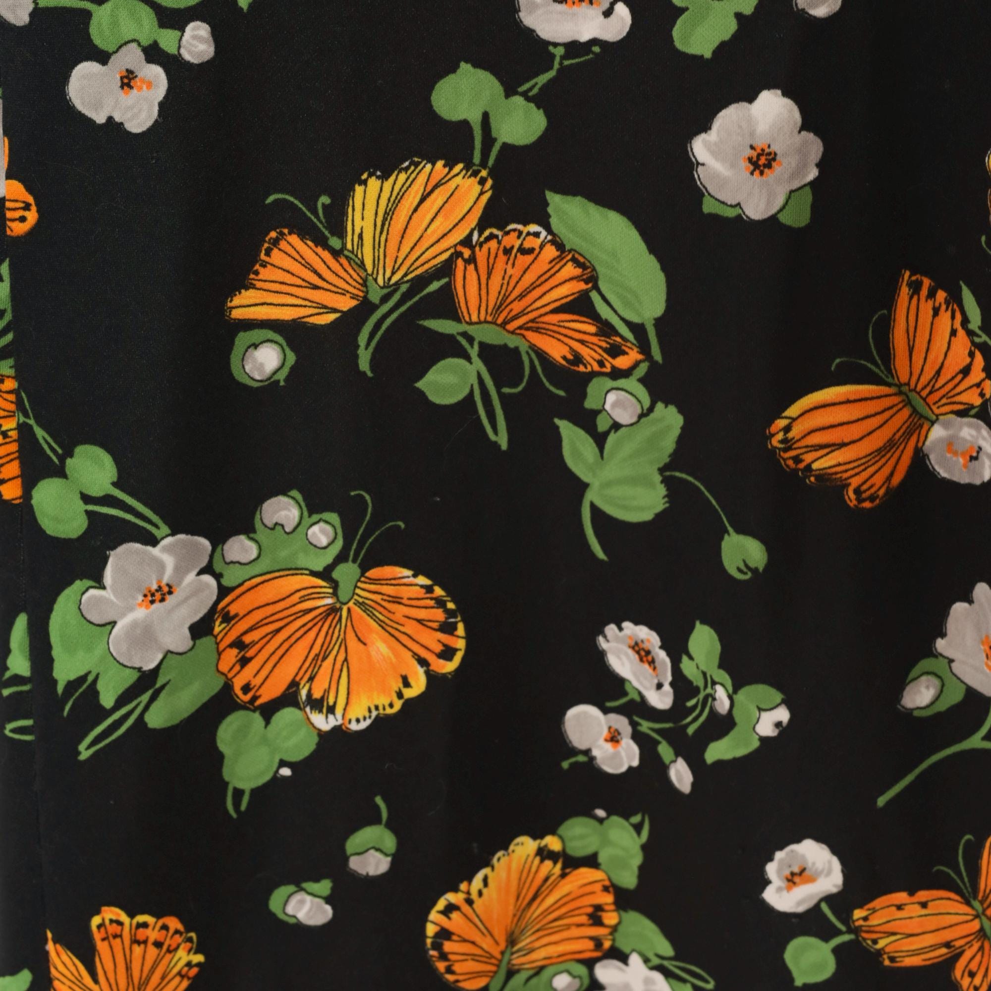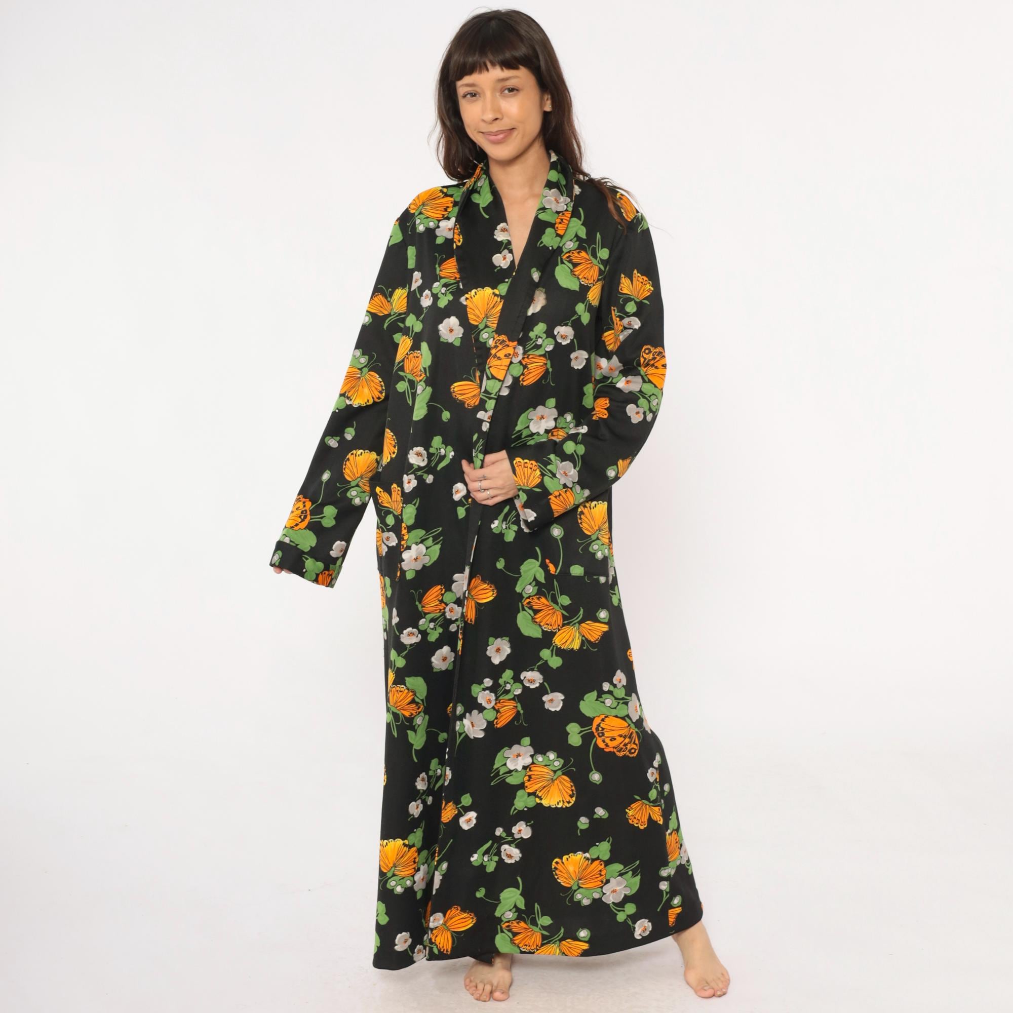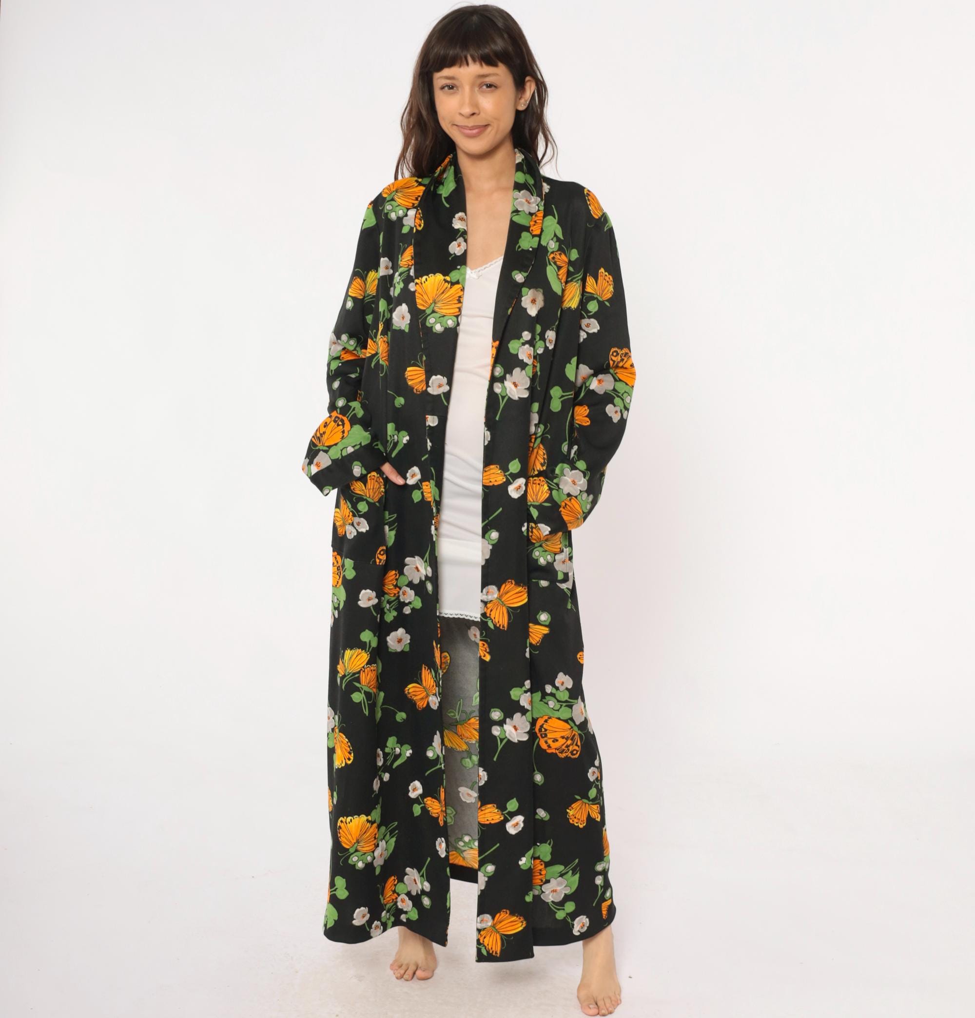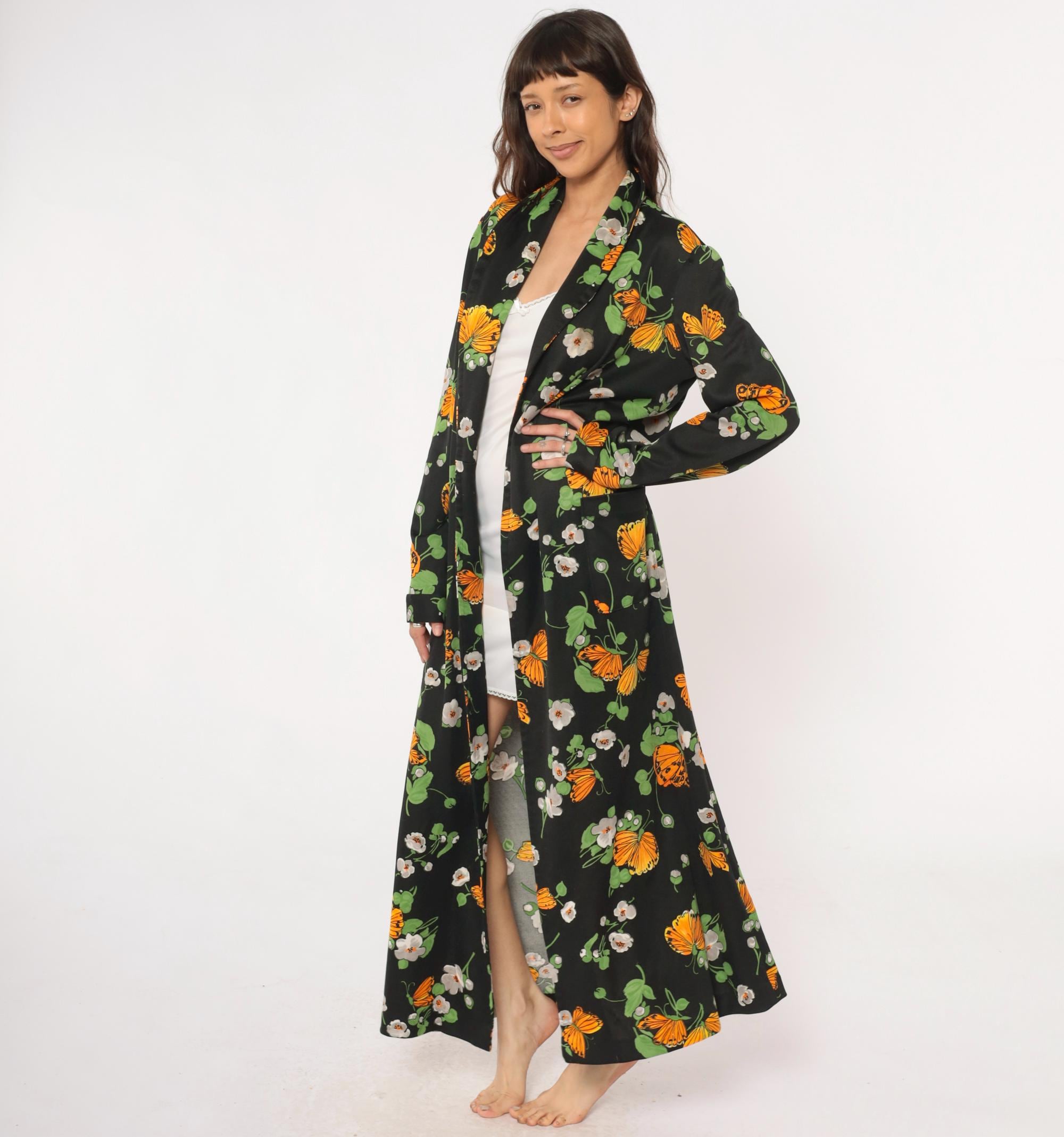 70s black maxi robe with orange butterfly and white floral print across the fabric. Open front with collar, long sleeves, floor-length hem. Green leaves and stems complete the psychedelic garden pattern.